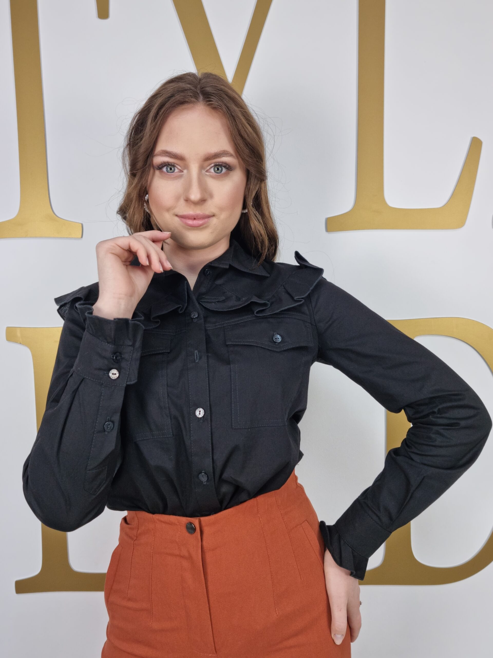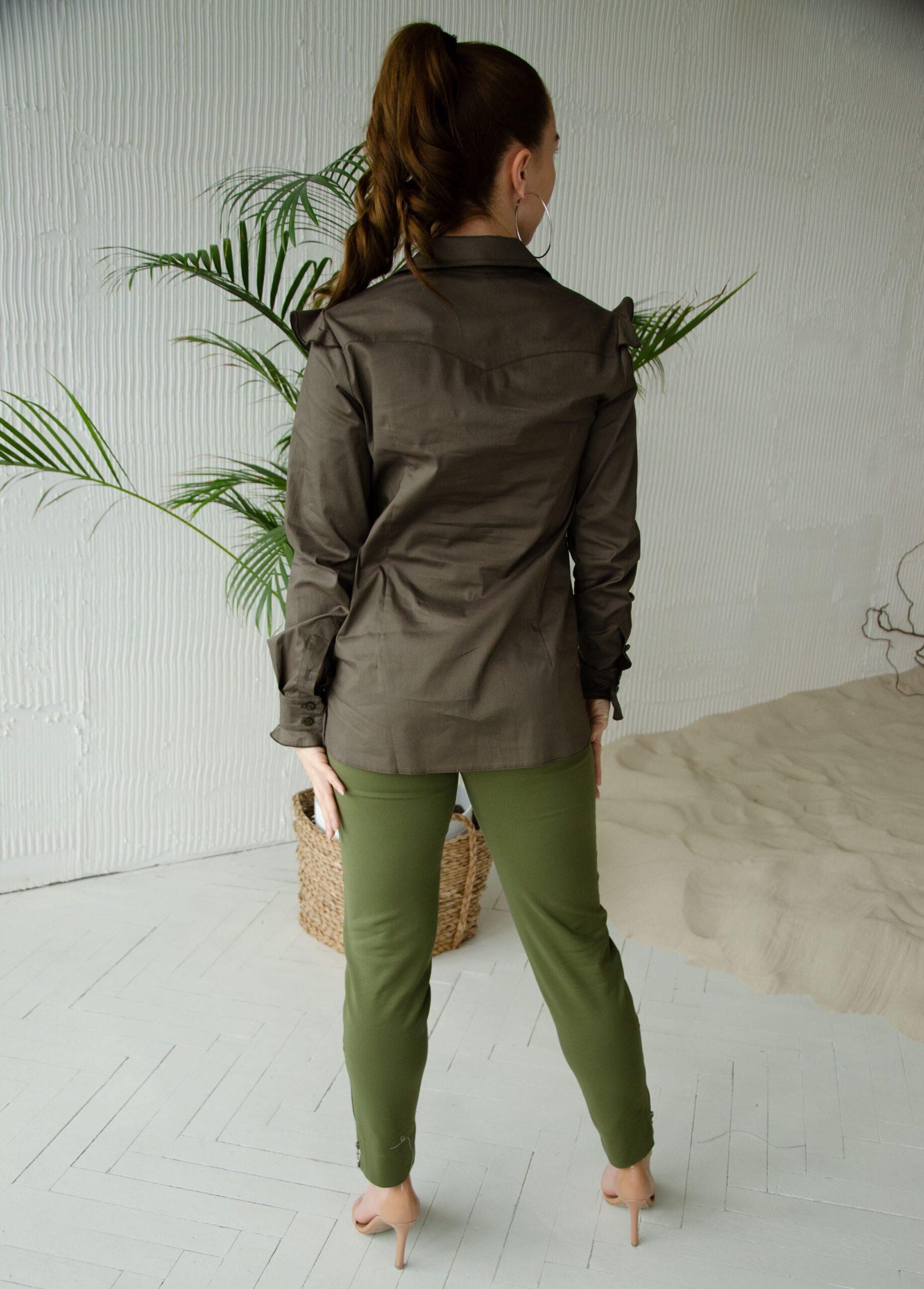 Блузка женская, приталенная, с длинным рукавом, рукав на манжете с легким воланом. На блузке два нагрудных кармана с клапанами. Спереди планка с пуговицами и красивые рюши на плечах и на груди. Состав: