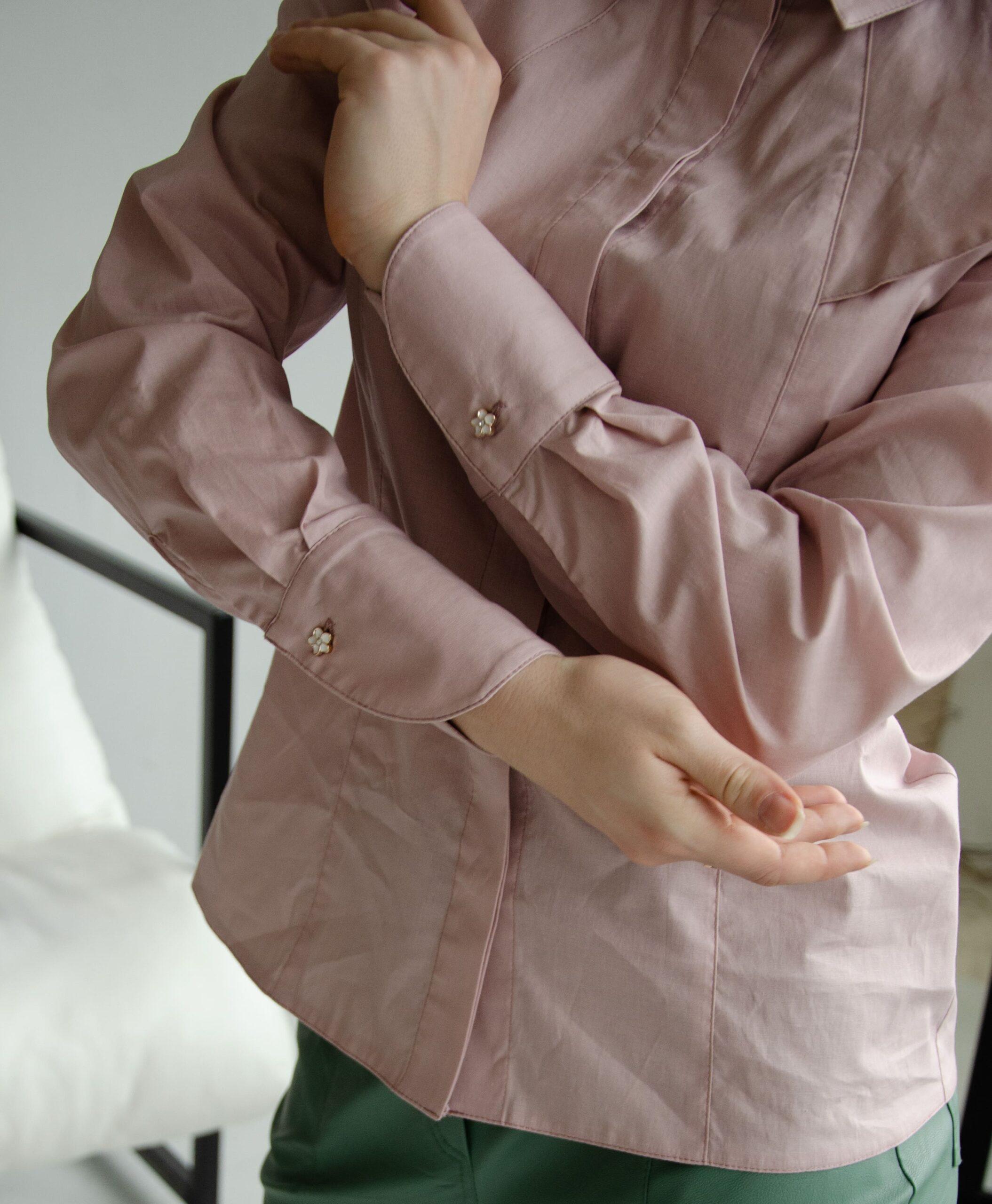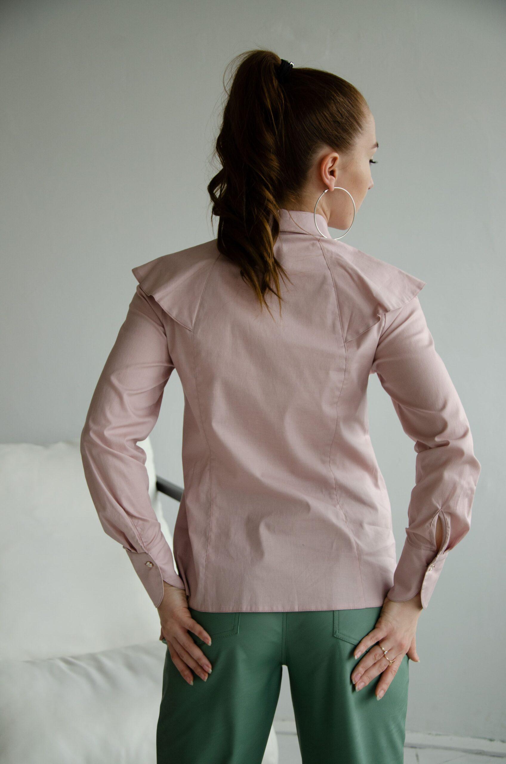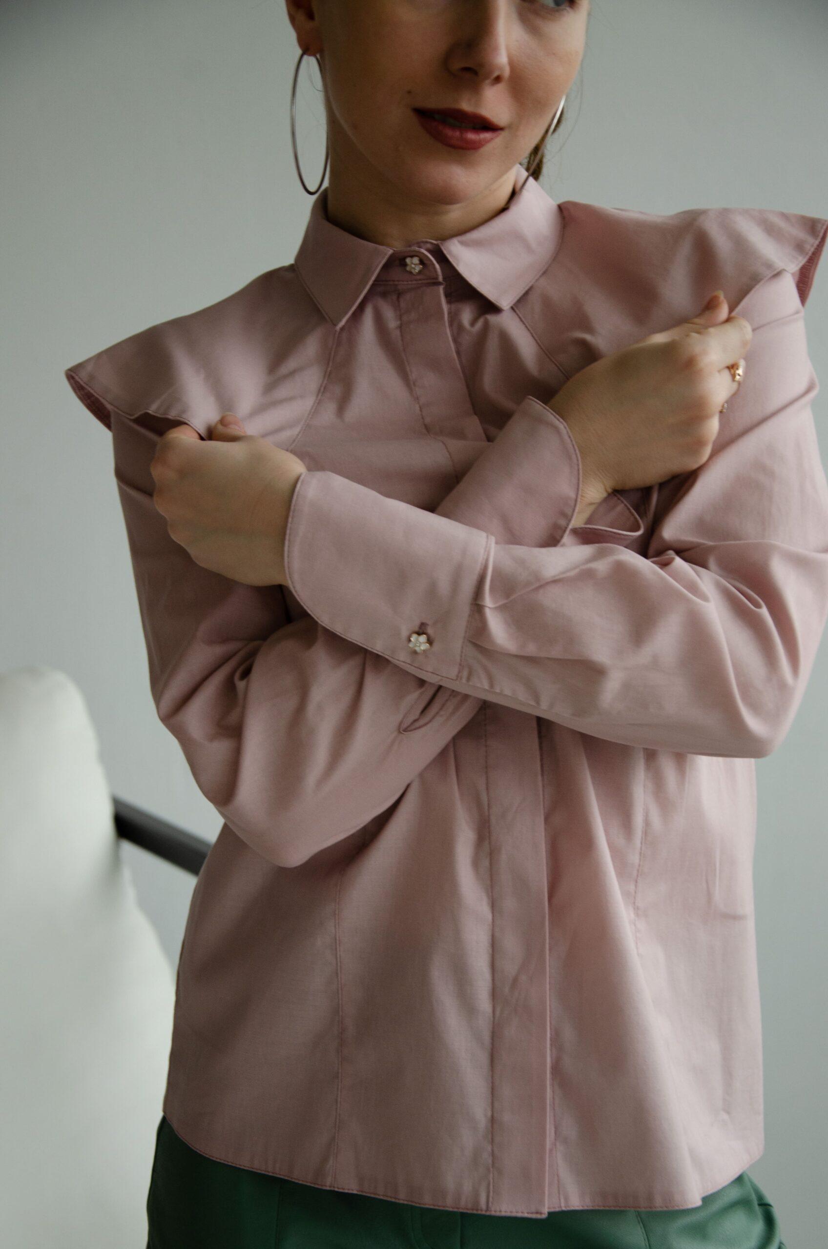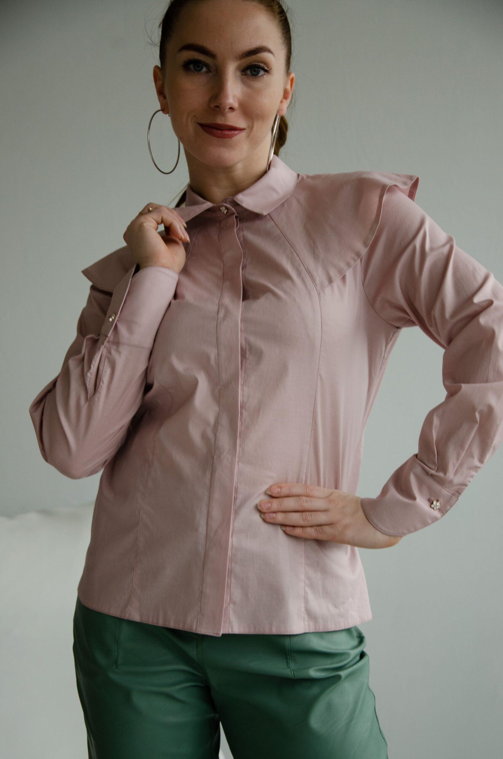 Блузка женская с длинным рукавом на манжете. Стойка у горловины и крылышки на плечах. Спереди планка с пуговицами.