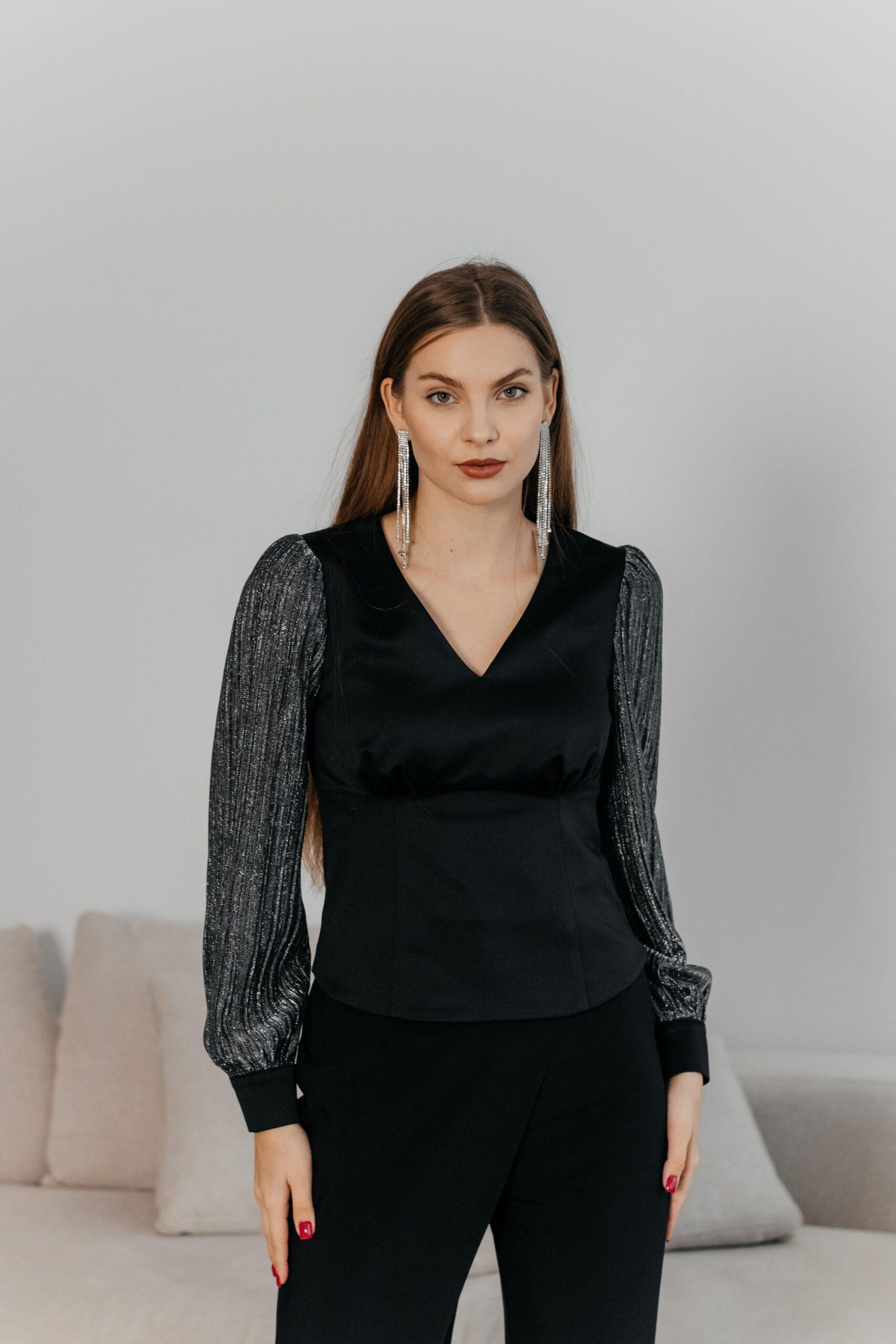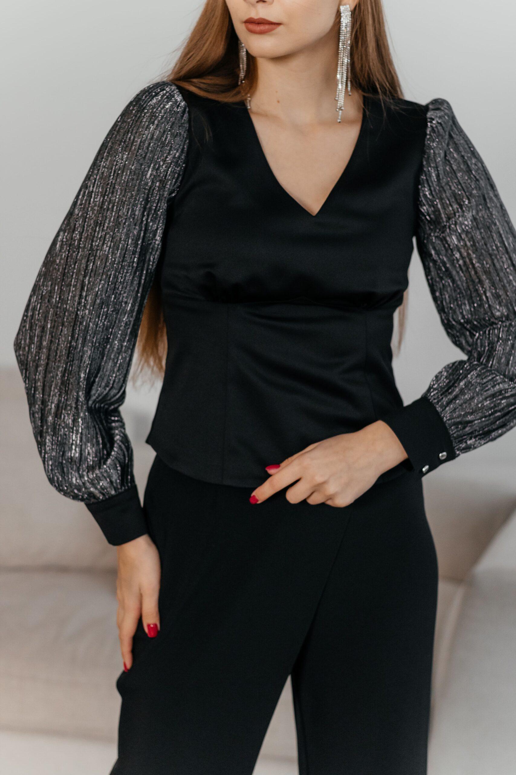 Блуза женская, приталенная , с длинным рукавом на манжетах. Вырез V — образный. Состав: полиэстер 100%