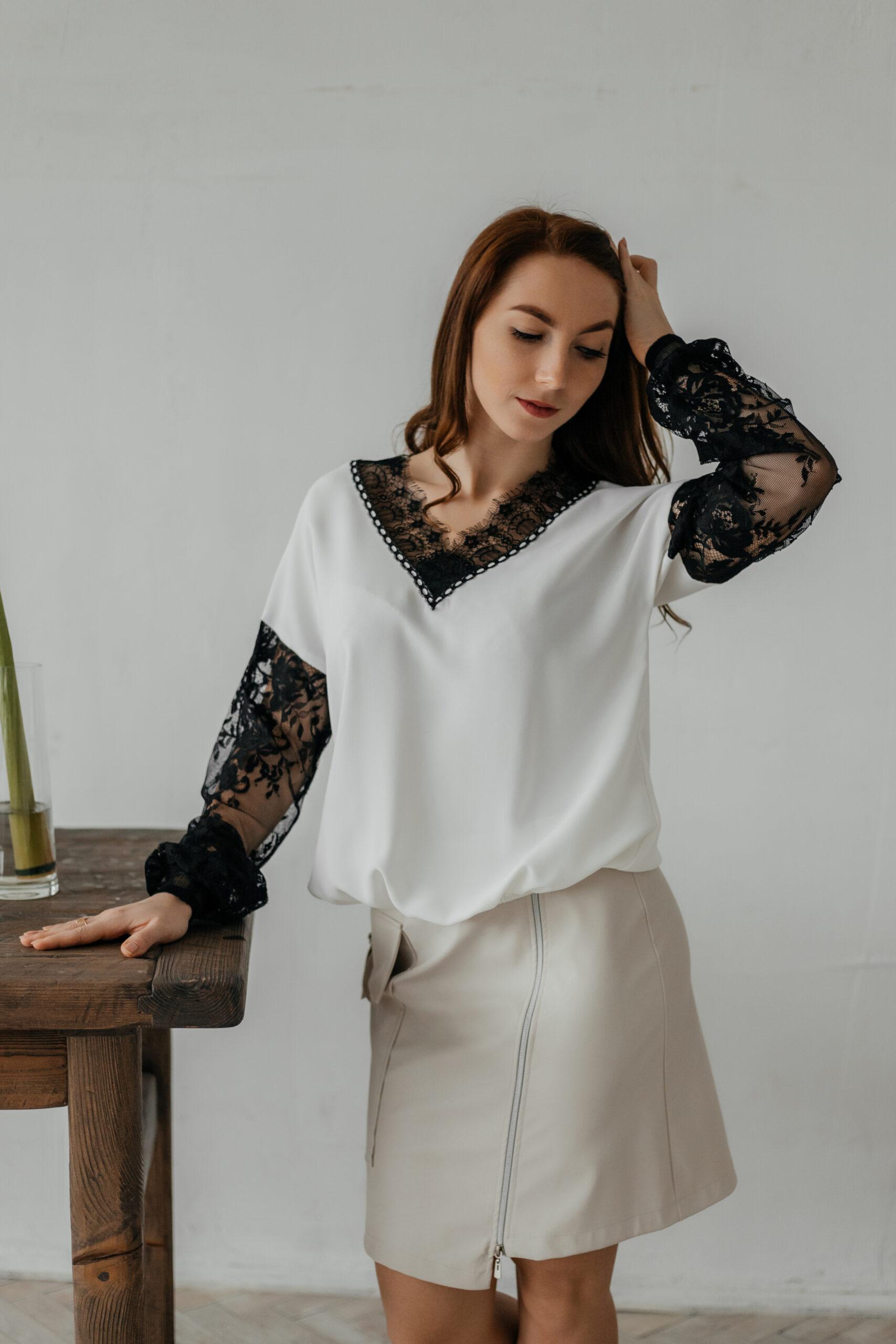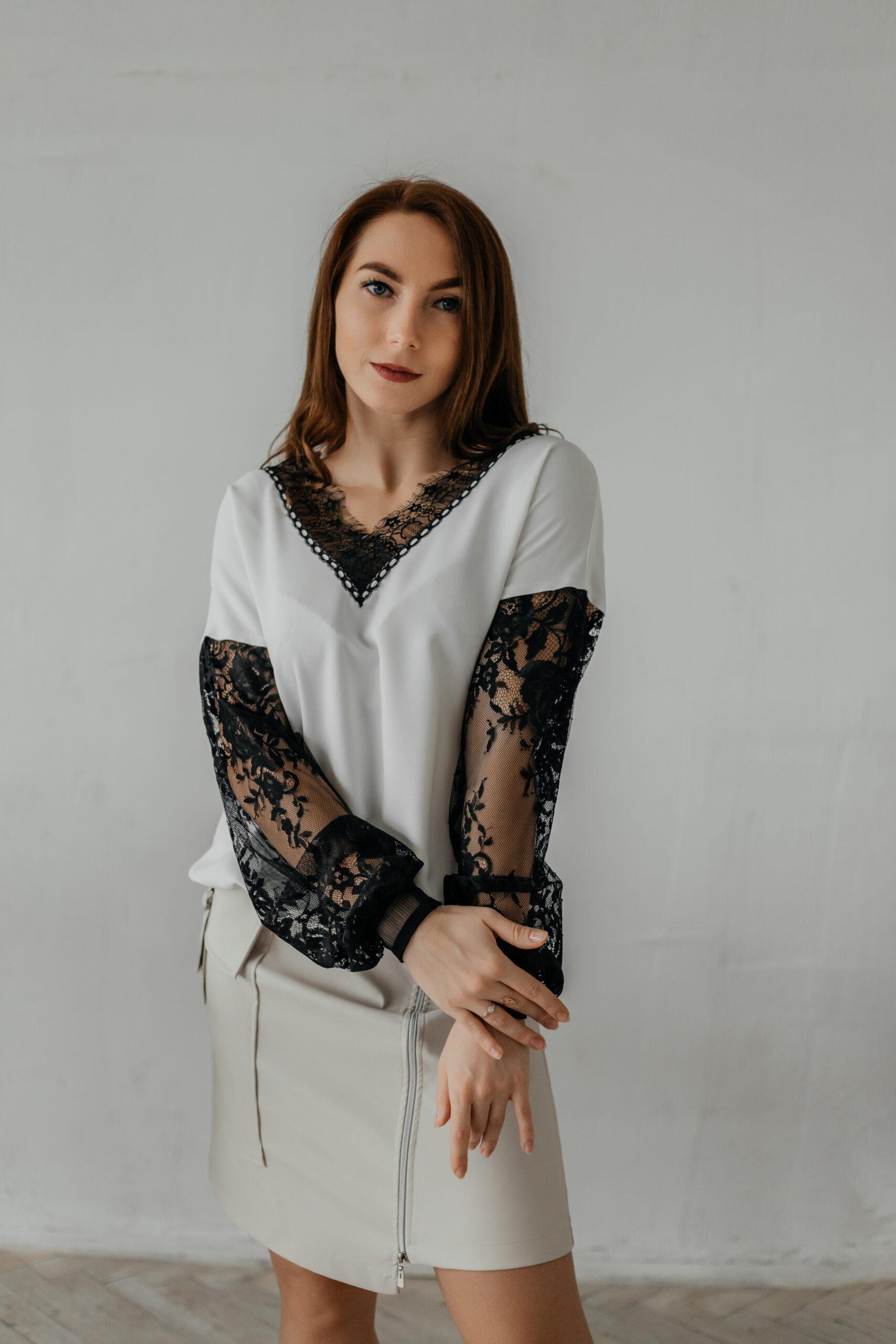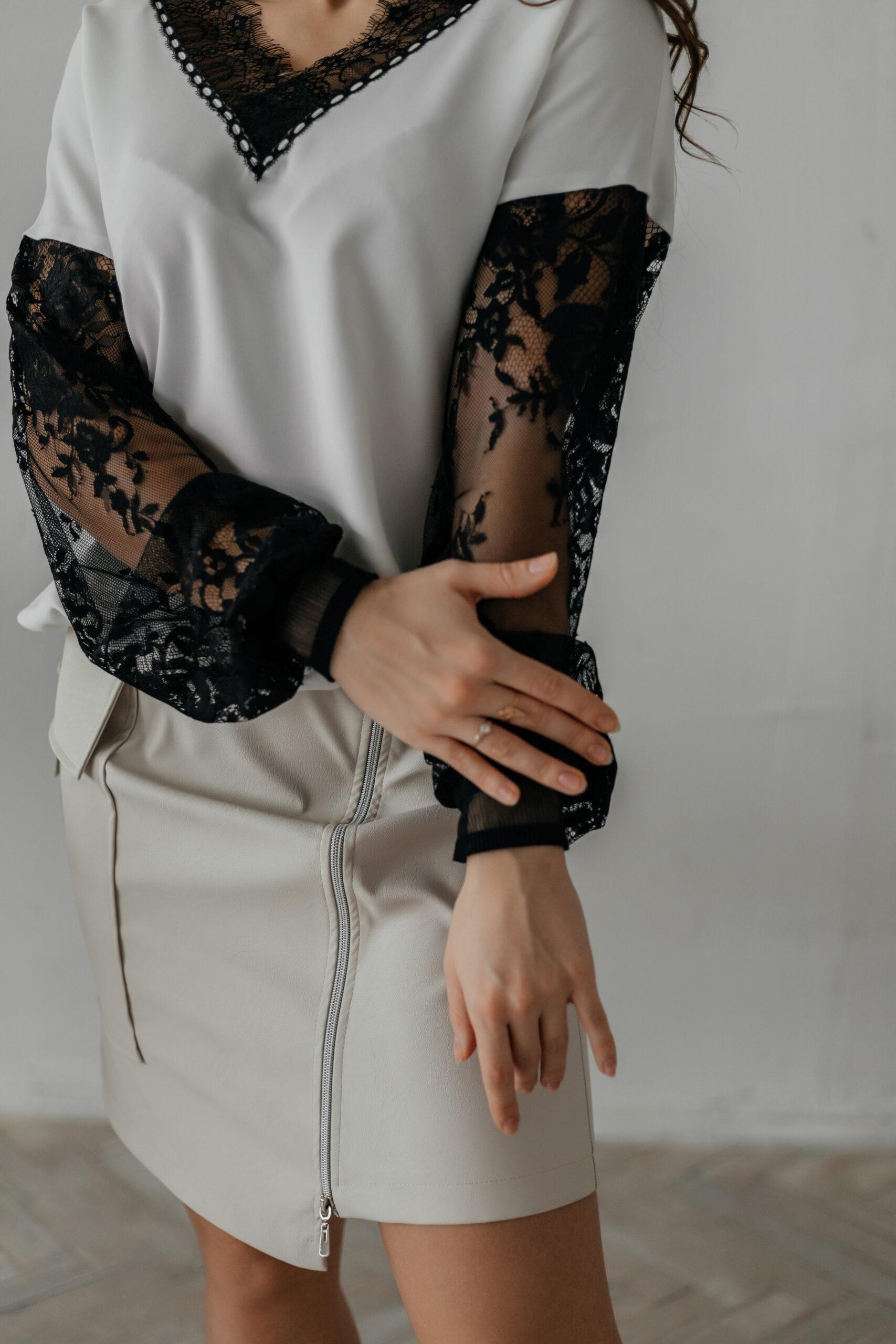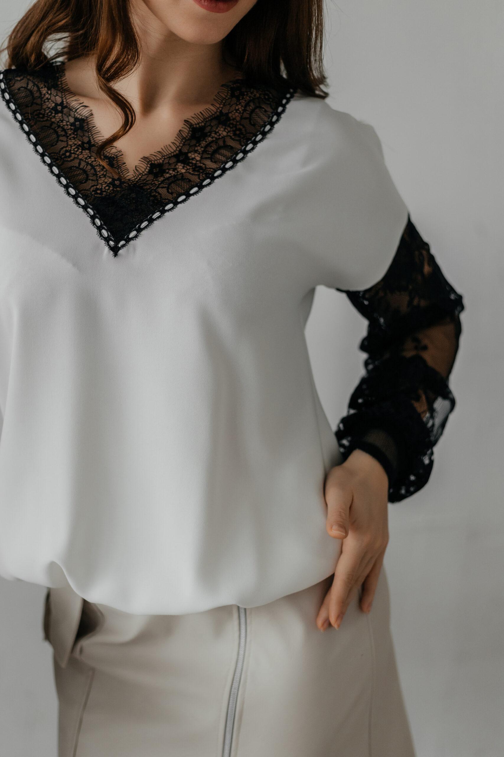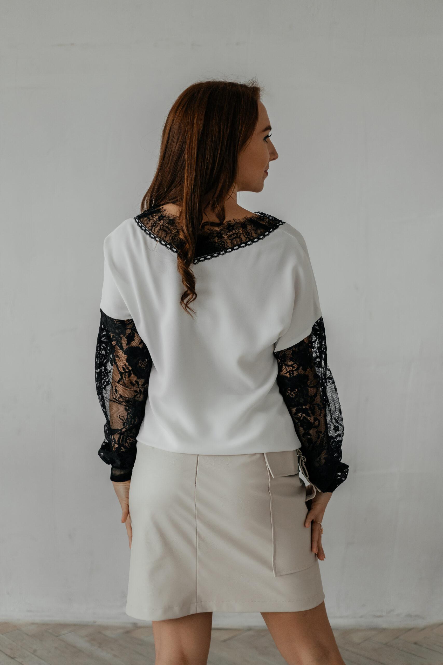 Блуза женская, нарядная. Модель комбинированная, вырез, рукава выполнены из французского кружева.