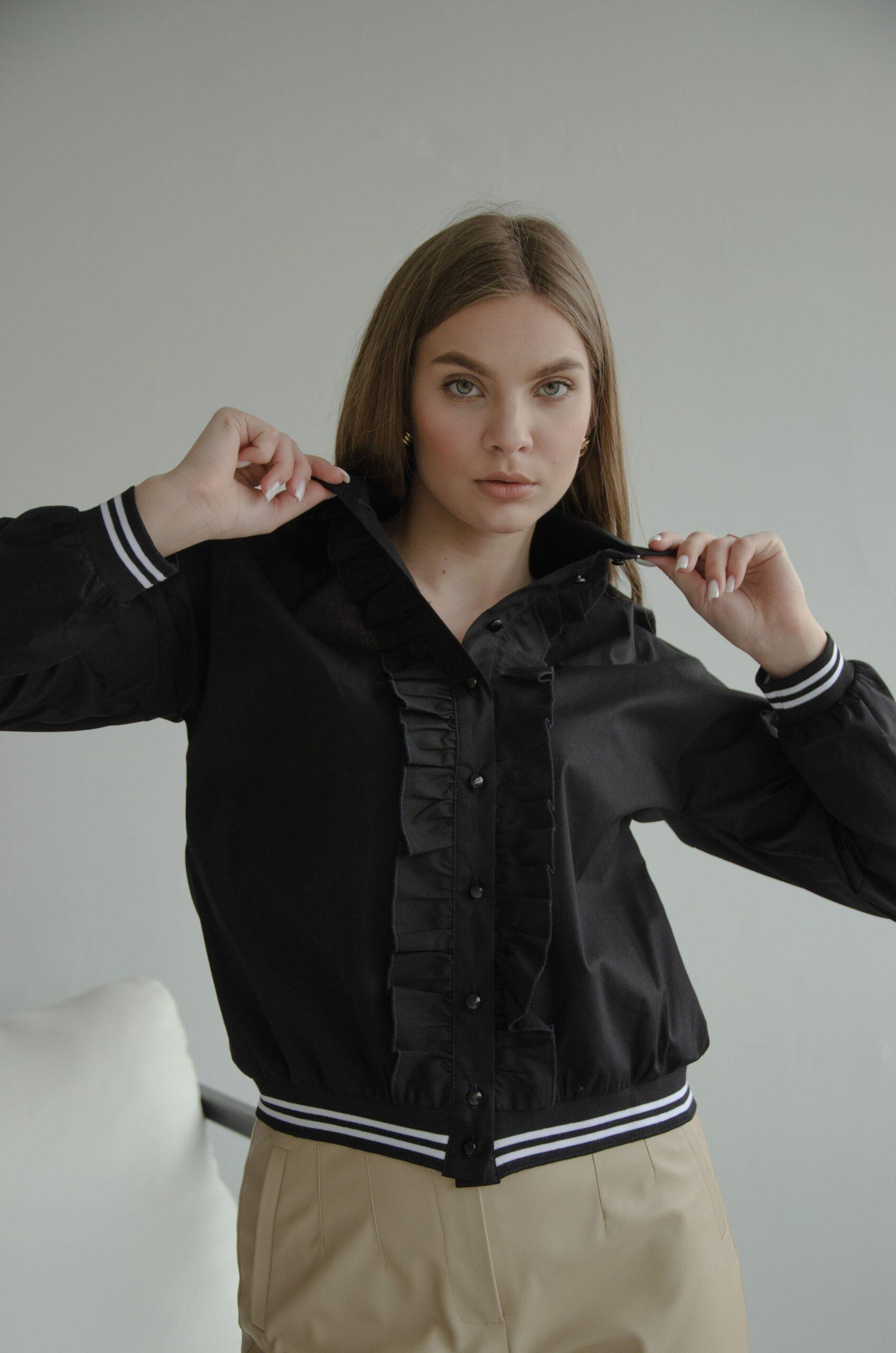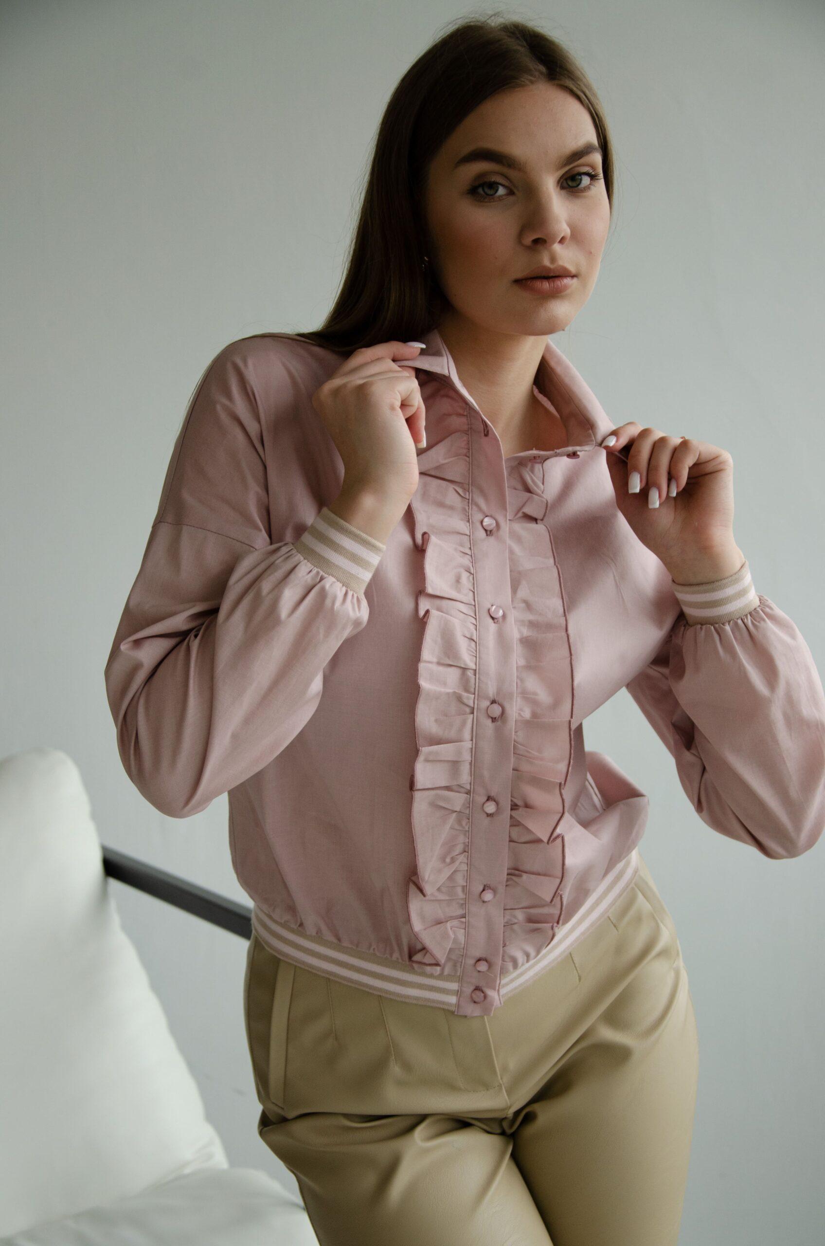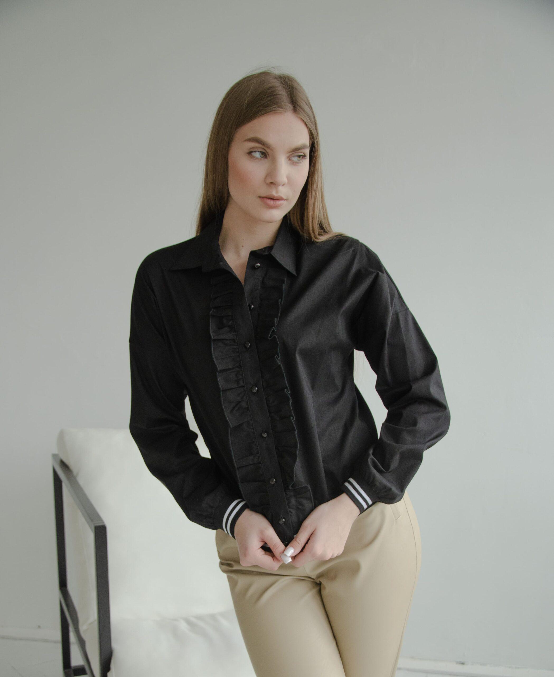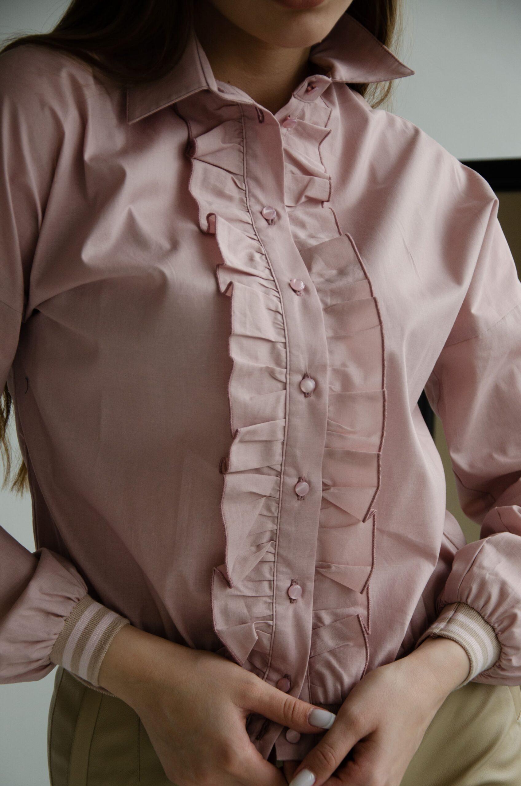 Блузка женская, хлопковая, с длинным рукавом на манжете — резинке. Такая же резинка идет и по низу блузки. Спереди планка с пуговицами и рюшами.