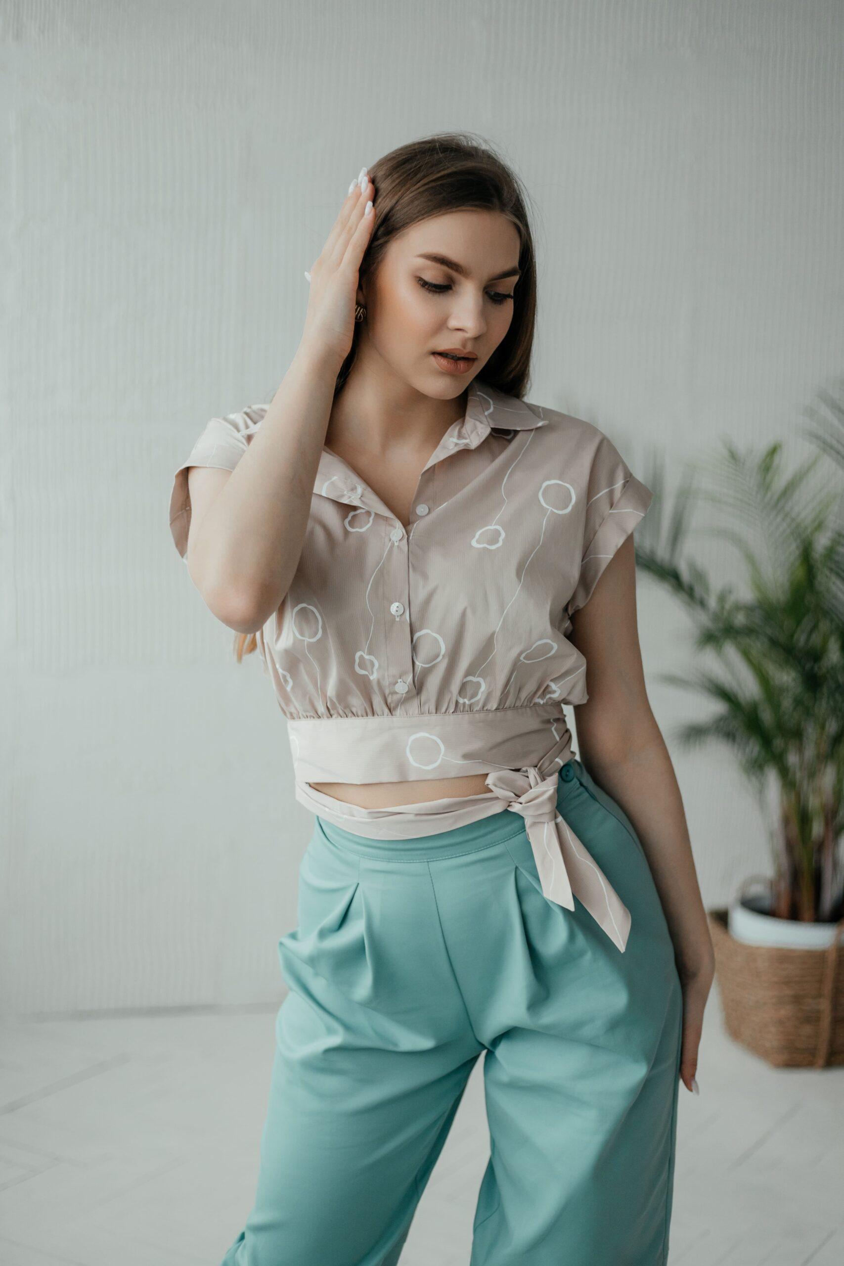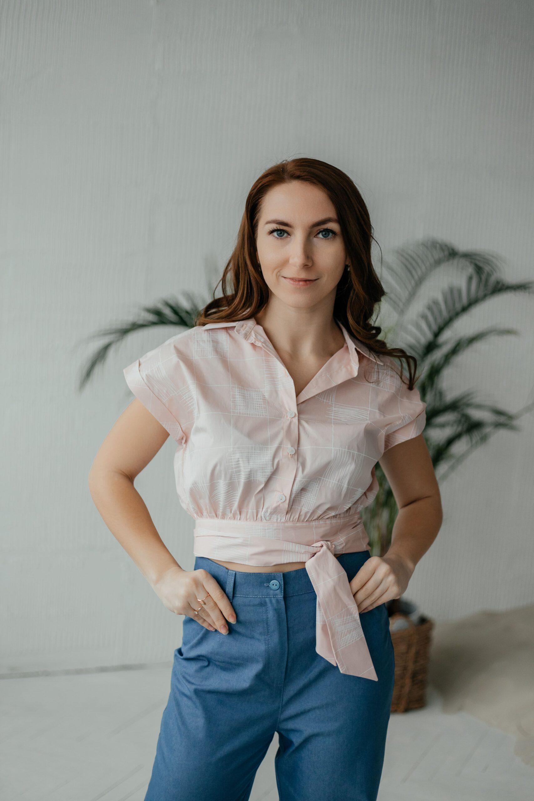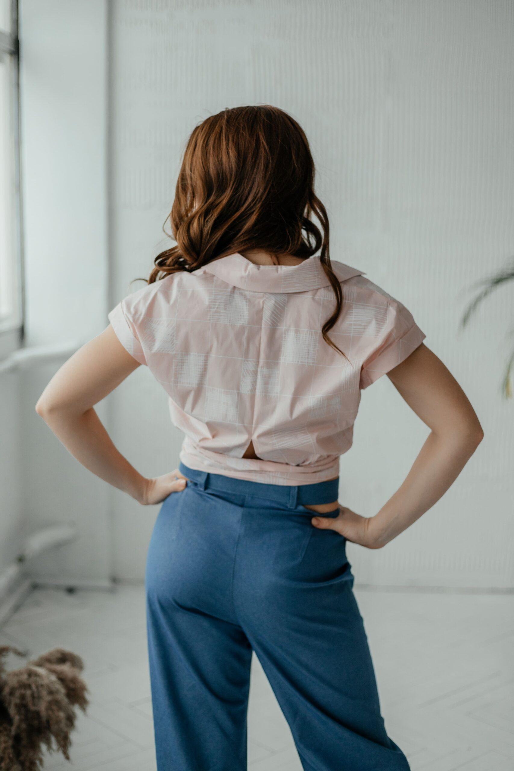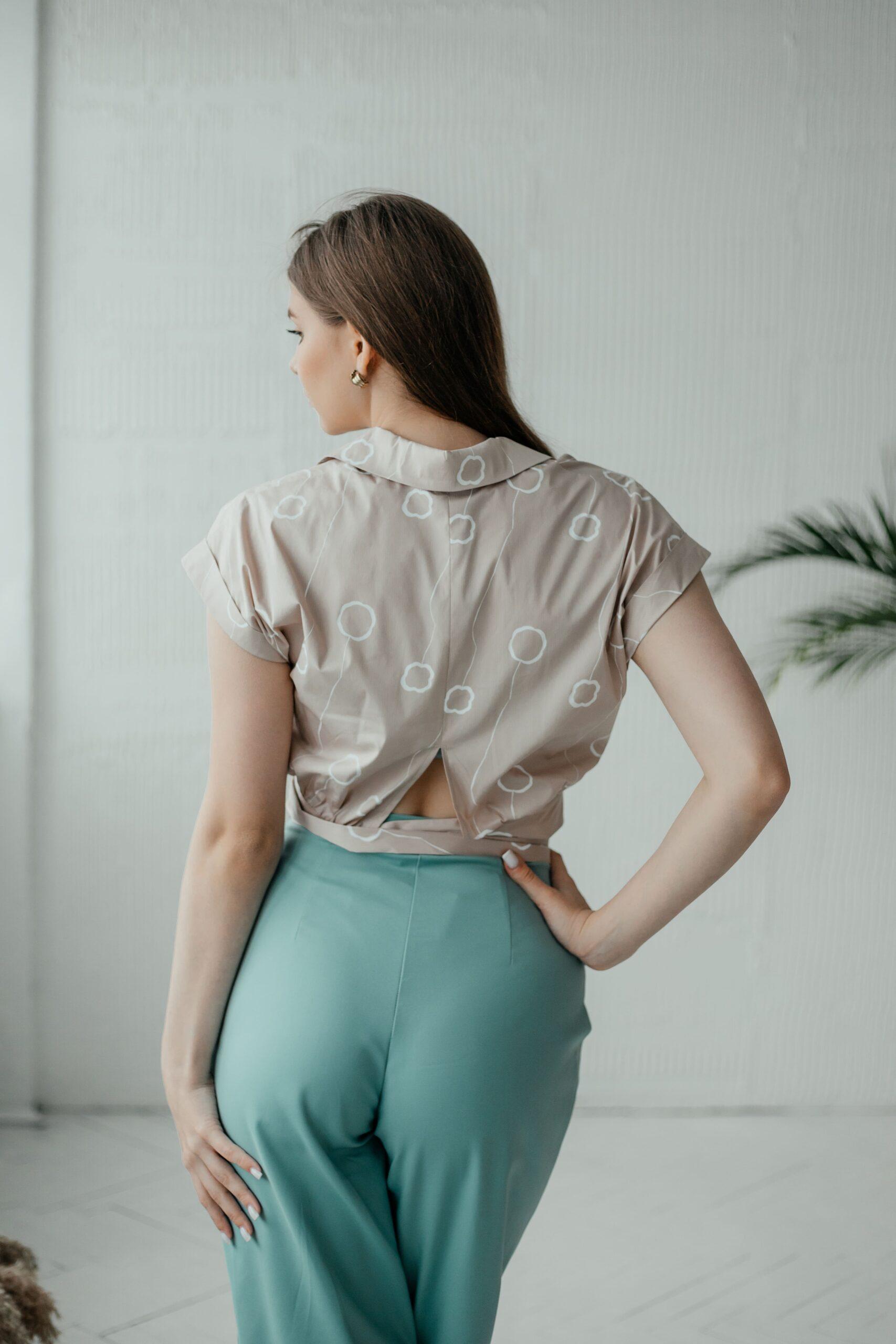 Блузка женская, укороченная. В модели короткий рукав, воротничок, блузка завязывается сзади на бант.