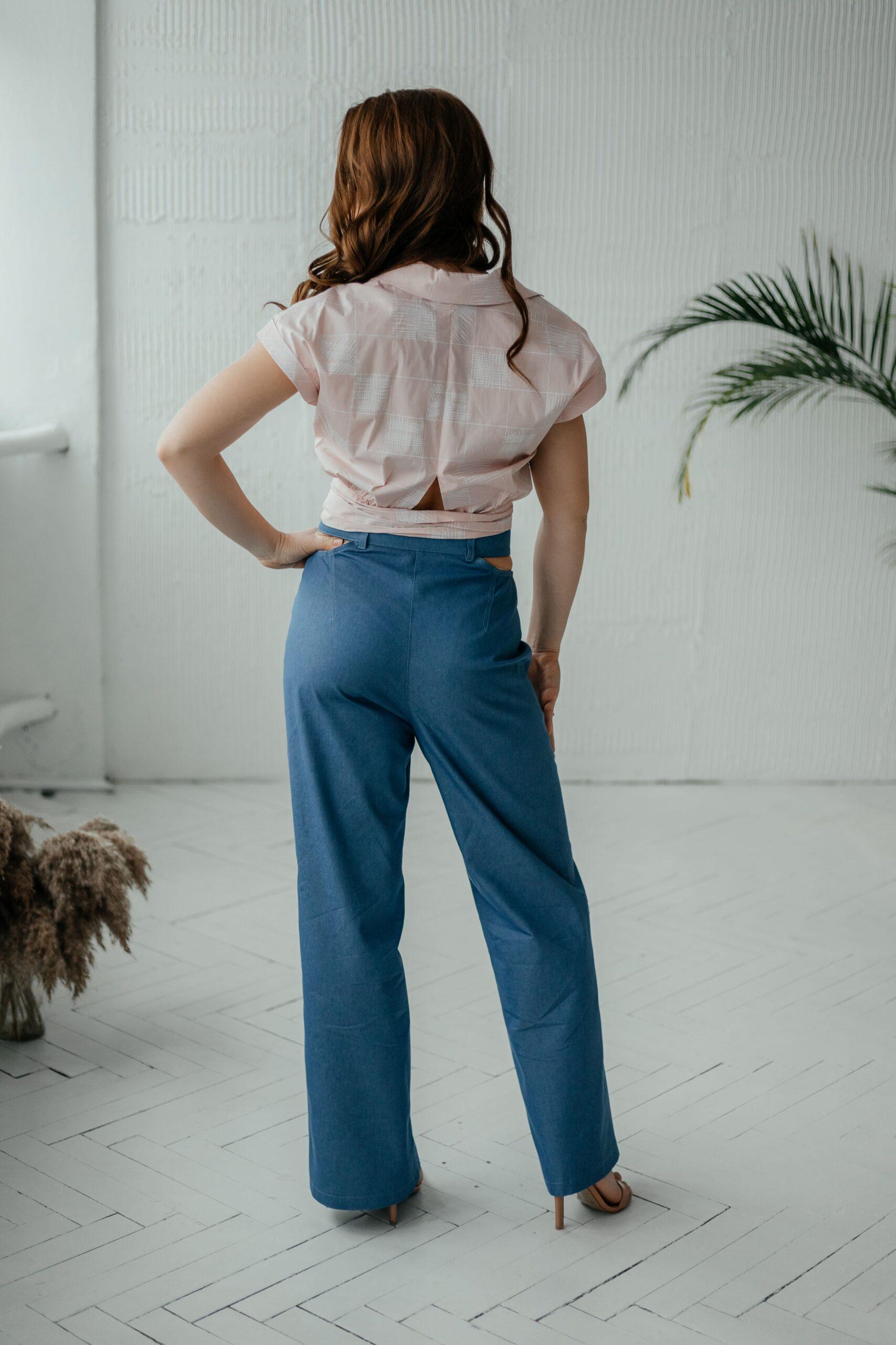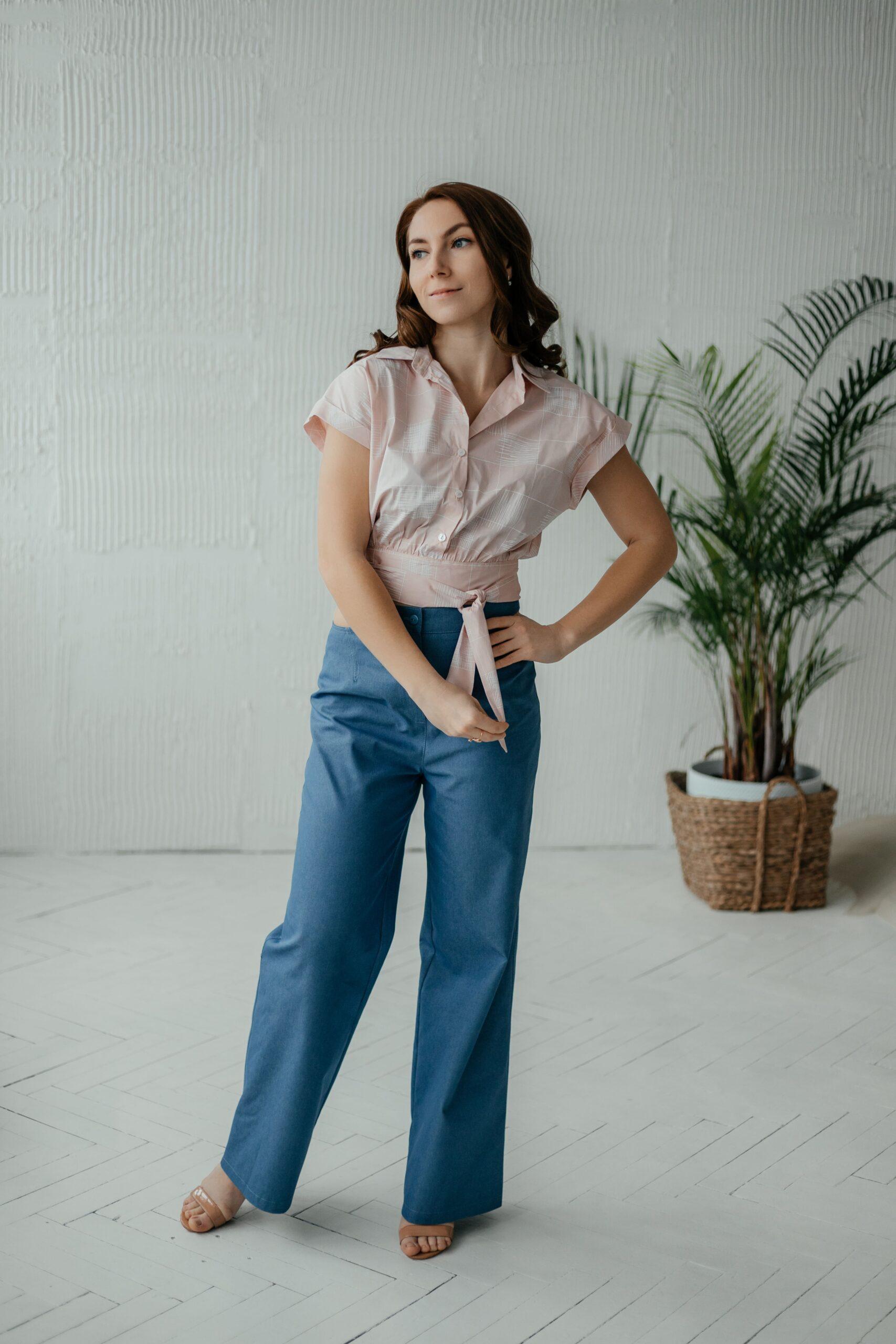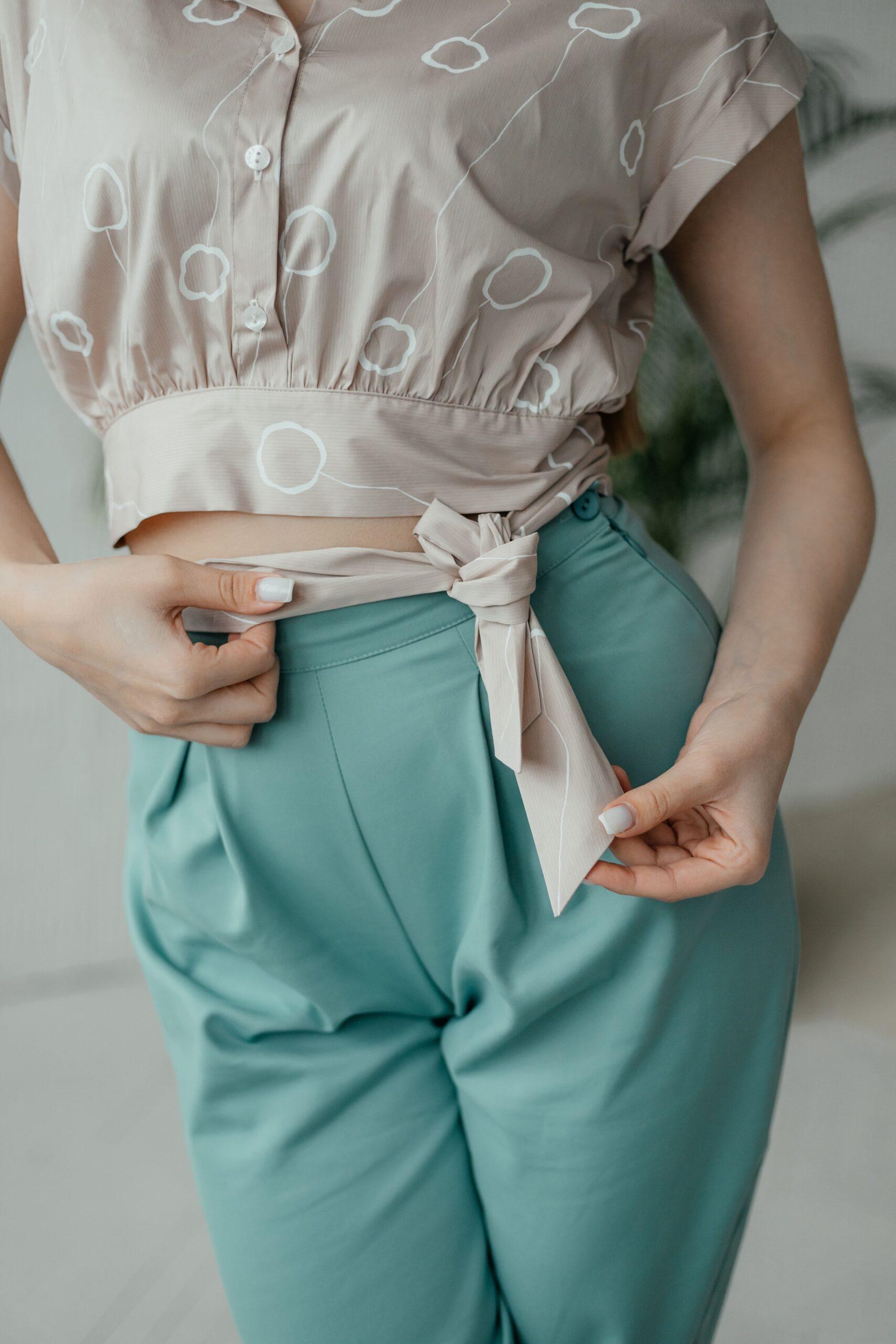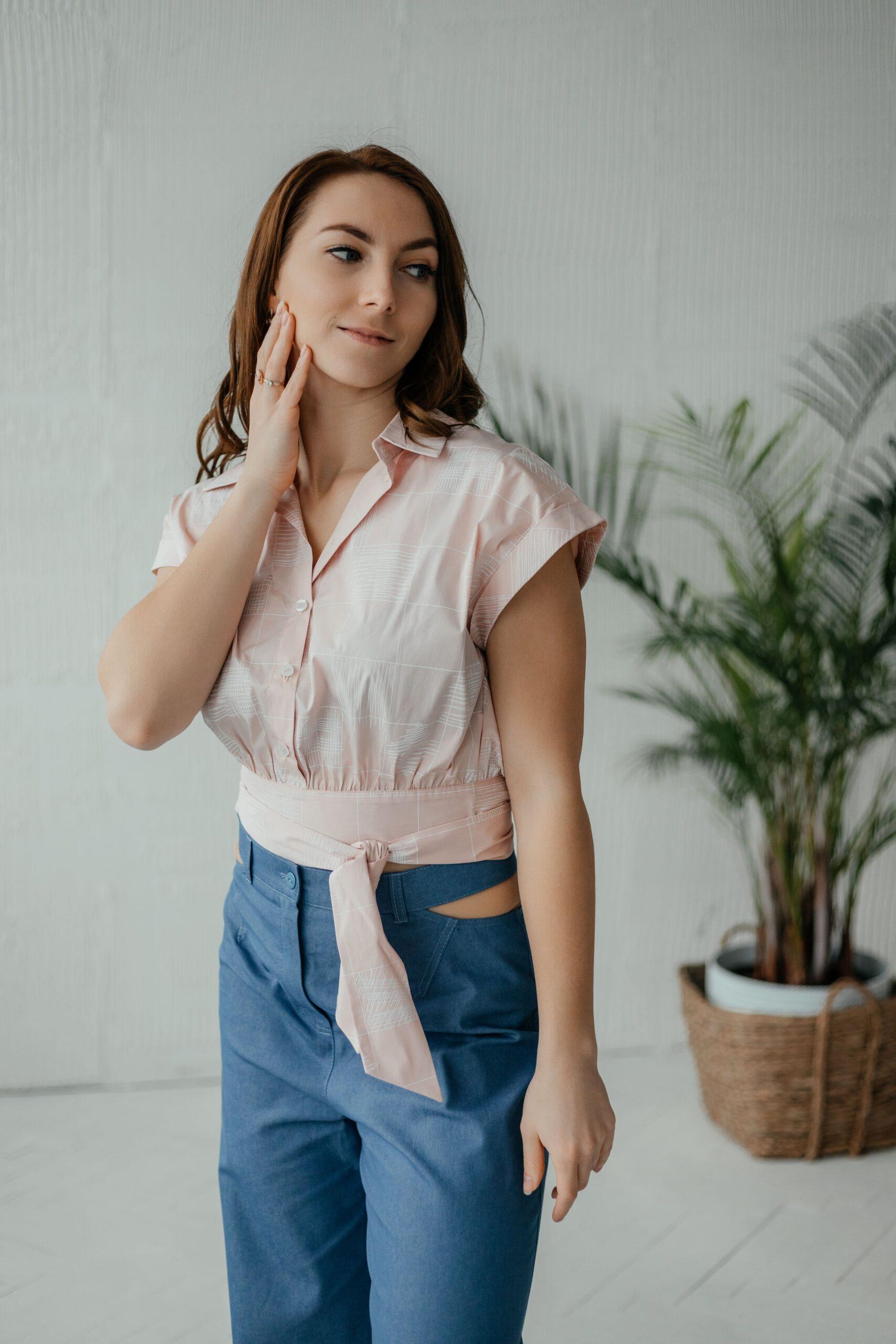 Блузка женская, укороченная. В модели короткий рукав, воротничок, блузка завязывается сзади на бант.