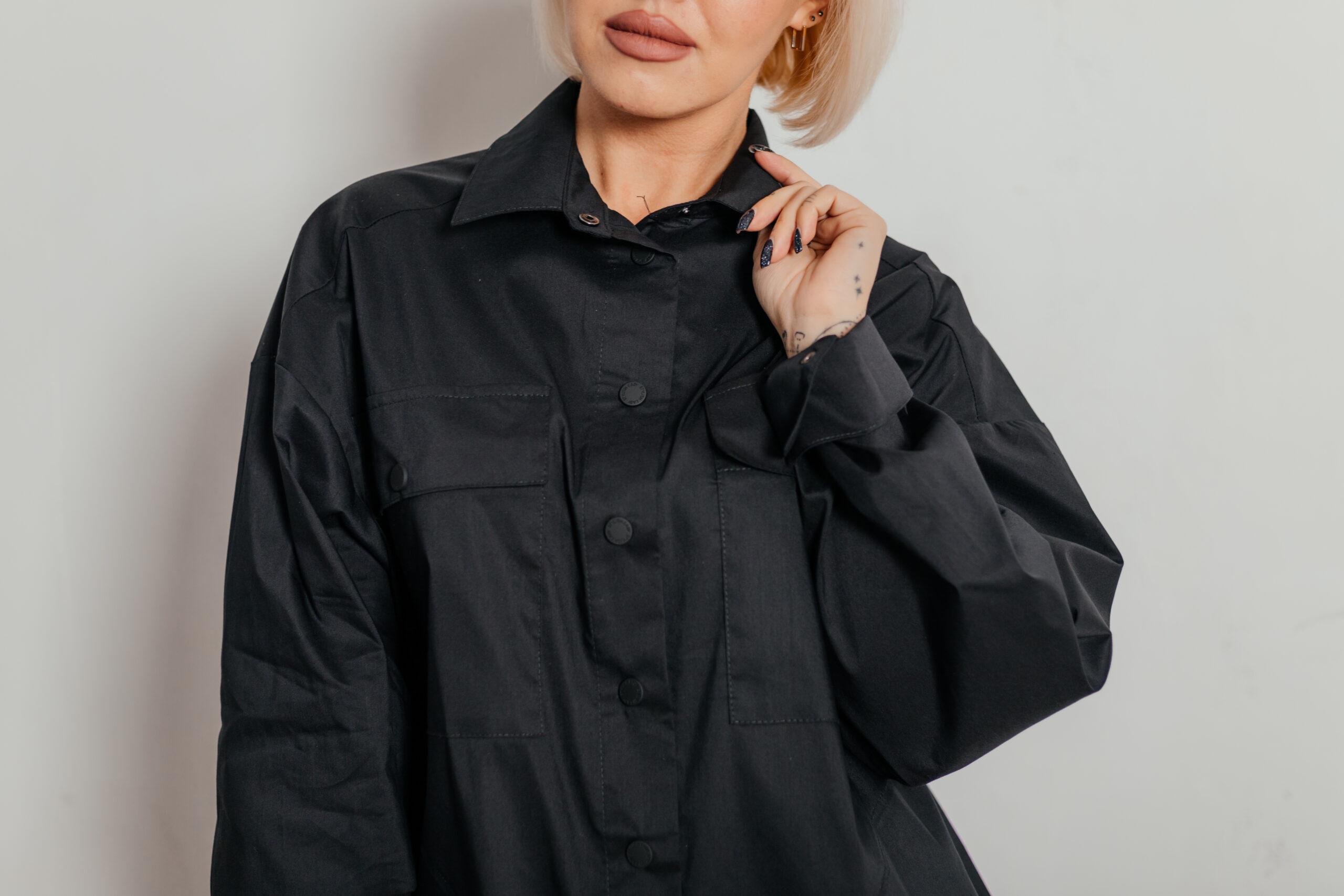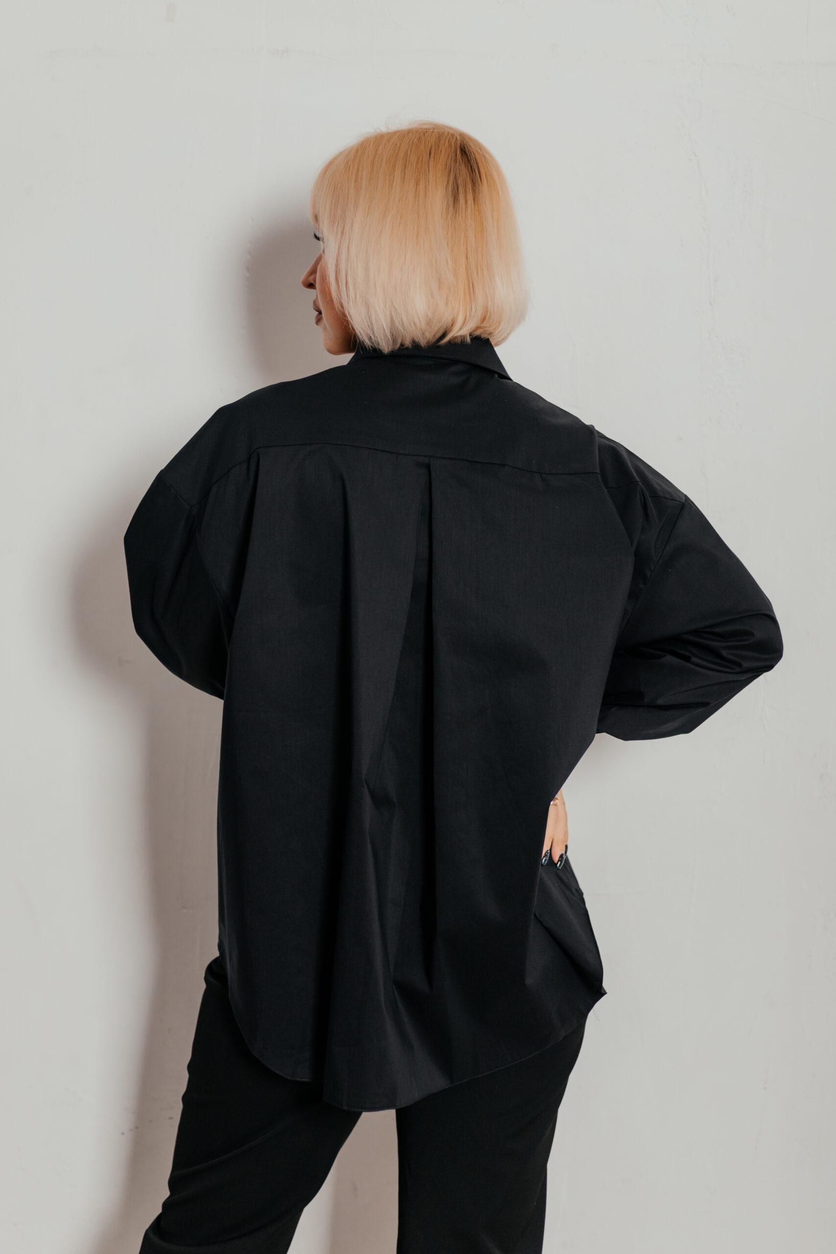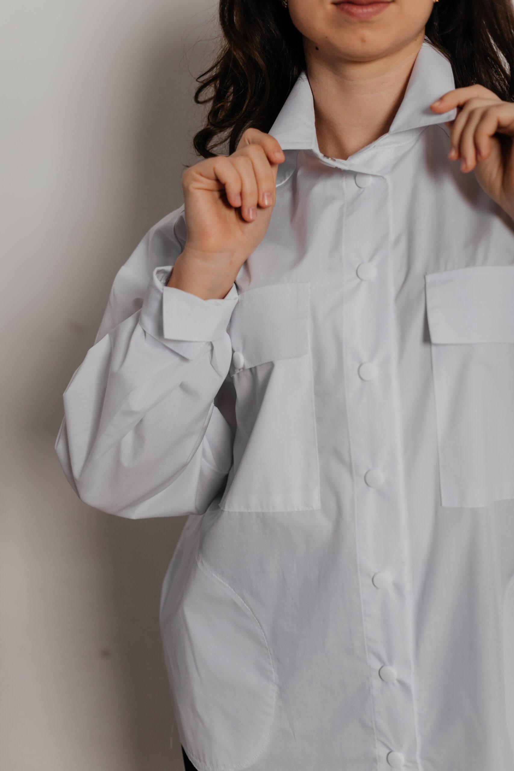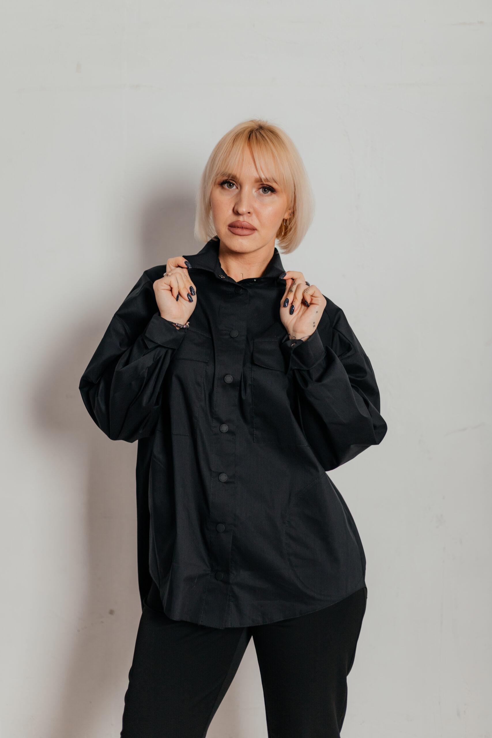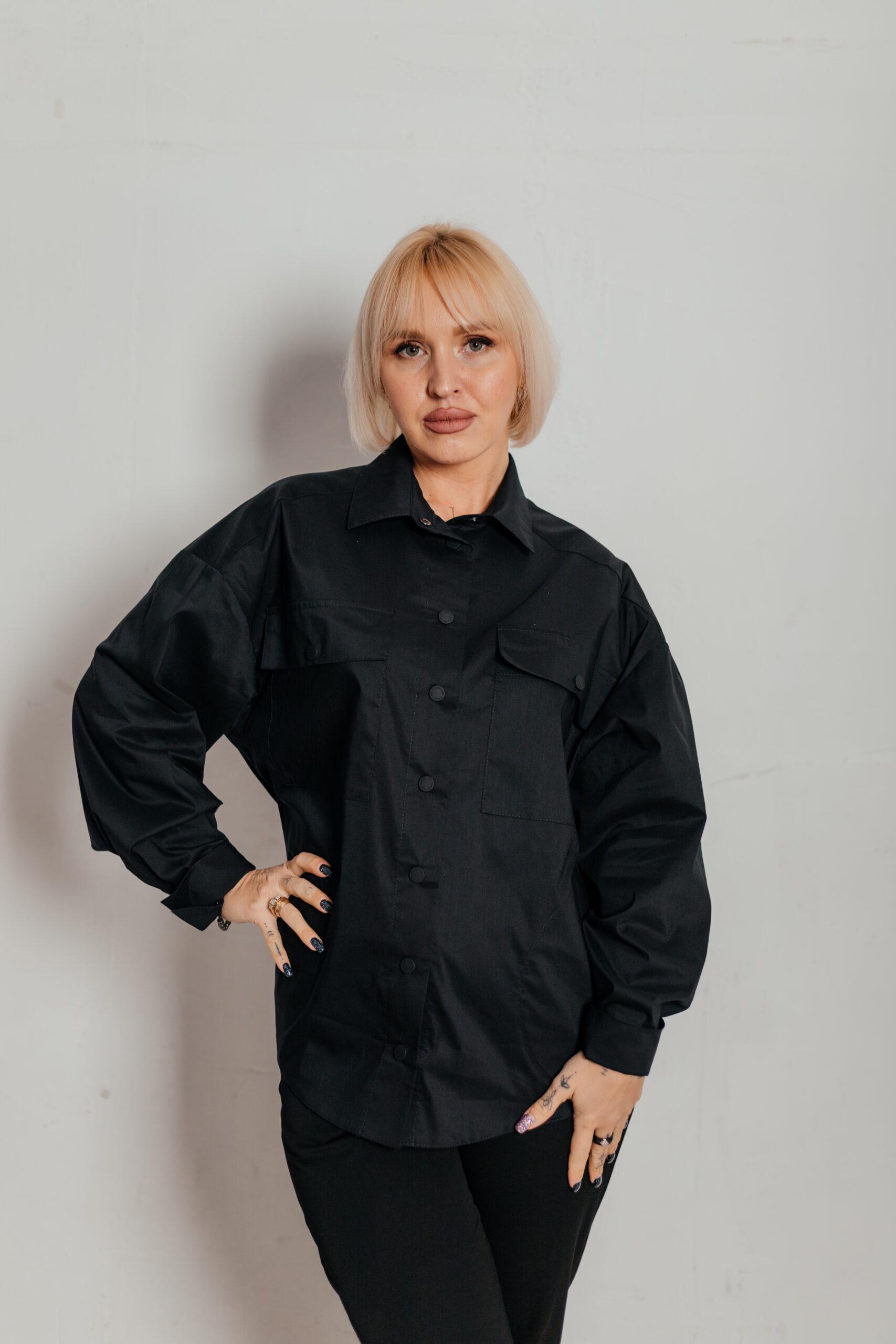 Блузка женская, стильная, оверсайз. Модель с длинным рукавом, на манжетах, спереди планка с пуговицами, два нагрудных кармана с клапанами и два боковых кармана.