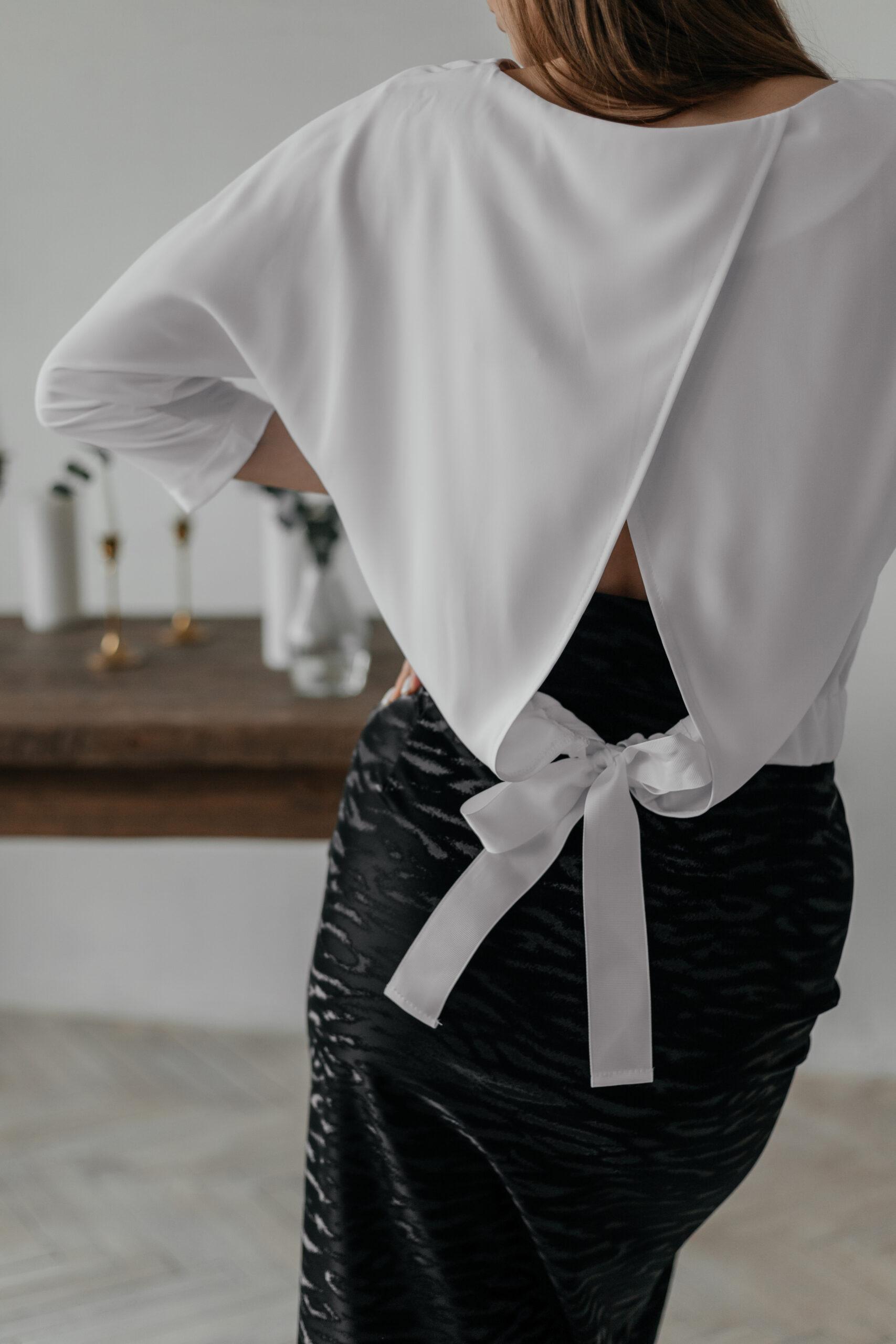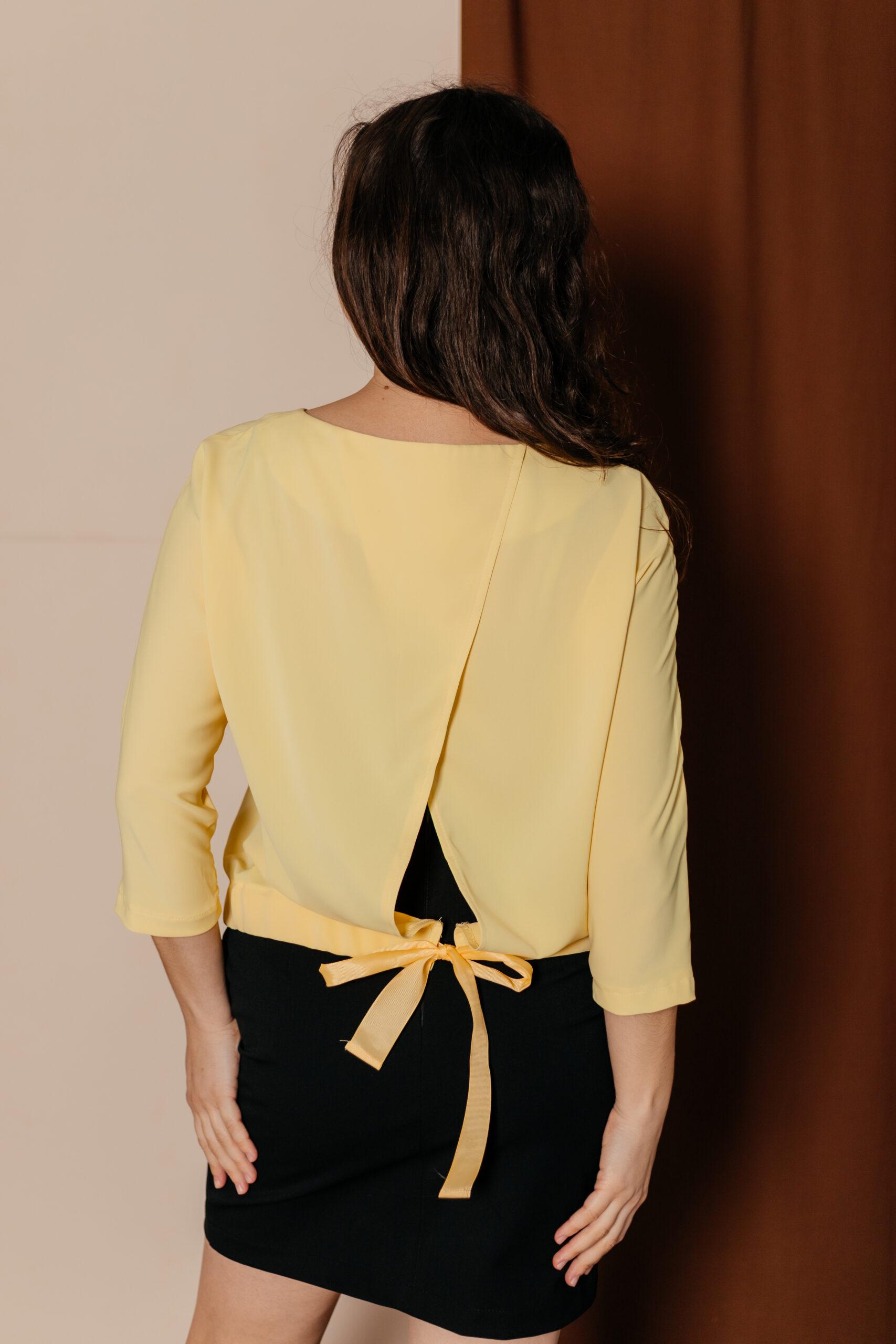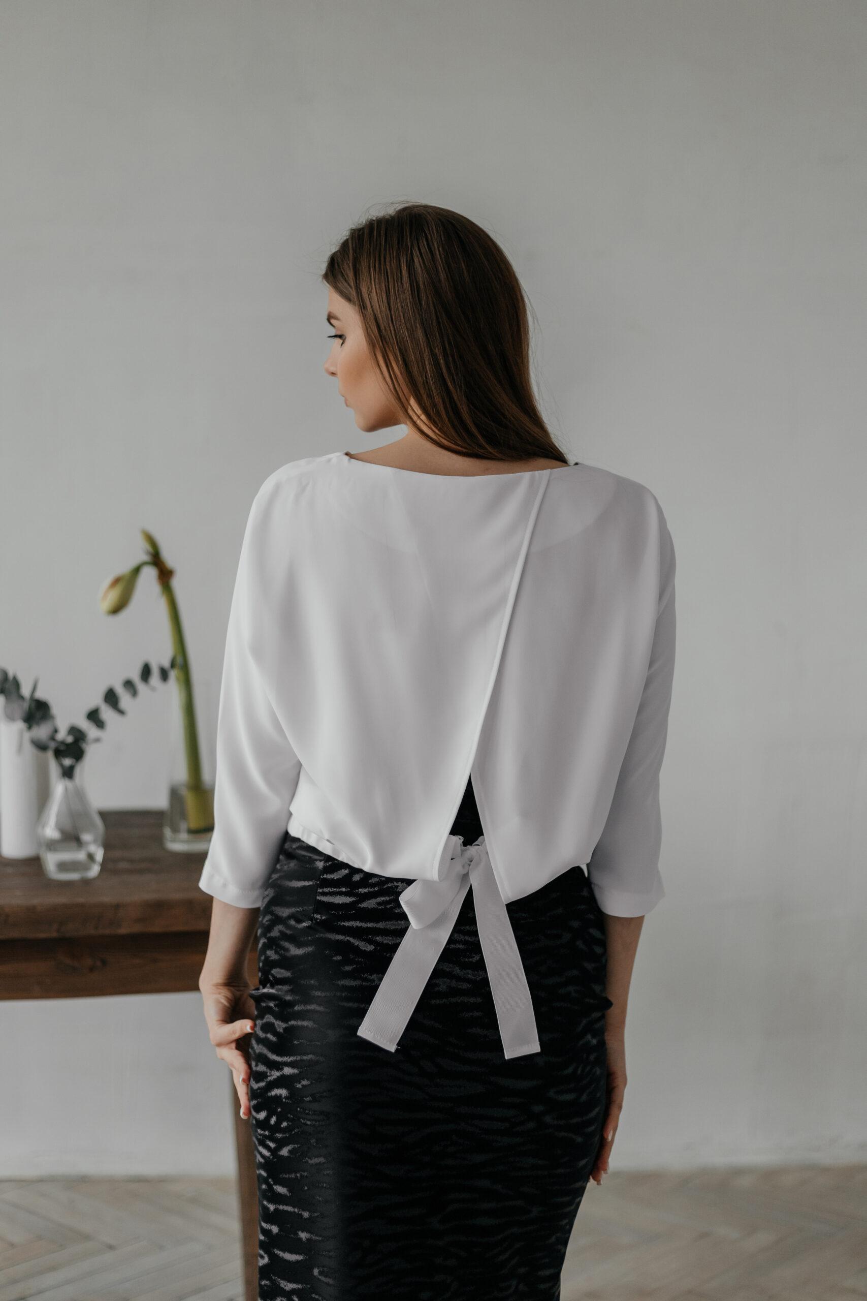 Блузка женская, с рукавом три четверти. В этой модели открытая спинка снизу на широкой ленте, которую можно завязать на бант.