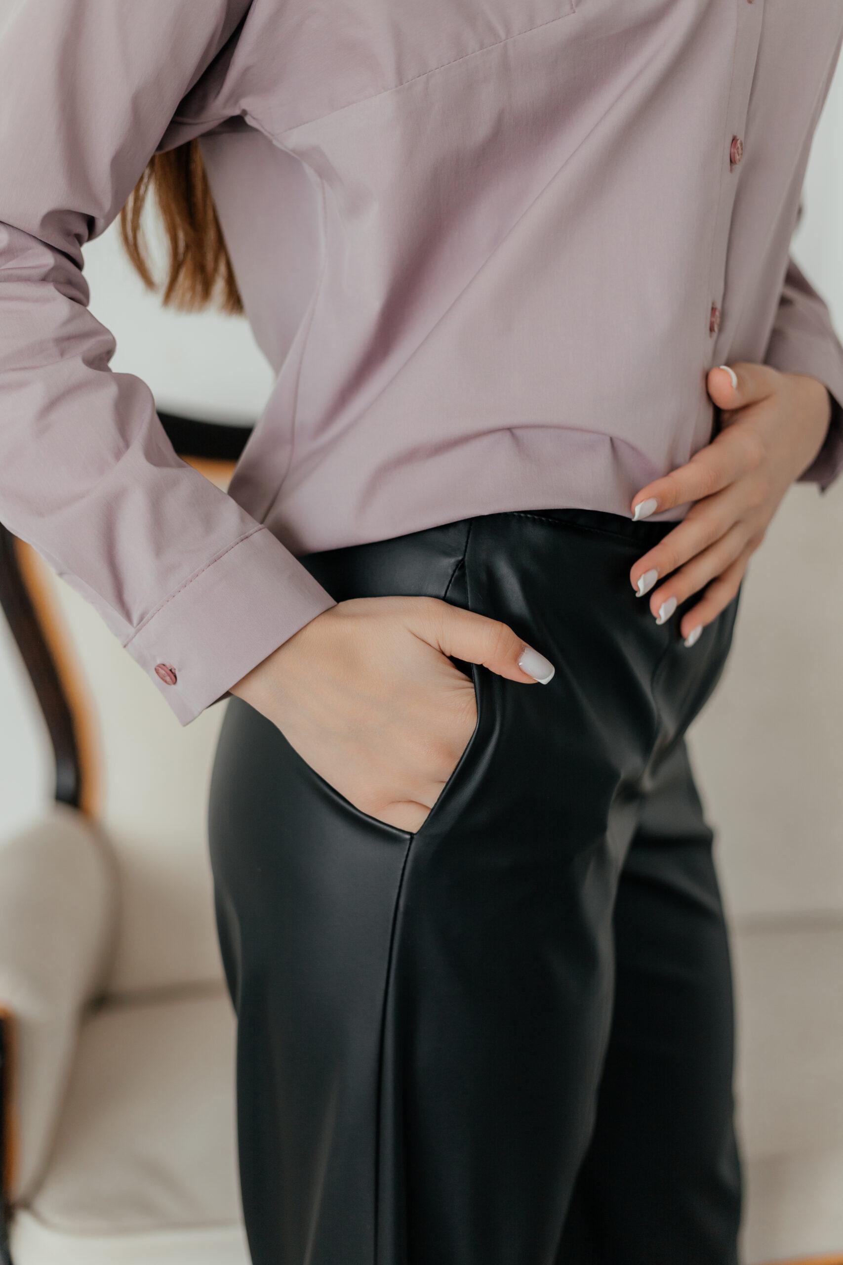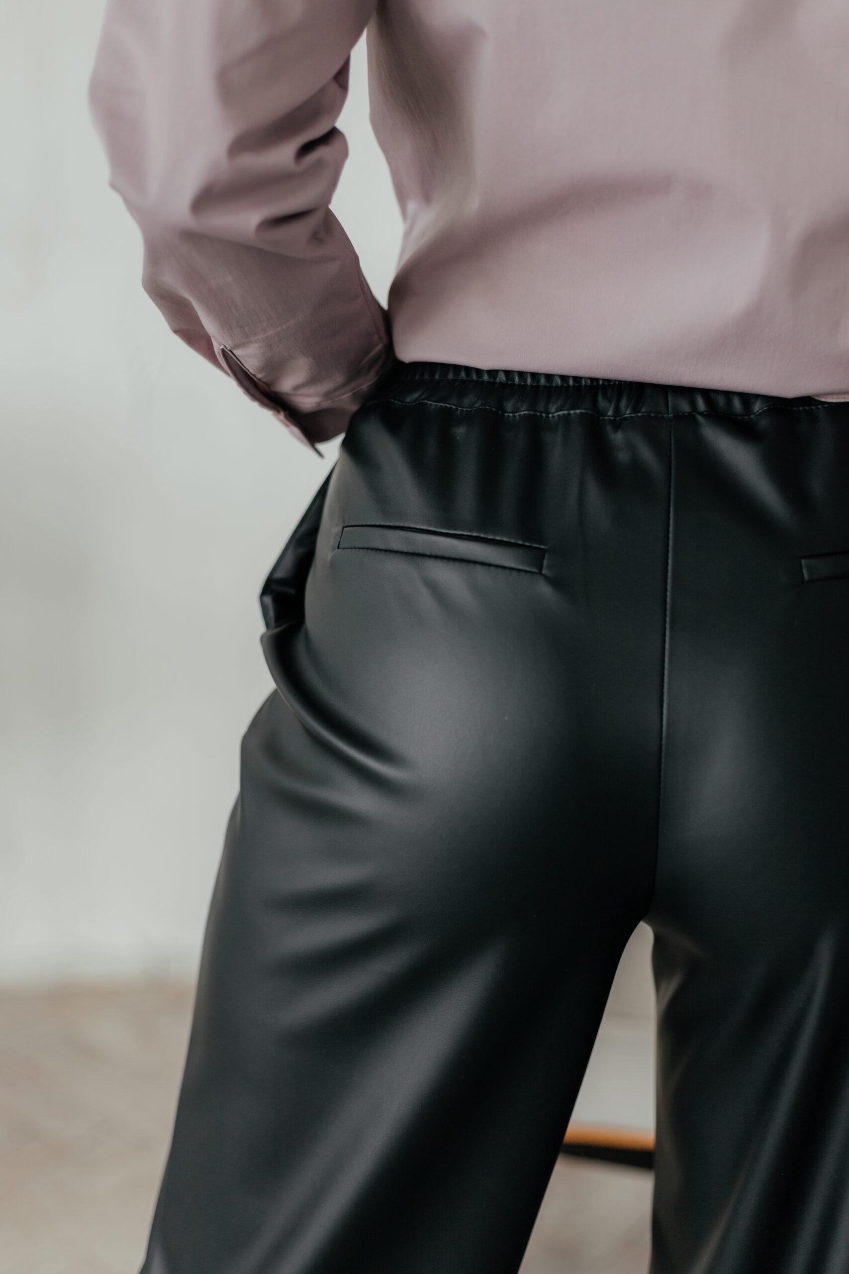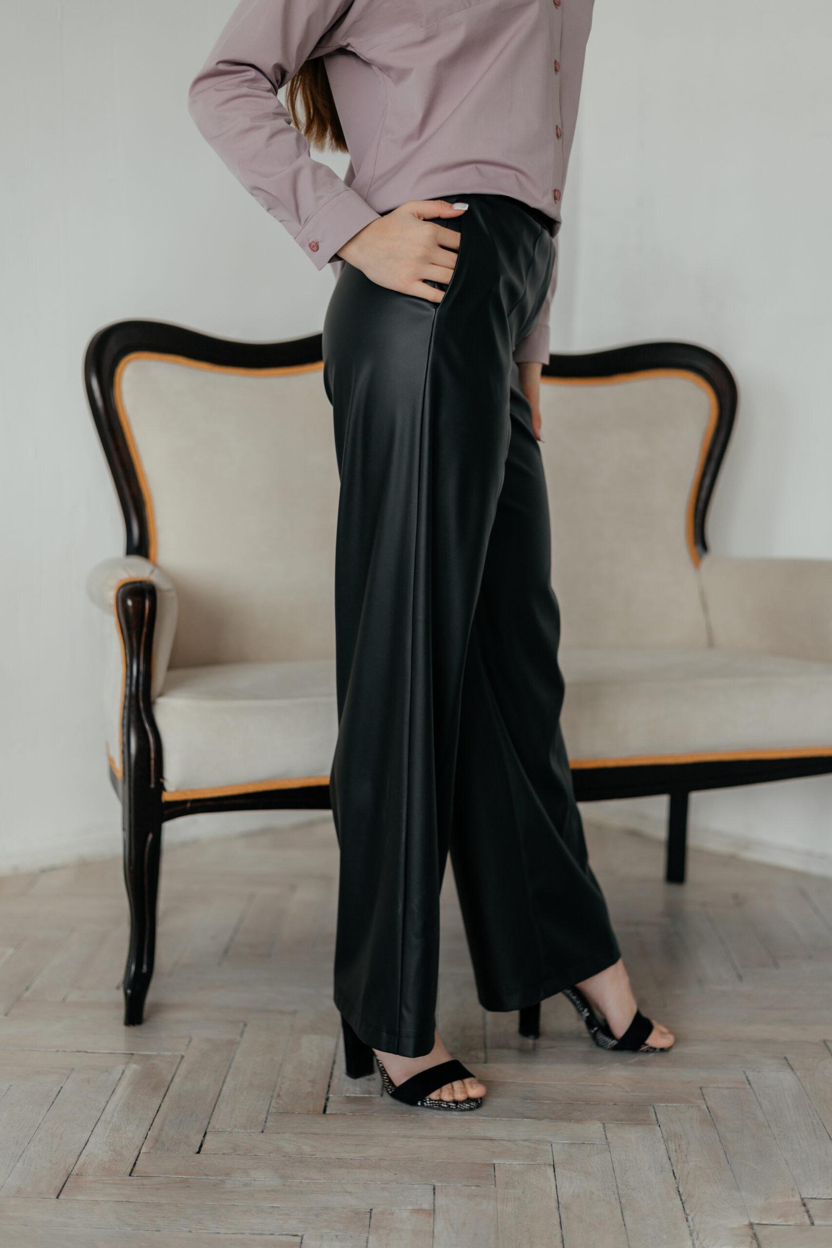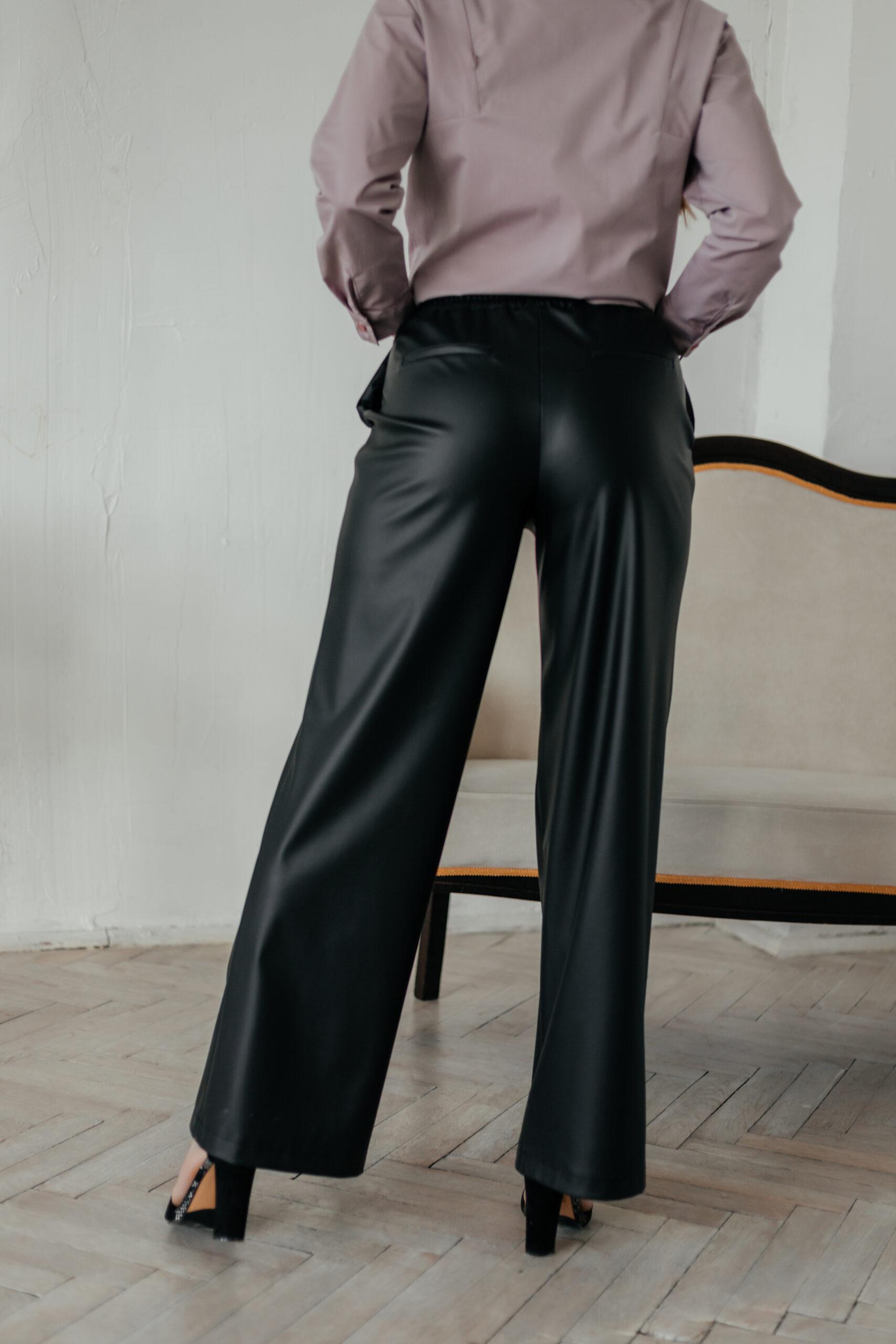 Брюки прямые свободного кроя на резинке из эко кожи. Брюки с карманами в боковых швах. По переду брюк швы с отделочными строчками. По спинке имитация кармана с листочкой. Длина брюк по боковому шву -109 см ( с поясом).
