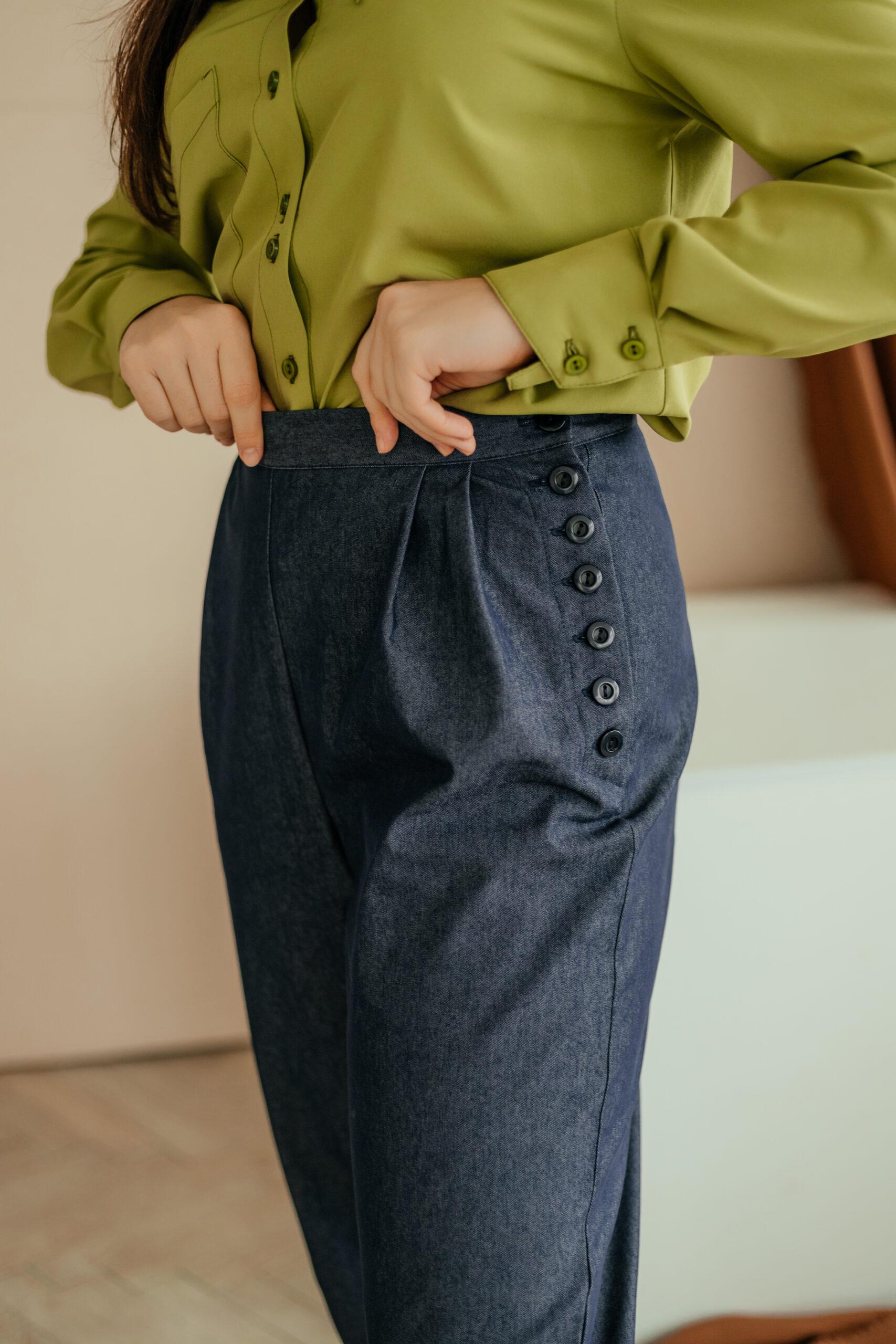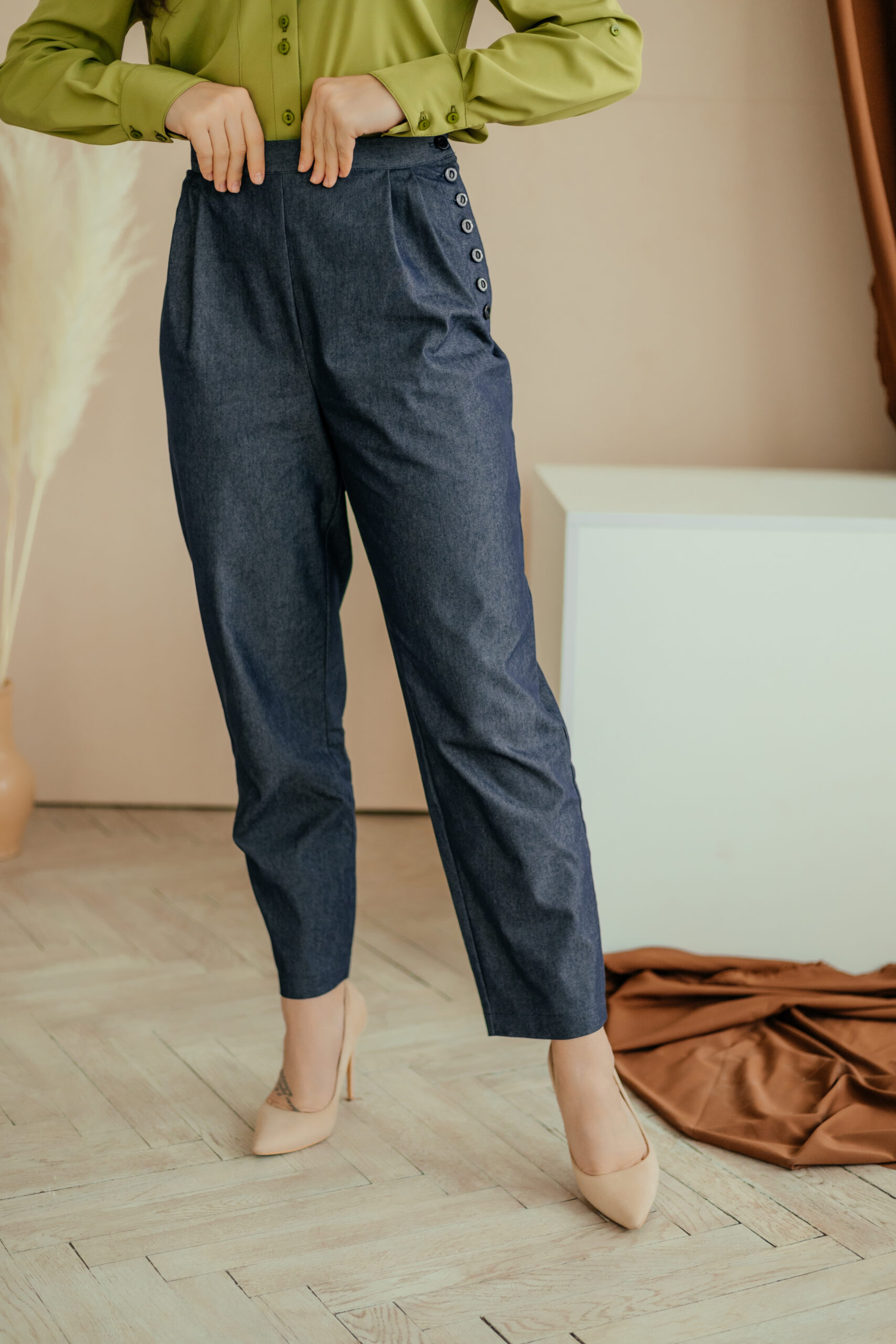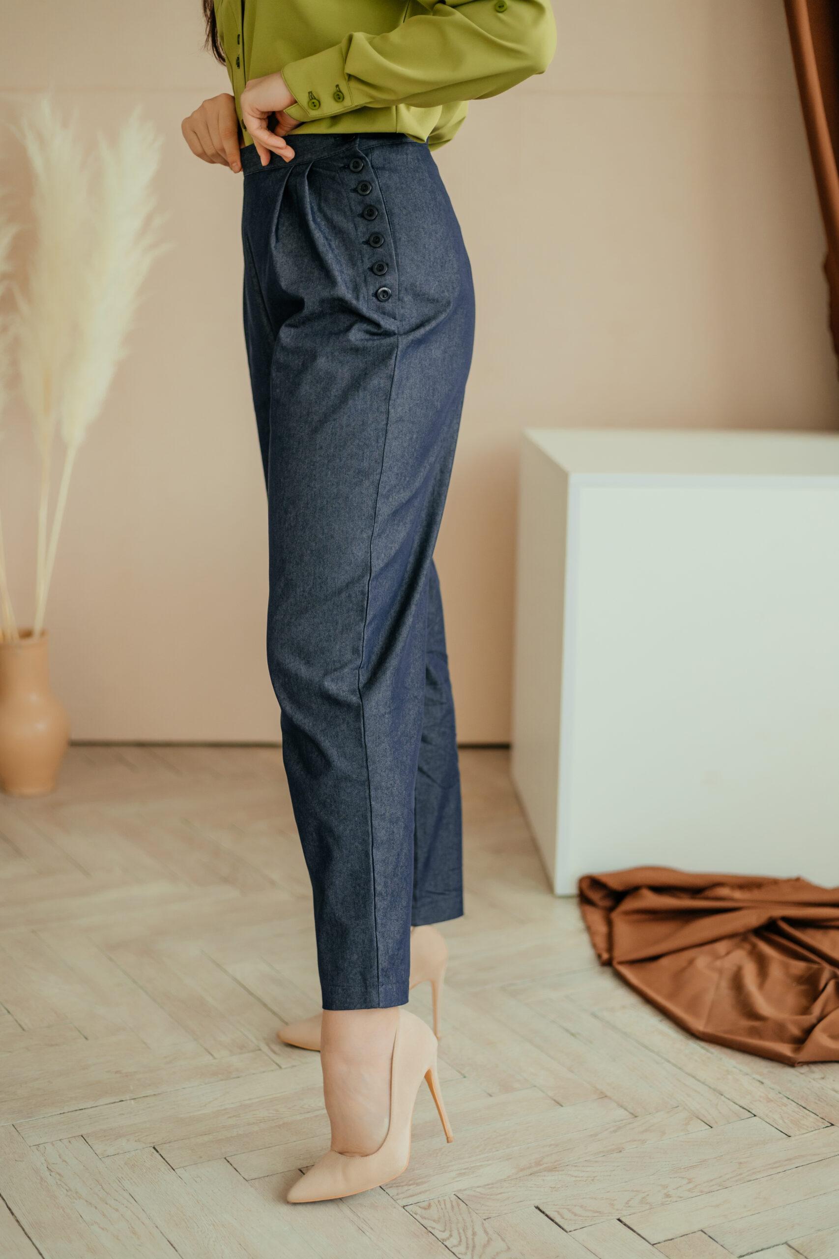Брюки женские из хлопка длина семь восьмых, высокая линия талии. Форма модели брюк «бананы» , заужены к низу. Сверху на брюках защипы , слева ряд пуговиц.