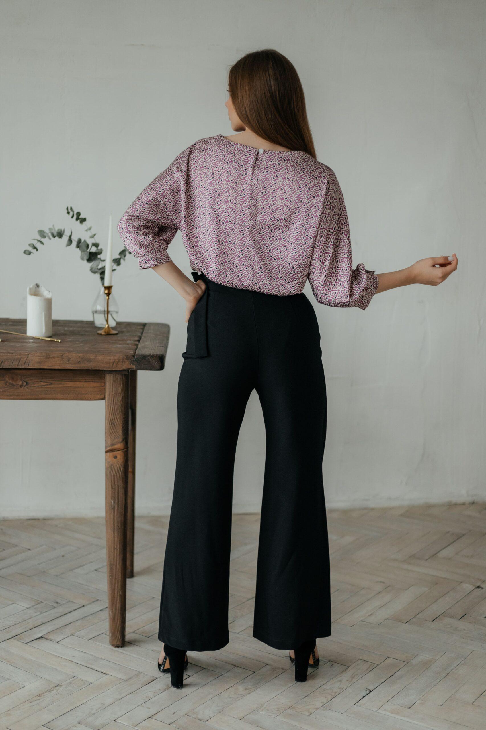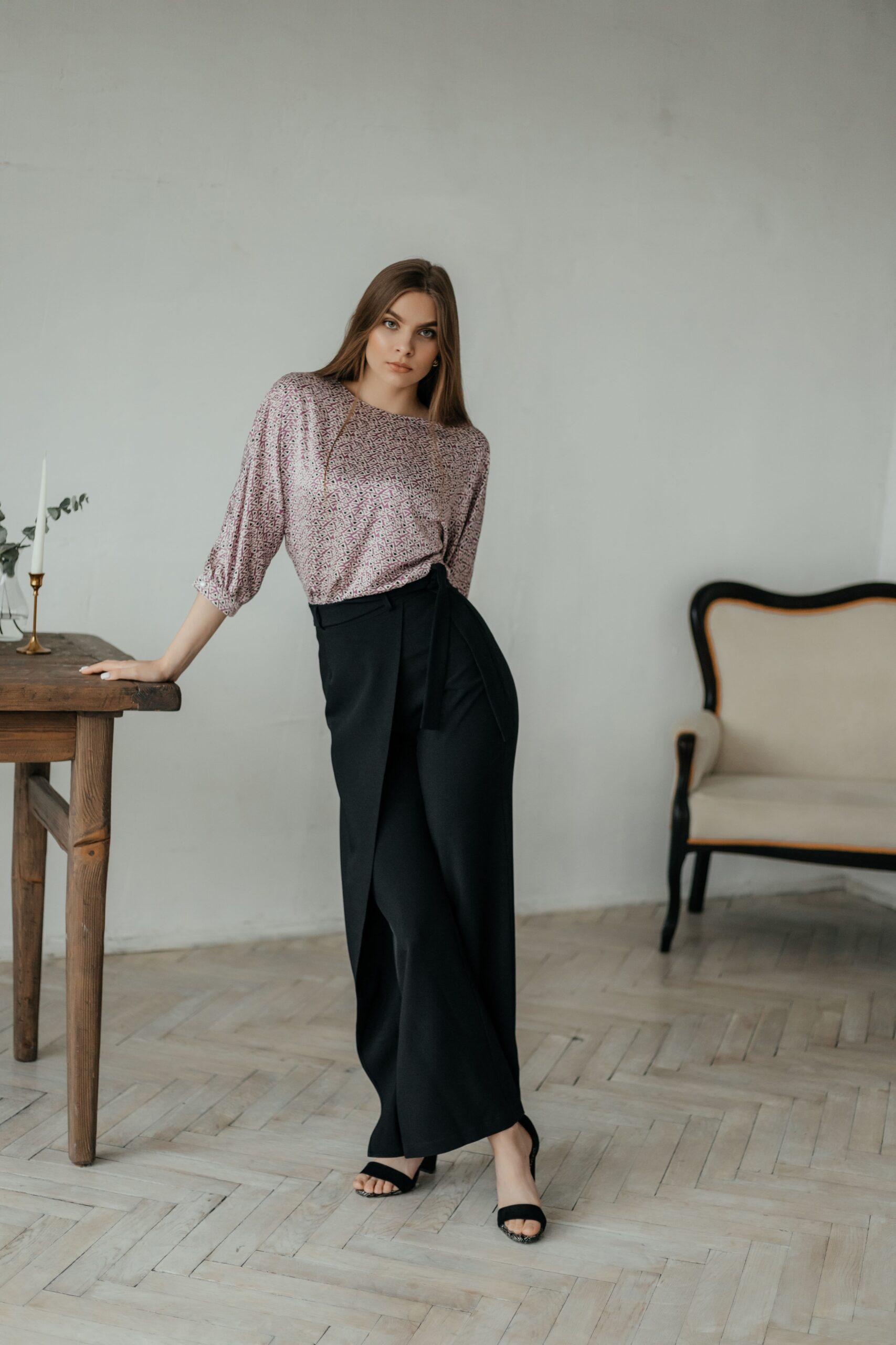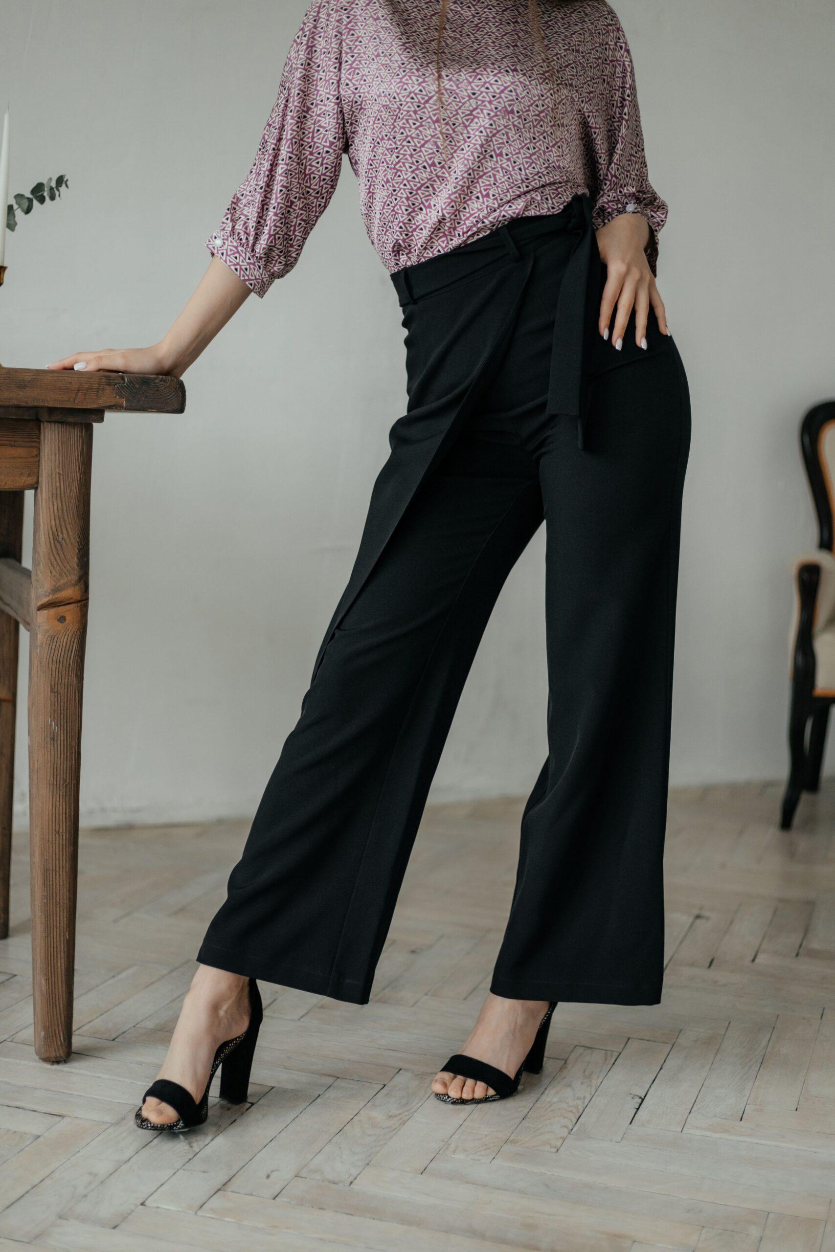 Брюки женские с запахом, с высокой линией талии, со шлевками и тканевым поясом. Модель прямая, с широкими брючинами.