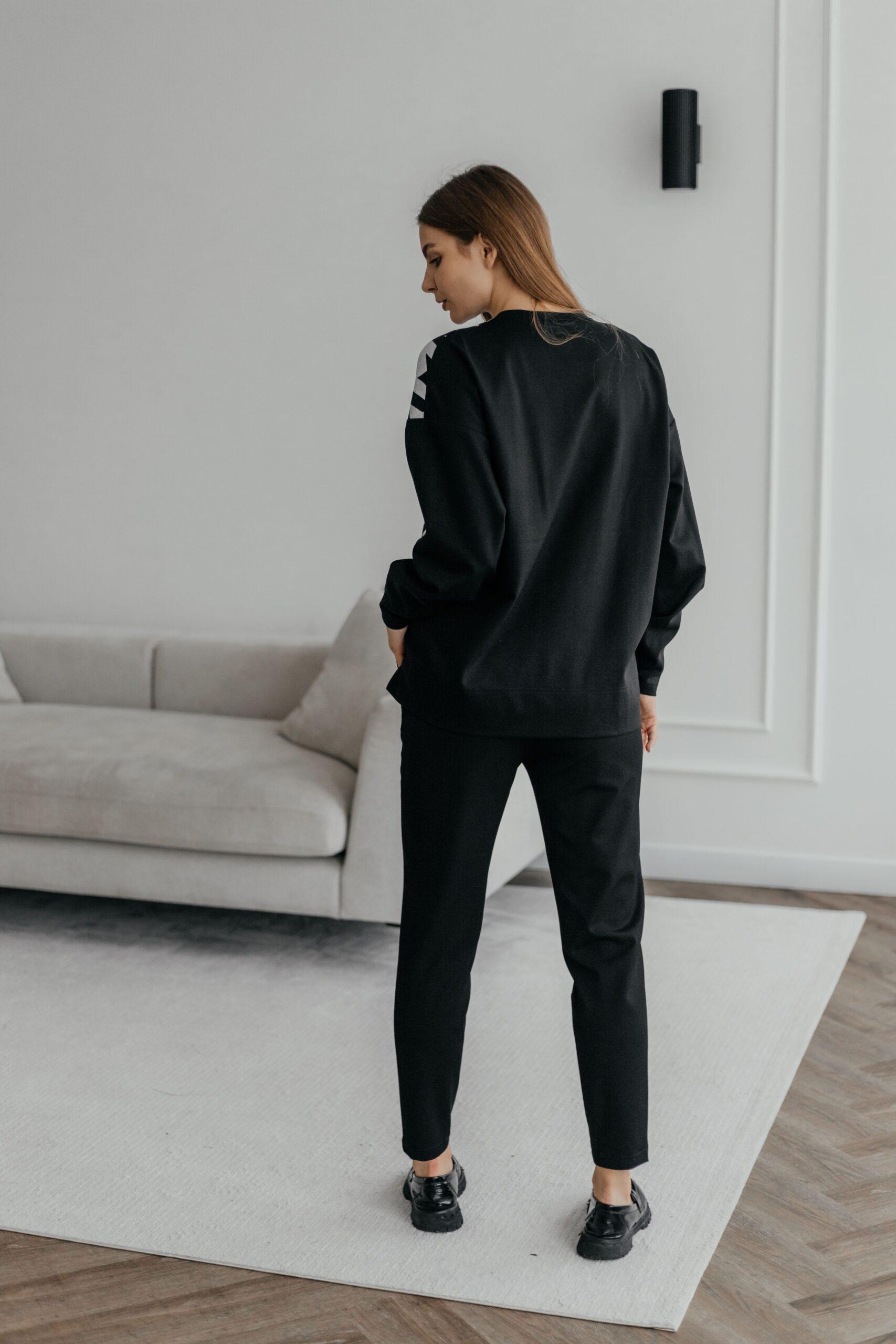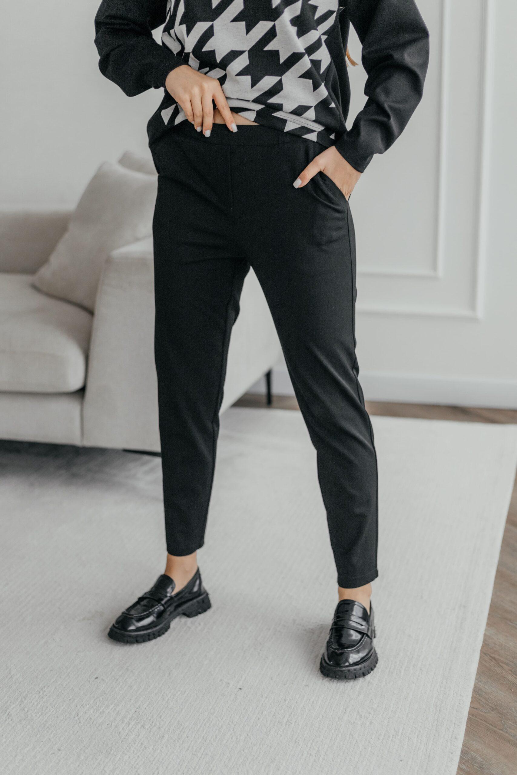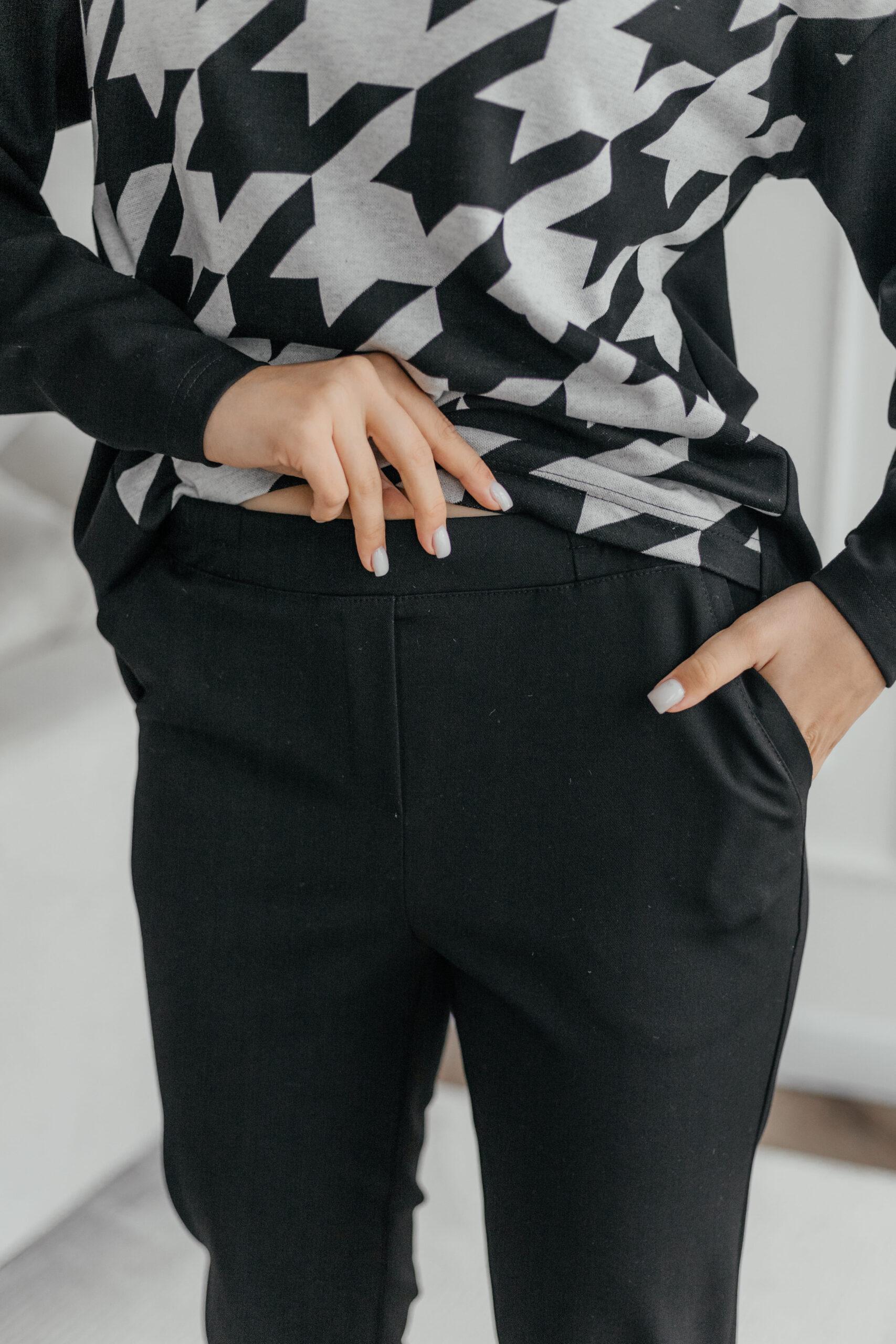 Брюки классические, пояс на резинке, зауженные к низу. Карман в притачных бочках. Вход в карман обработан планкой. Брюки предназначены для повседневной носки. Эти брюки займут достойное место в гардеробе. Длина брюк — 95см