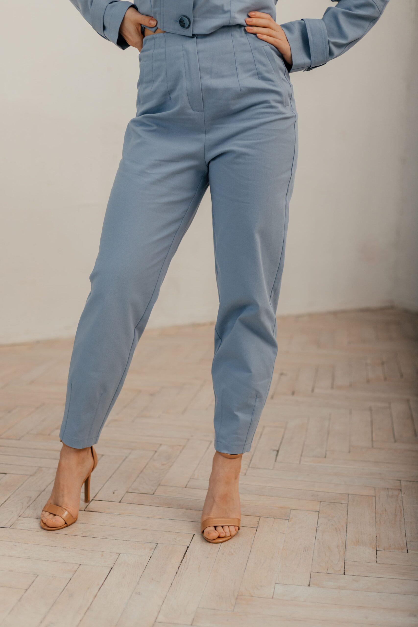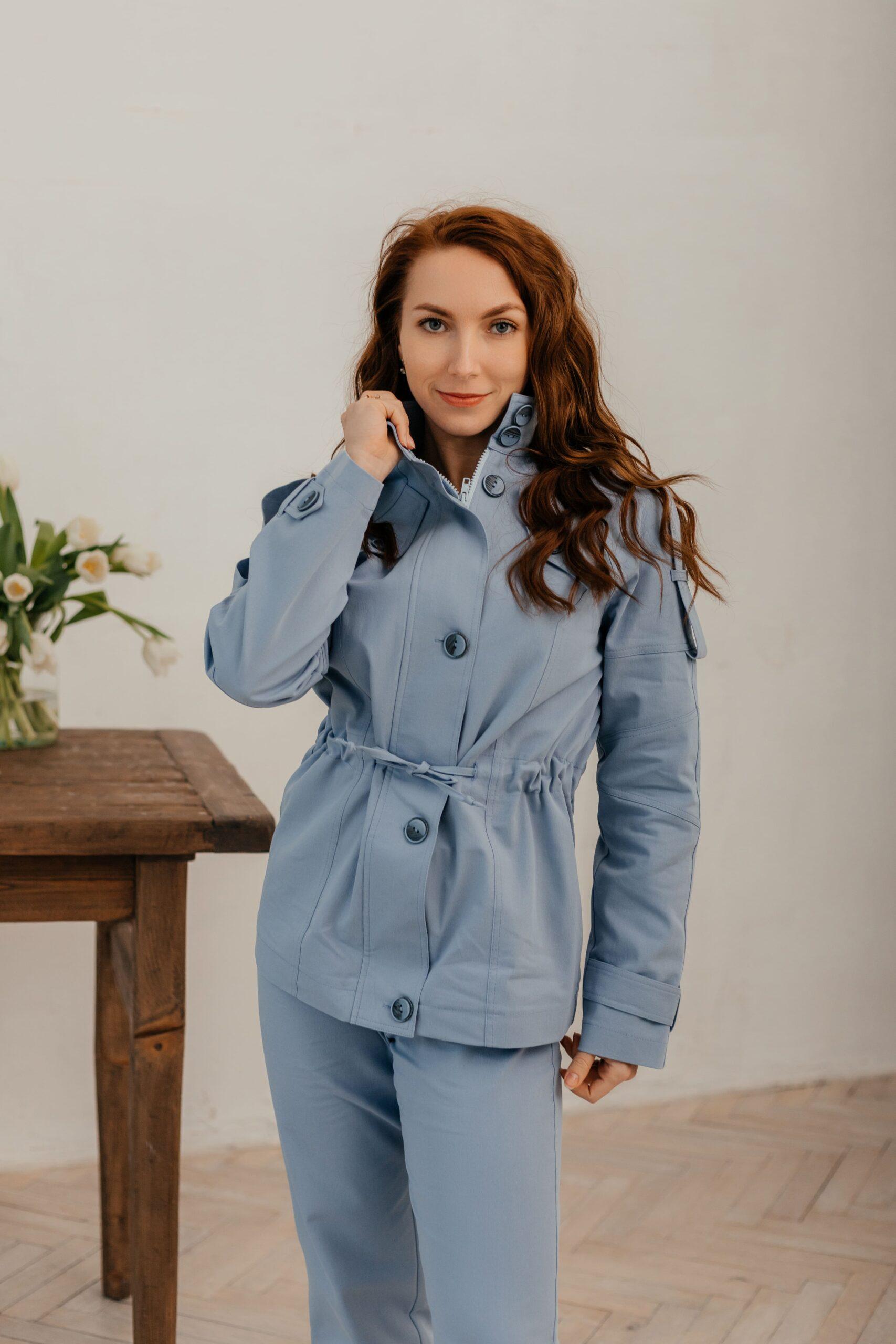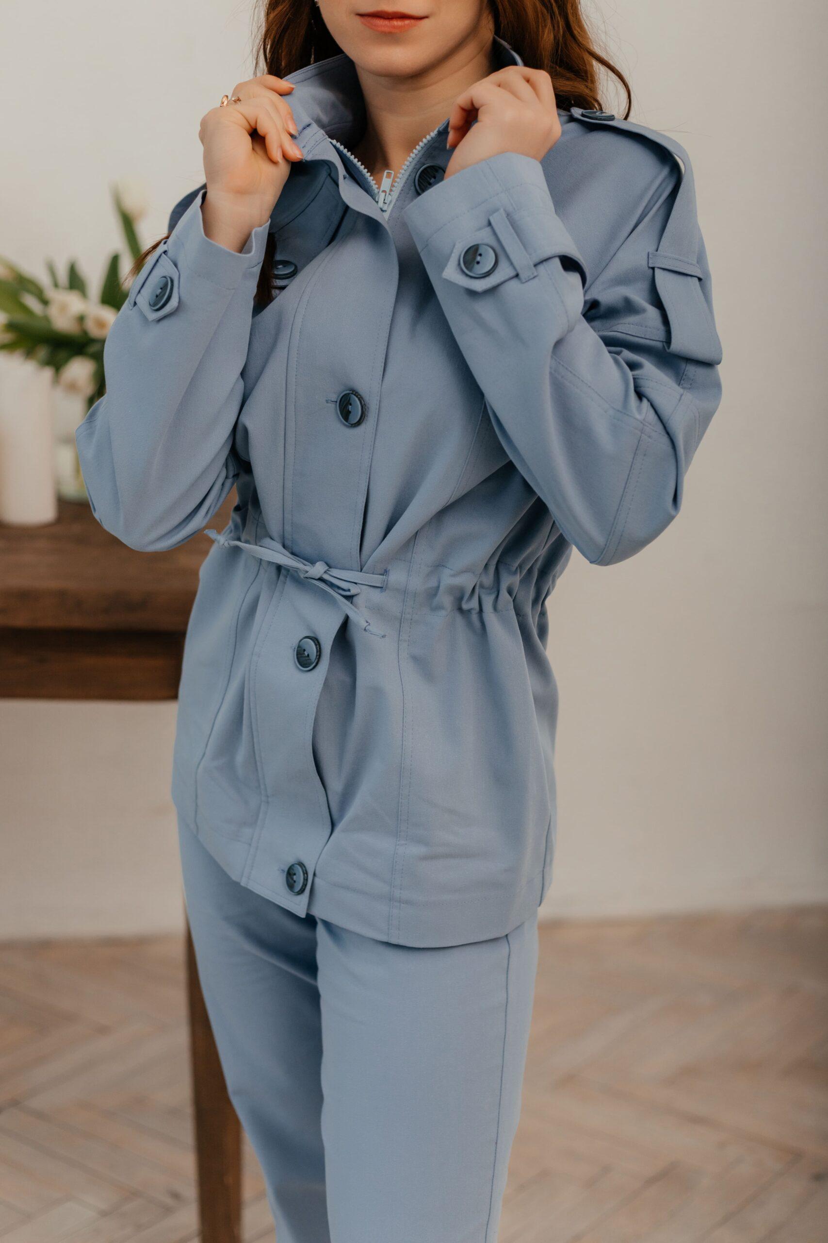 Костюм женский, брюки и удлиненная куртка. Брюки с высокой посадкой, заужены к низу. Куртка с длинным рукавом на манжете со шлевками и пуговицами, длина середина бедра. Модель украшена карманами, пуговицами, и шлевками на плечах. Горловина выполнена ввиде стойки, куртка приталивается завязками на талии.