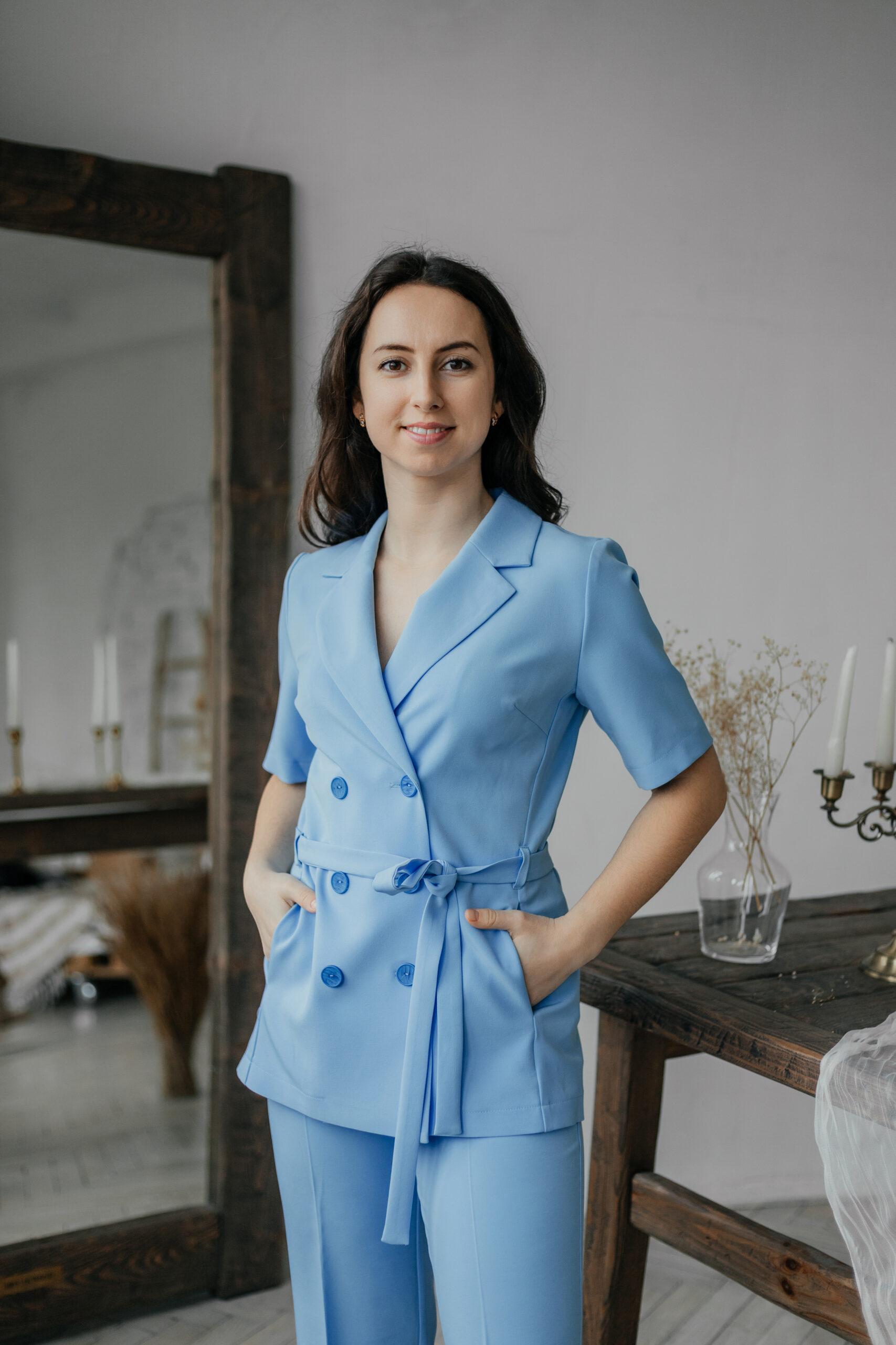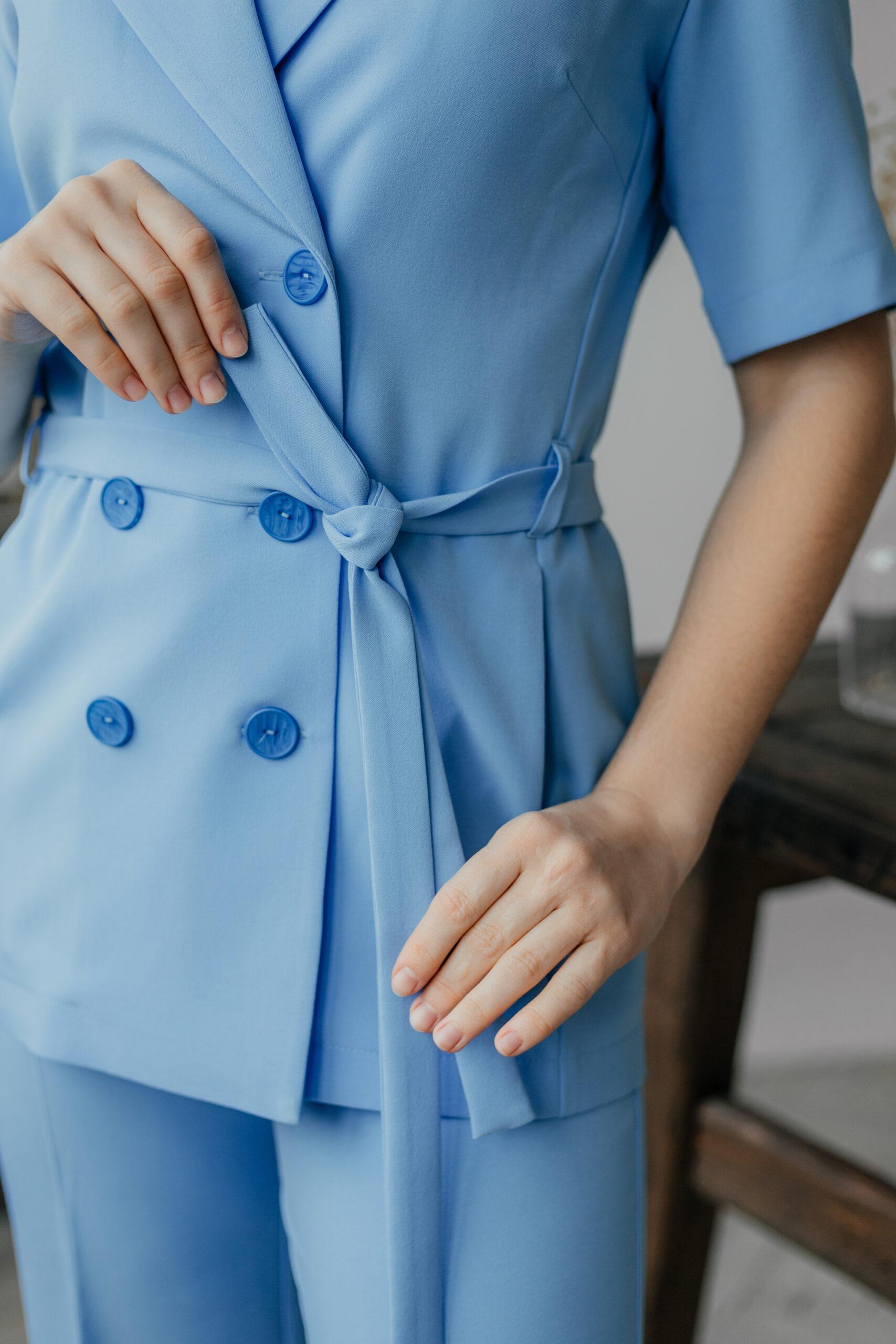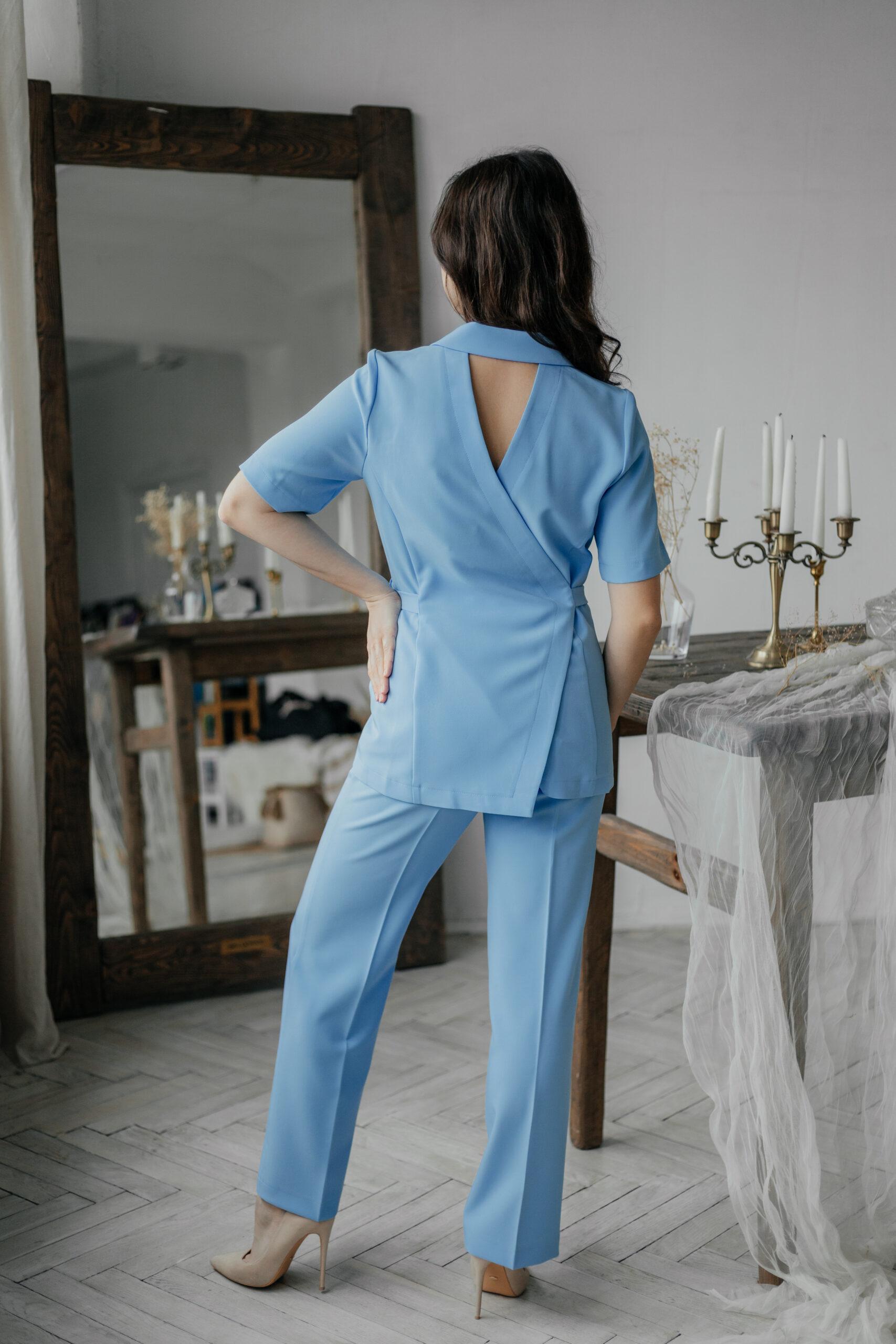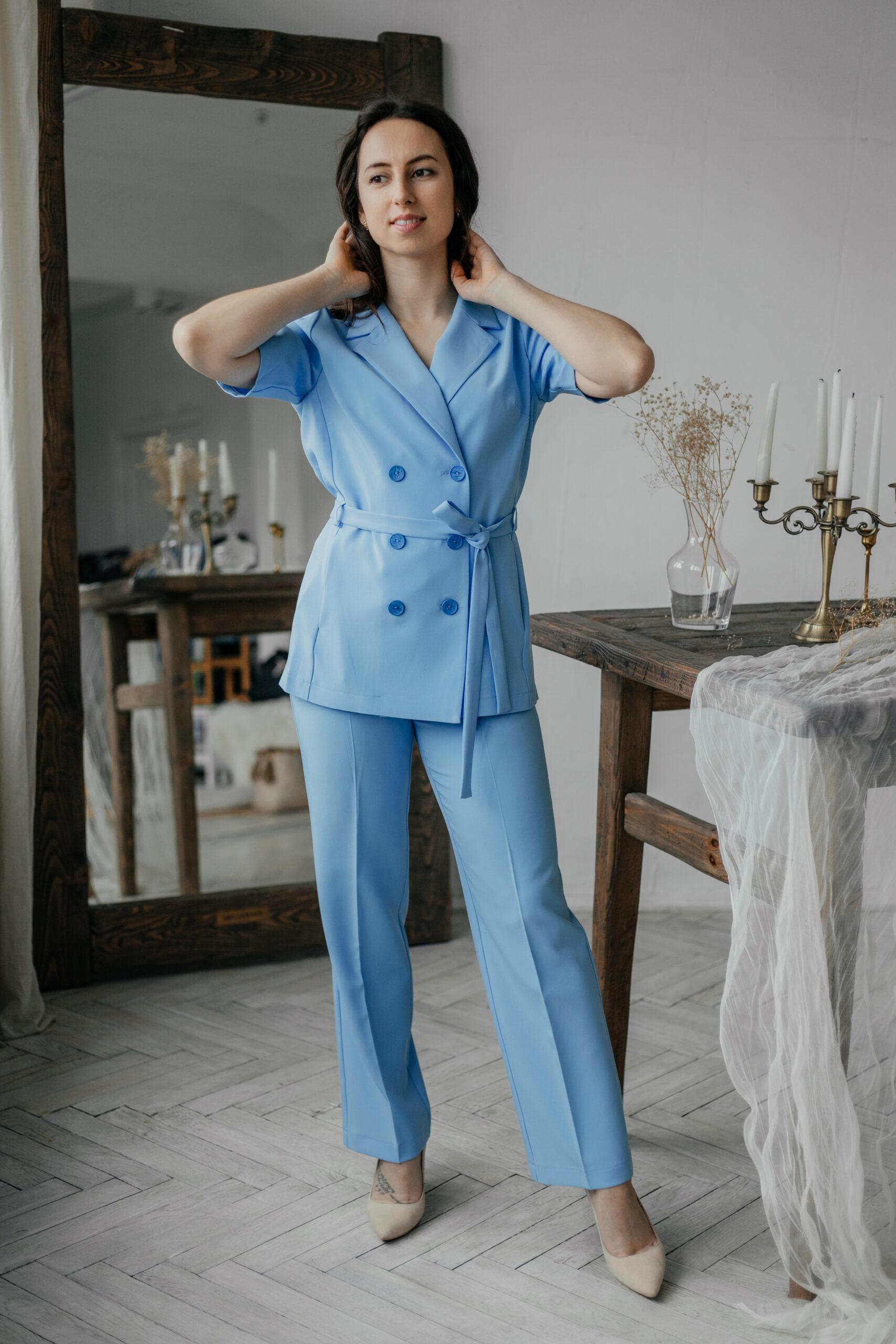 Костюм женский , брючный. Легкий жакет, с коротким рукавом, двубортный, с двумя боковыми карманами на тканевом поясе. Брюки прямого кроя, со стрелками и высокой линией талии.