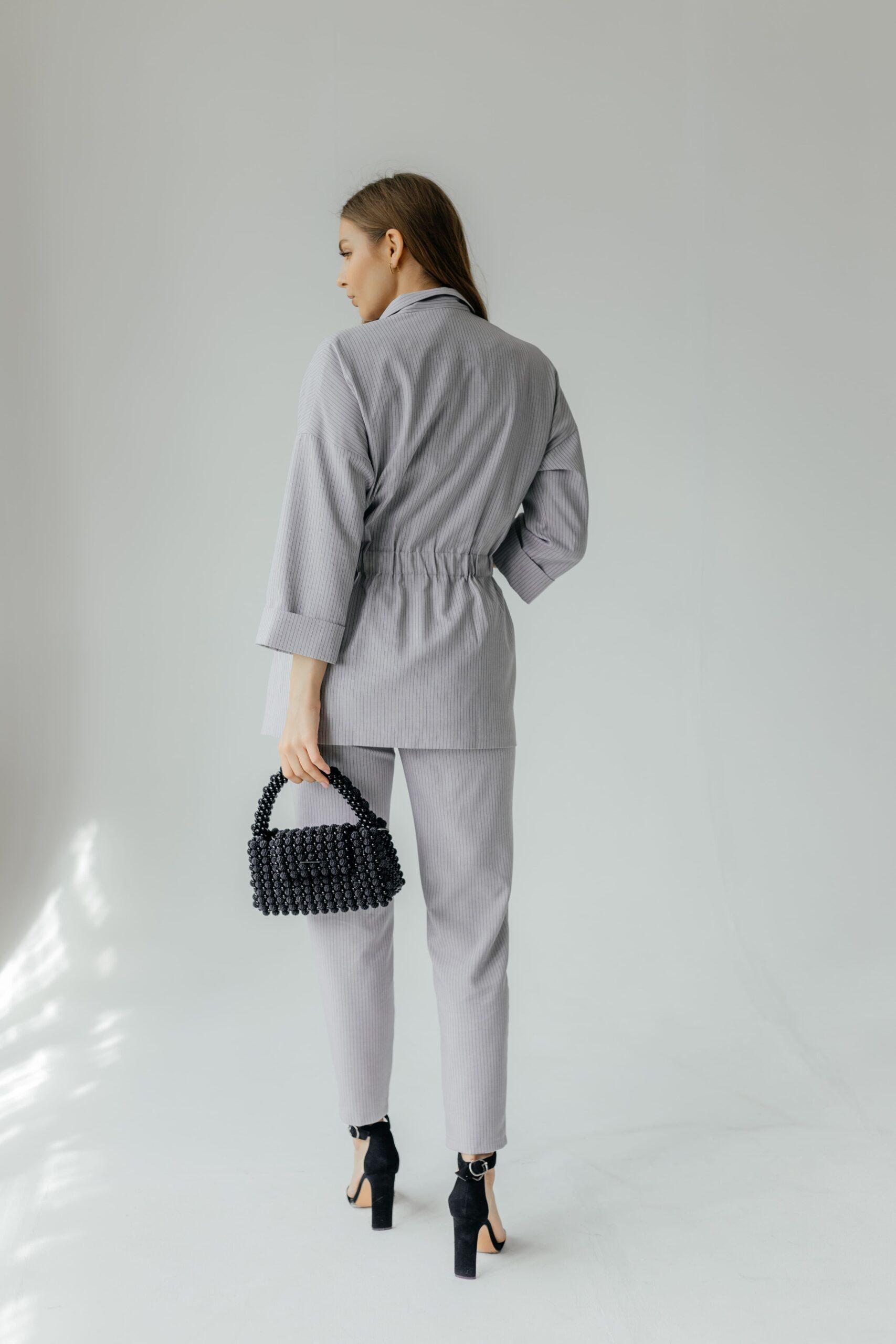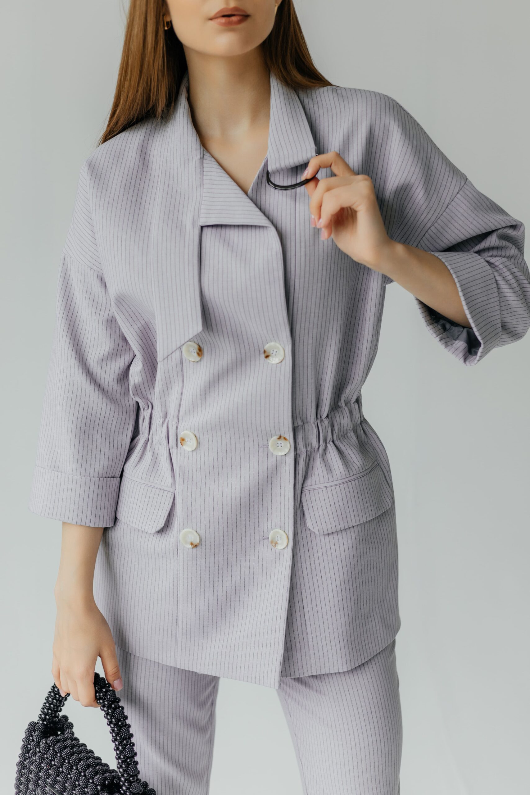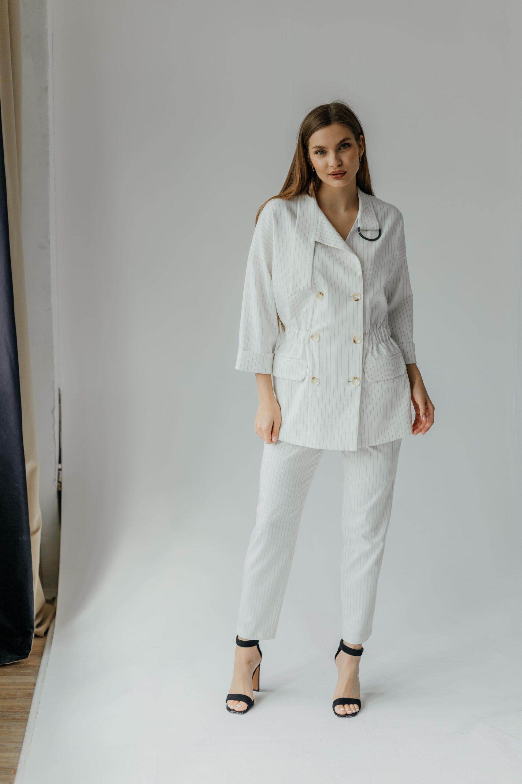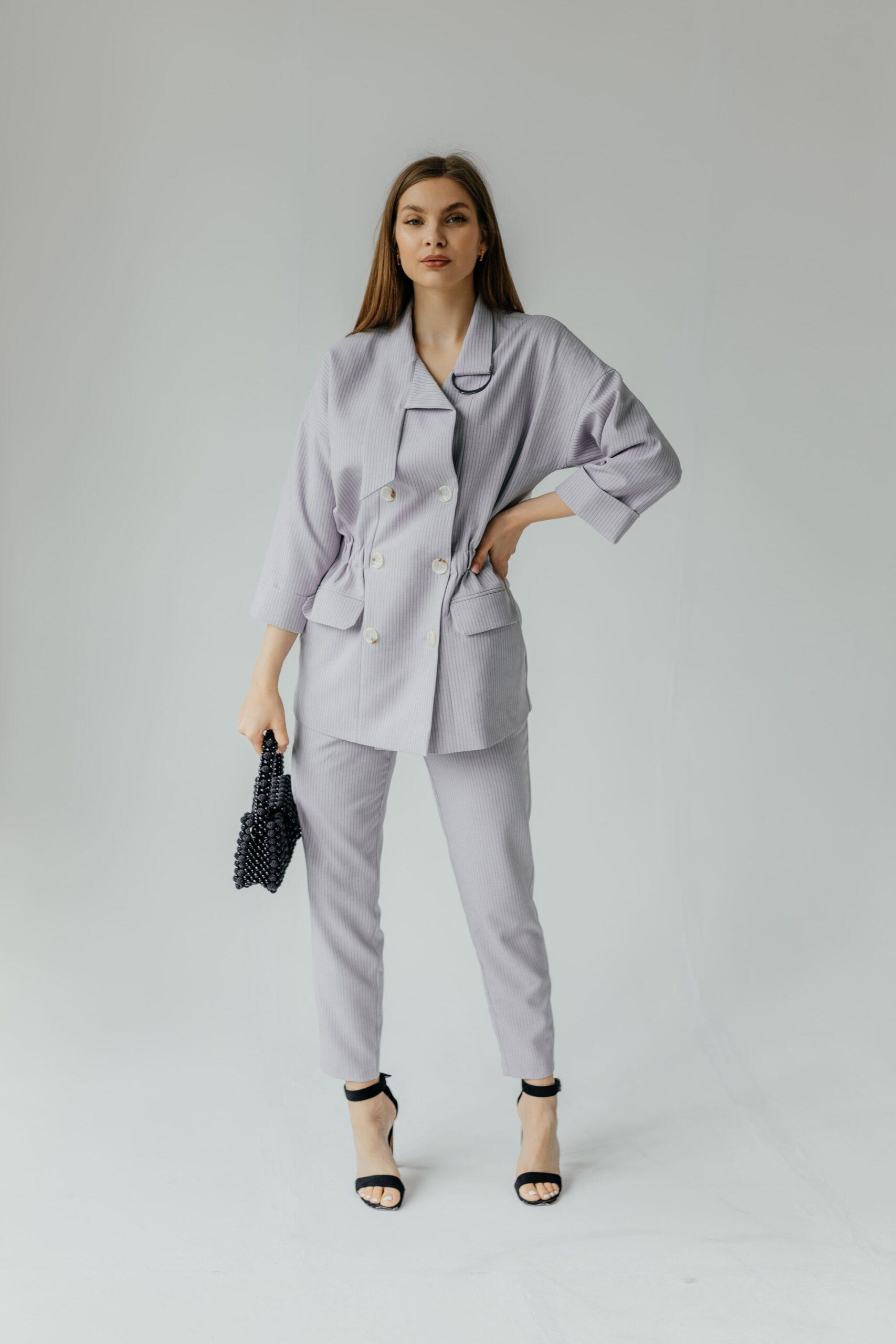 Жакет женский. Полочка рельефные швы, прорезные карманы в рамку и клапон. Спинка простая, кулиска. рукав 3/4. Воротник -стойка, на воротнике два полукольца. Застежка двухбортная на петли- пуговицы, на подкладке. Брюки классические, пояс на резинке, зауженные к низу. Карман в притачных бочках. Вход в карман обработан планкой. Брюки предназначены для повседневной носки.