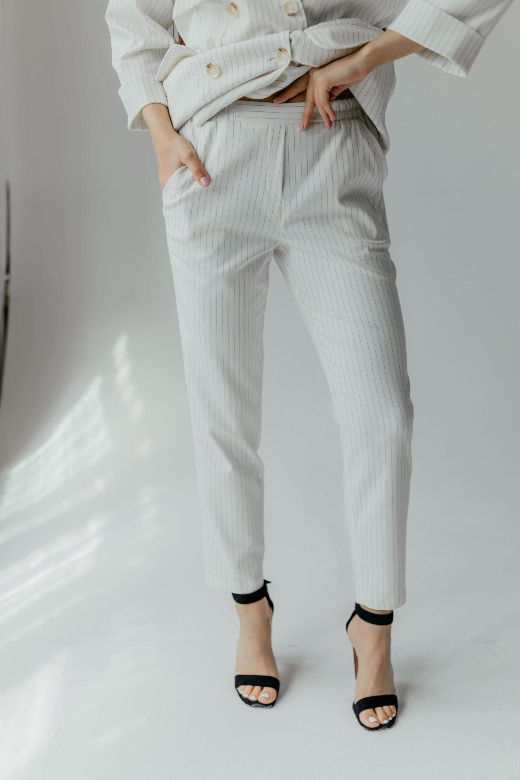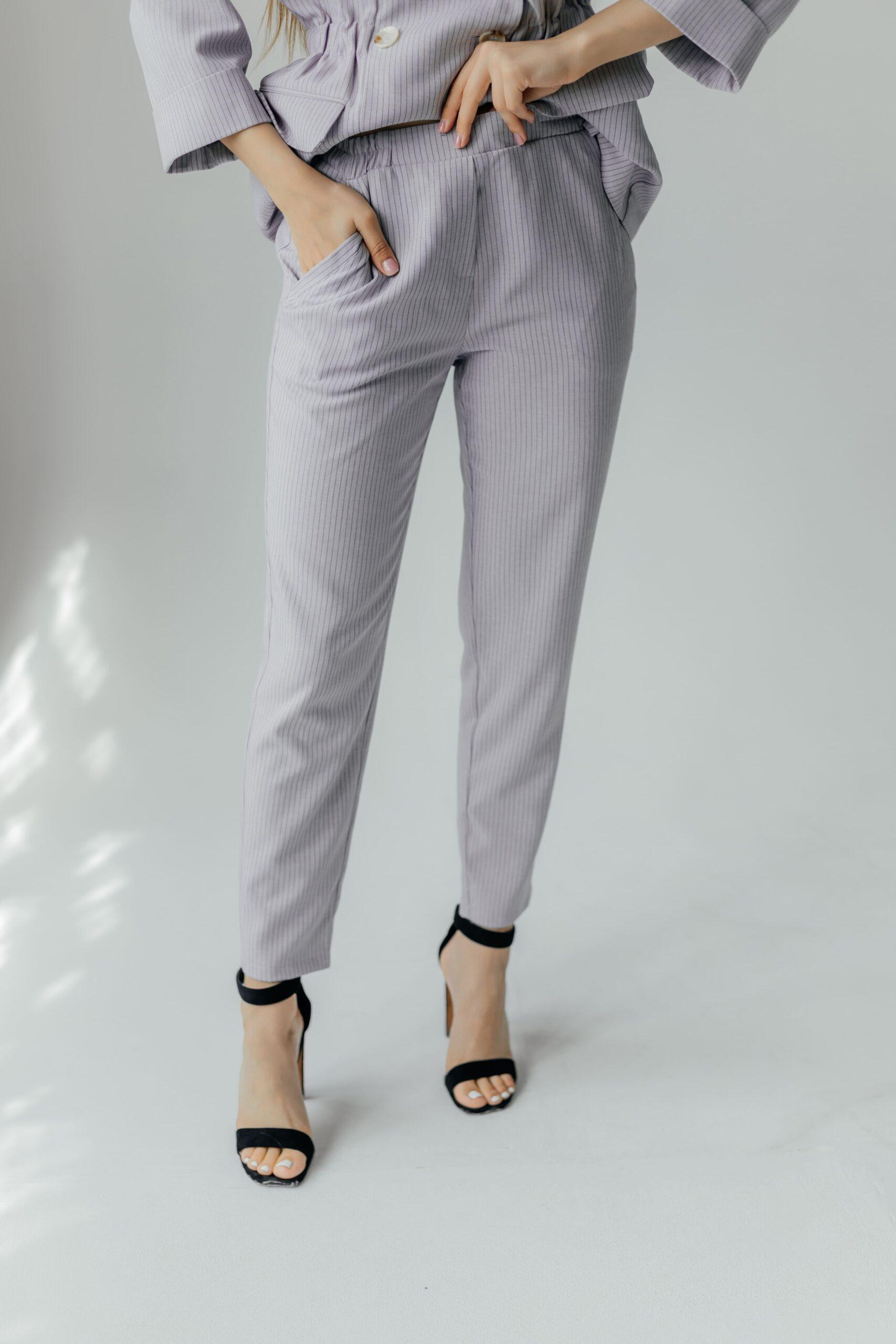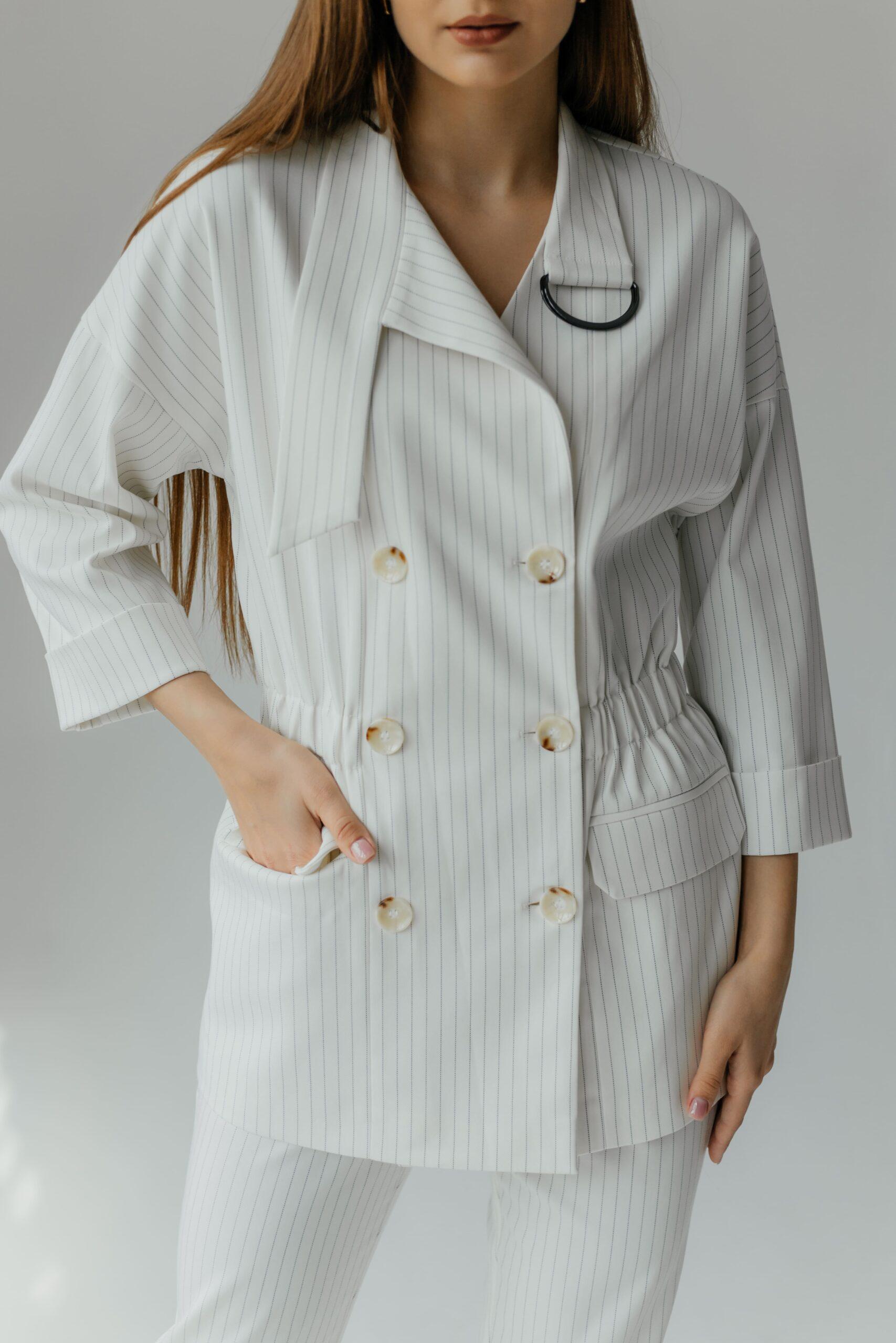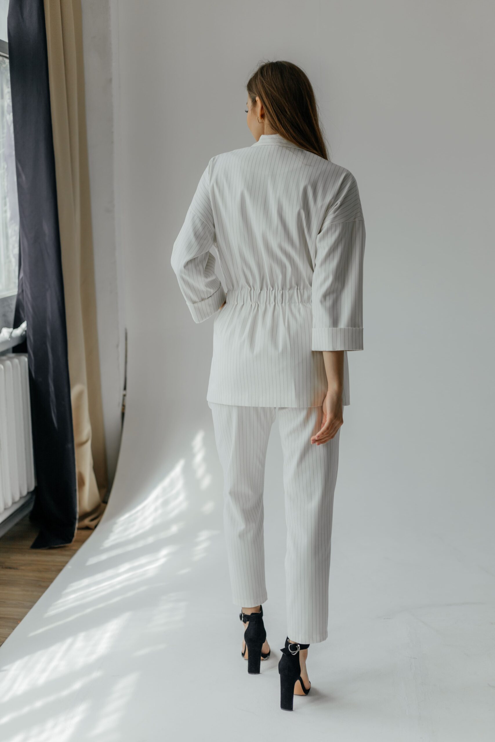 Жакет женский. Полочка рельефные швы, прорезные карманы в рамку и клапон. Спинка простая, кулиска. рукав 3/4. Воротник -стойка, на воротнике два полукольца. Застежка двухбортная на петли- пуговицы, на подкладке. Брюки классические, пояс на резинке, зауженные к низу. Карман в притачных бочках. Вход в карман обработан планкой. Брюки предназначены для повседневной носки.