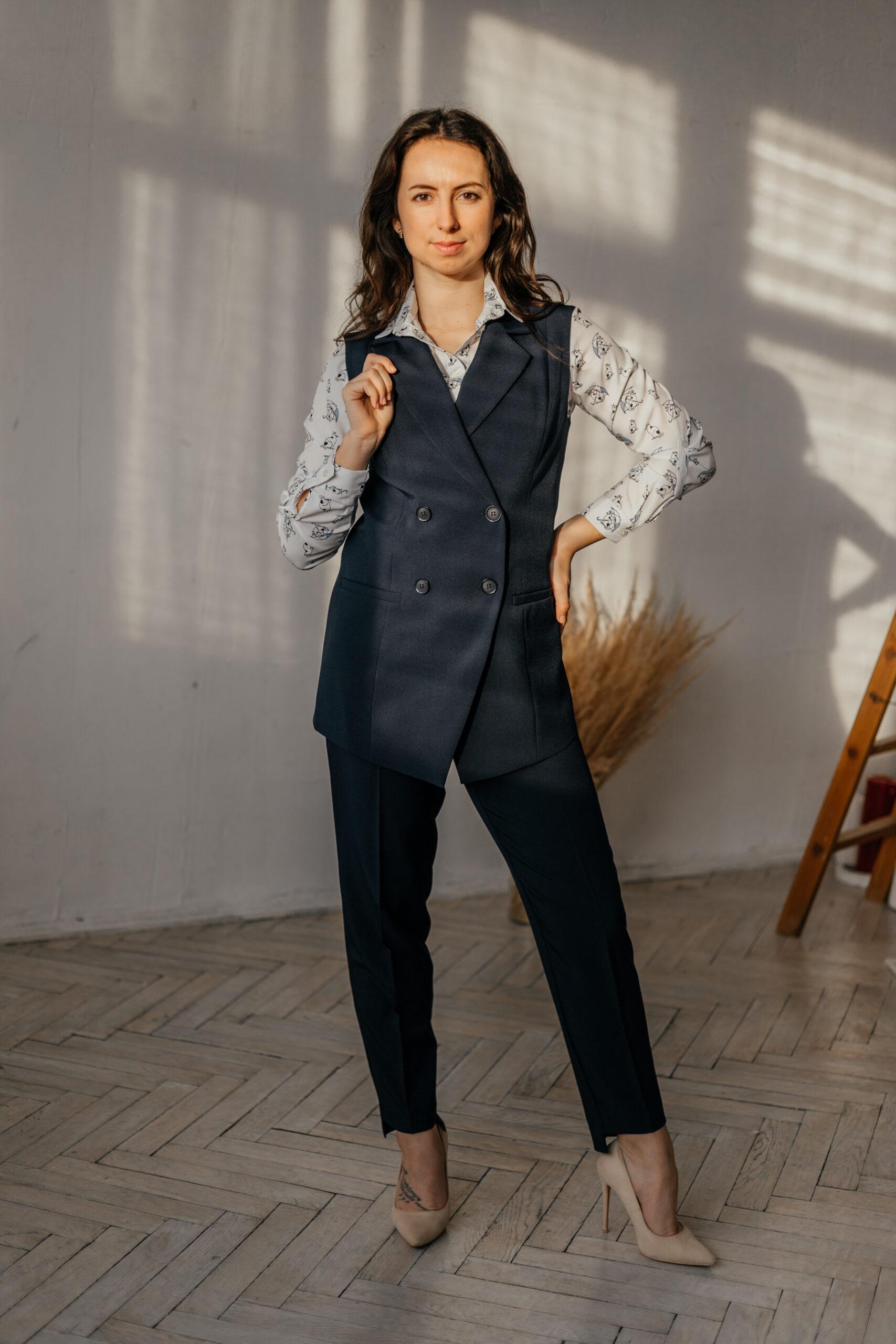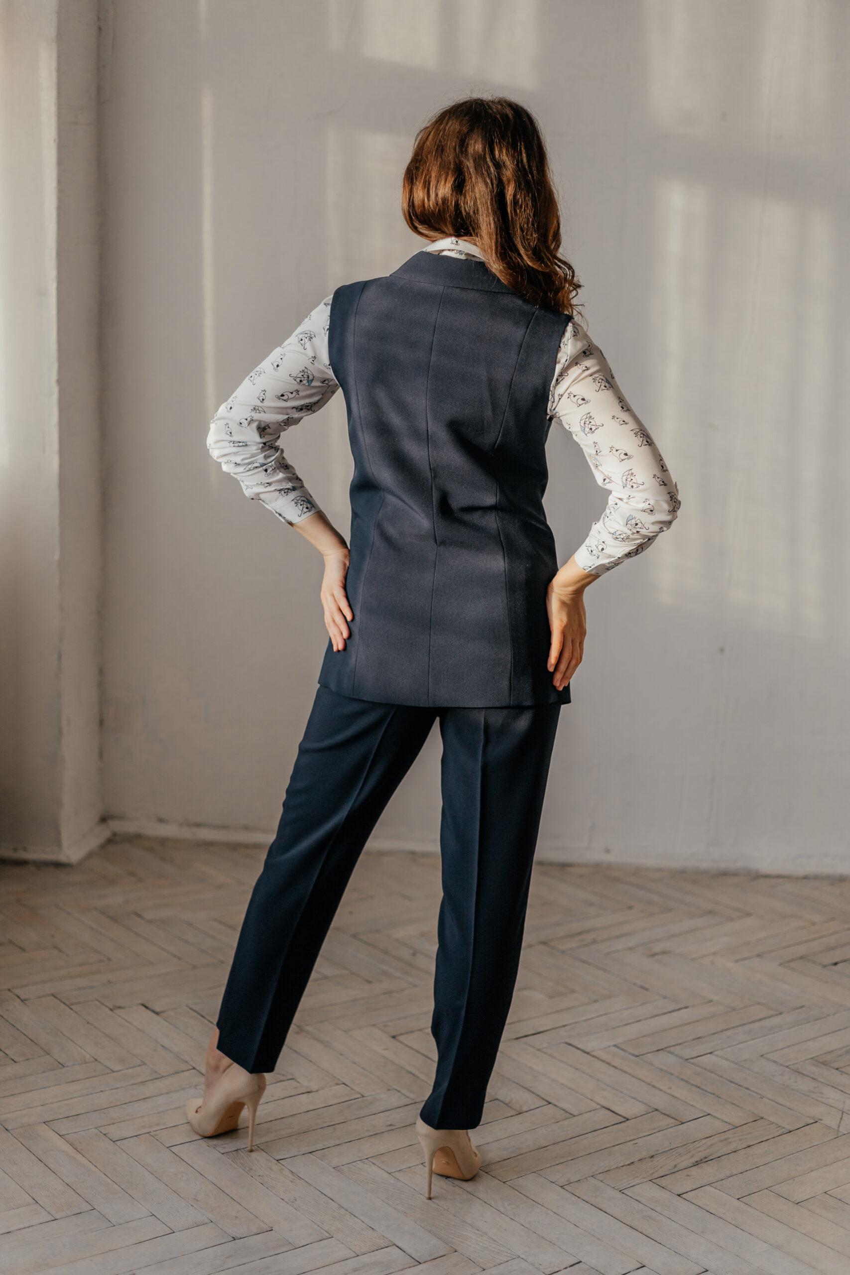 Костюм женский, брючный. Жилетка и брюки. Жилетка удлиненная, двубортная, на пуговицах, с двумя карманами. Брюки заужены к низу, модель каблучок, со стрелкой, высокая линия талии.