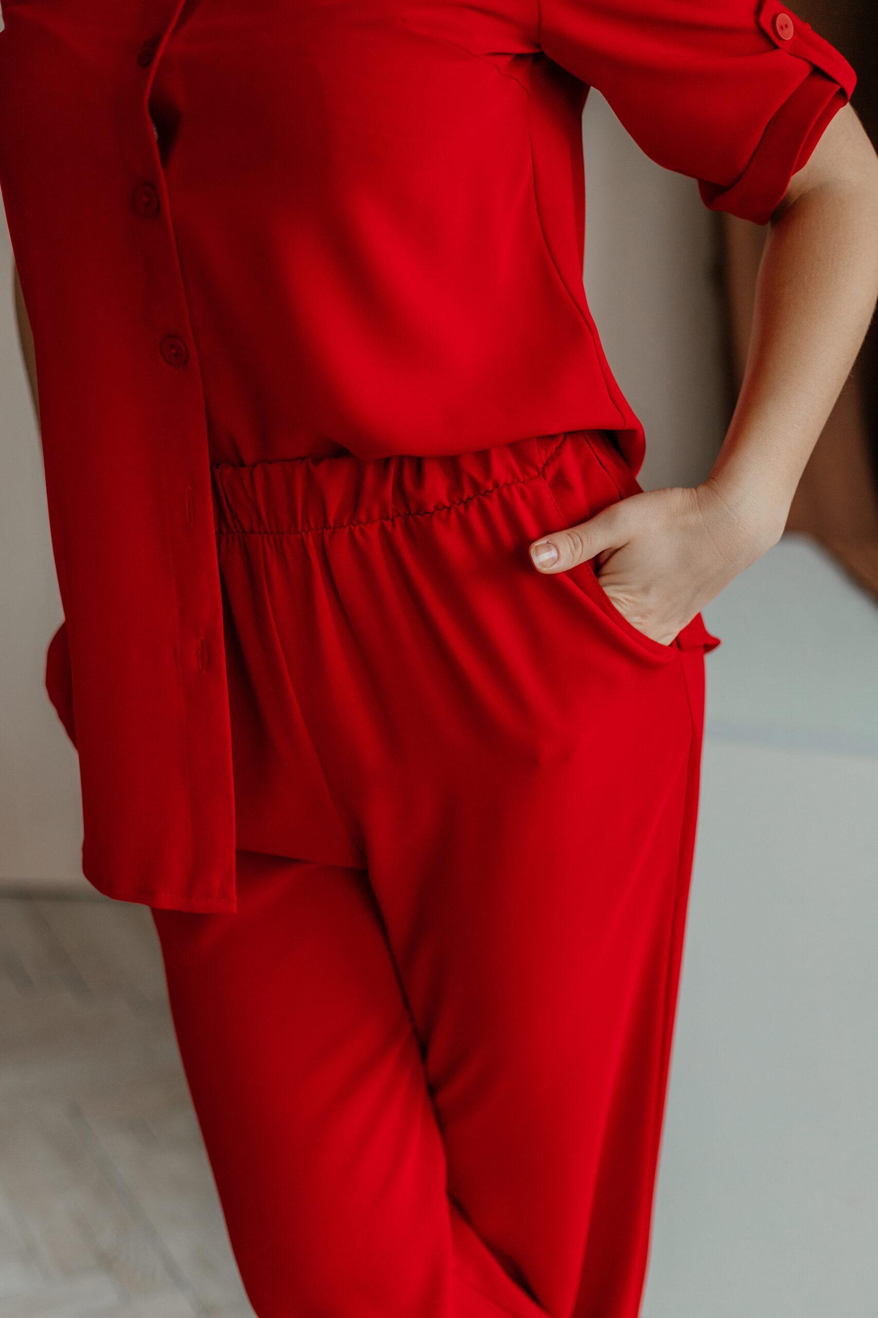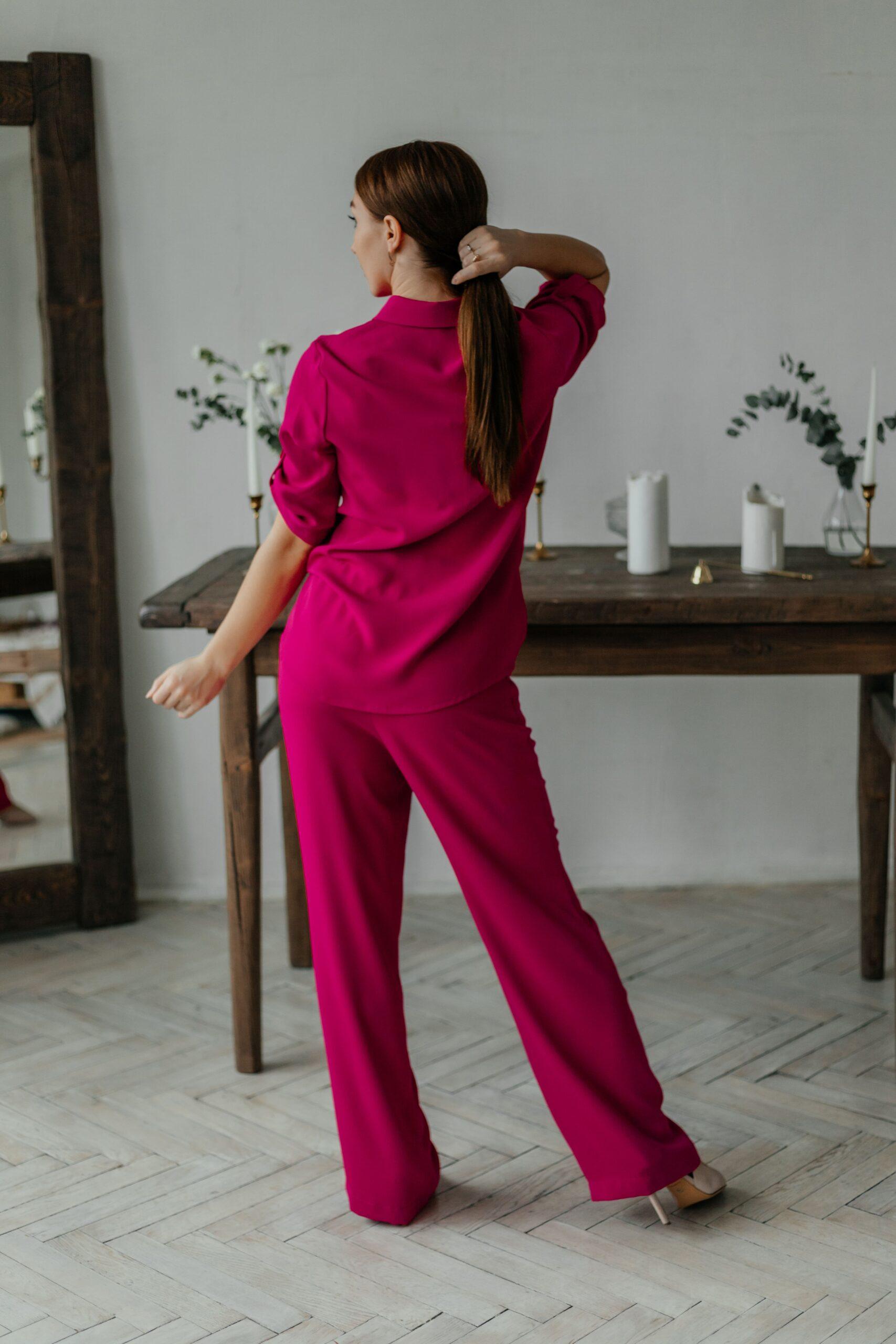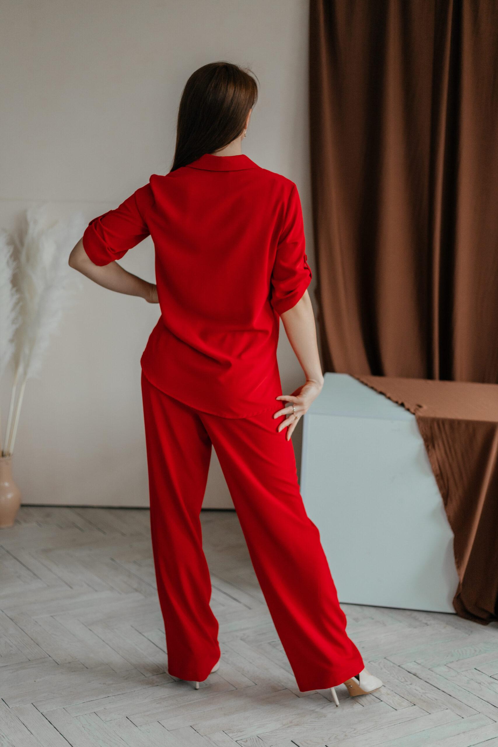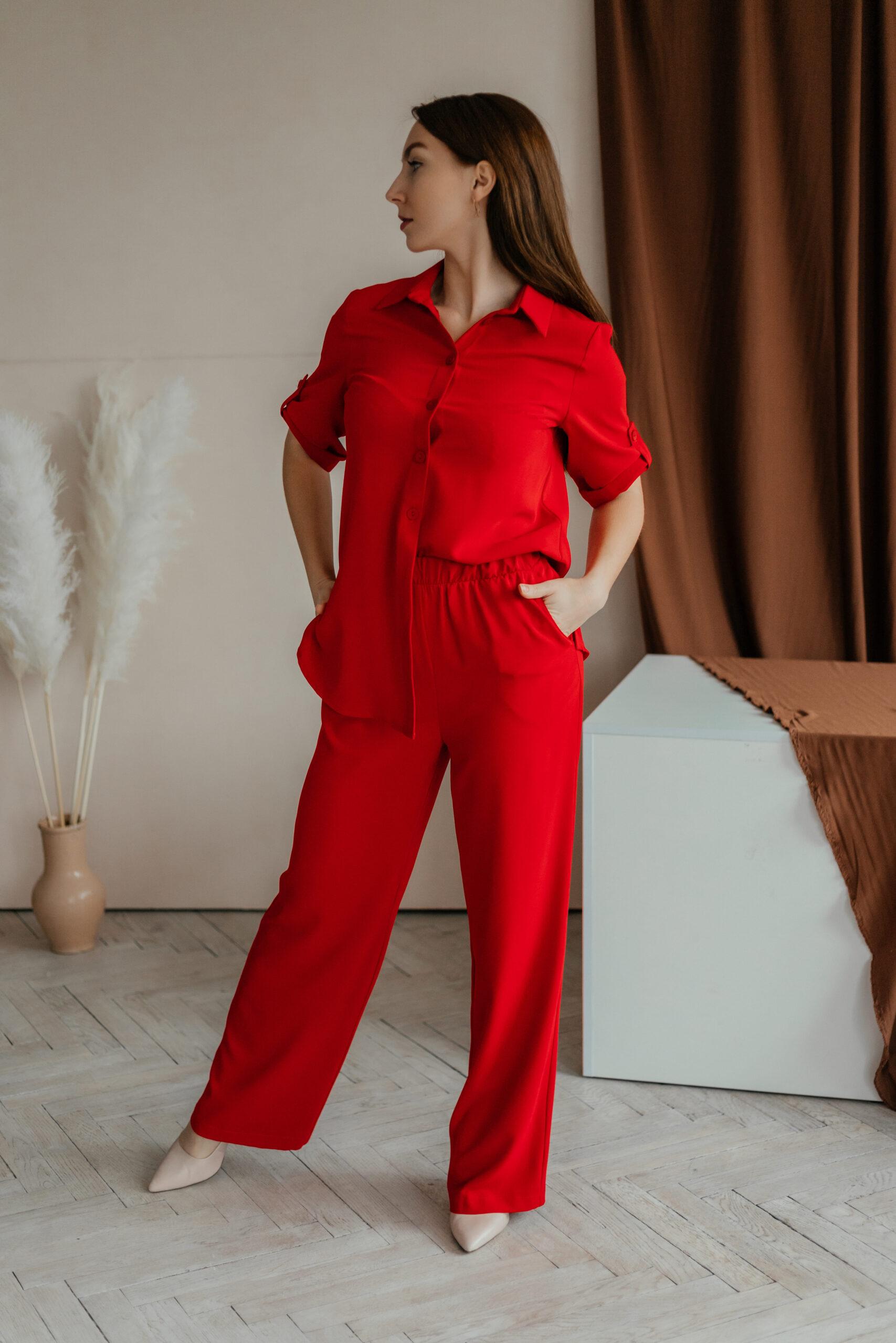 Костюм пижамного стиля, он лёгкий, удобный, стильный. Брюки с высокой талией, на резинке, с двумя боковыми карманами. Рубашка свободная, с коротким рукавом на пате.