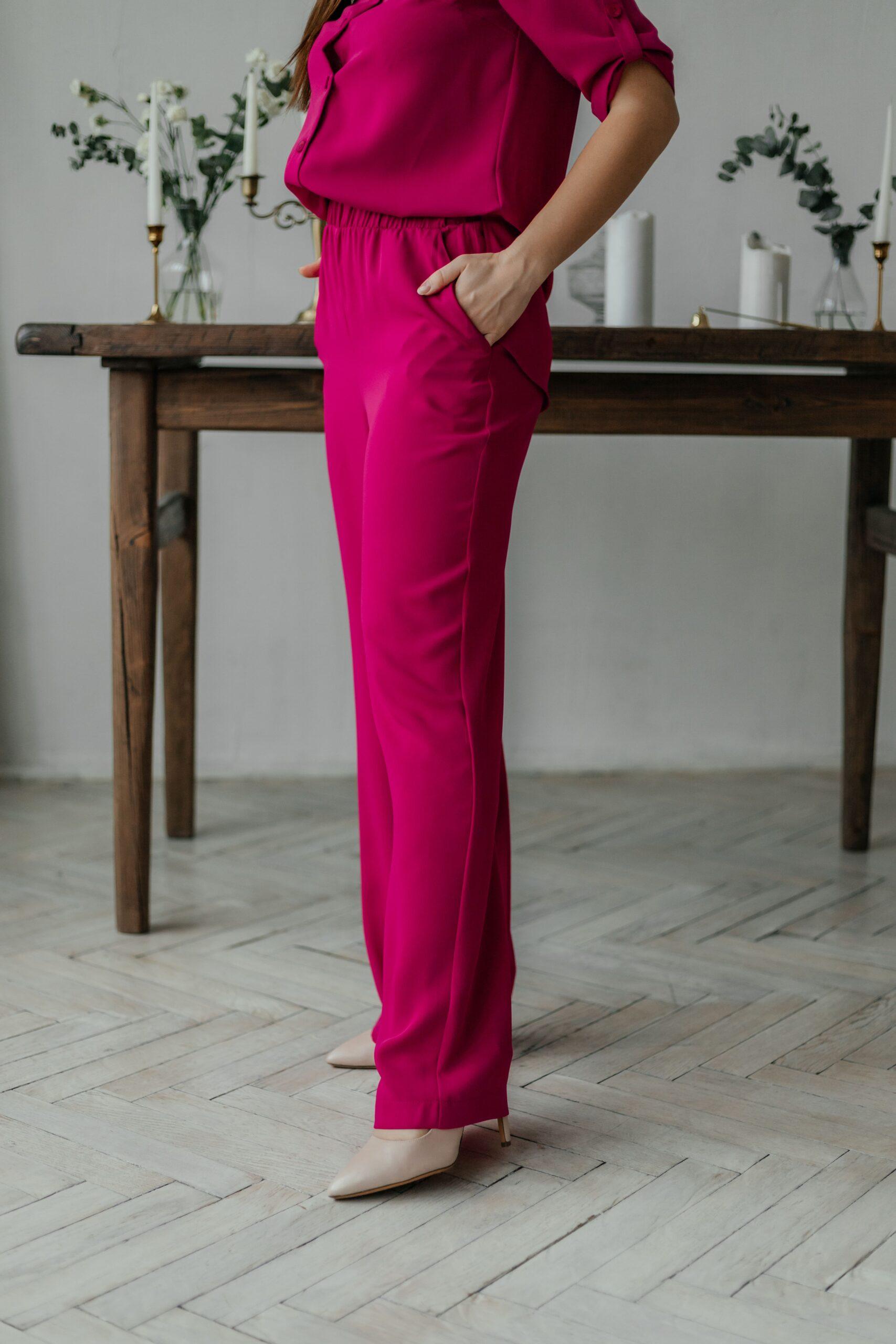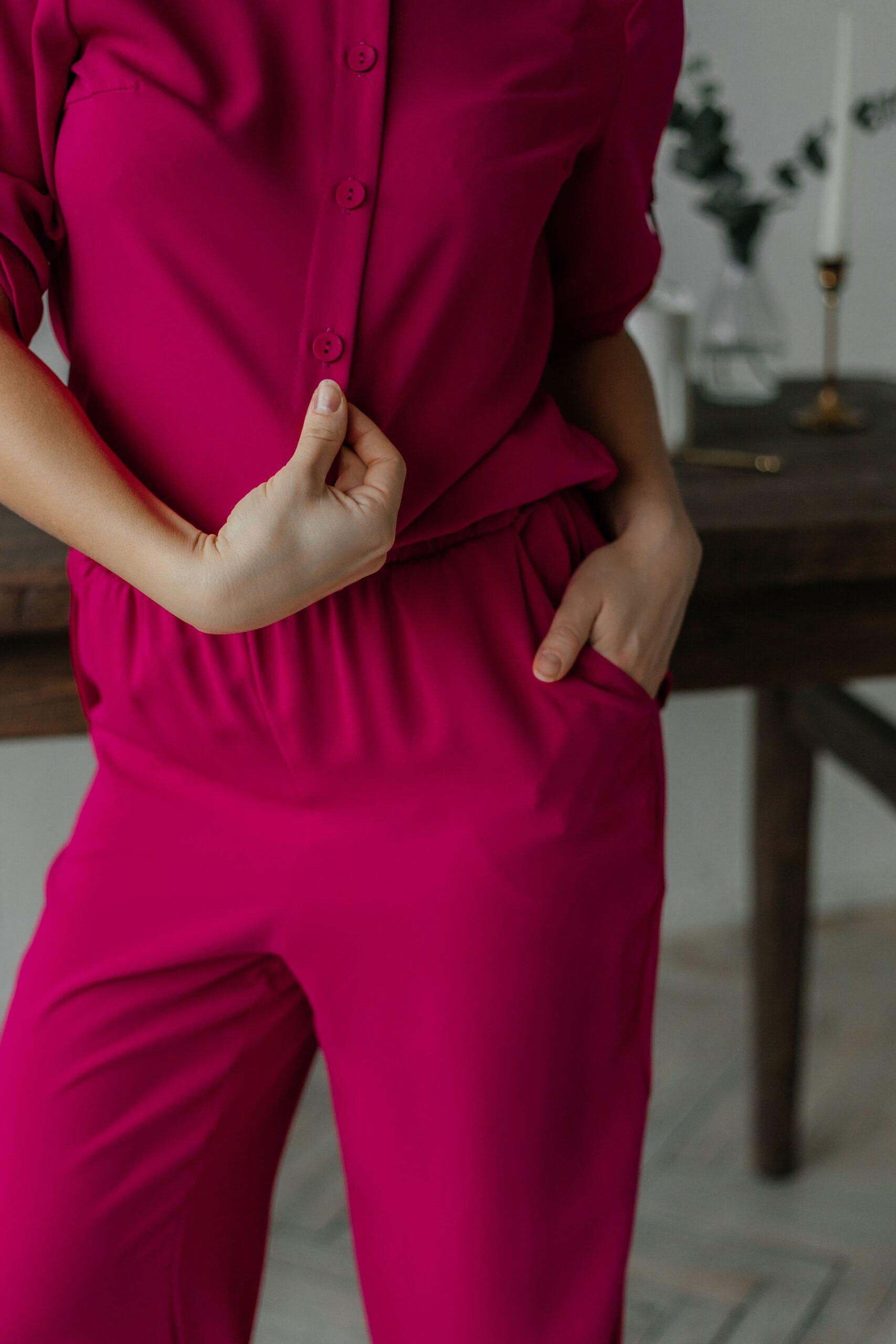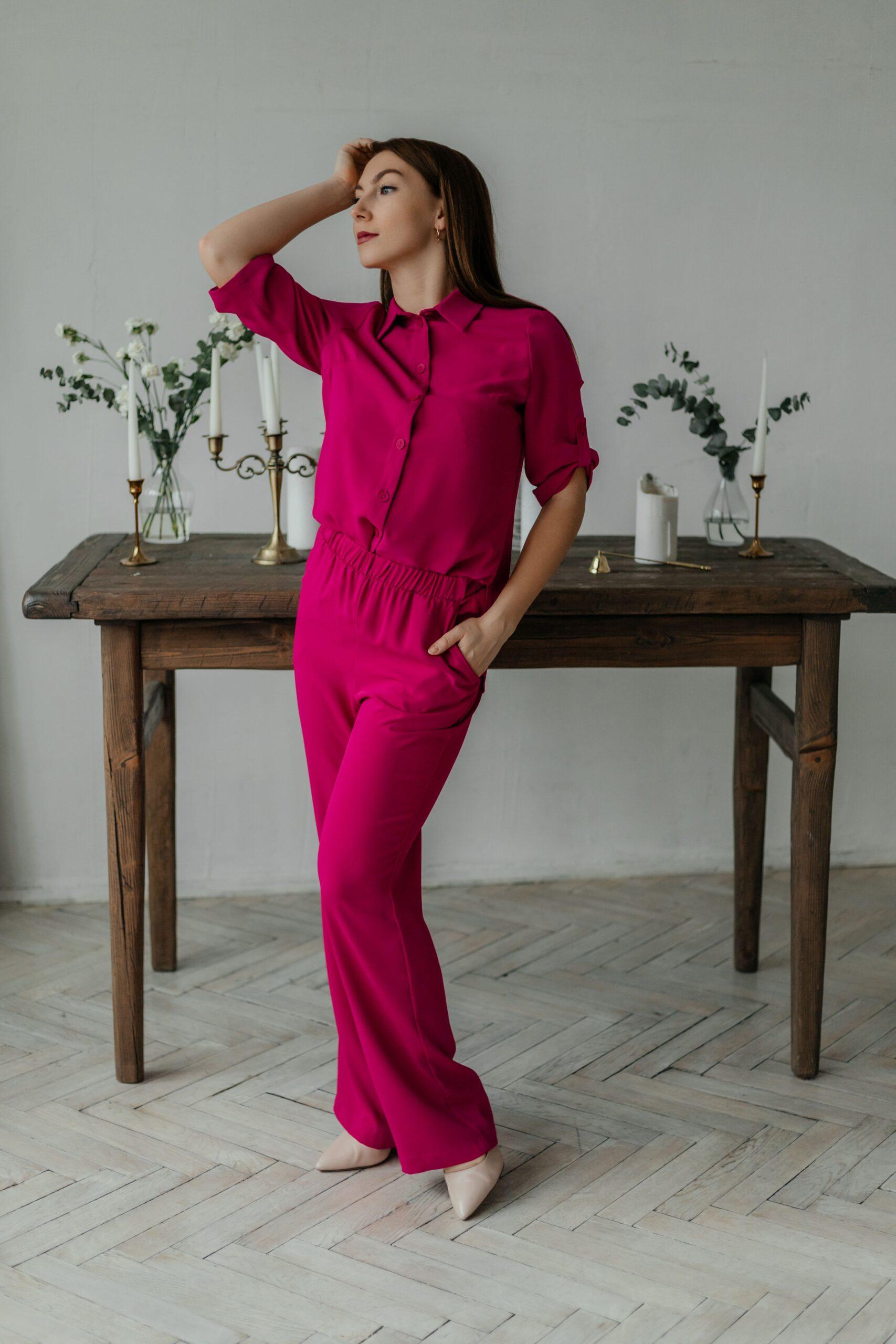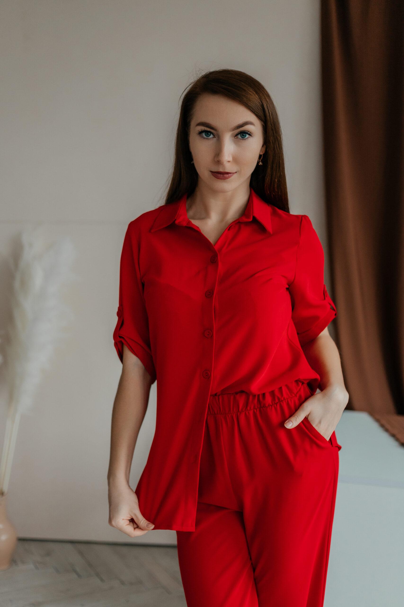 Костюм пижамного стиля, он лёгкий, удобный, стильный. Брюки с высокой талией, на резинке, с двумя боковыми карманами. Рубашка свободная, с коротким рукавом на пате.