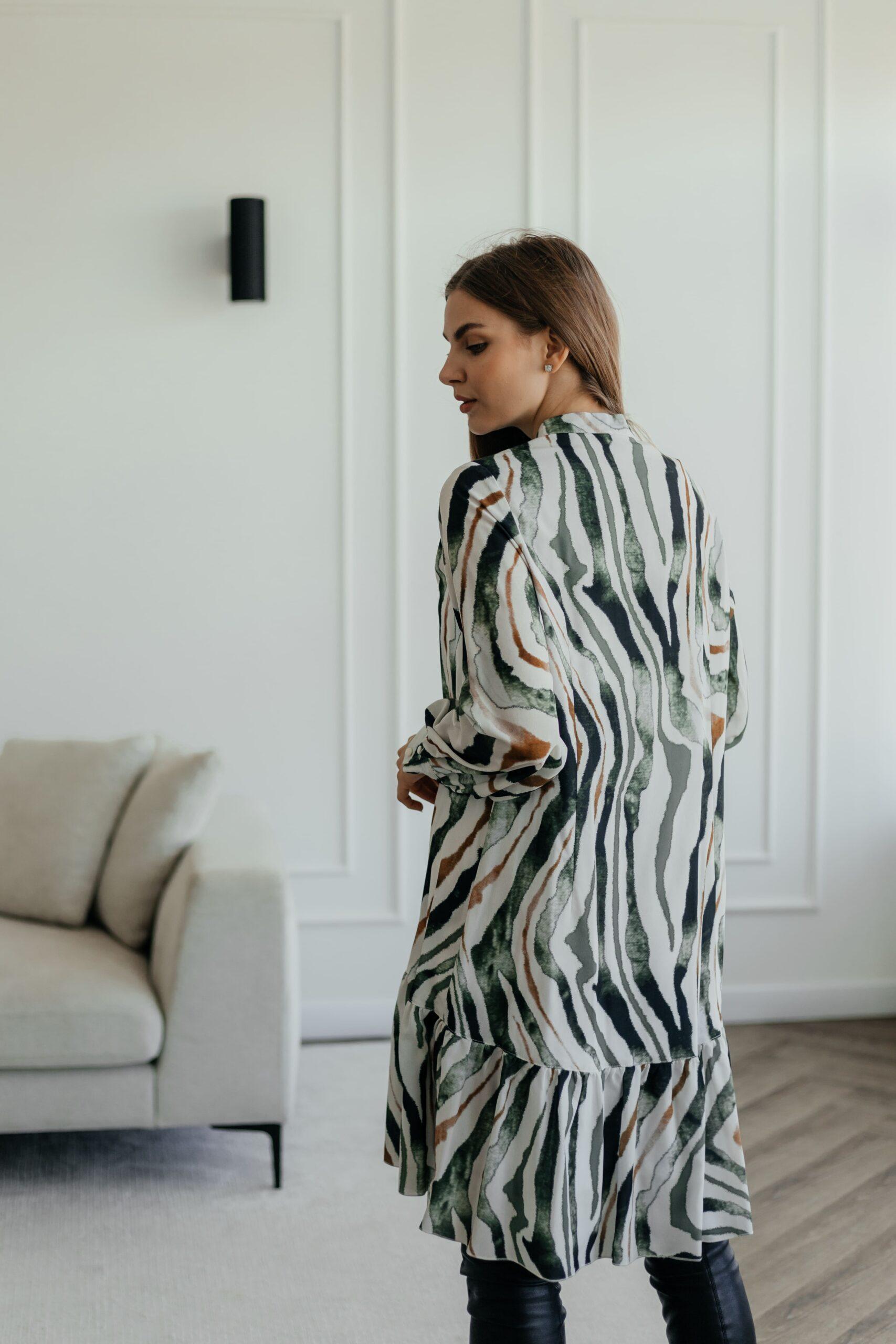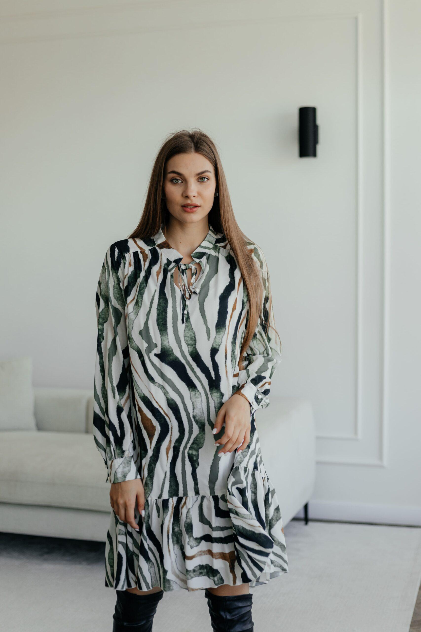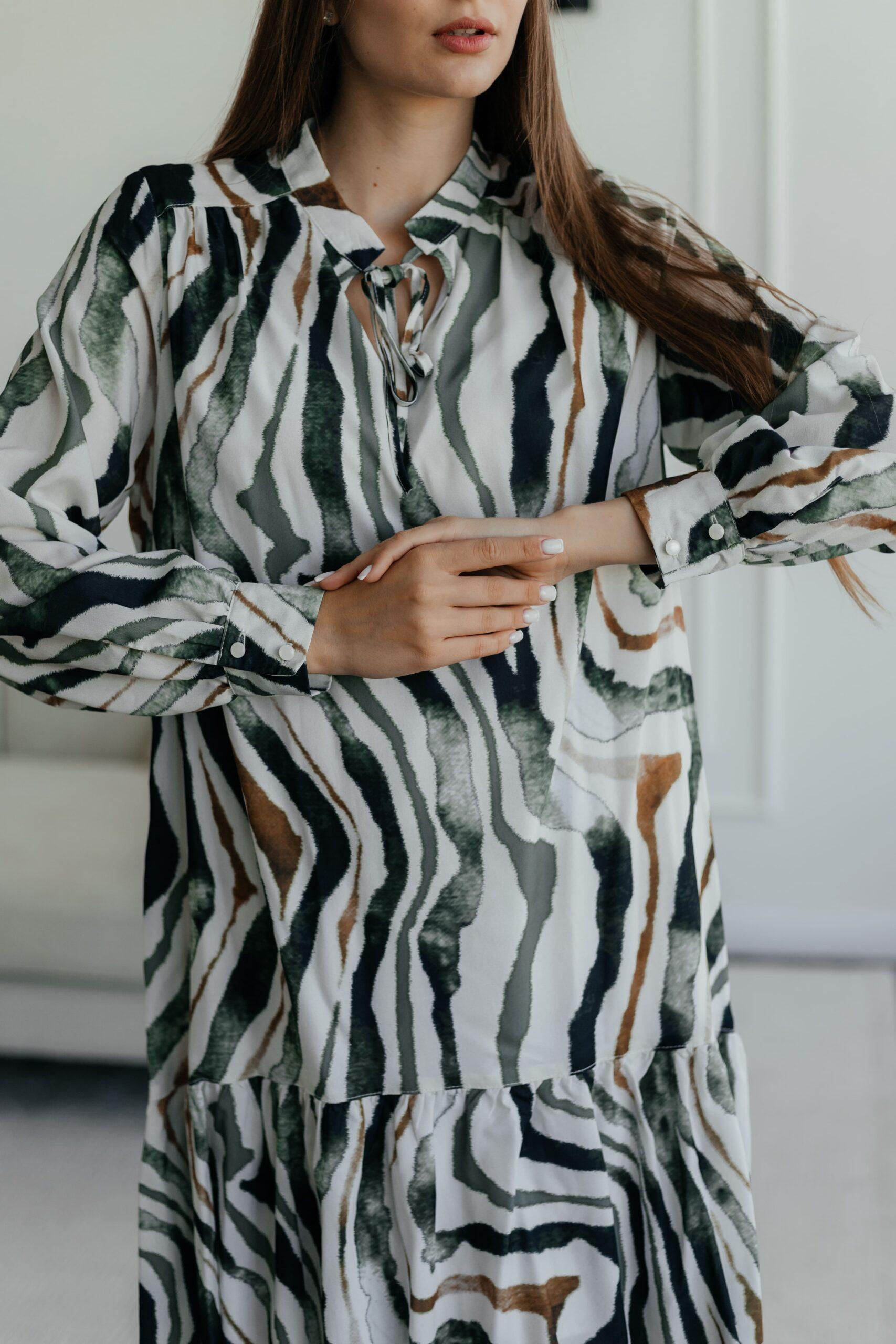 Платье женское, свободного кроя, с длинным рукавом на манжетах. Снизу платья волан с рюшей, вырез выполнен ввиде стойки.