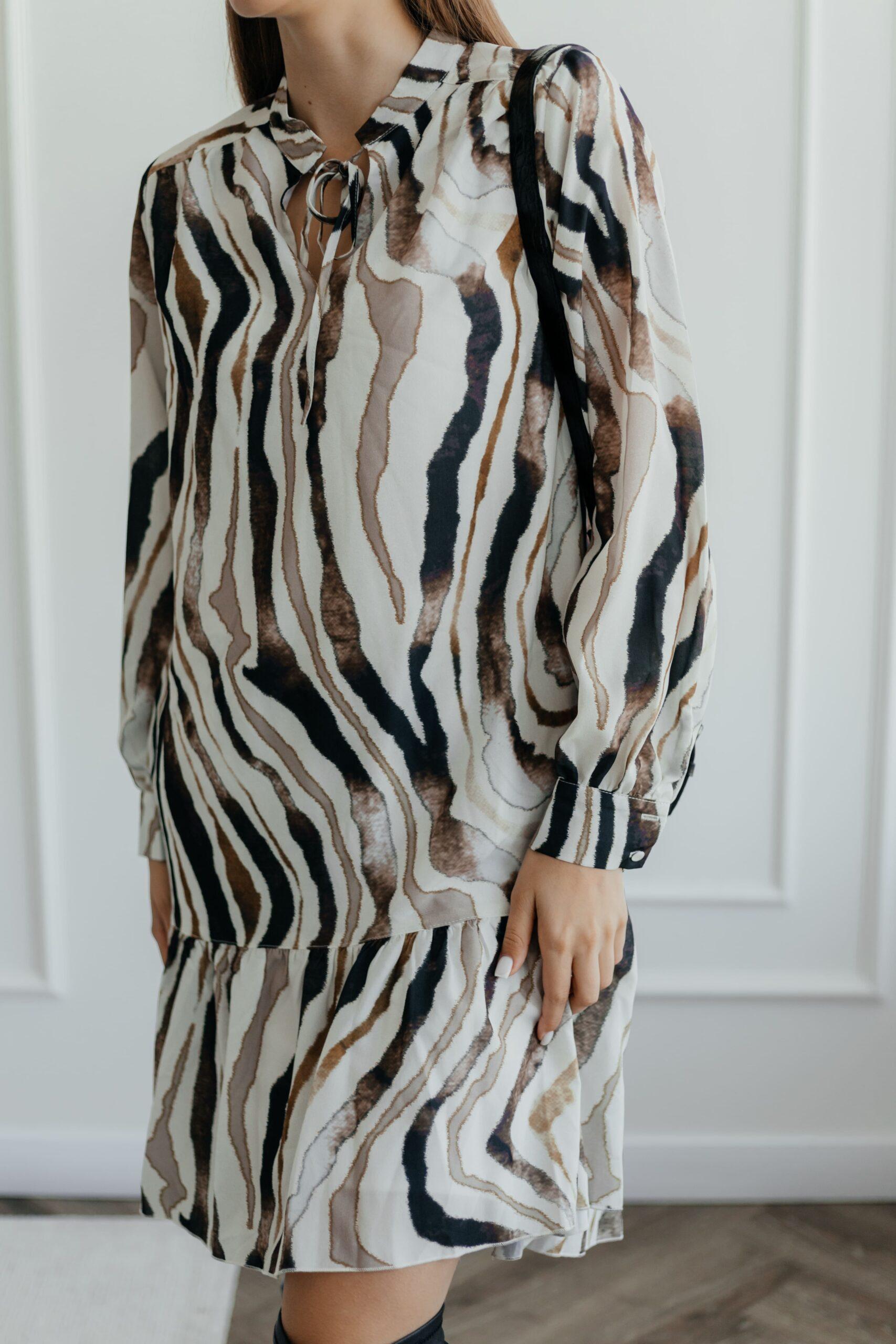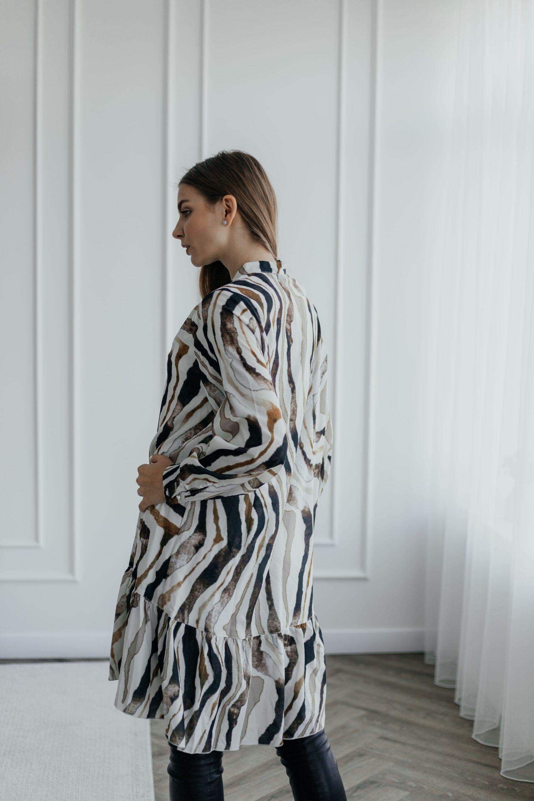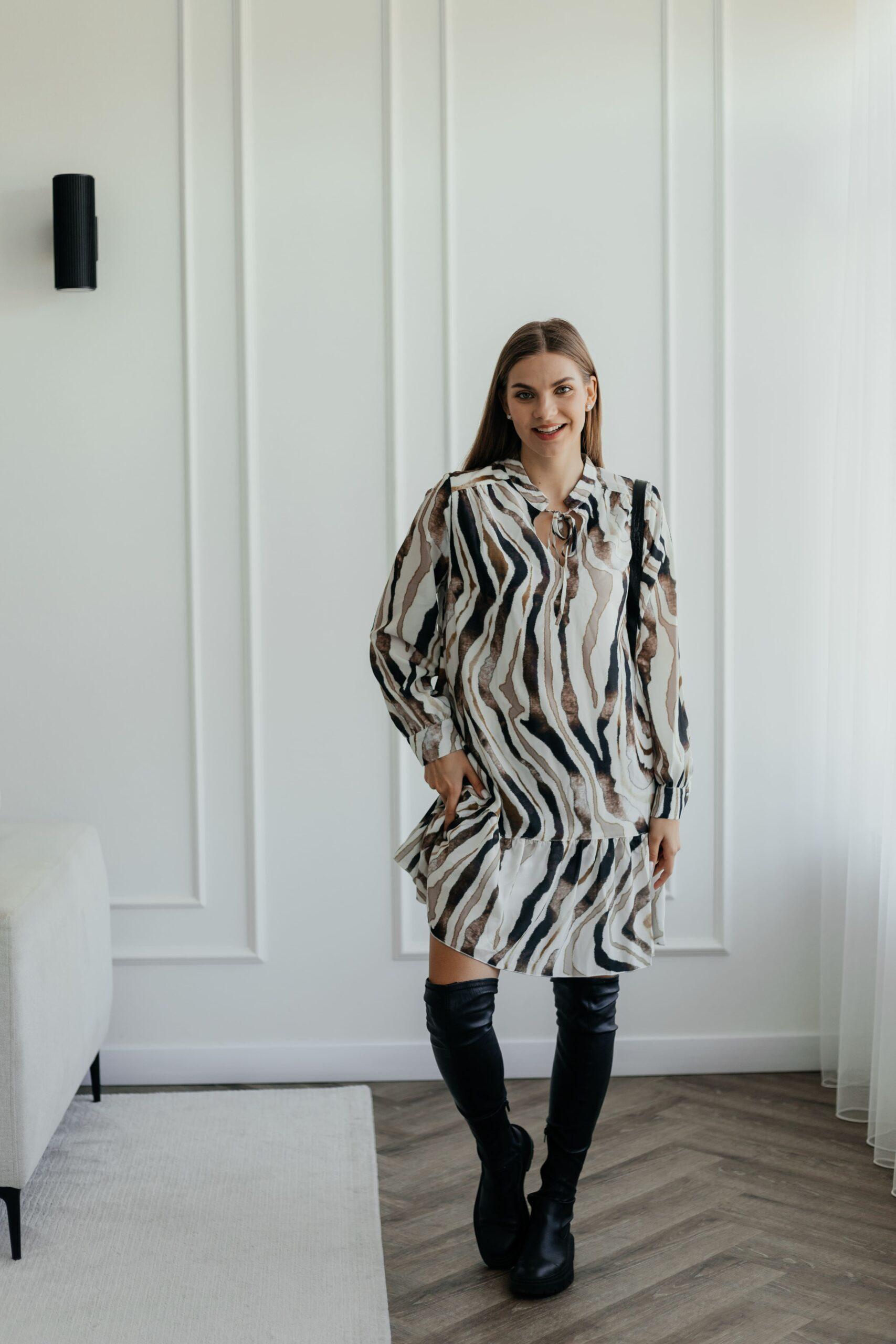Платье женское, свободного кроя, с длинным рукавом на манжетах. Снизу платья волан с рюшей, вырез выполнен ввиде стойки.