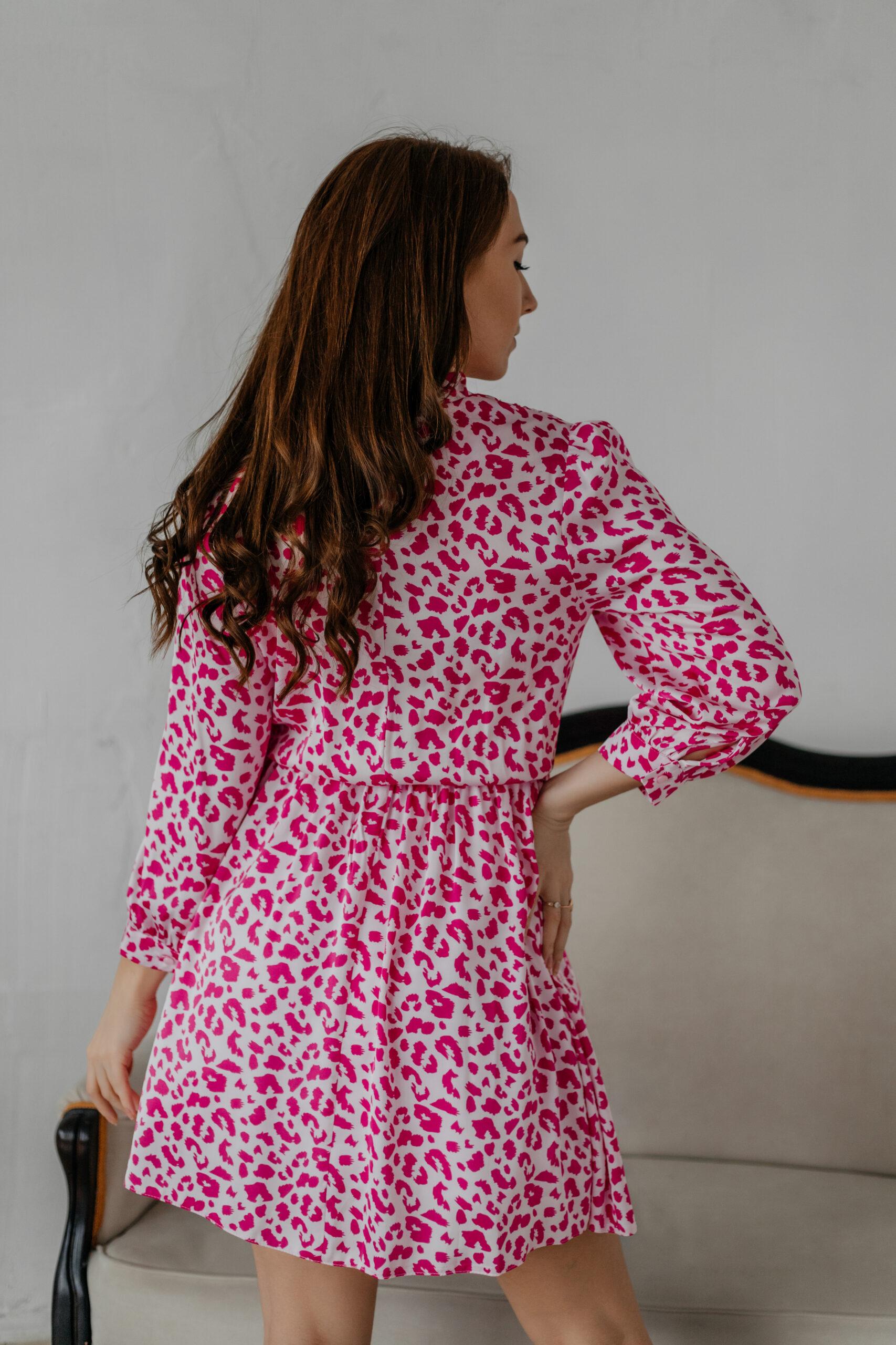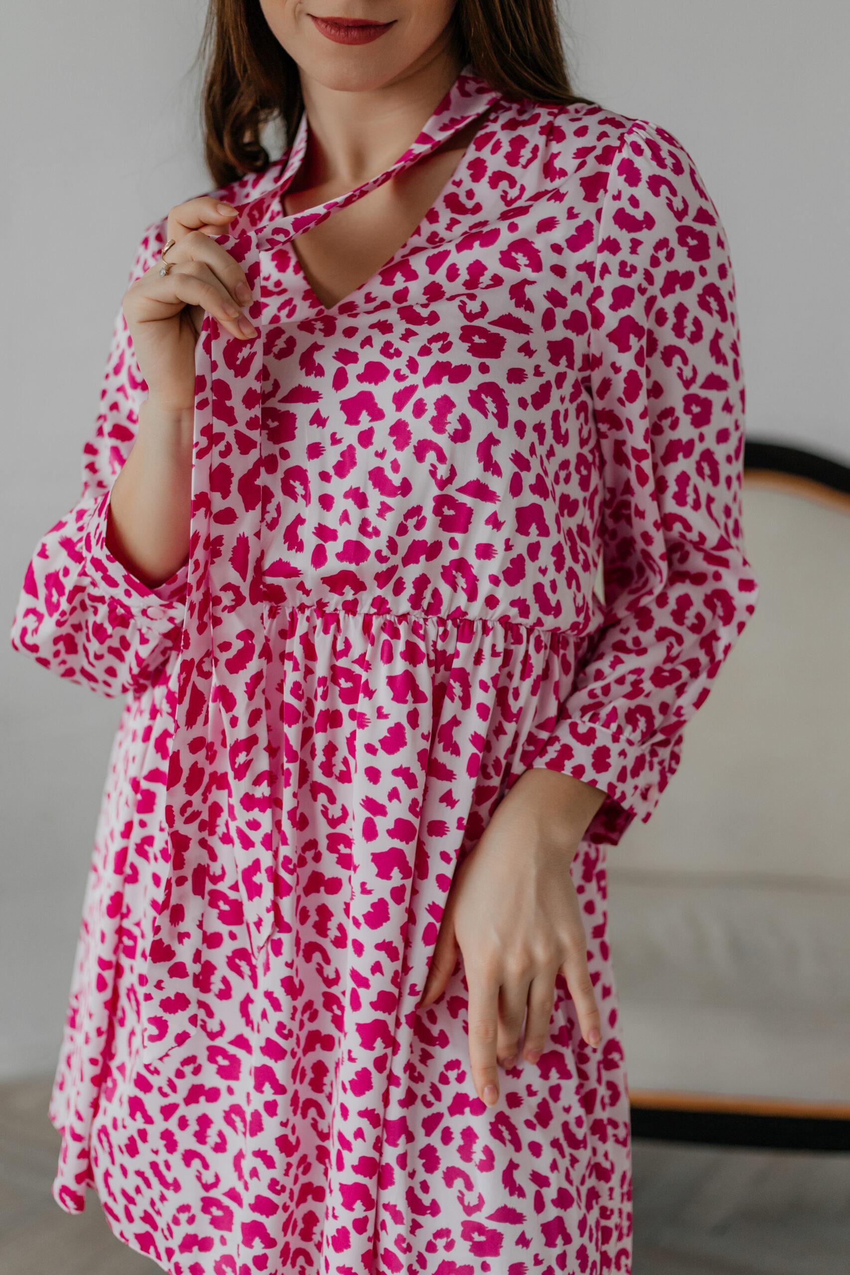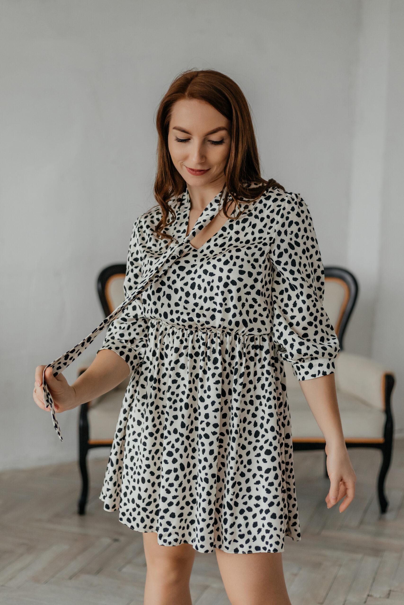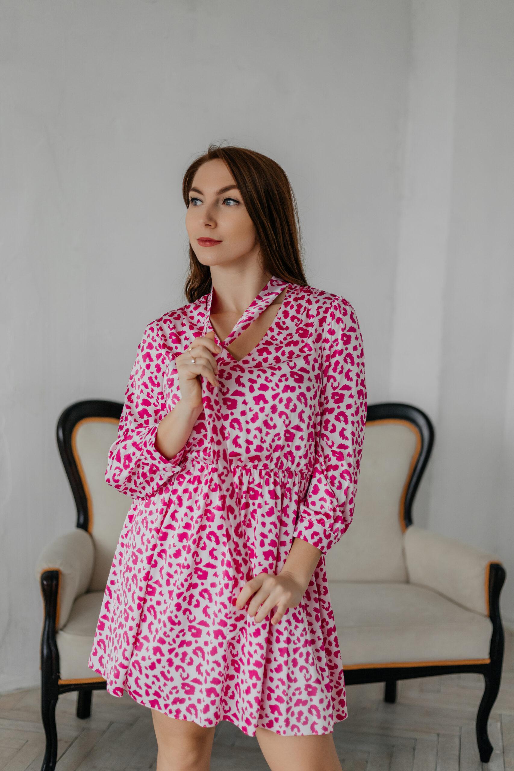 Платье женское, длины мини, на резинке. Рукав три четверти, на манжетах. Вырез V-образный, неглубокий, с лентами.