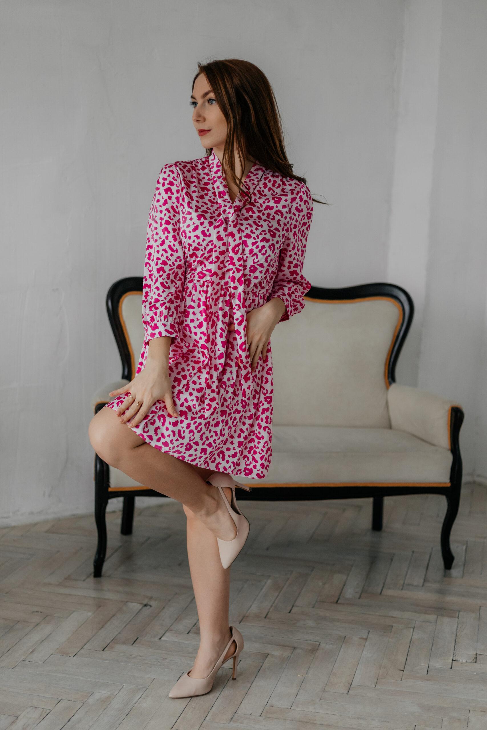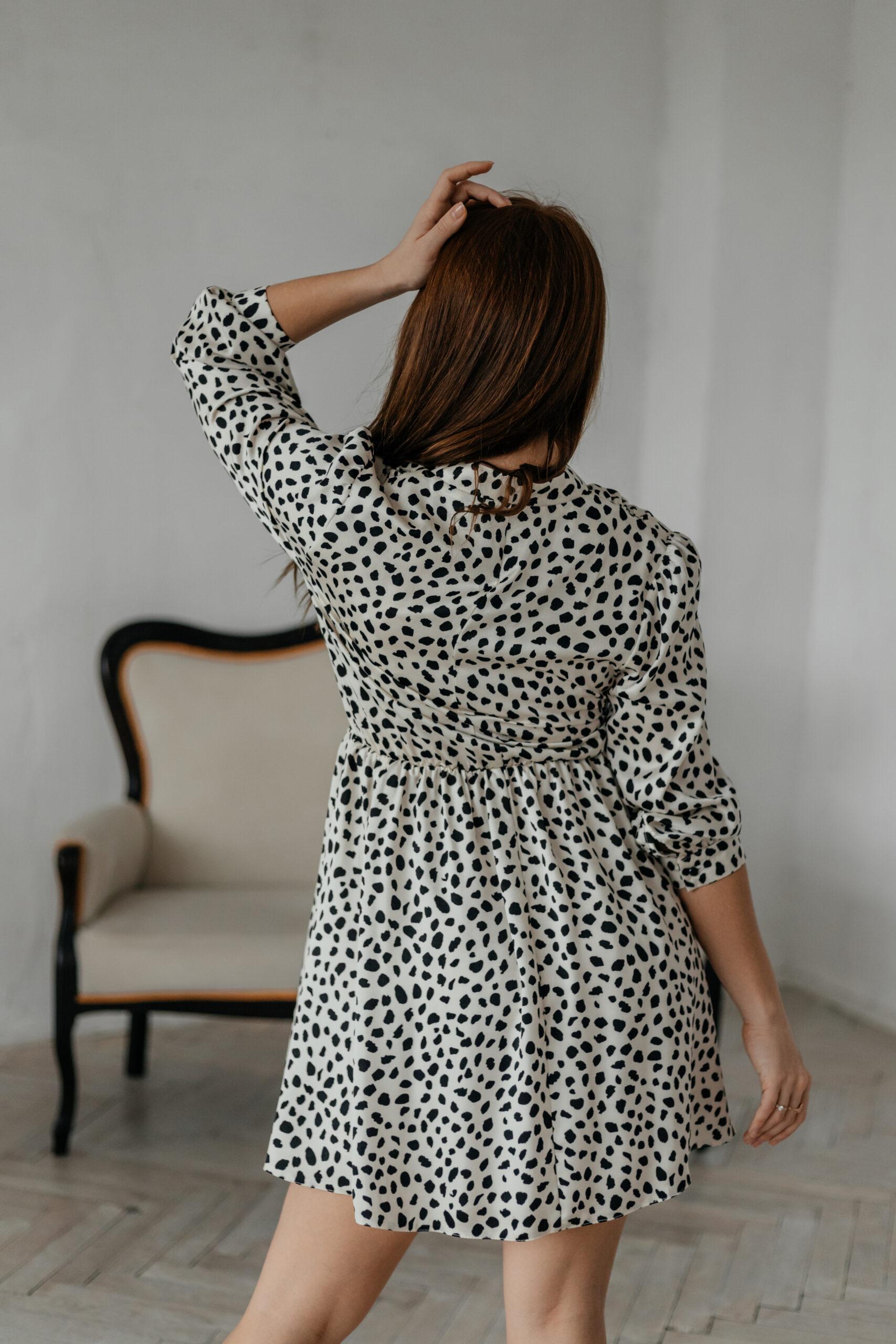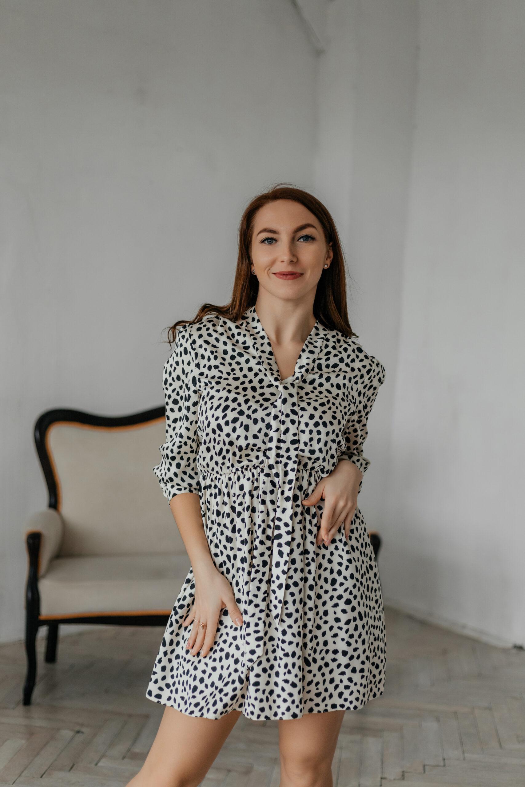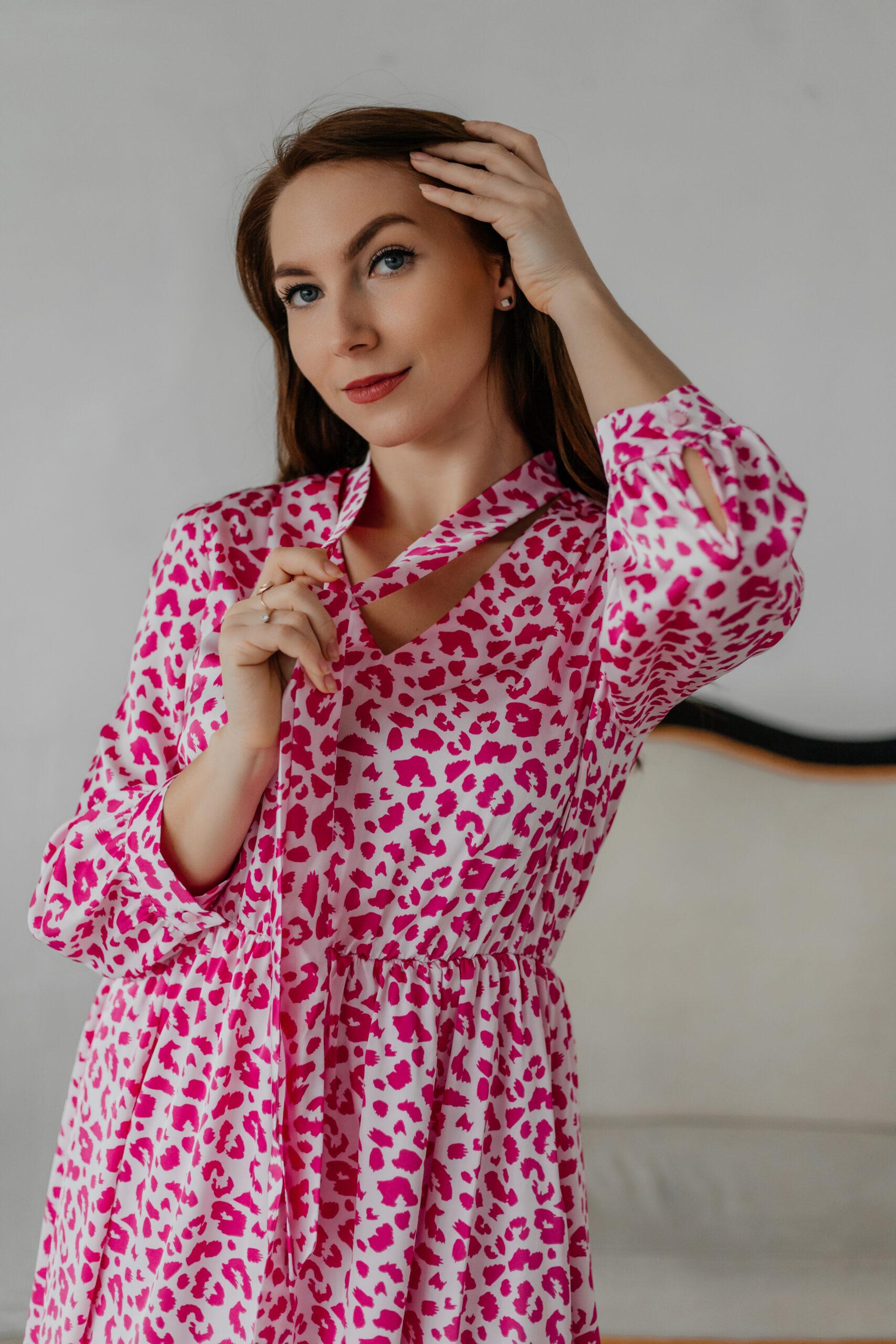 Платье женское, длины мини, на резинке. Рукав три четверти, на манжетах. Вырез V-образный, неглубокий, с лентами.