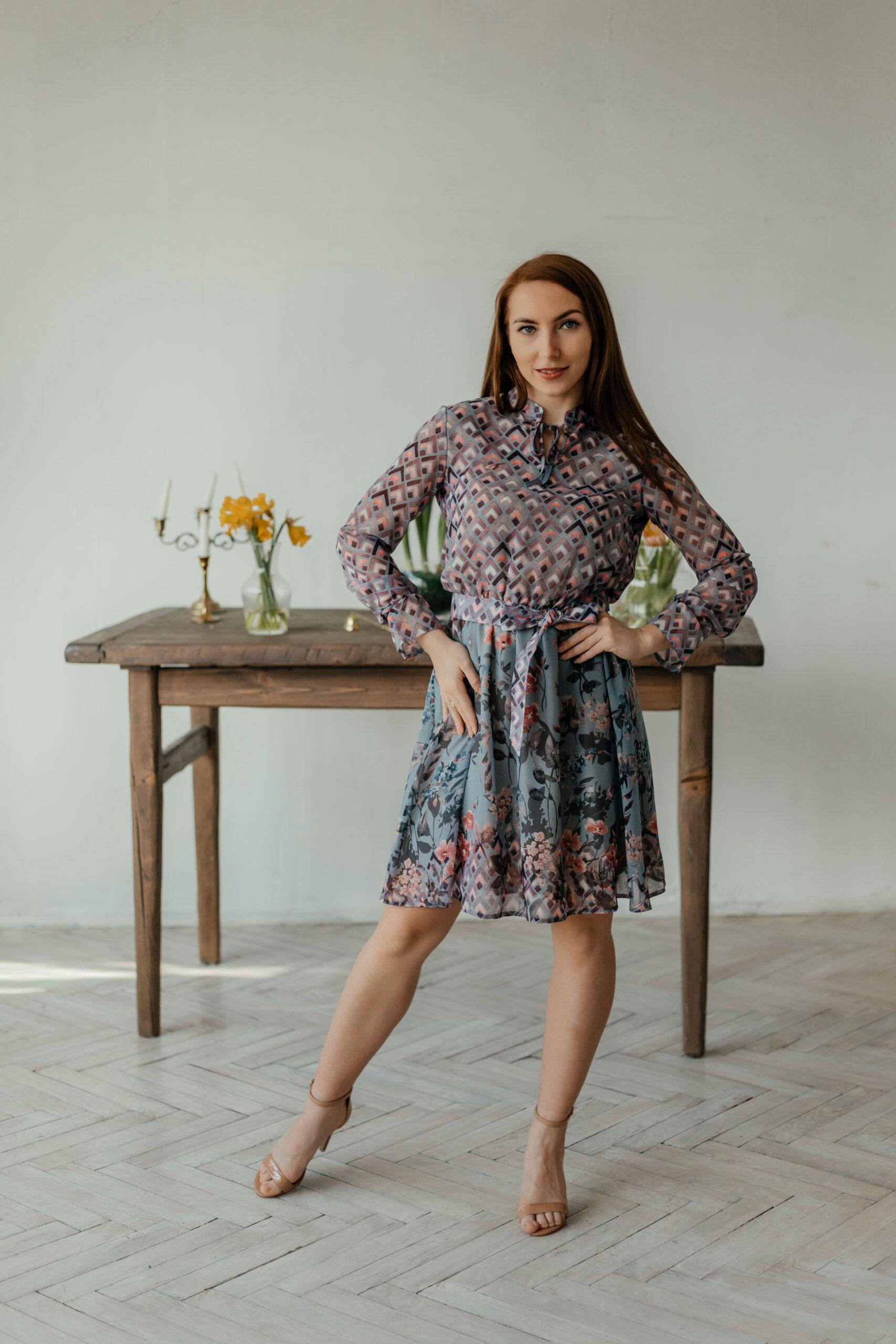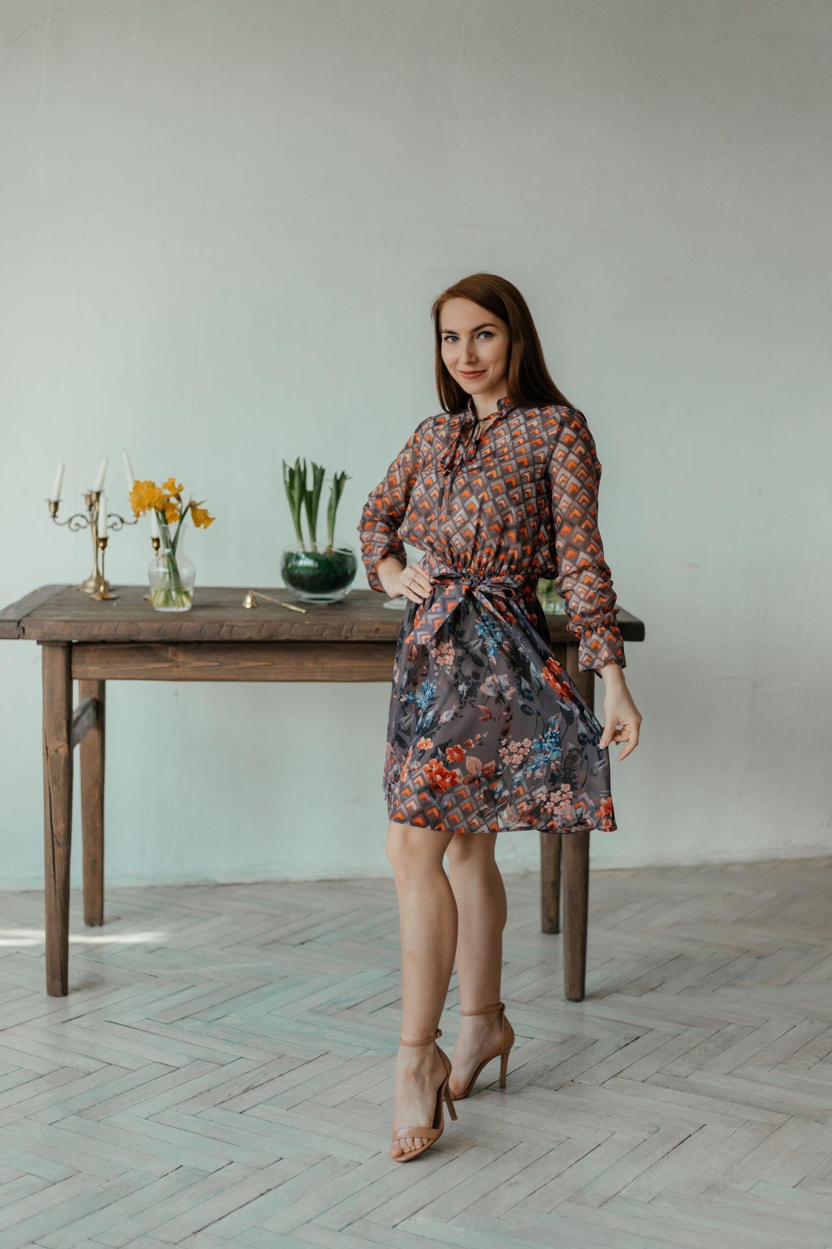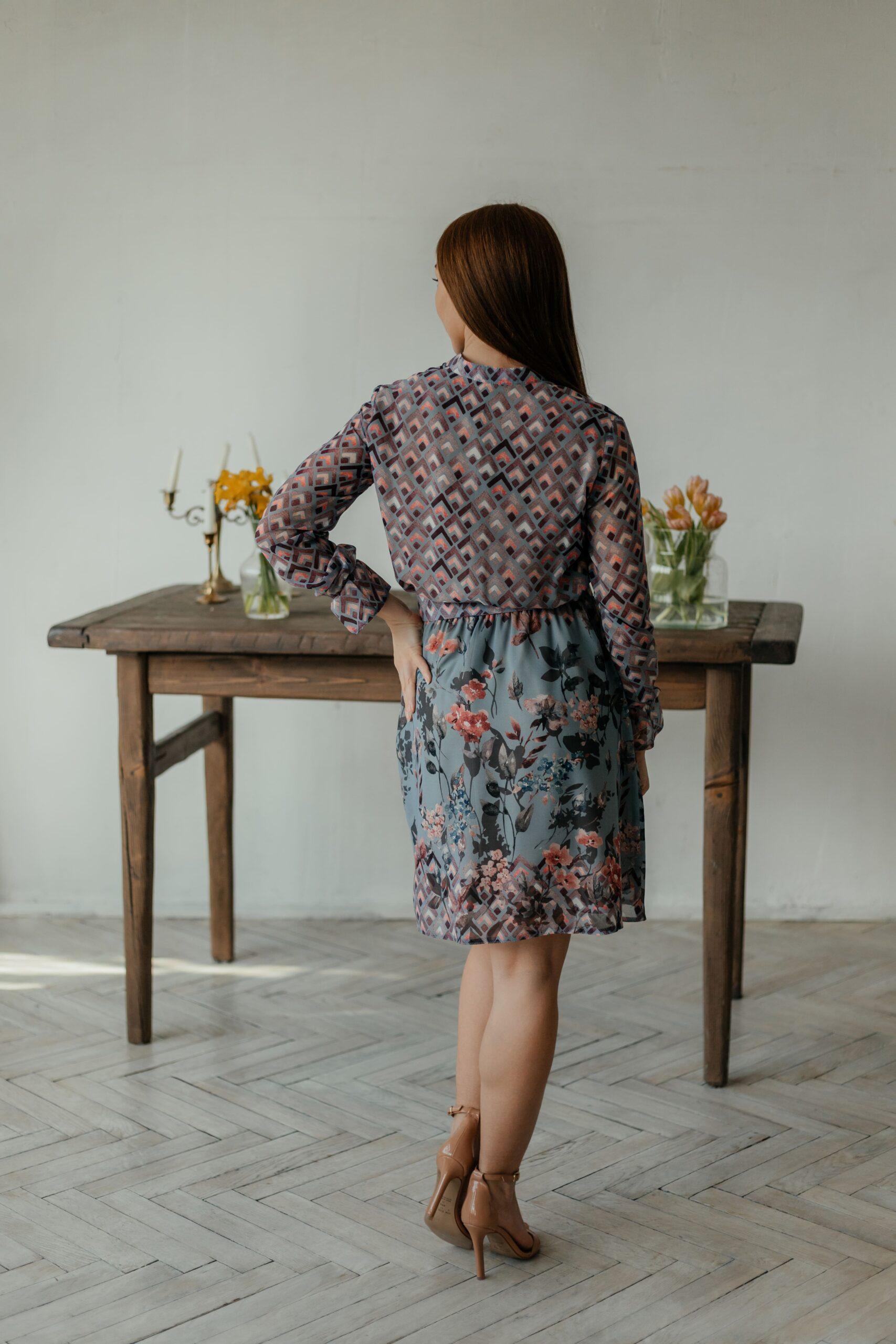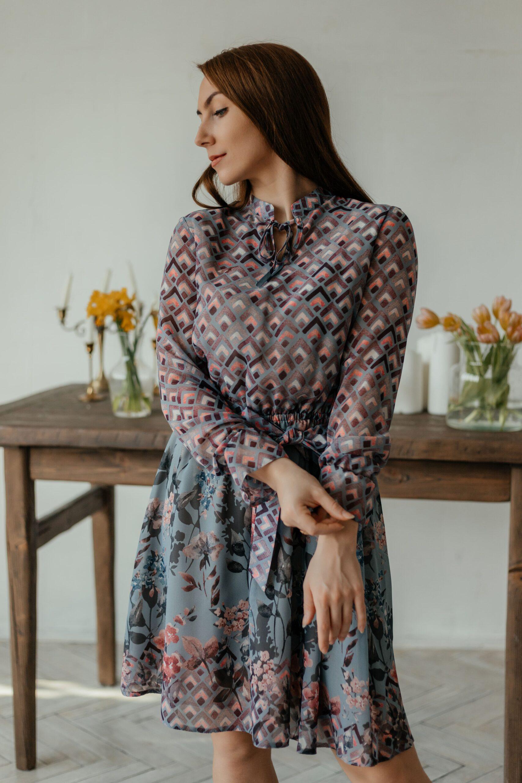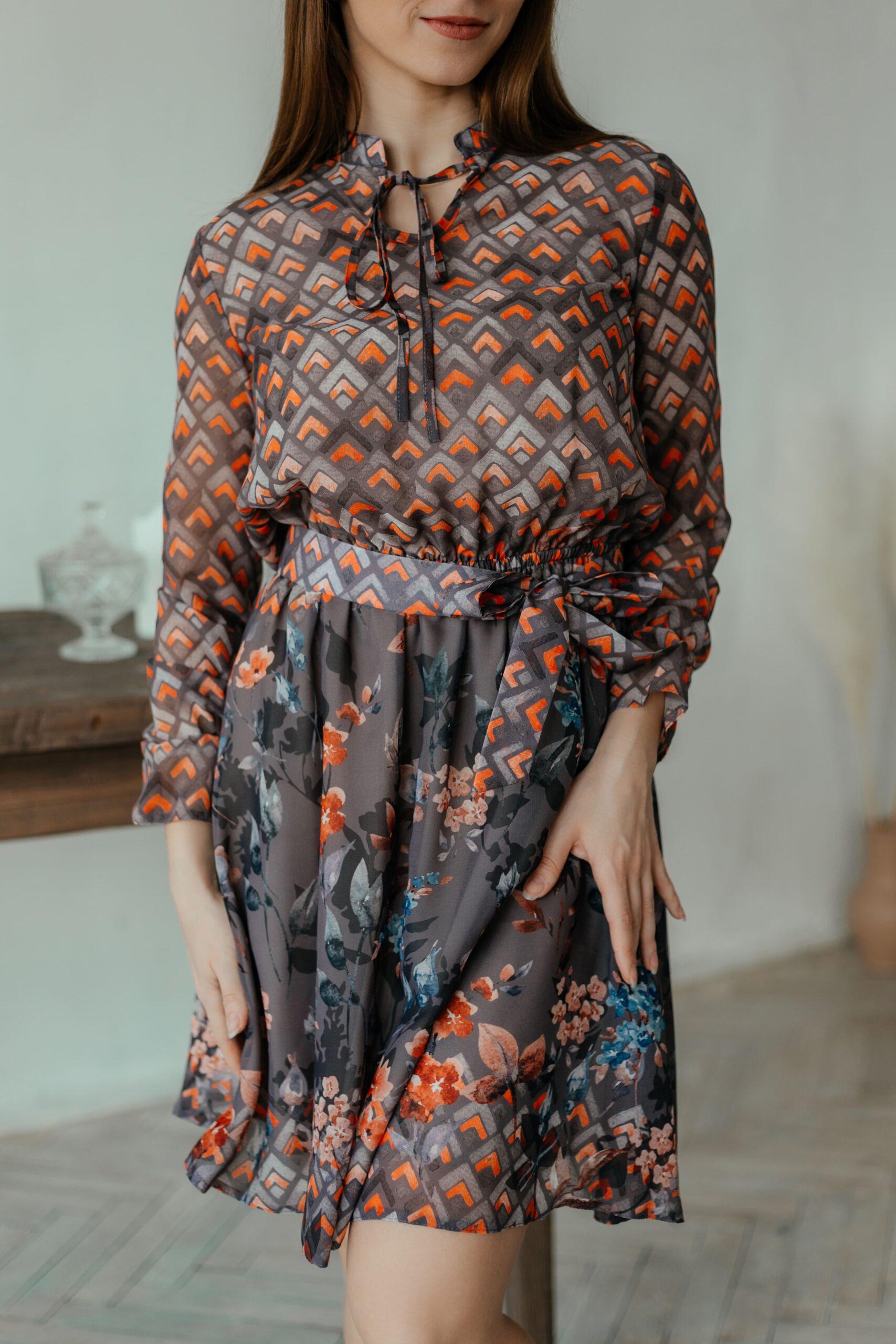 Платье женское, длины мини, рукав длинный. Платье свободного, кроя, со стойкой и вырезом капелькой с завязками. К платью прилагается тканевый пояс.