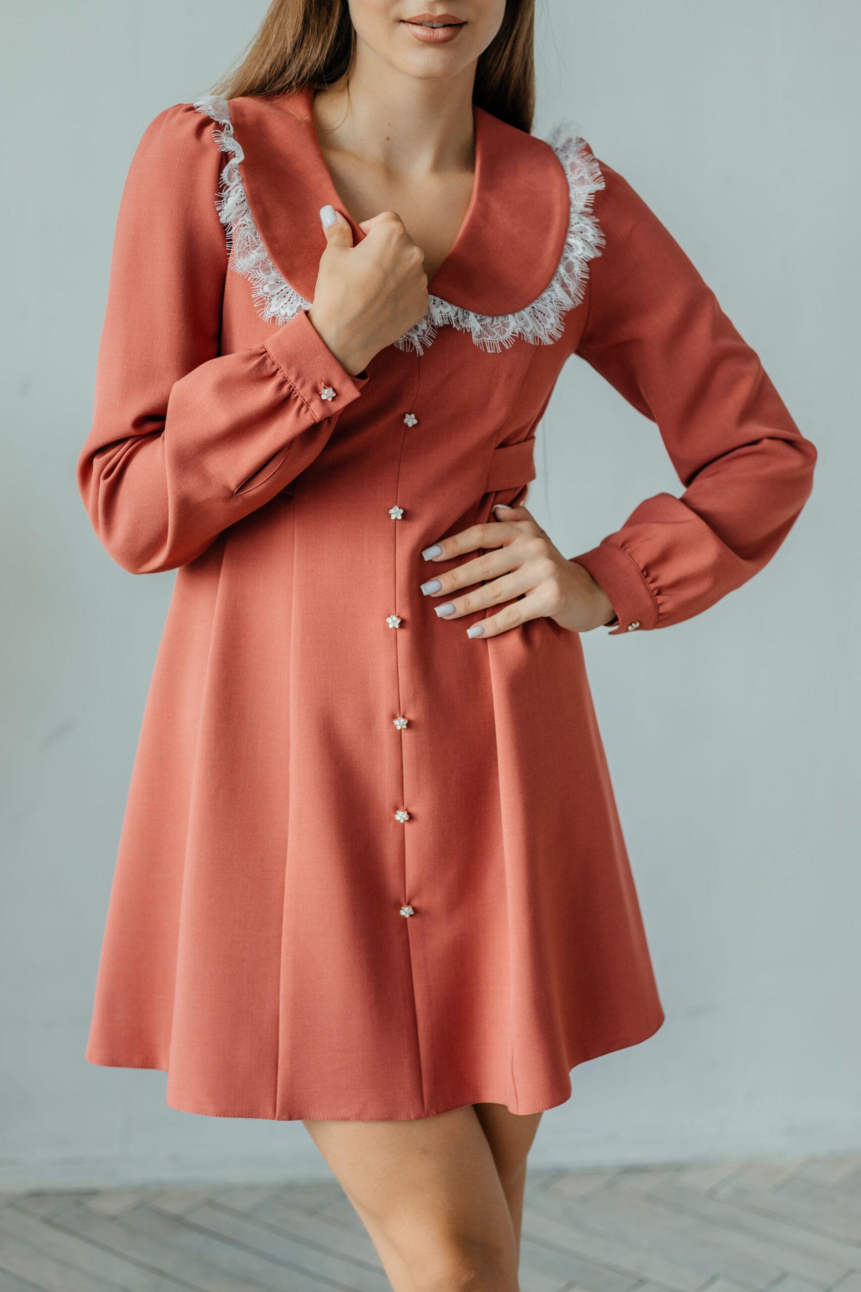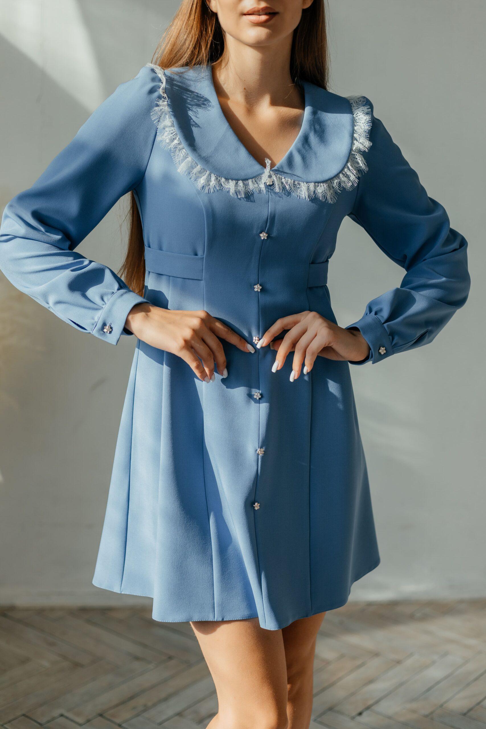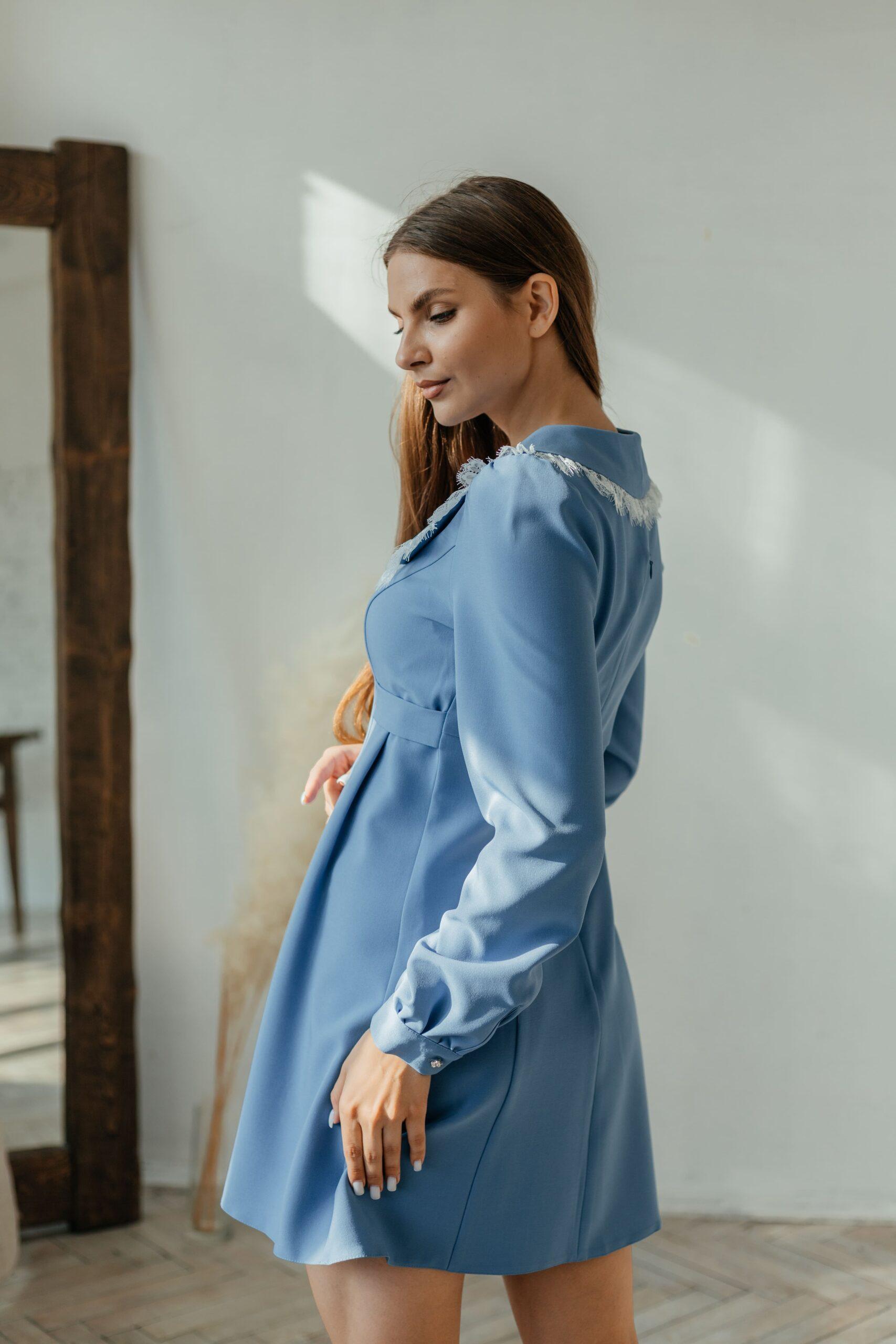 Платье женское, длины мини, длинный прямой рукав на манжете. Модель слегка приталенная, с воротничком. Спереди ряд пуговиц.