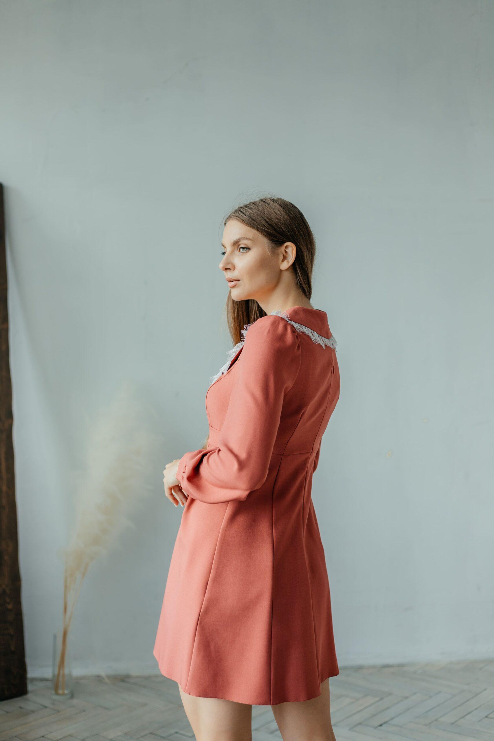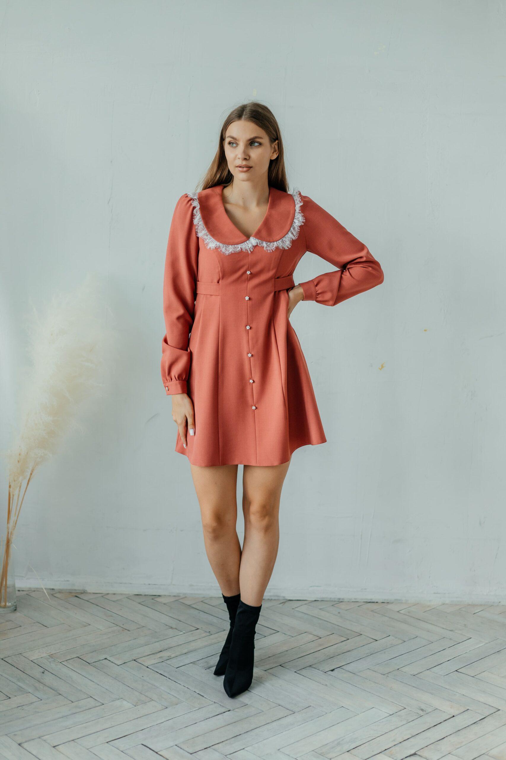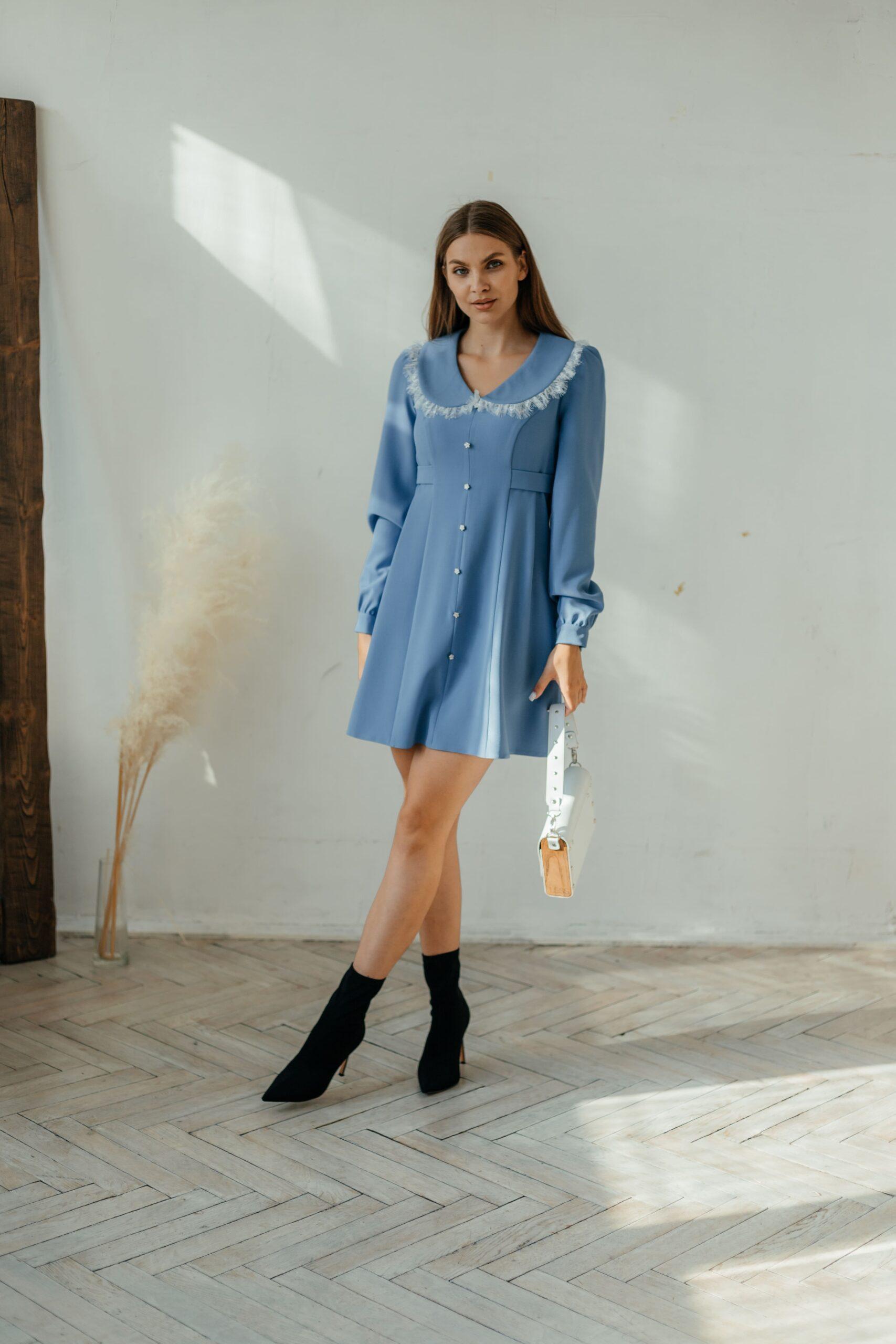 Платье женское, длины мини, длинный прямой рукав на манжете. Модель слегка приталенная, с воротничком. Спереди ряд пуговиц.