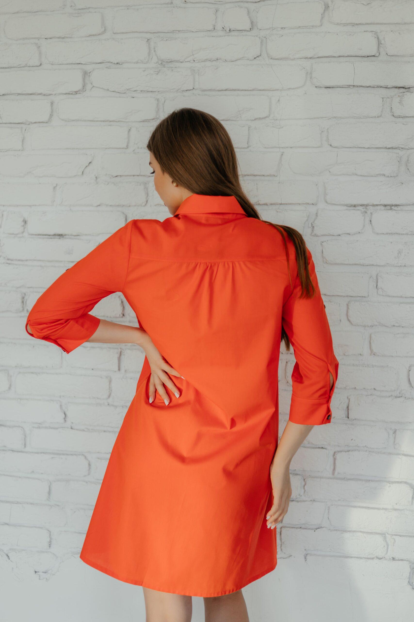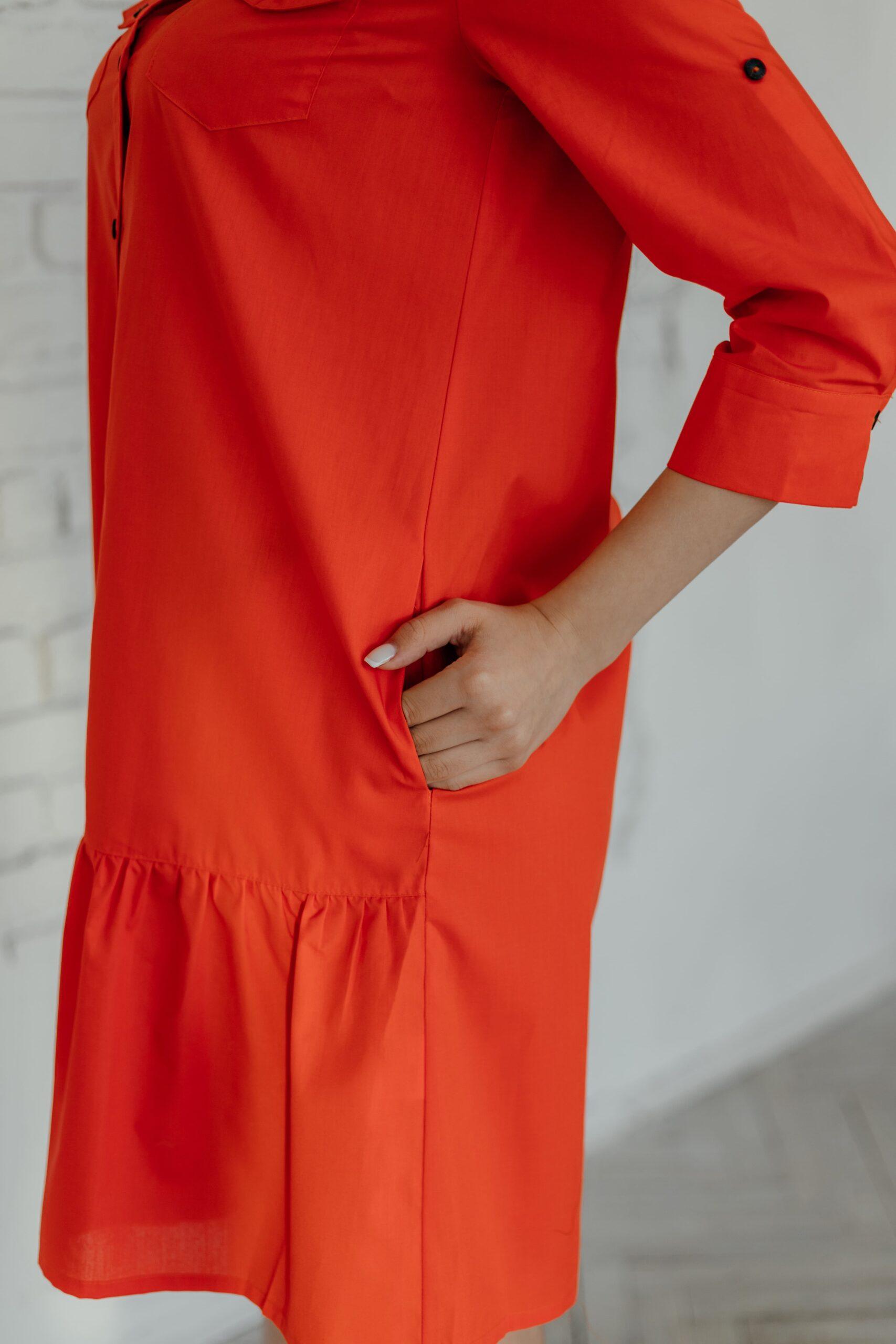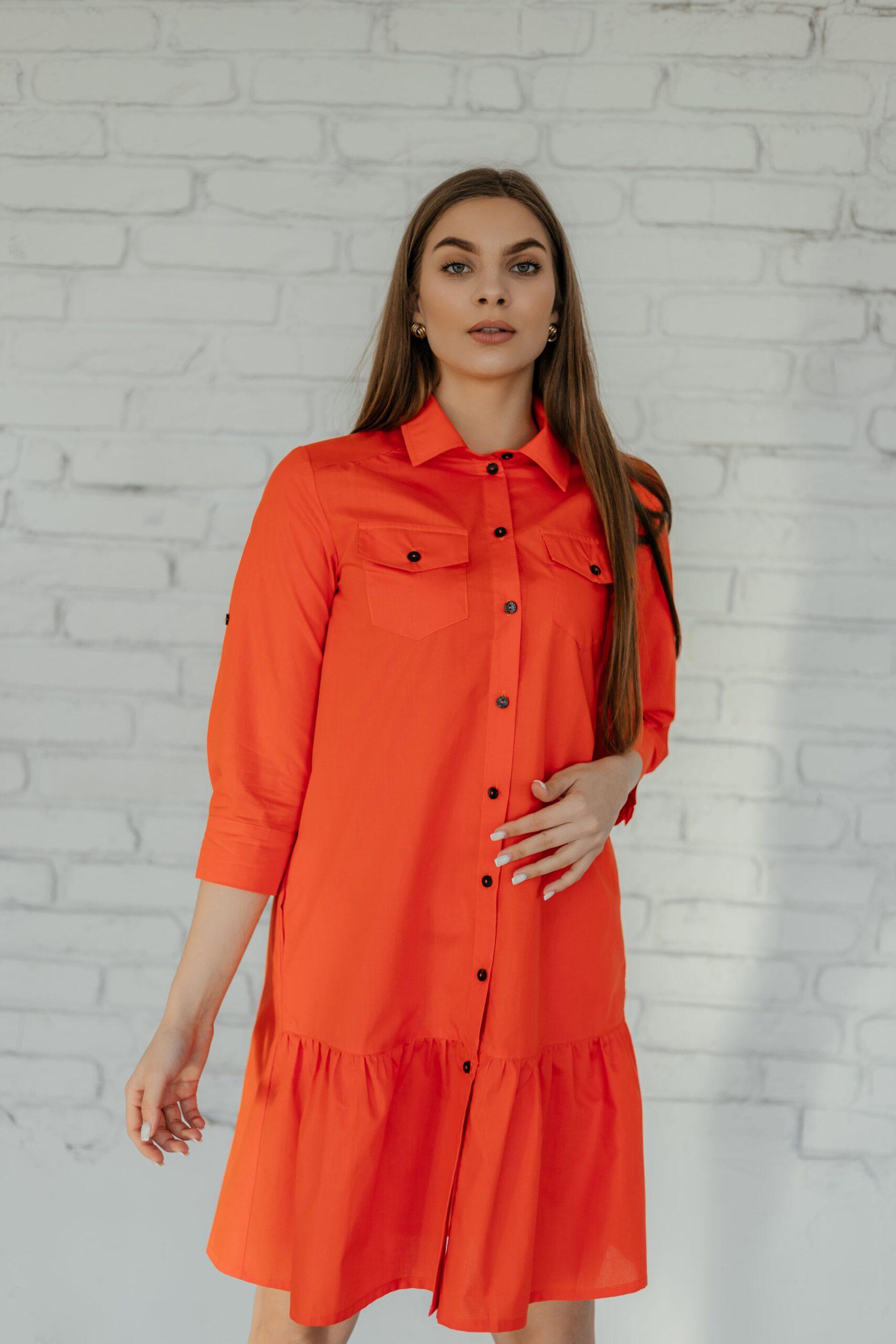 Платье женское, стильное, с четвертным рукавом, свободного кроя, на пуговицах, снизу волан. На груди два нагрудных кармана с клапанами , рукав четвертной, на манжетах, с разрезами. Так же в платье есть боковые карманы.