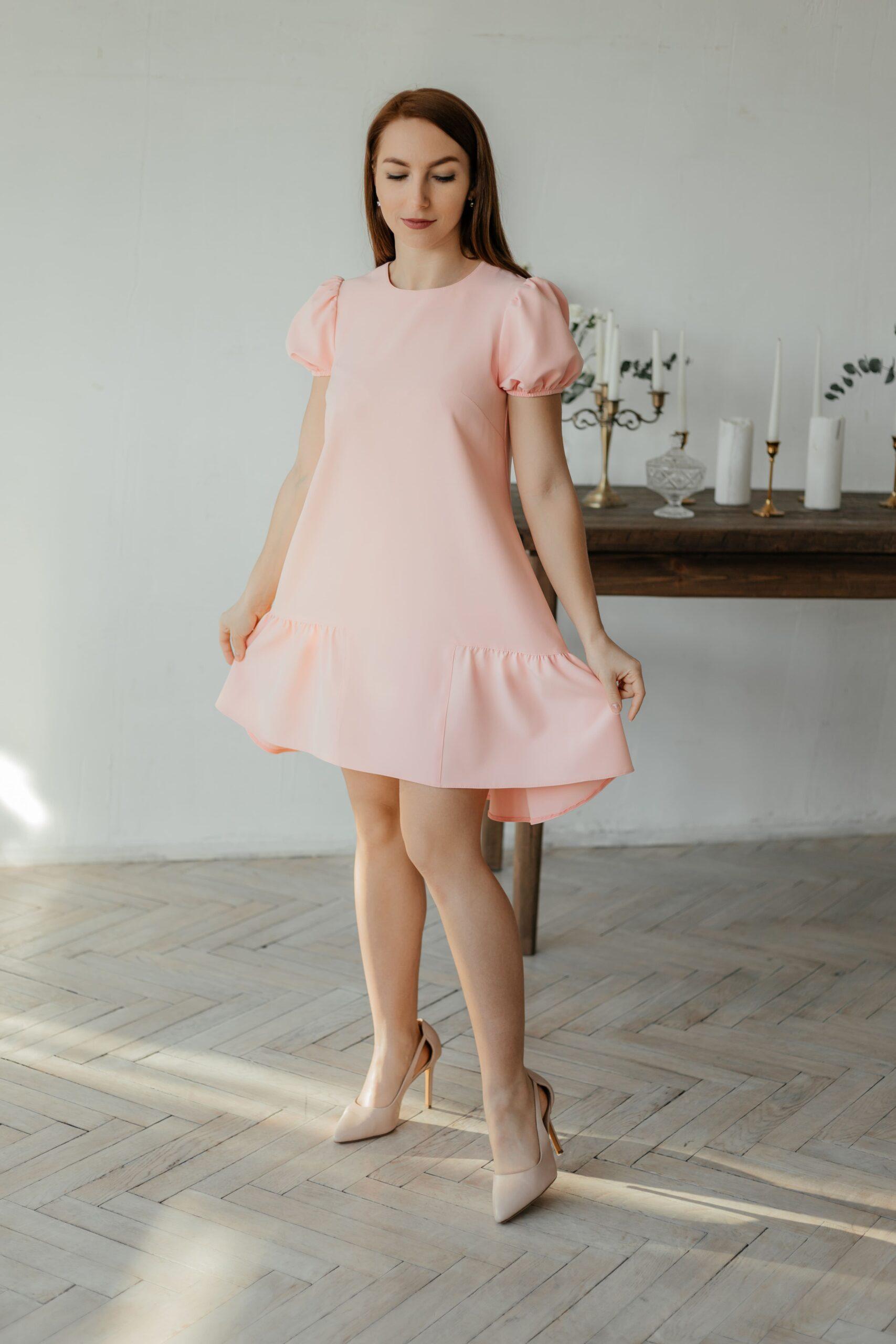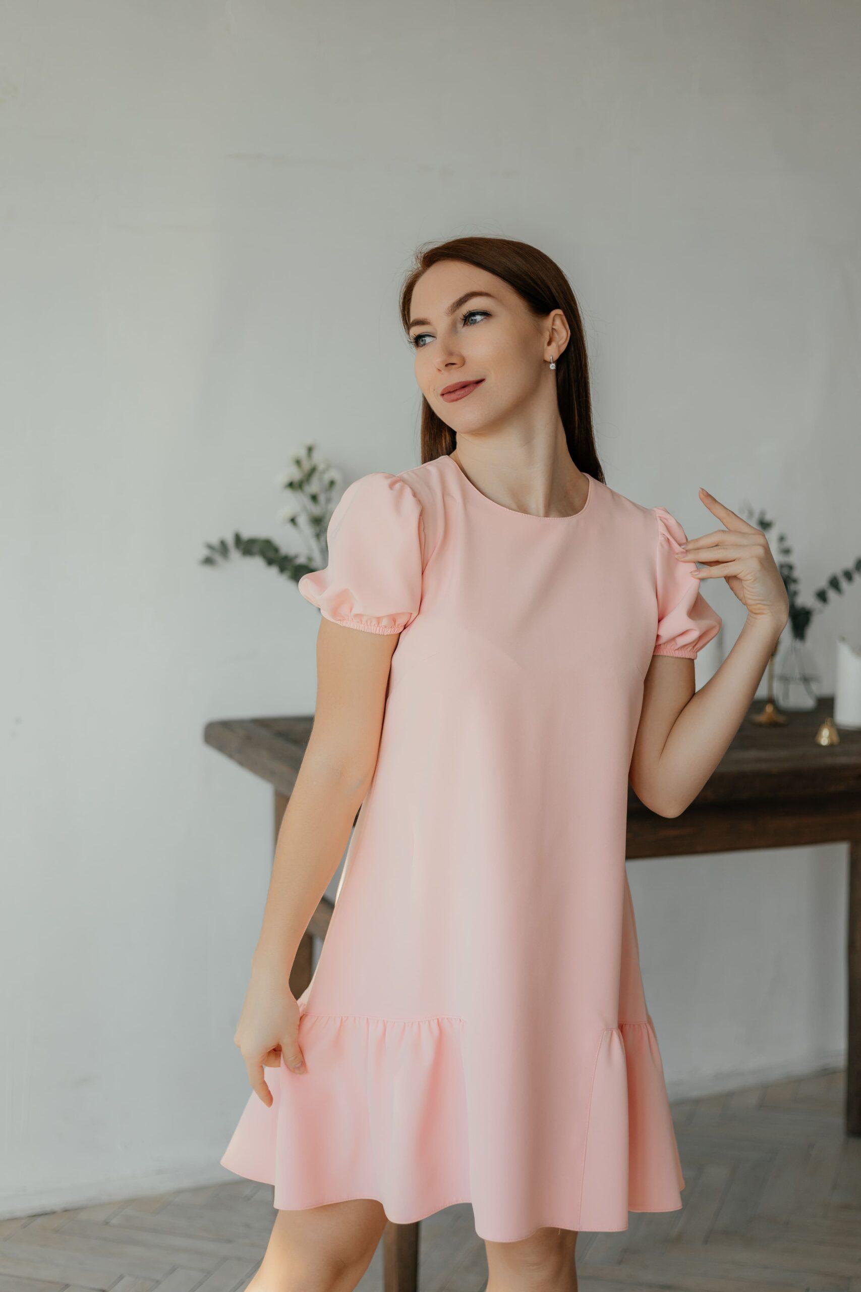 Платье женское, длины мини, с воланом, рукав короткий, на резинке фонариком. Вырез неглубокий круглый.