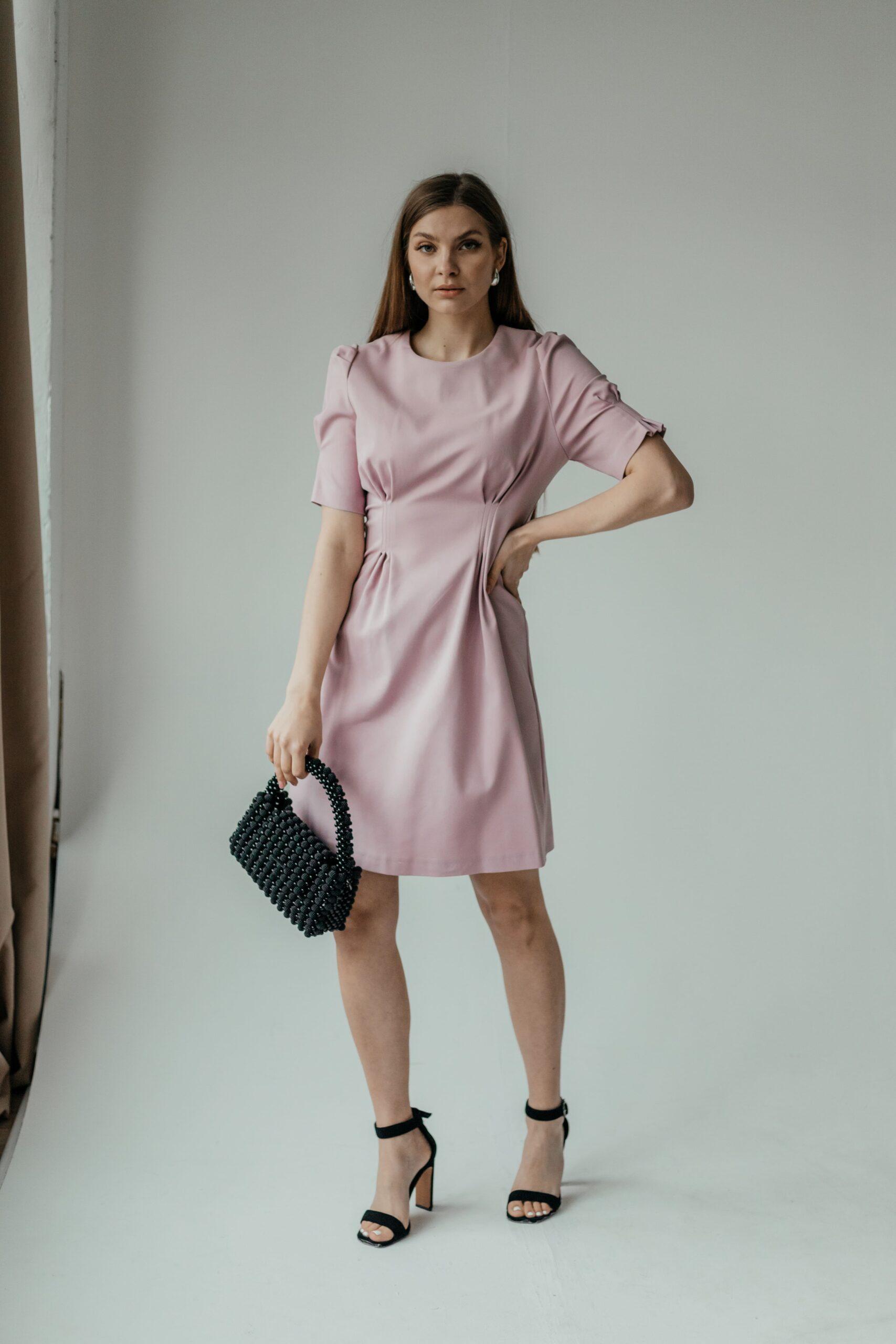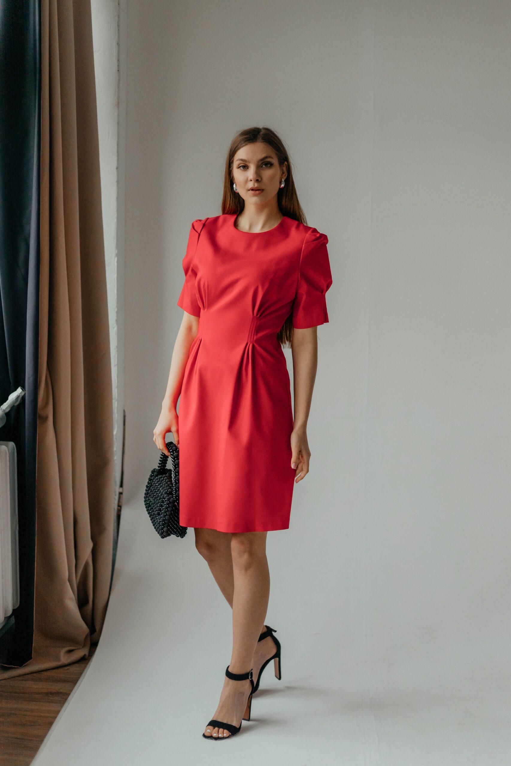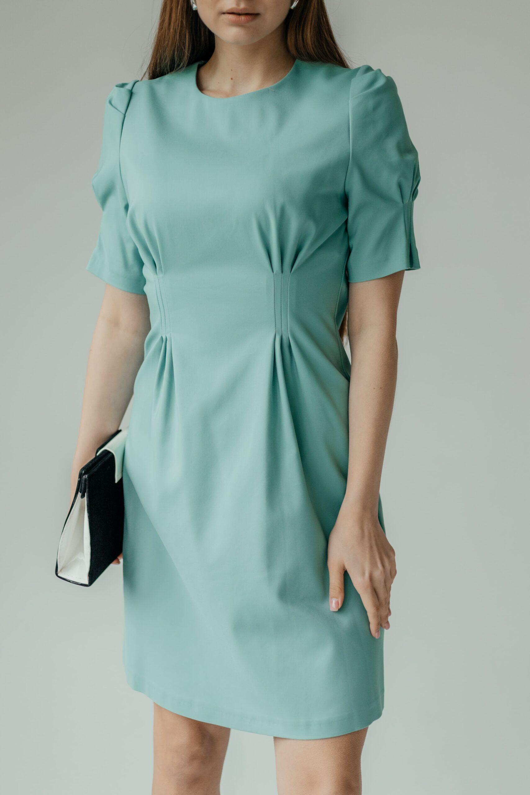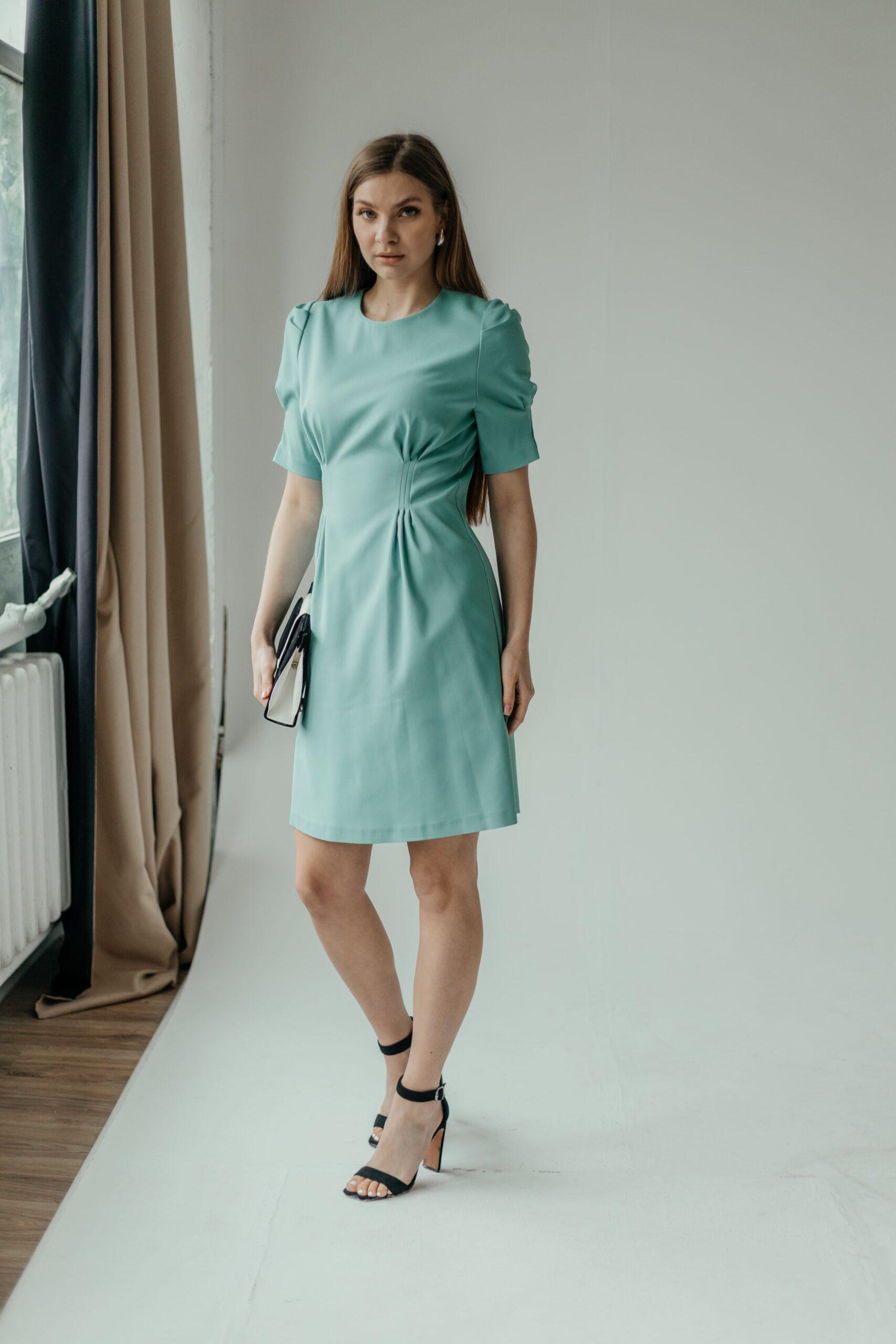 Платье женское, длины мини, приталенное, с коротким рукавом. В модели красивый, зауженный рукав, на высокой манжете. Вырез неглубокий, под грудью красивая сборка. Талия красиво очерчена, под талией красивые складки.