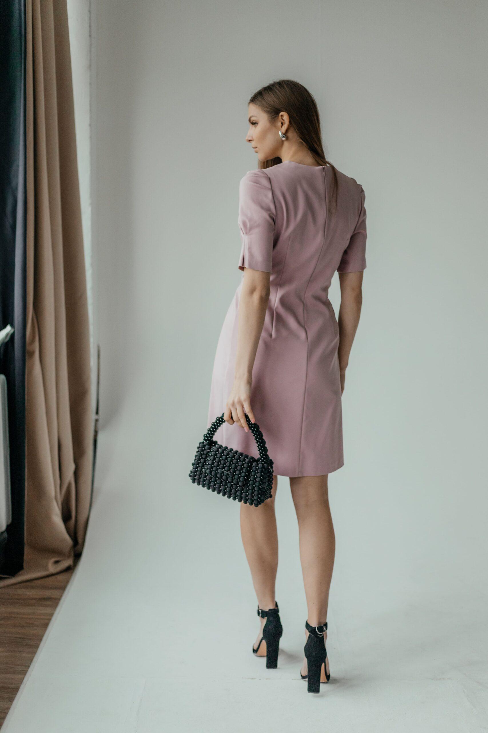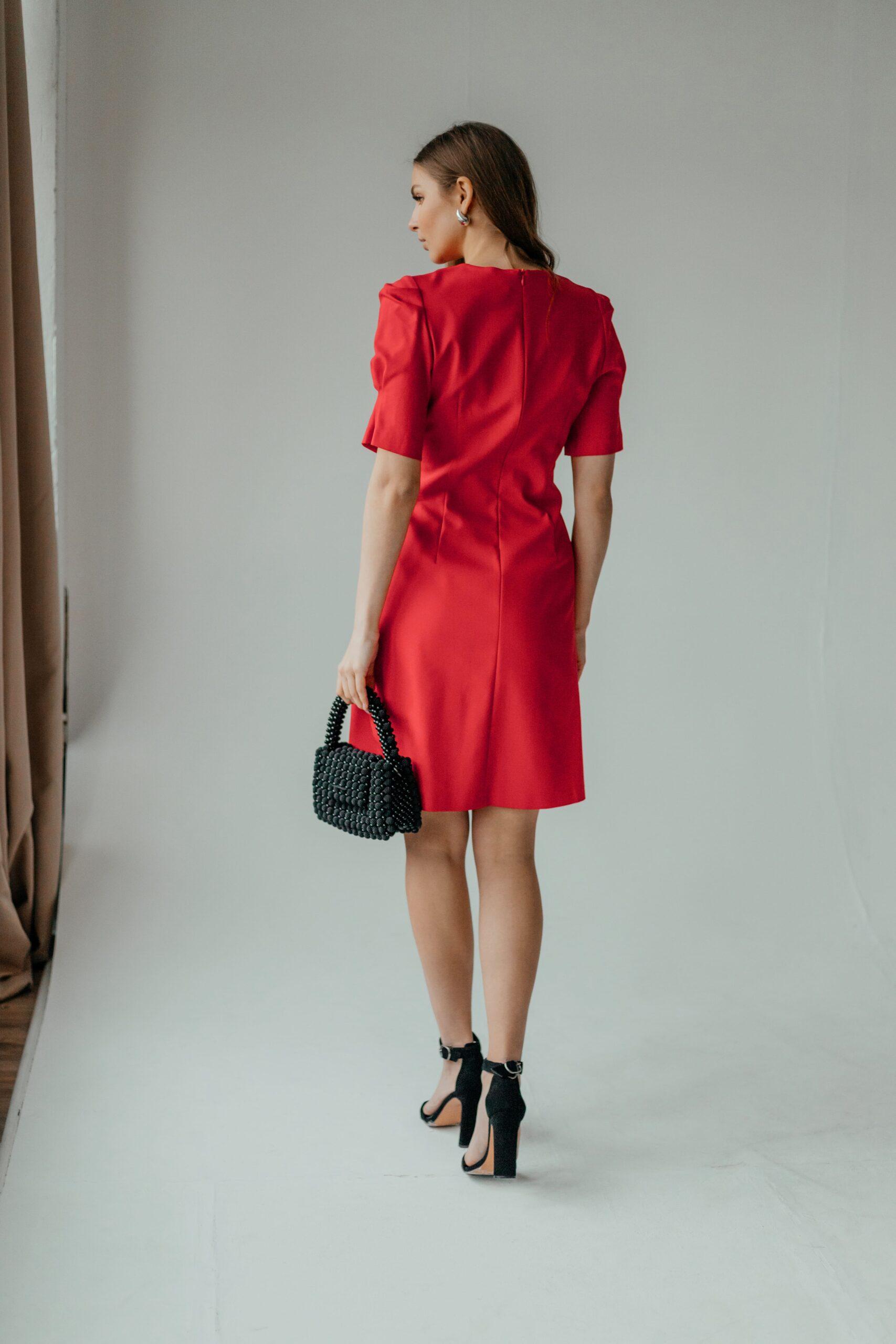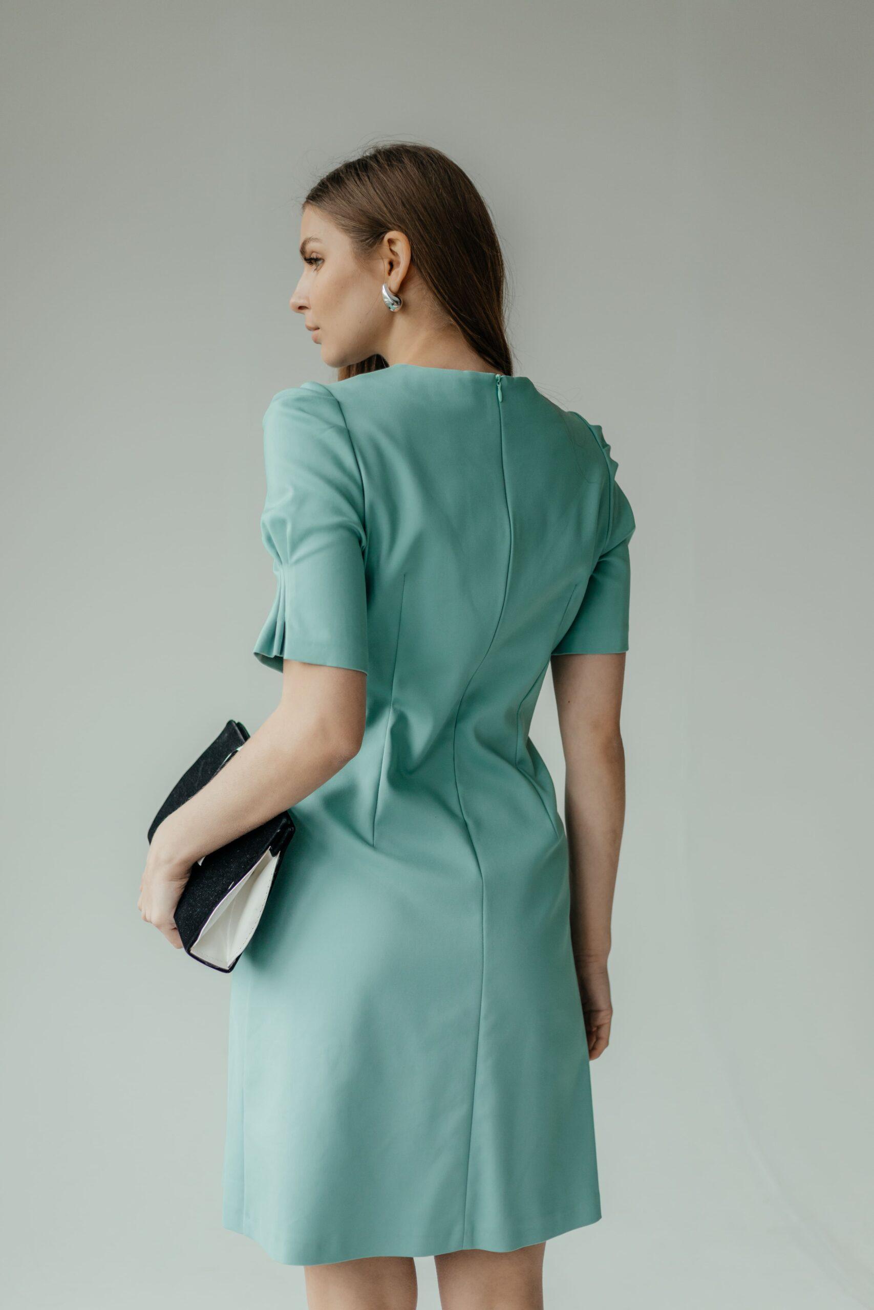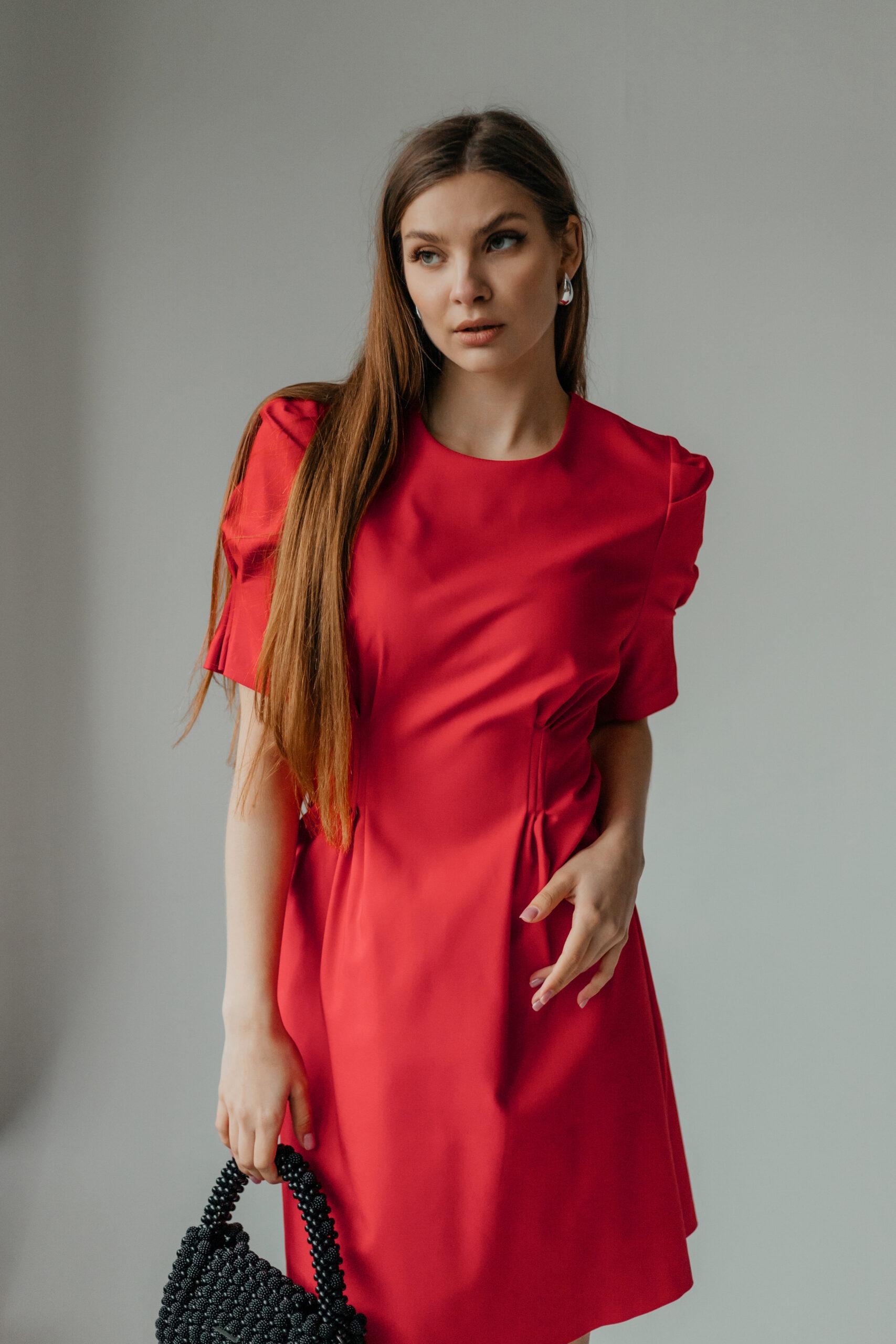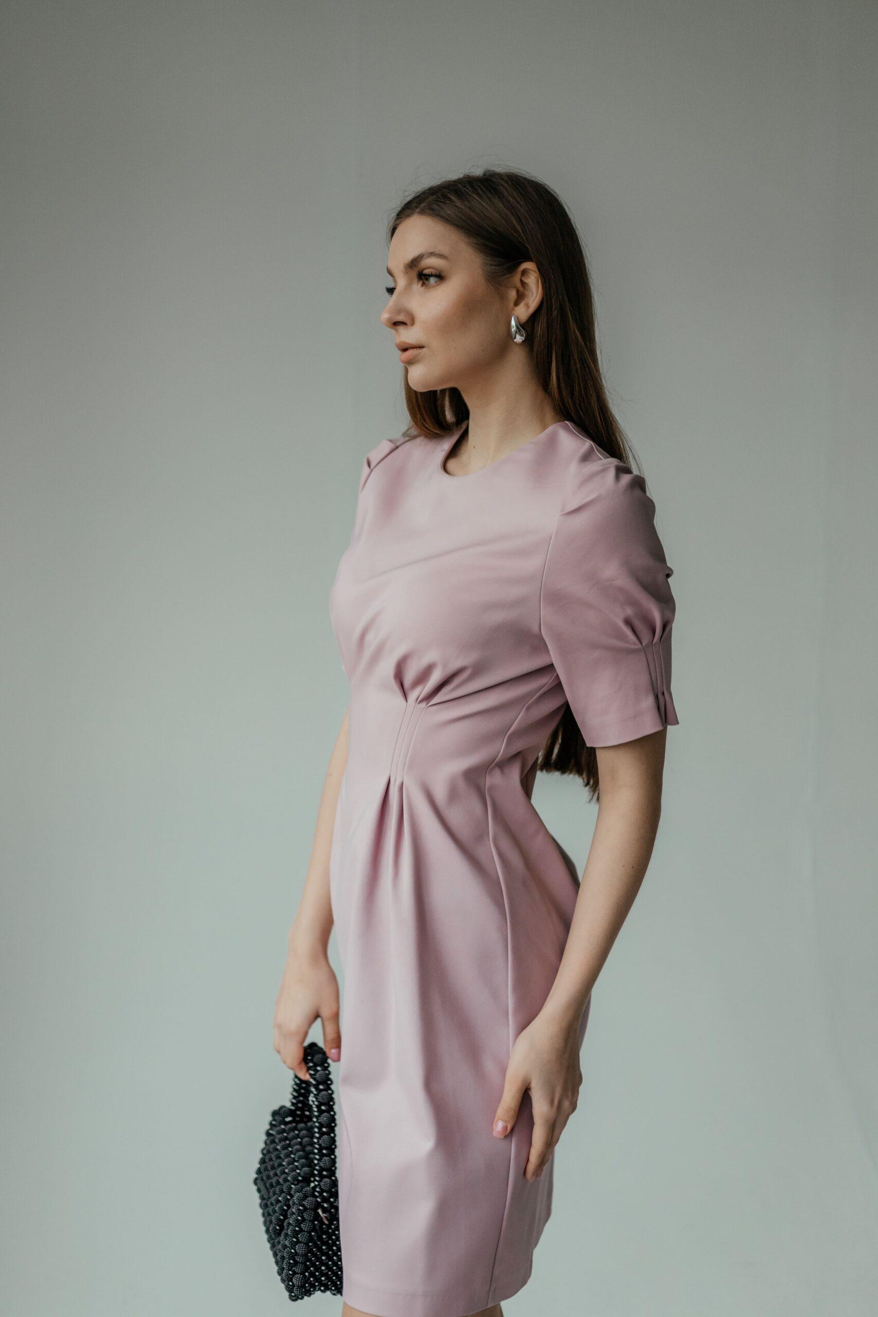 Платье женское, длины мини, приталенное, с коротким рукавом. В модели красивый, зауженный рукав, на высокой манжете. Вырез неглубокий, под грудью красивая сборка. Талия красиво очерчена, под талией красивые складки.
