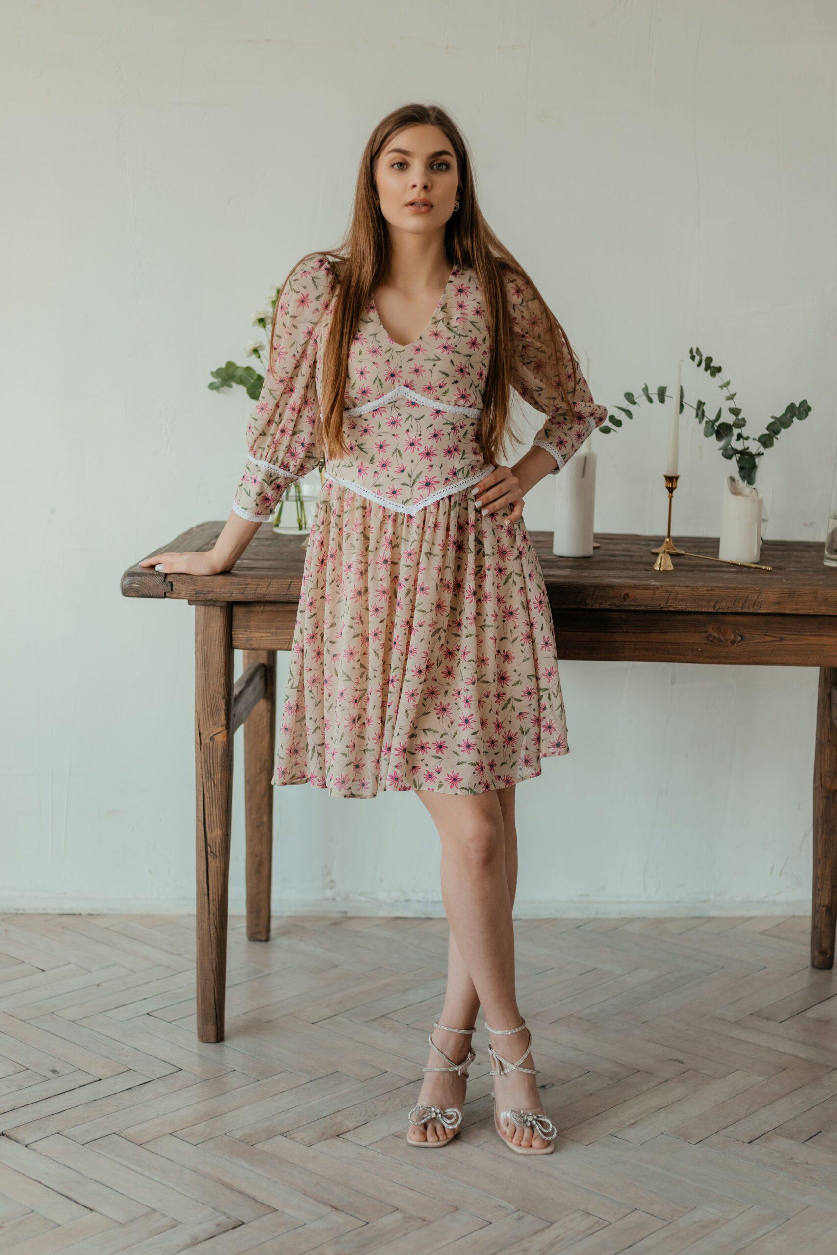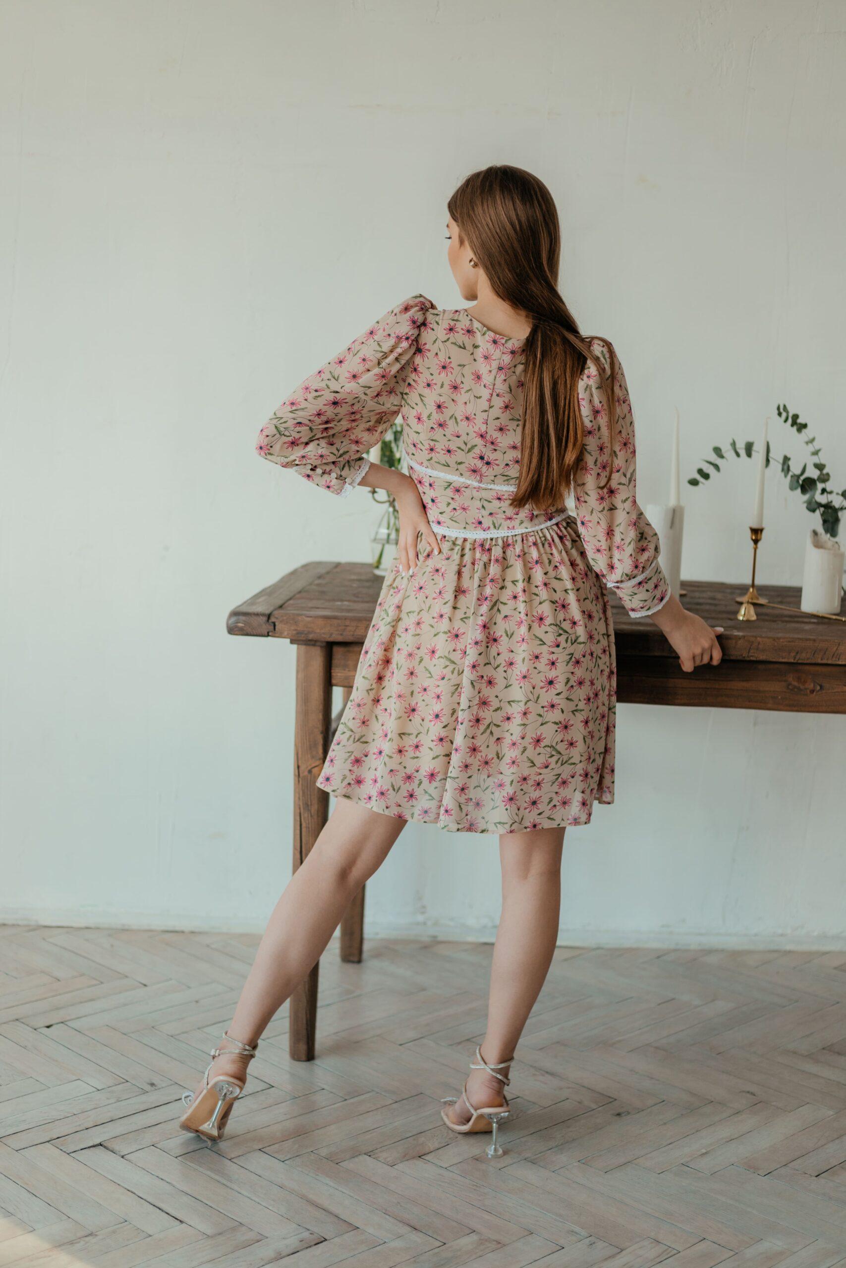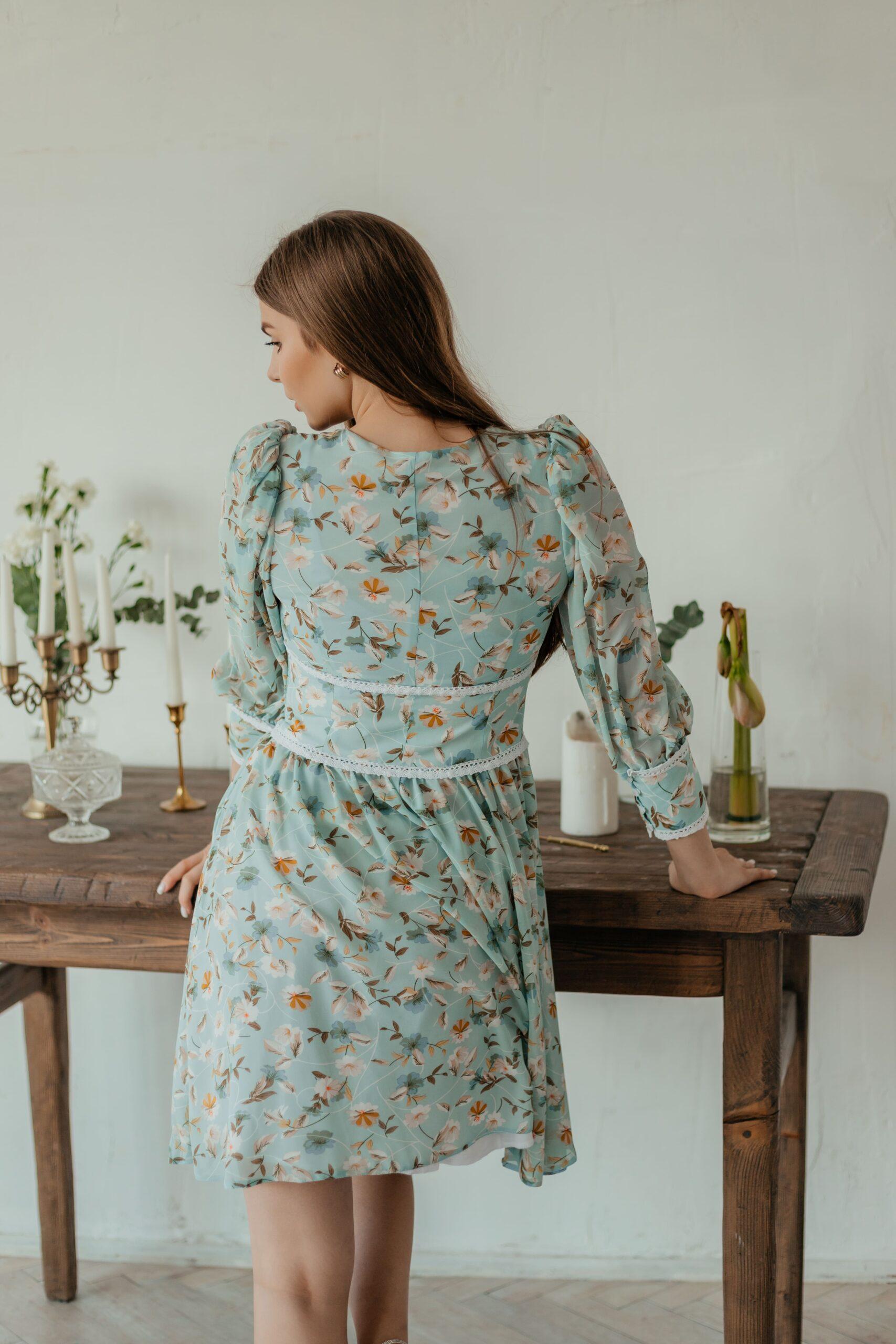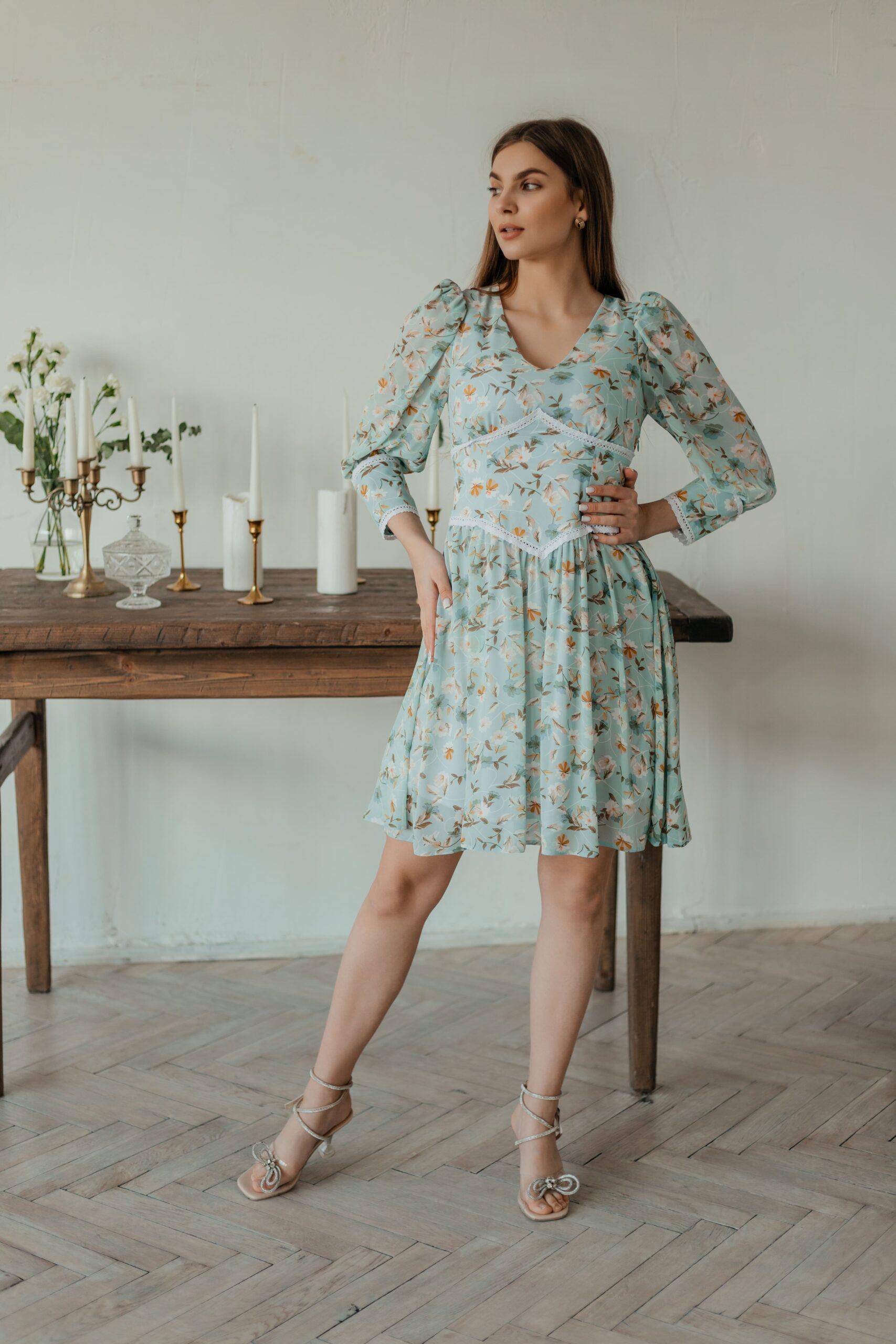 Платье женское, шифоновое, длины мини, с четвертным рукавом на высокой манжете. Модель легкая, воздушная, с V- образным вырезом, и отделкой из шитья в зоне талии.