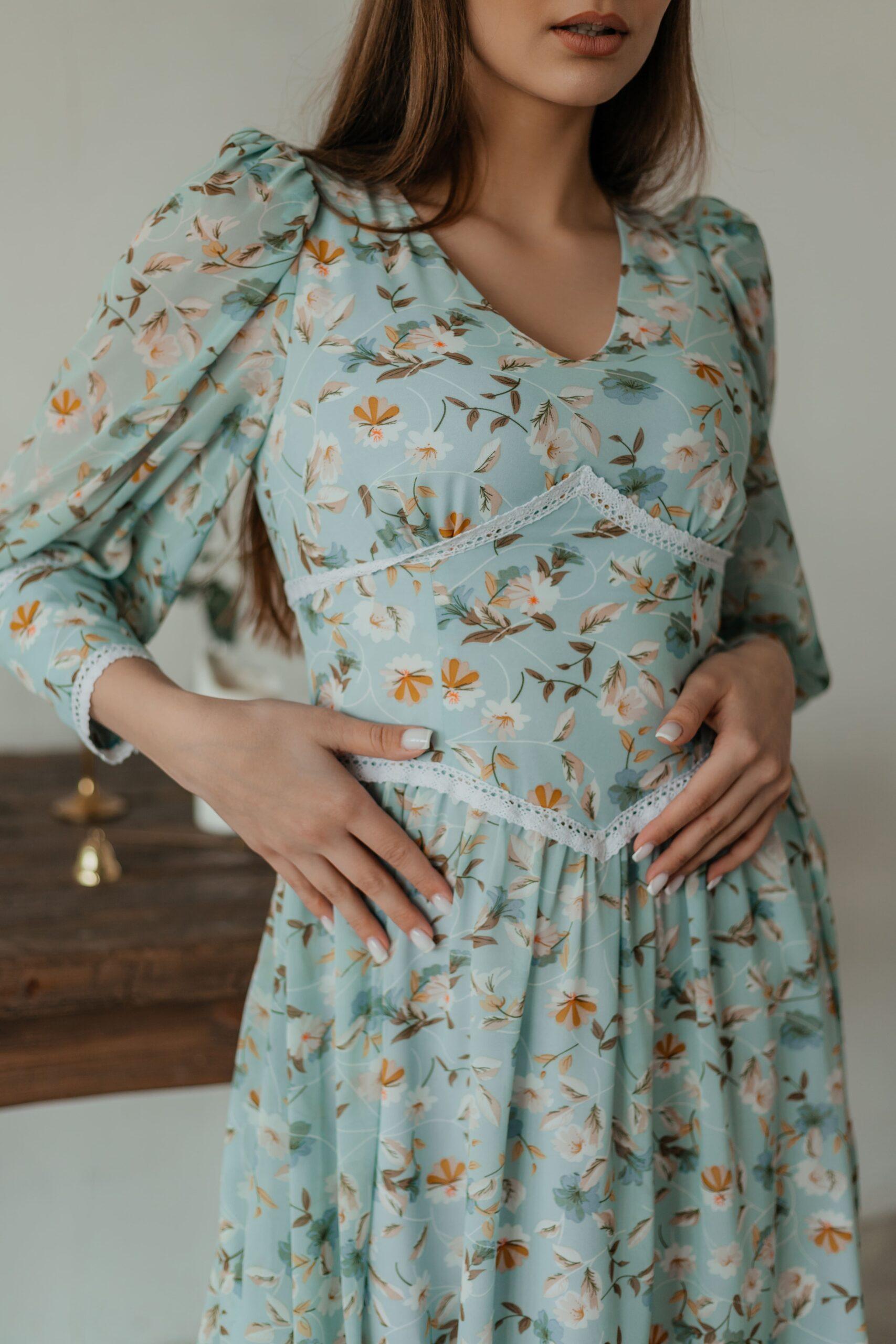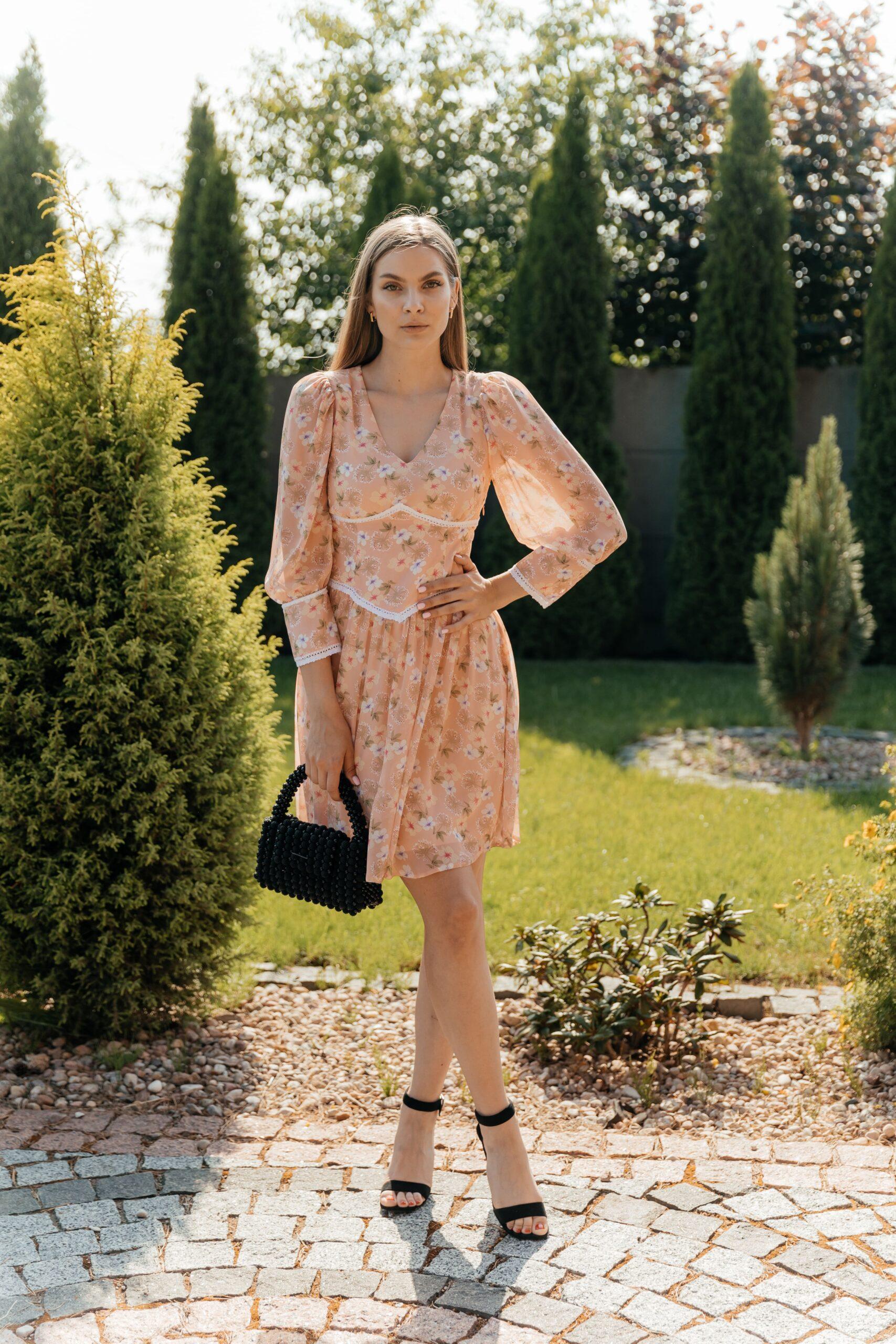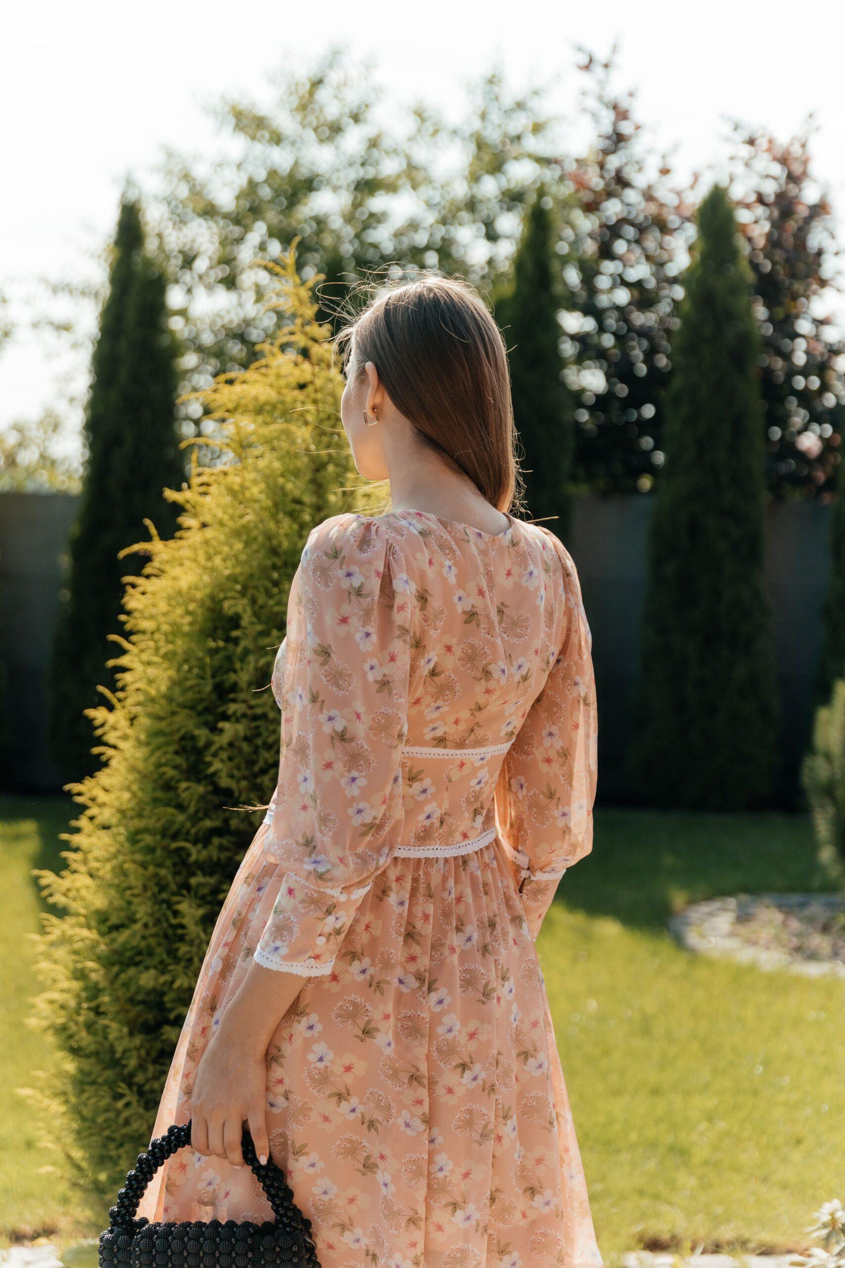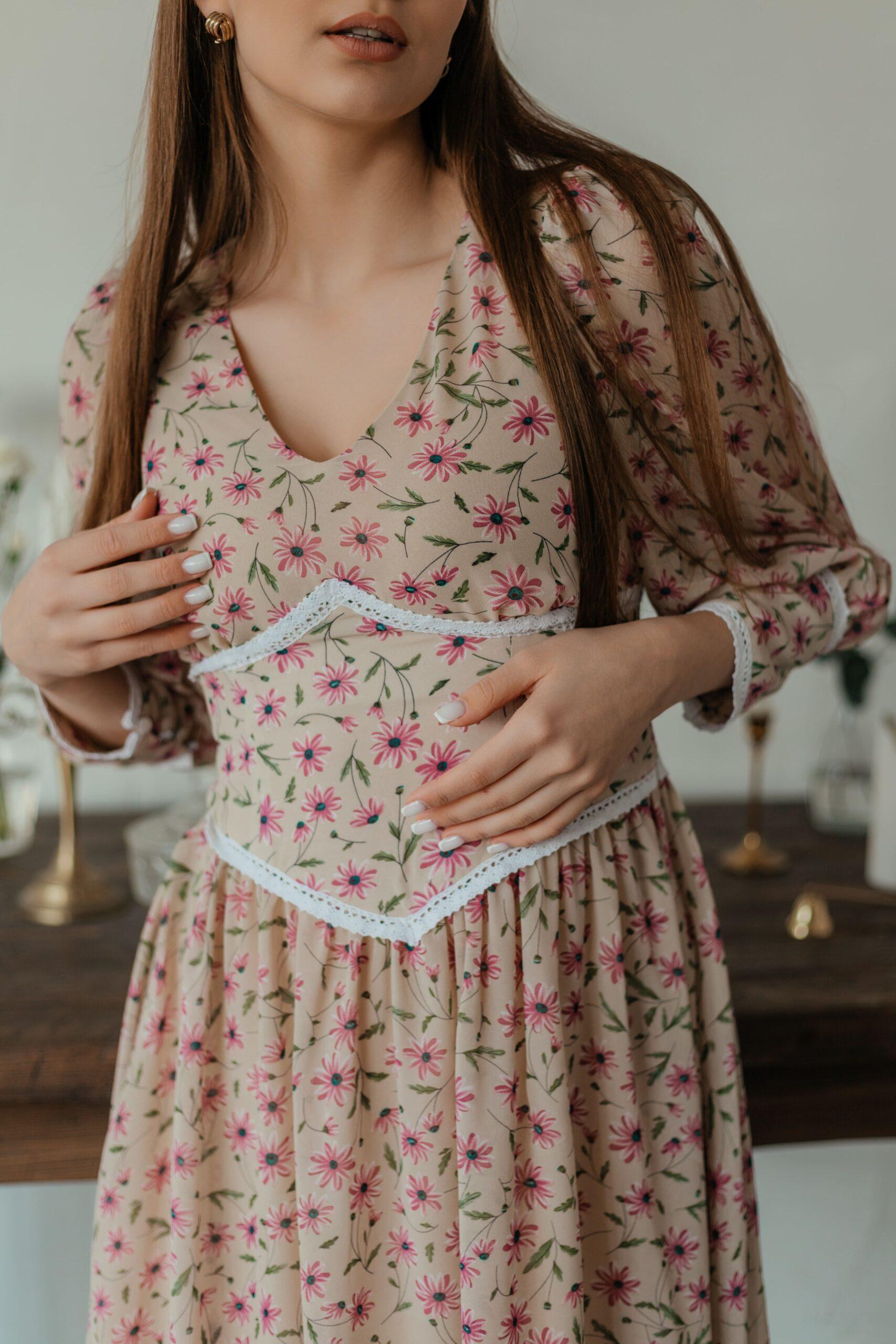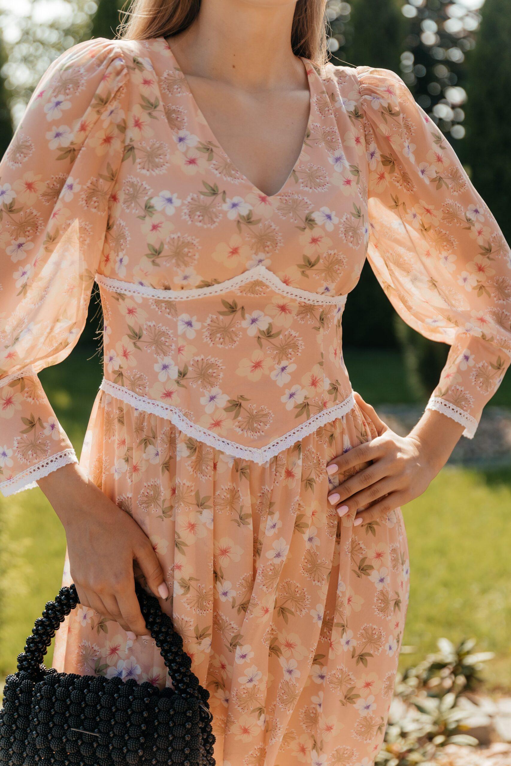 Платье женское, шифоновое, длины мини, с четвертным рукавом на высокой манжете. Модель легкая, воздушная, с V- образным вырезом, и отделкой из шитья в зоне талии.