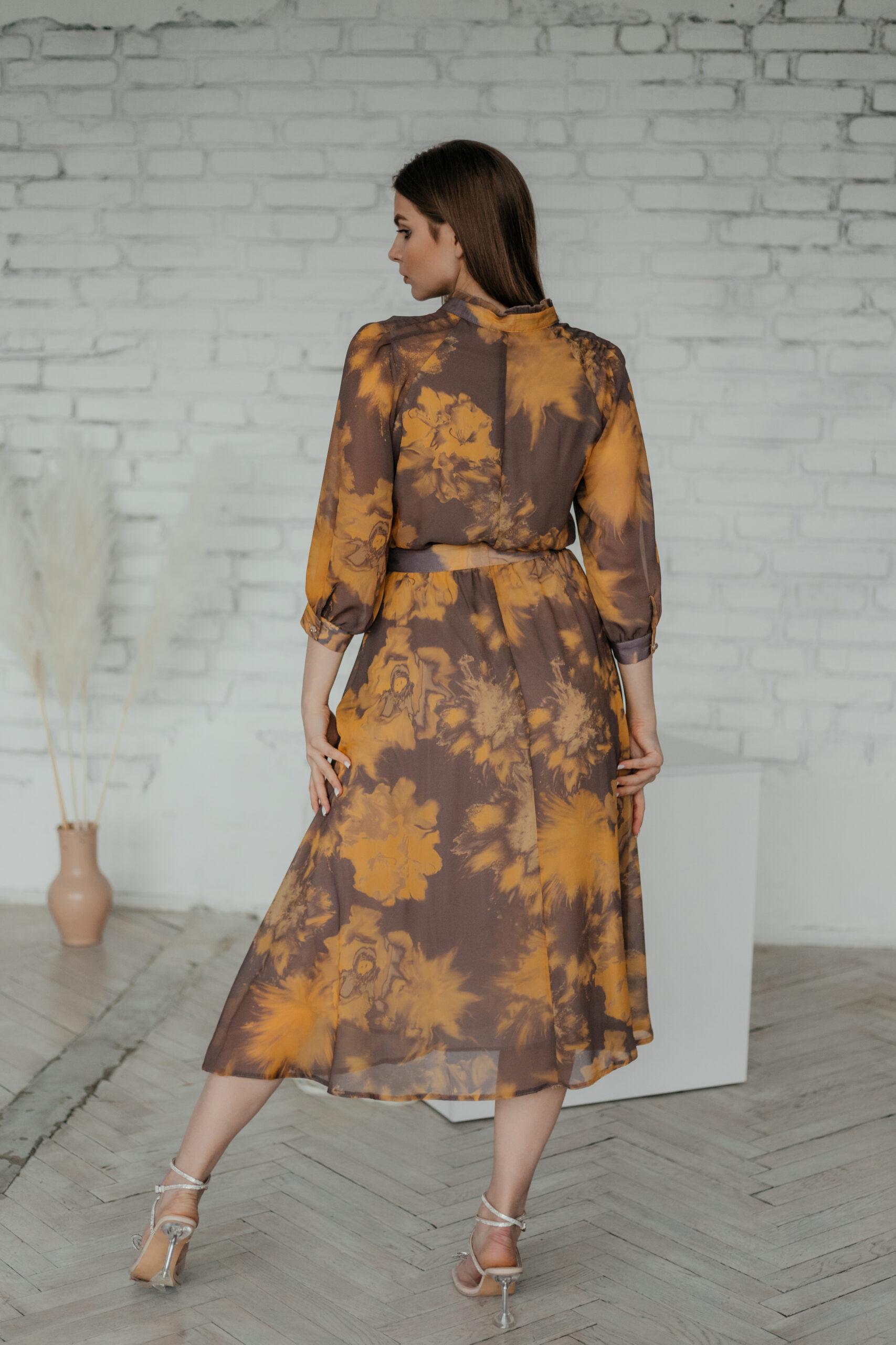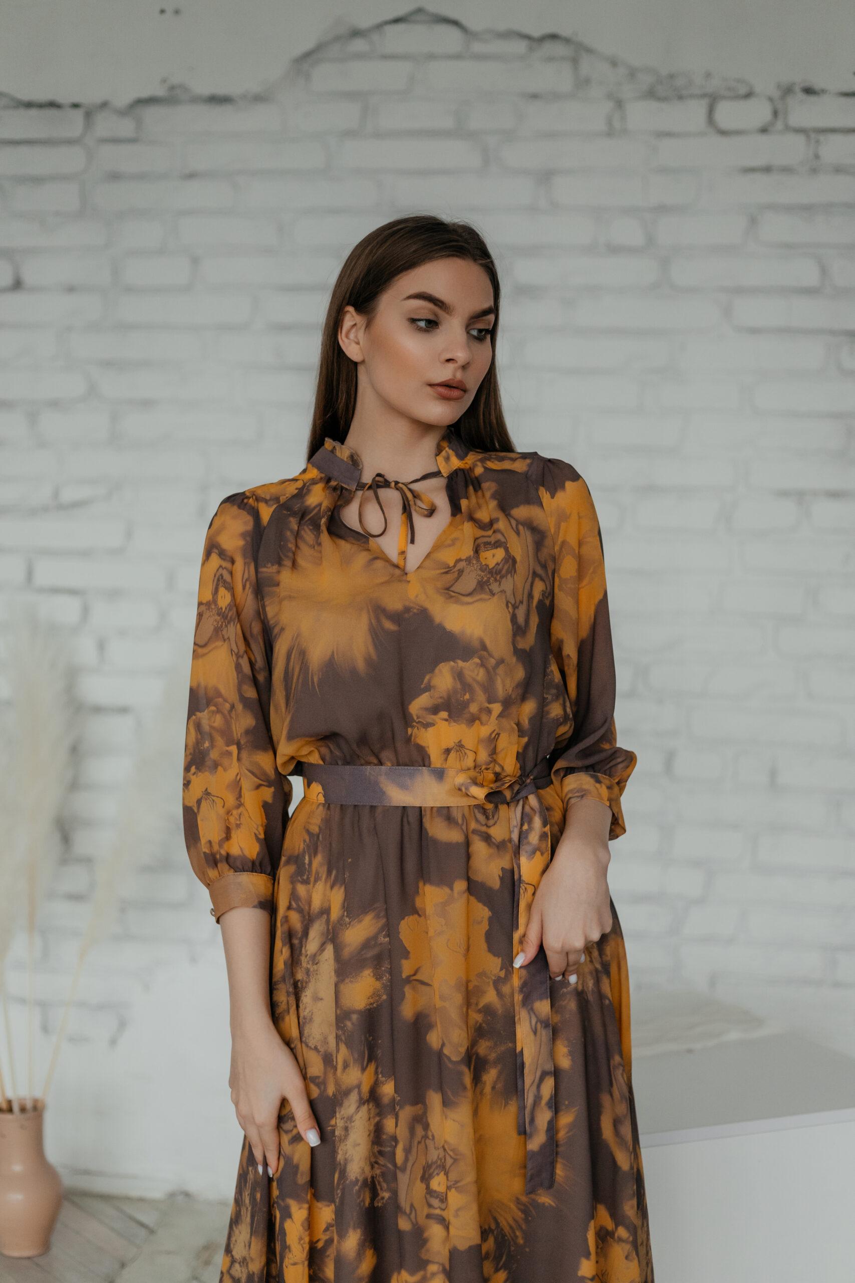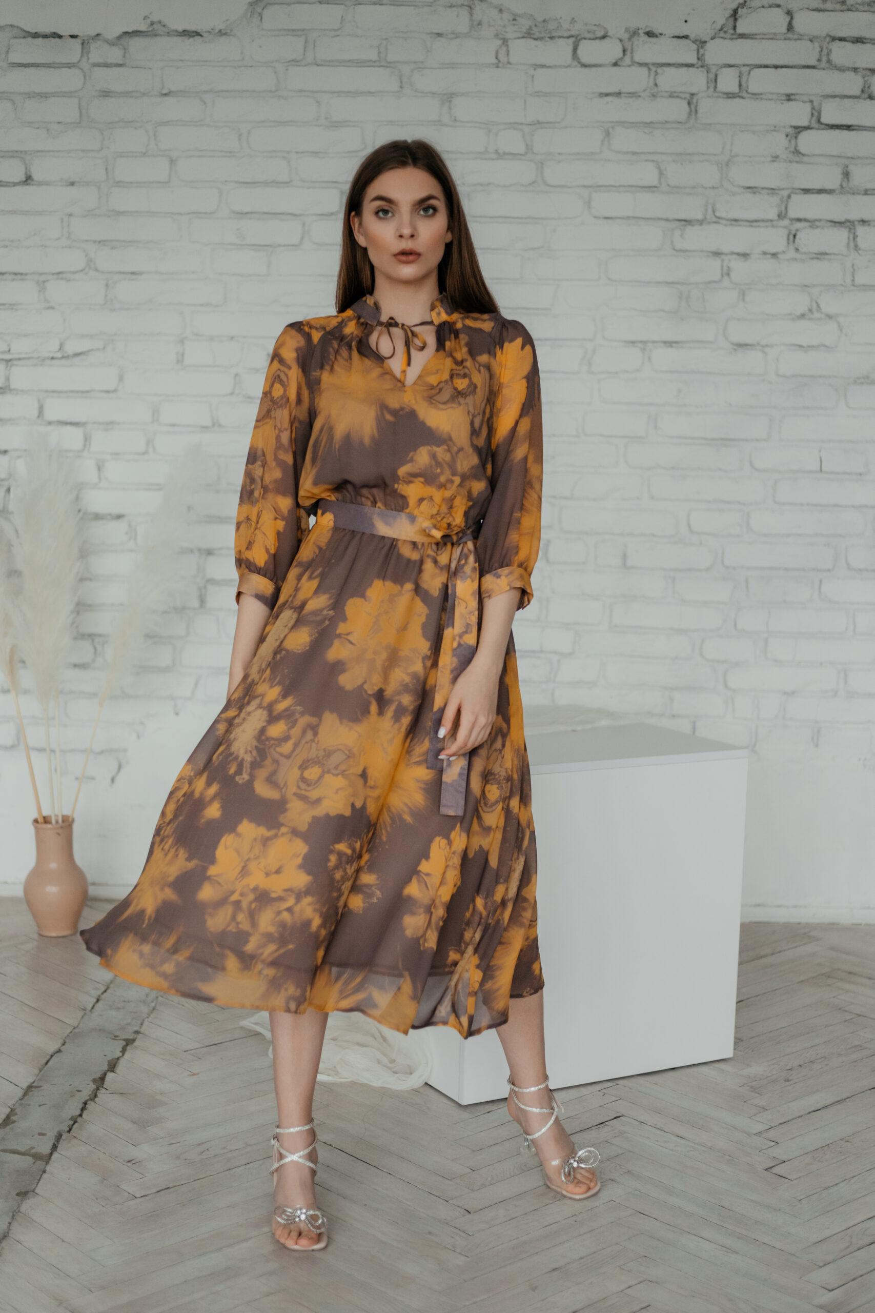 Платье женское, шифоновое. Модель длины миди, рукав свободный, три четверти с манжетами, горловина выполнена в виде стойки с невысокой и нежной рюшей, далее идет вырез капелька с завязками. В платье есть небольшой напуск и тканевый пояс.