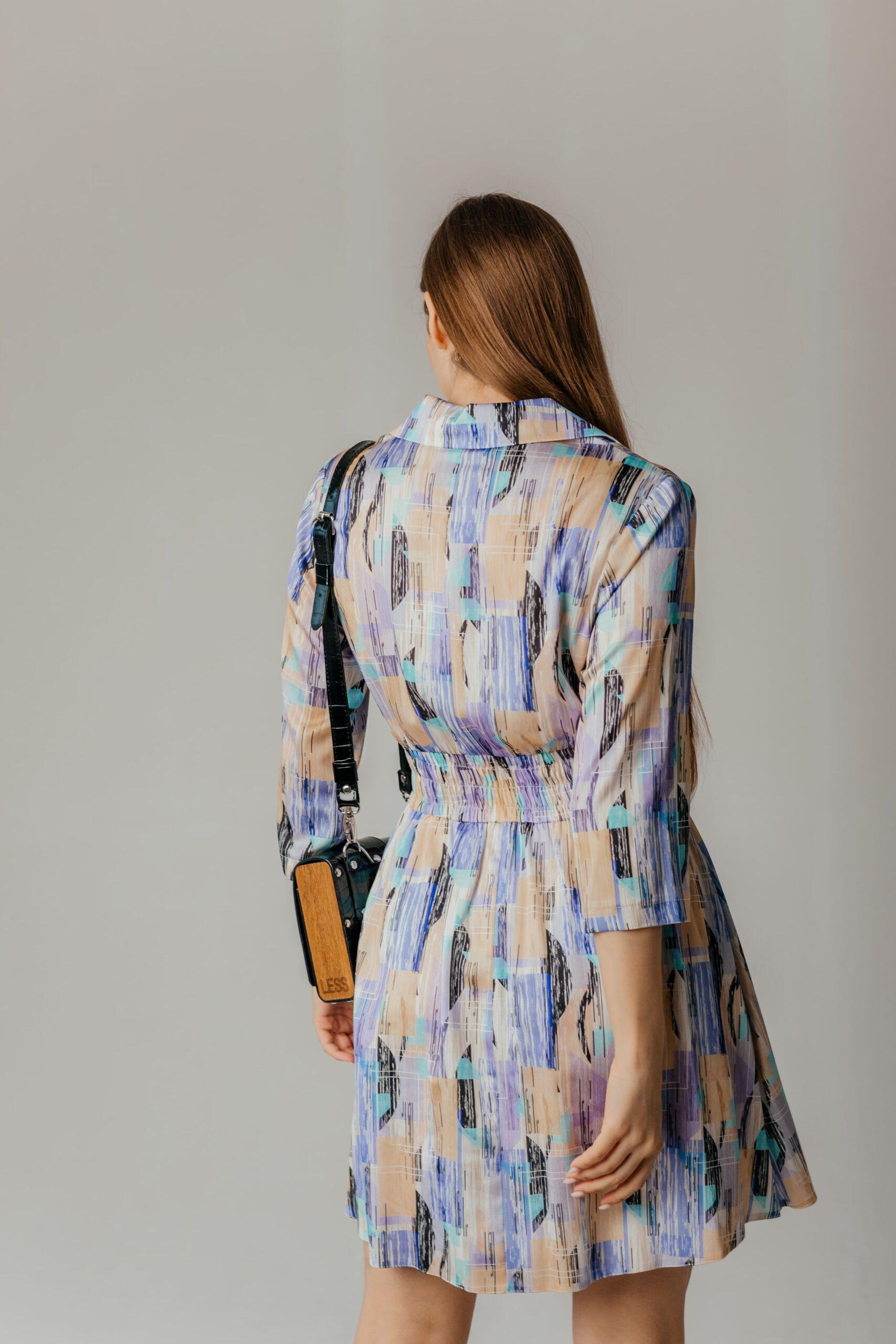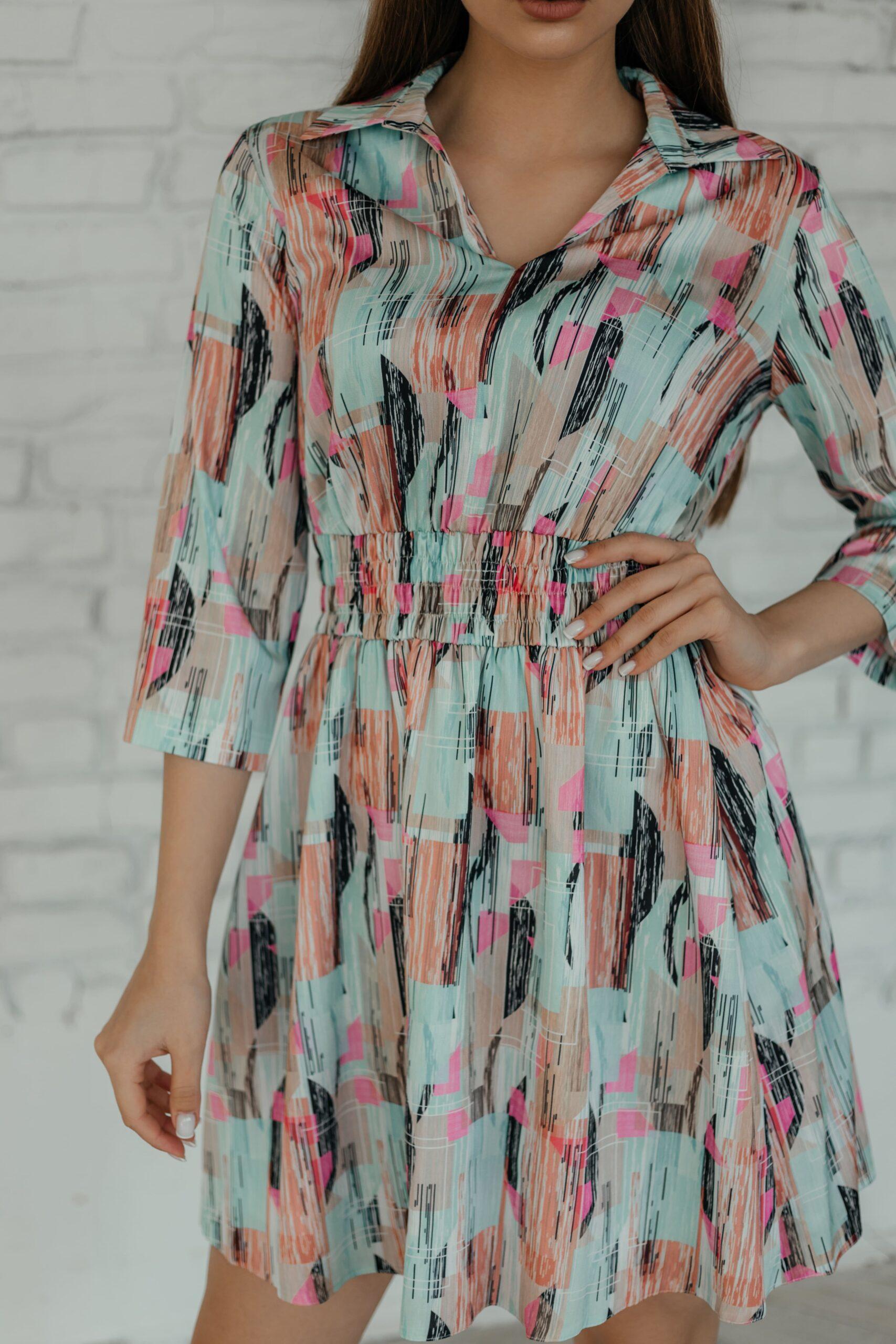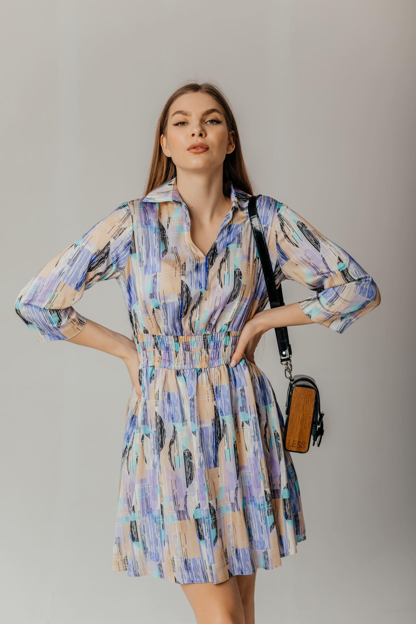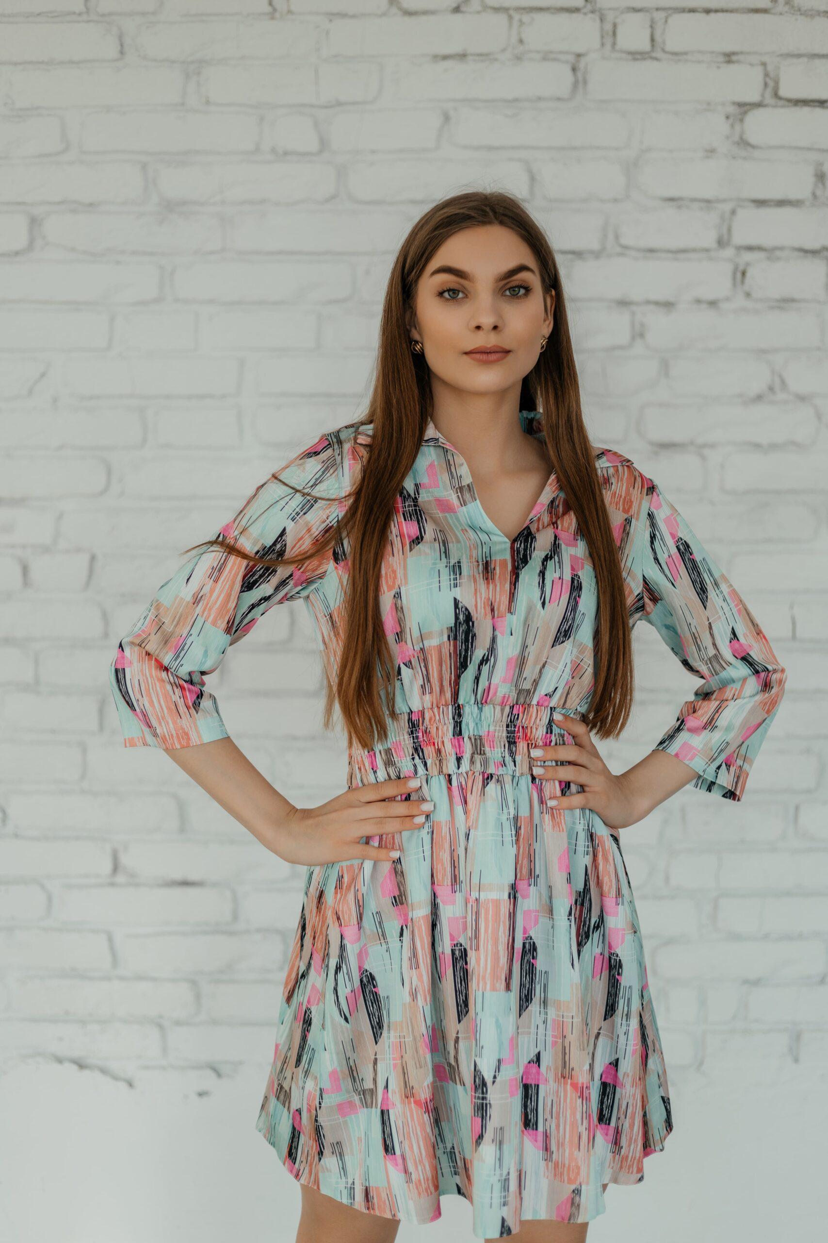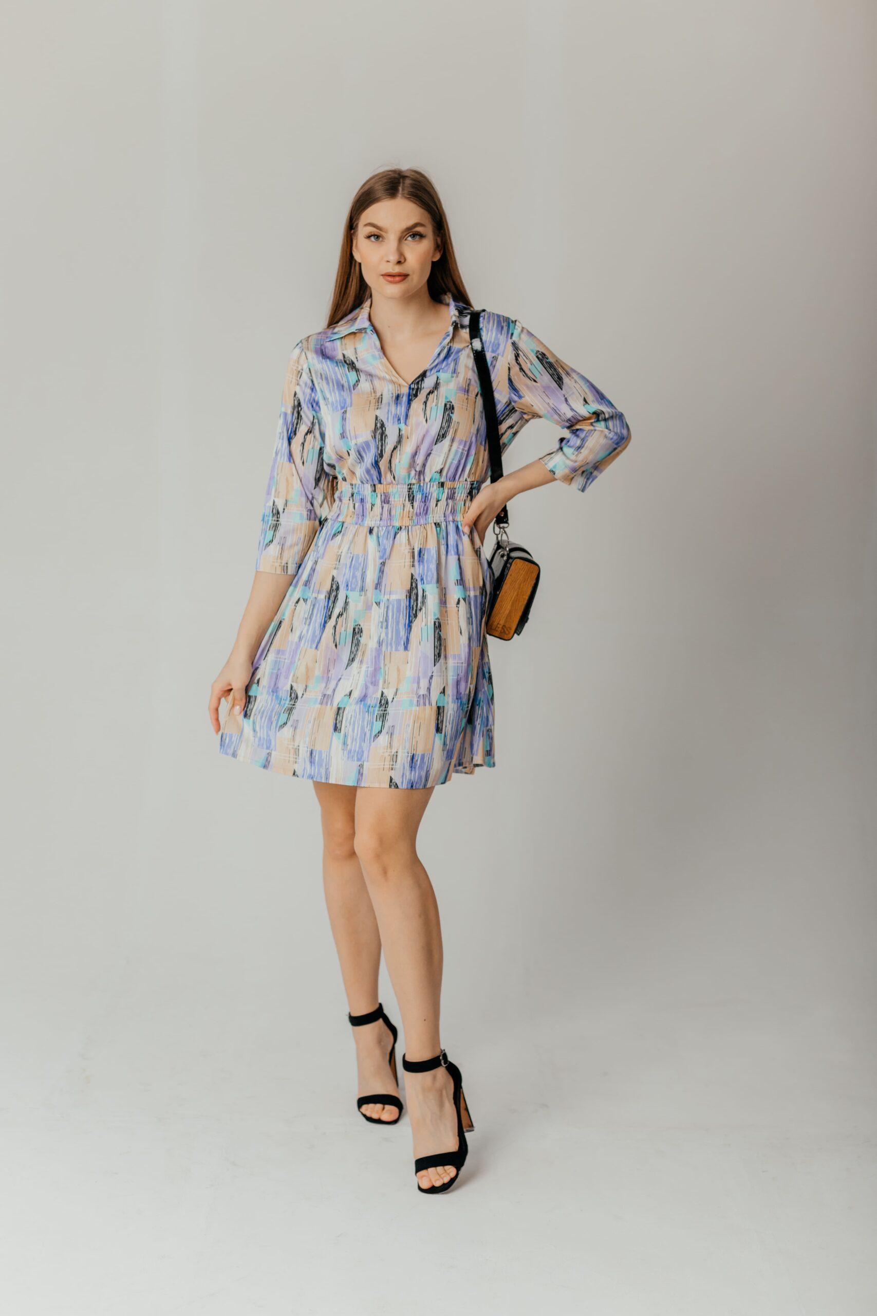 Платье женское, длины мини с четвертным рукавом, вырез V-образный с воротничком, на талии широкая резинка. Сверху над талией небольшой напуск.