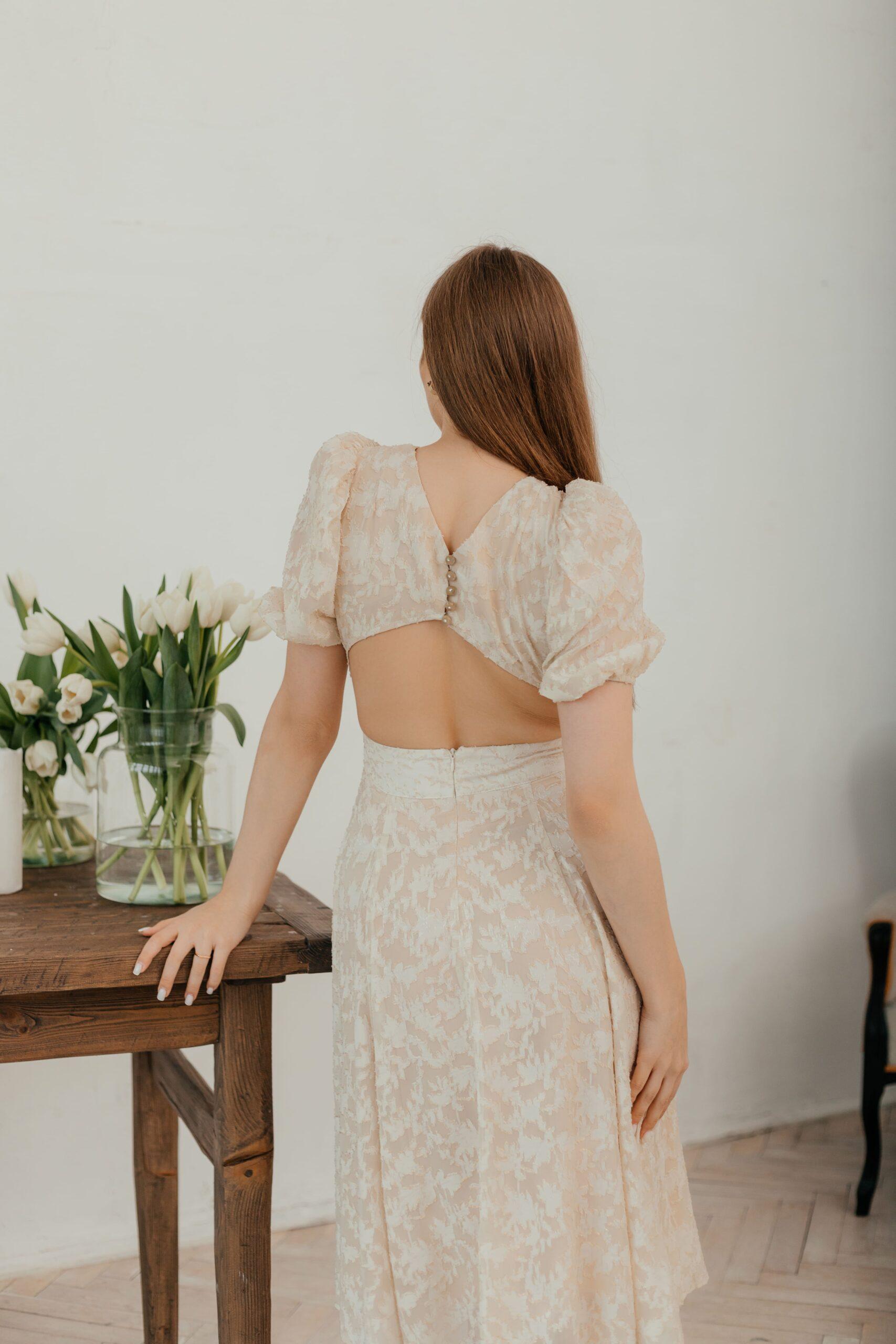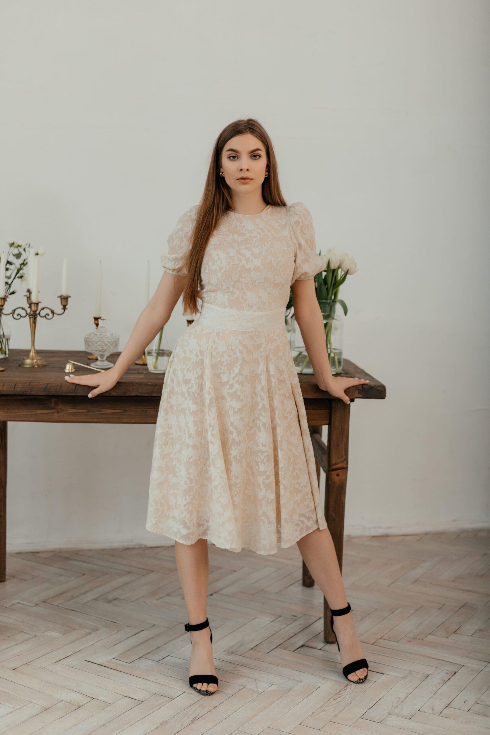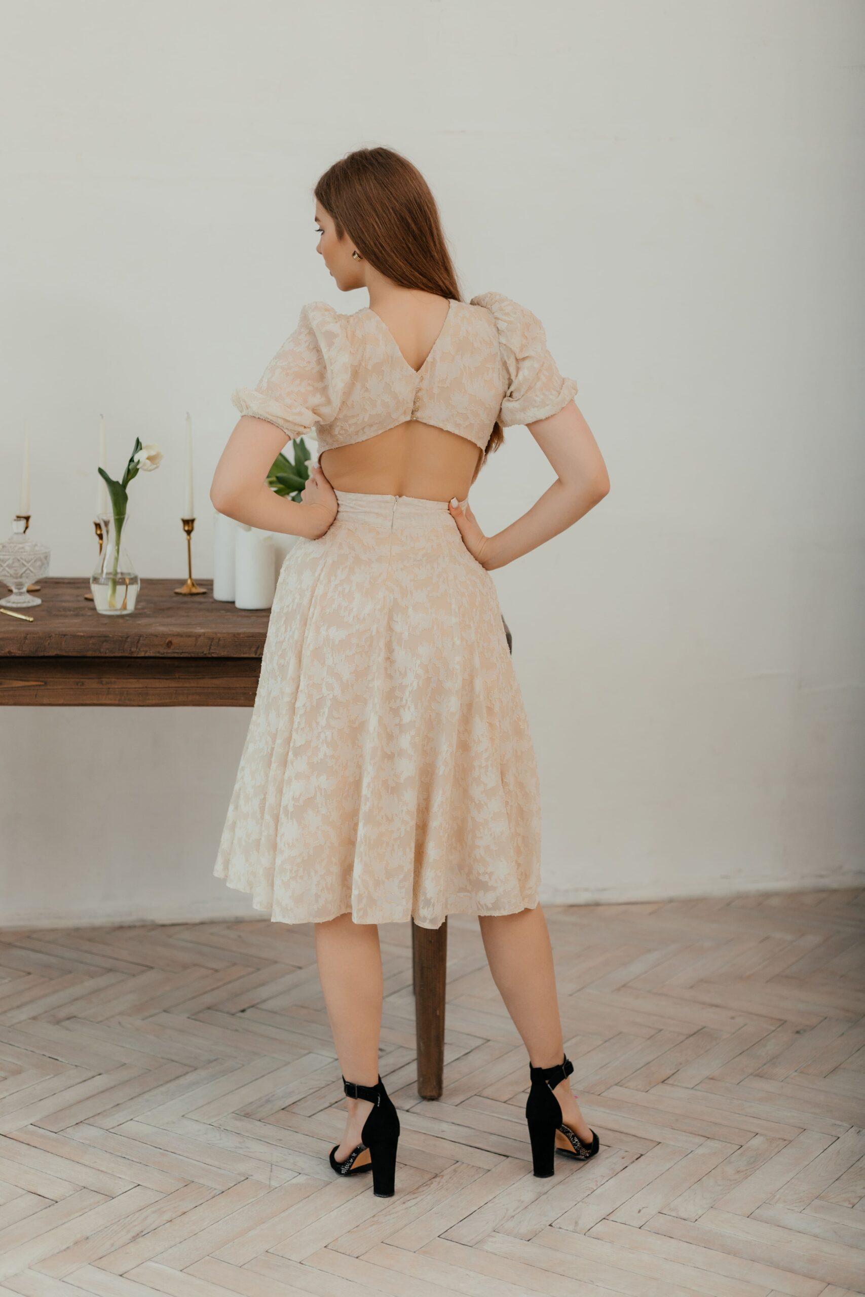 Платье женское, нарядное, длины миди, рукав короткий на резинке. Модель красиво подчеркивает талию. Состав: