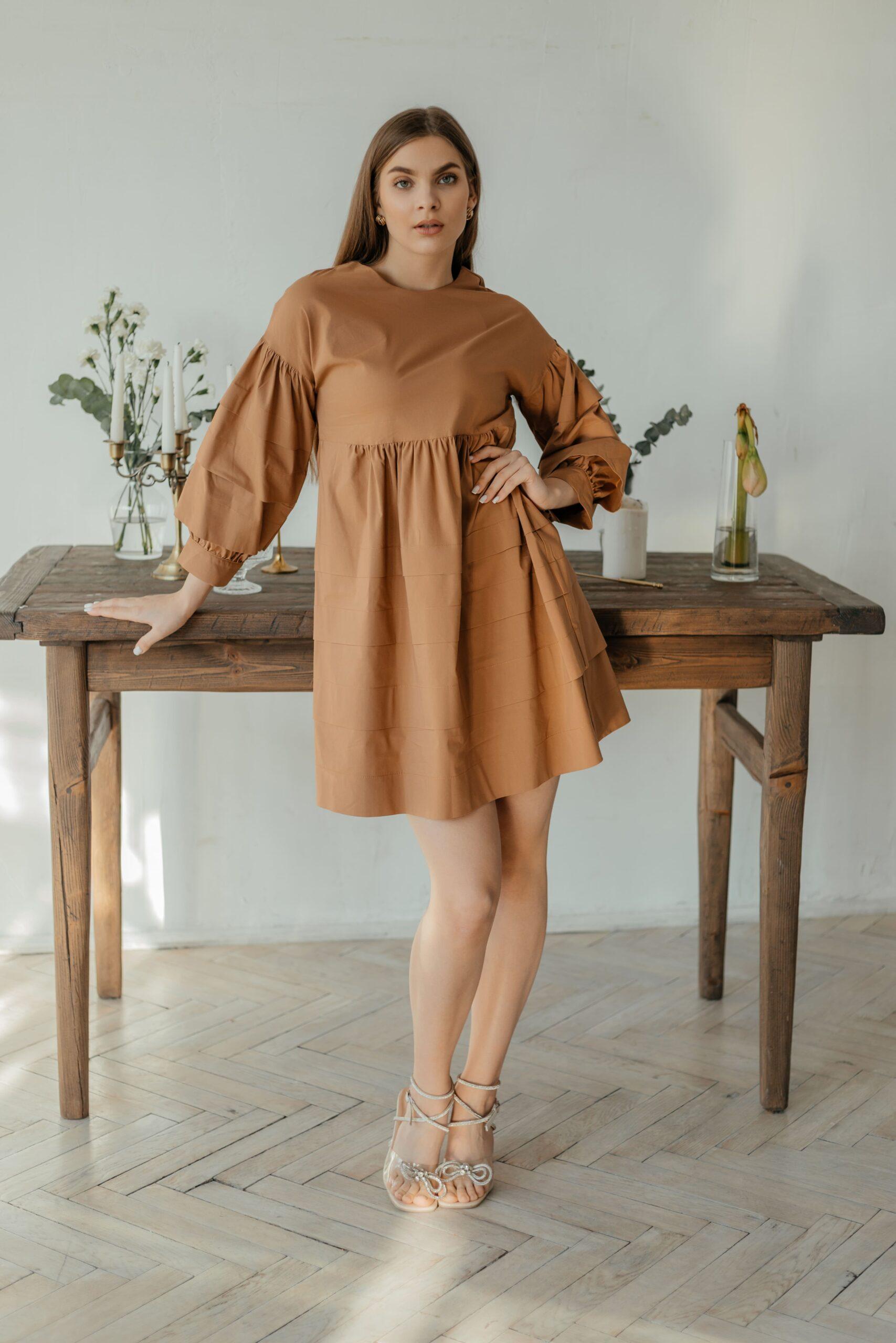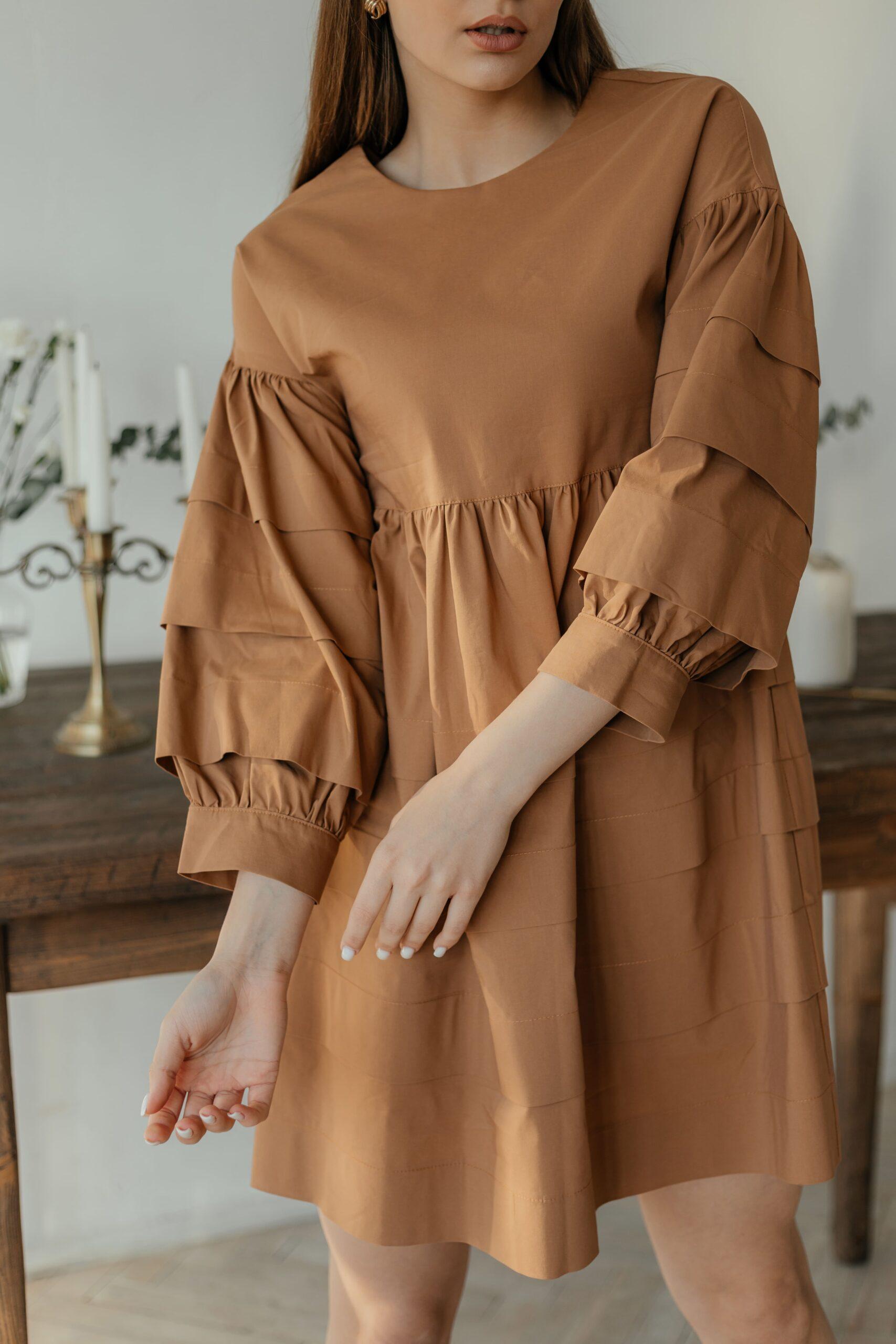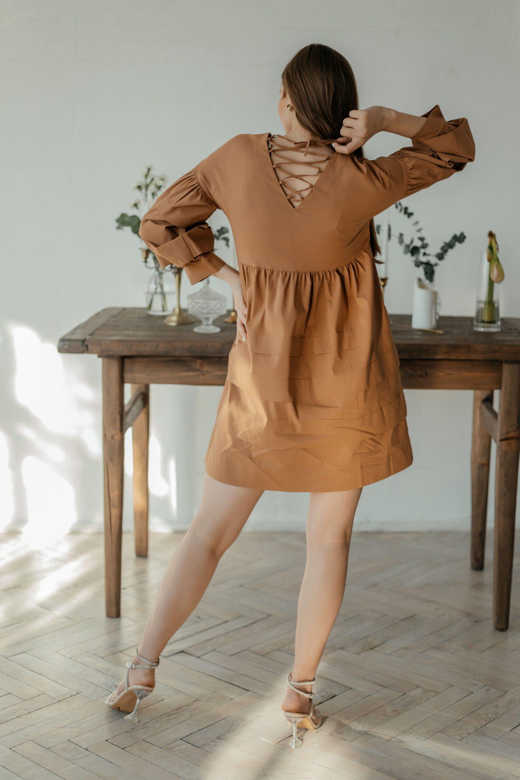Платье женское, молодежное, длины мини, с четвертным рукавом на манжете без пуговиц. Вырез неглубокий, на спине V-образный вырез на шнуровке. Платье и рукава выполнены в виде ярусов. Модель свободная, обьемная.