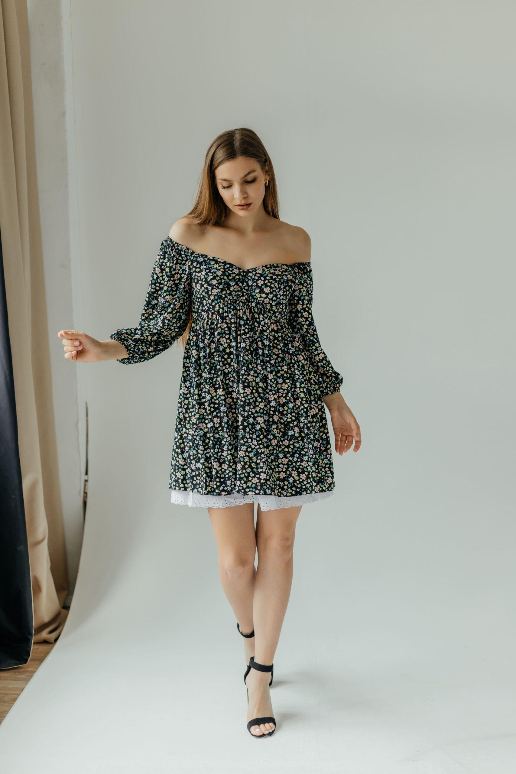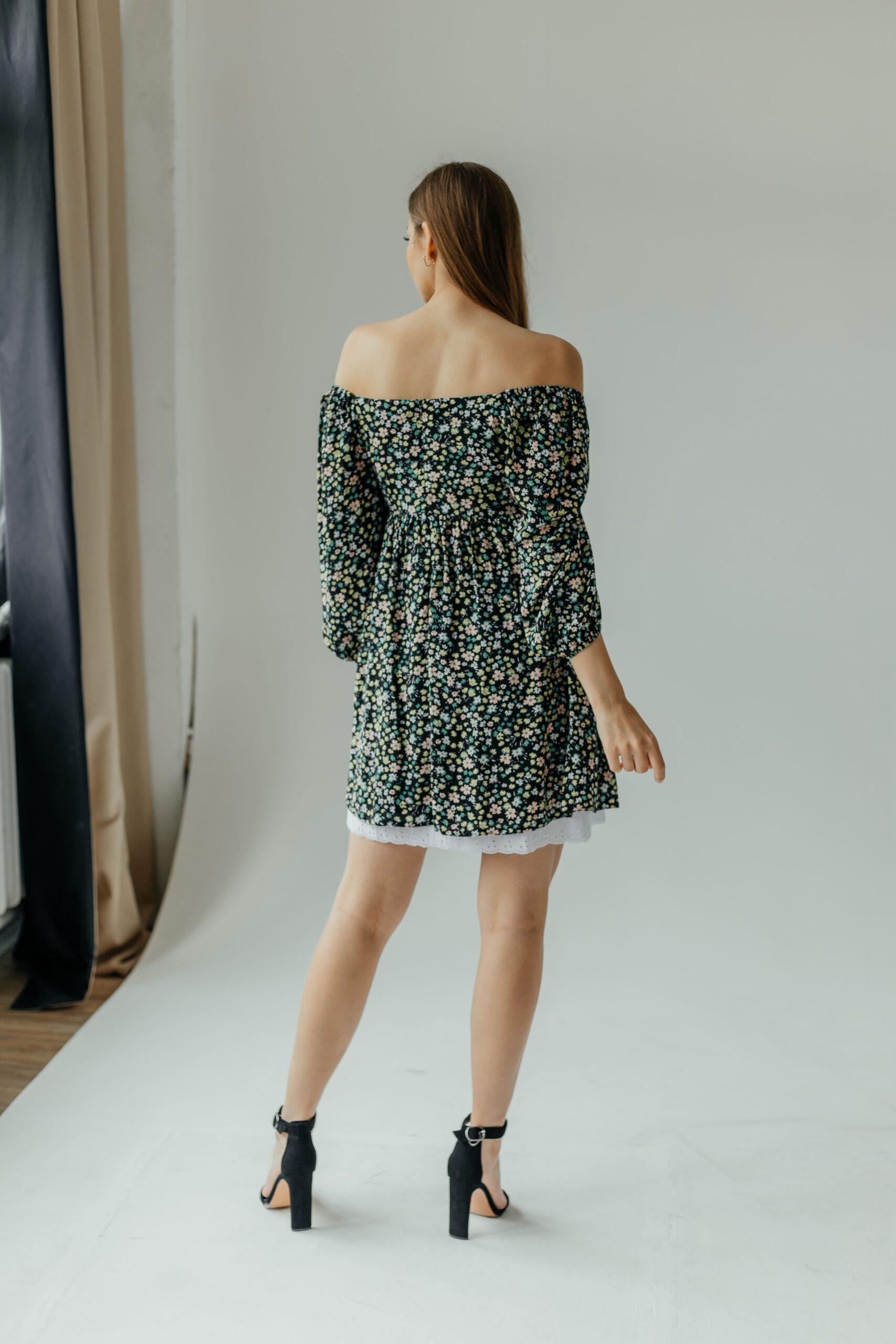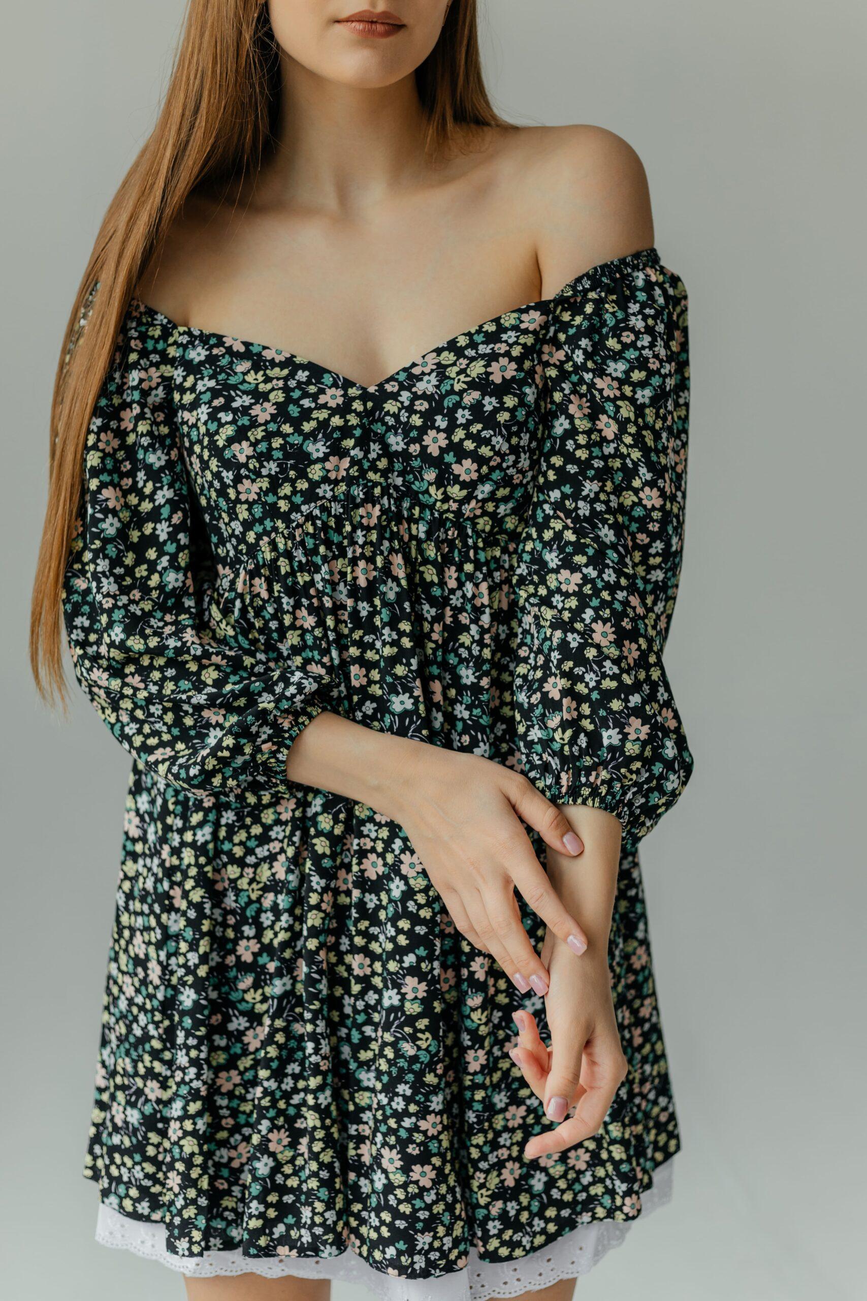 Платье женское, длины мини, на подкладке, из хлопка с шитьем. Модель обьемная, с завышенной талией, на резинке. Рукав так же обьемный, широкий. В рукава сверху вставлена резинка, можно при желании оголить плечи. Состав: вискоза 75%, полиэстер 25%.