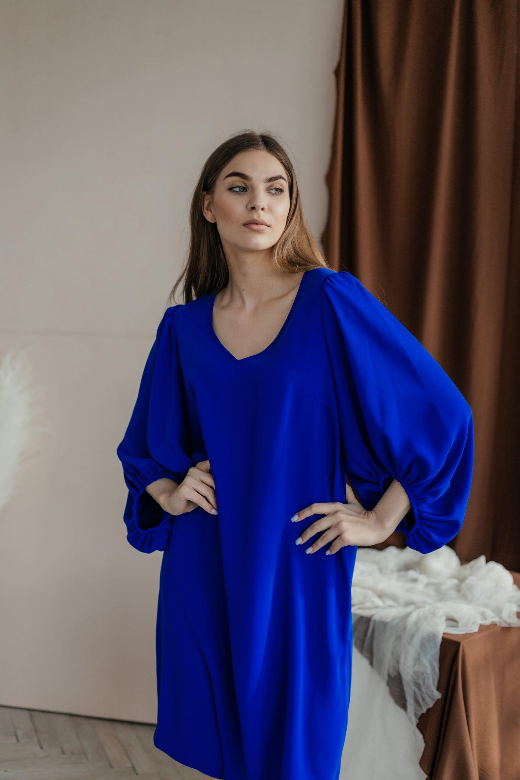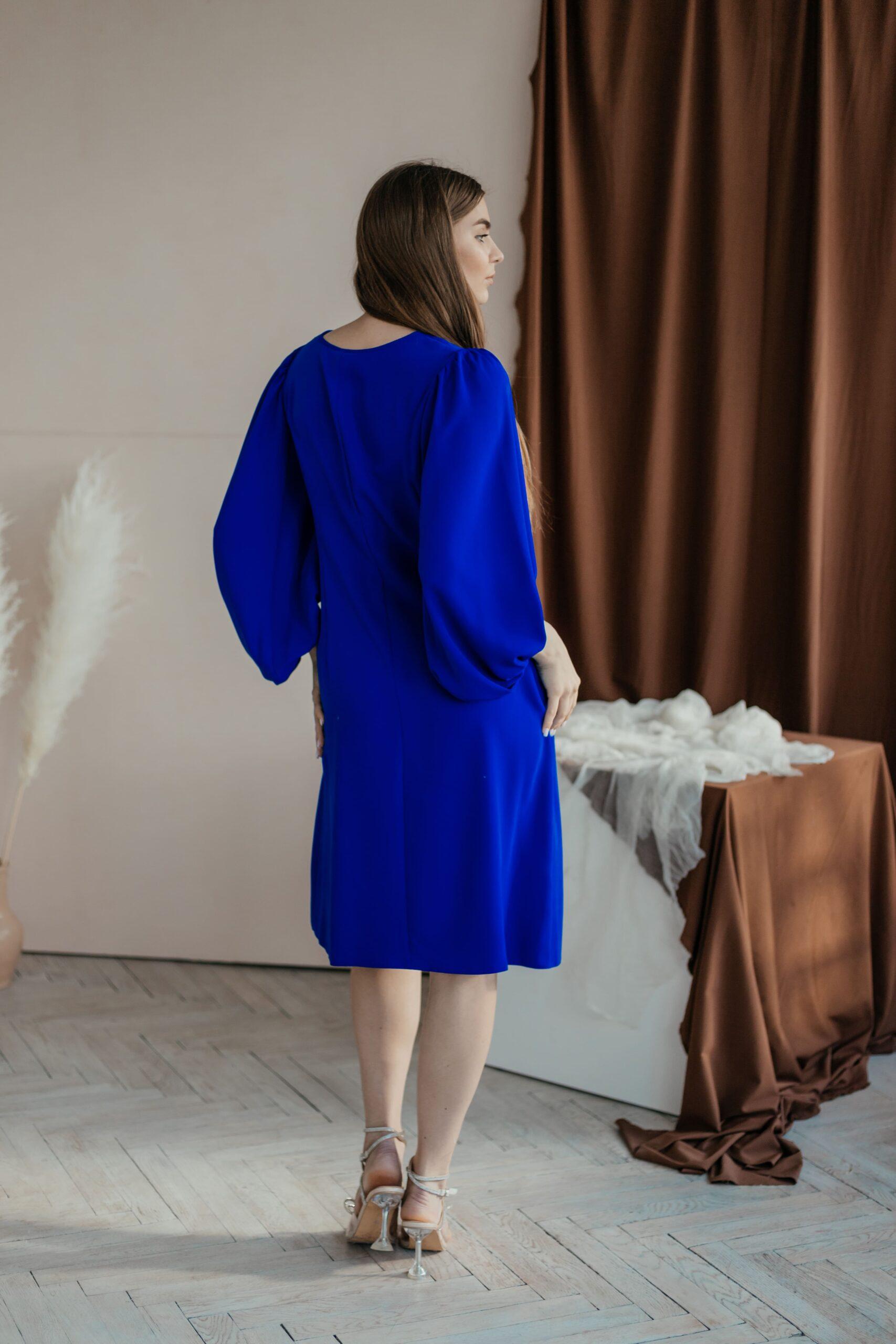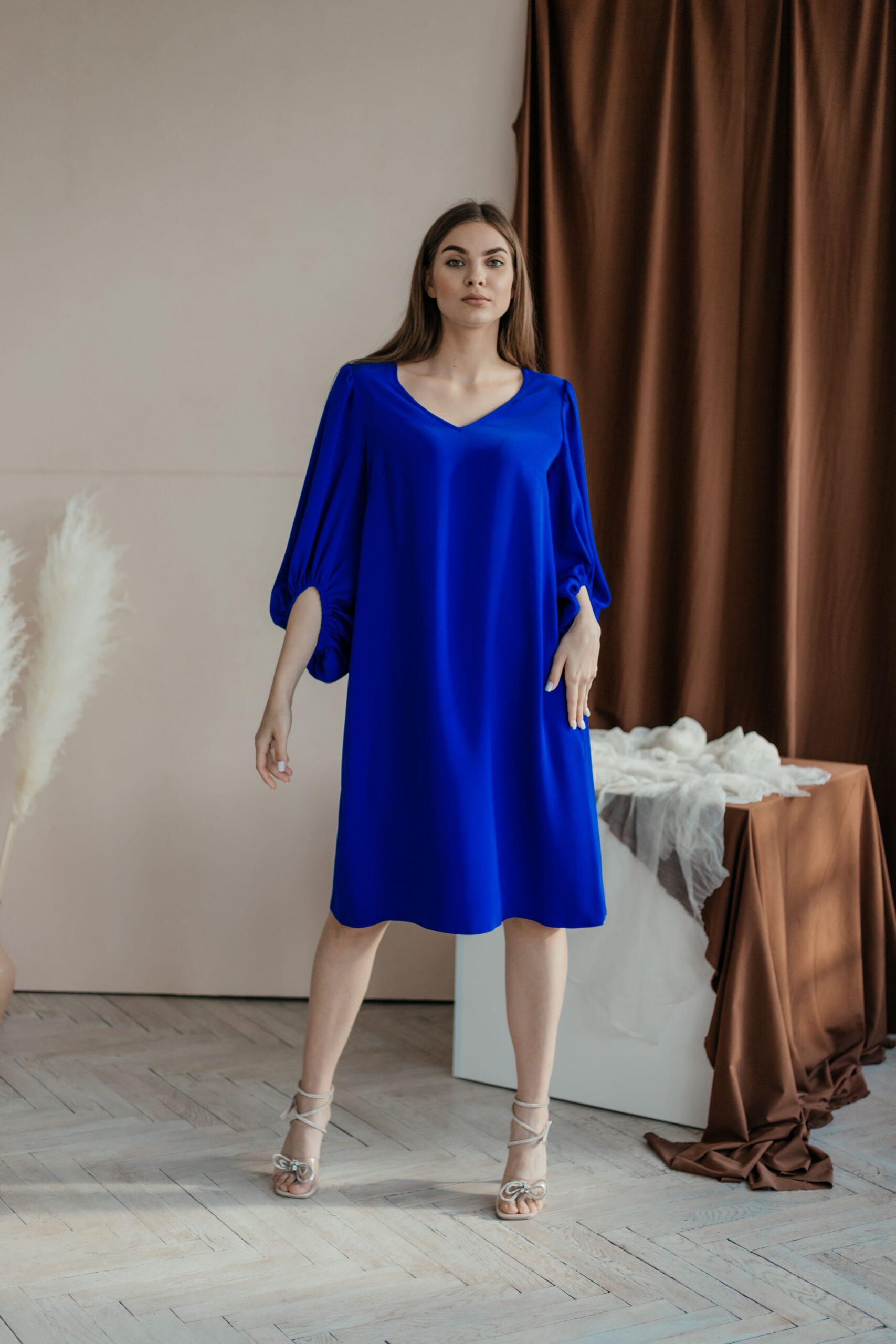 Платье женское, с красивым обьемным рукавом на резинке. Модель свободного кроя, с V-вырезом и длины середина колена.