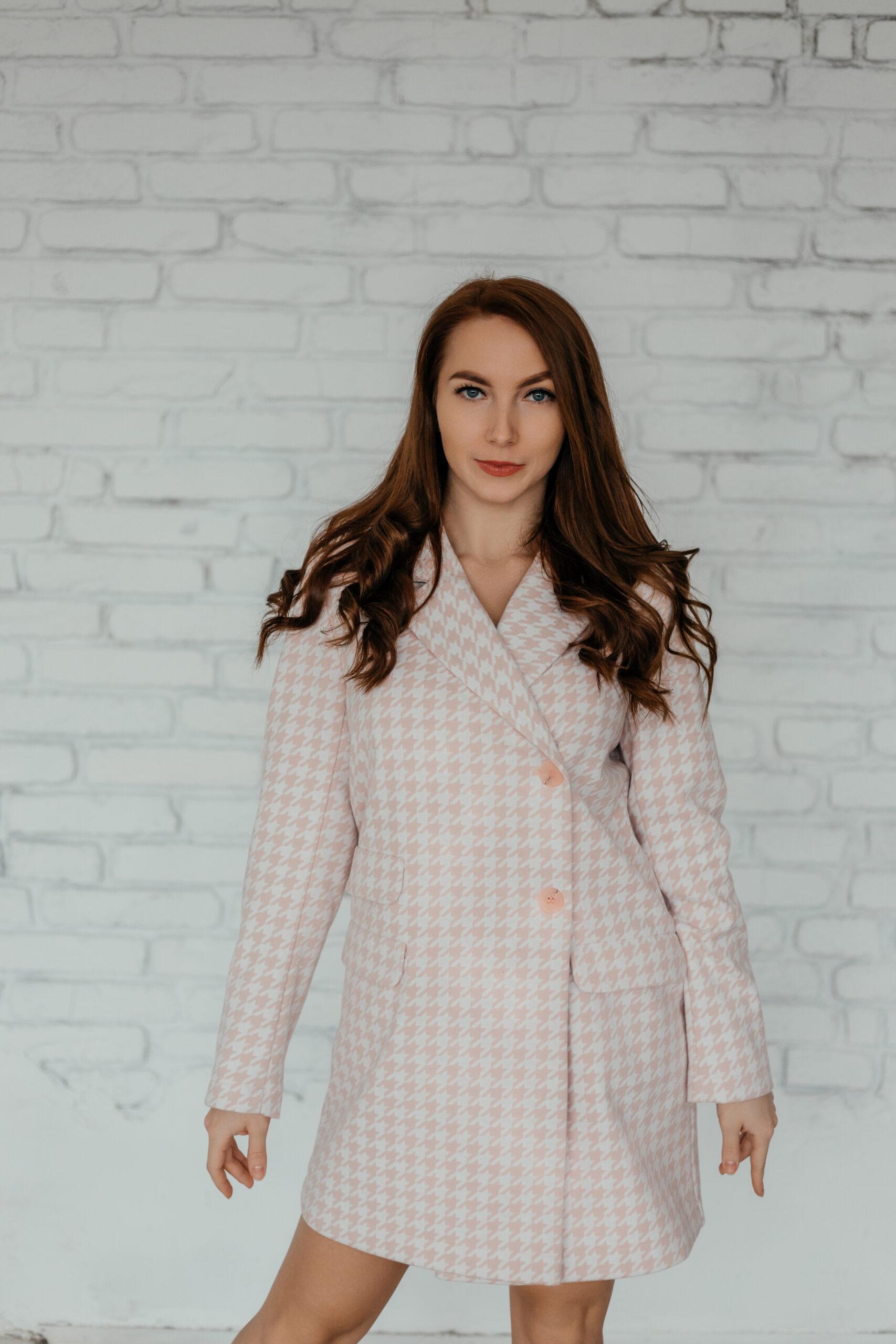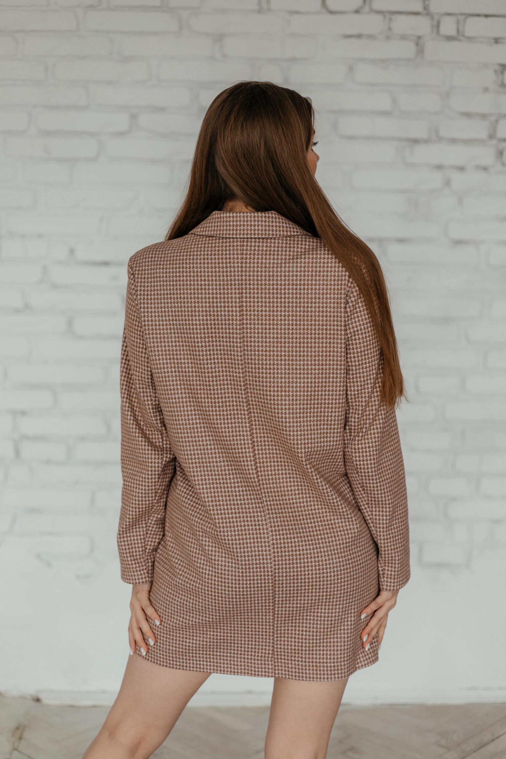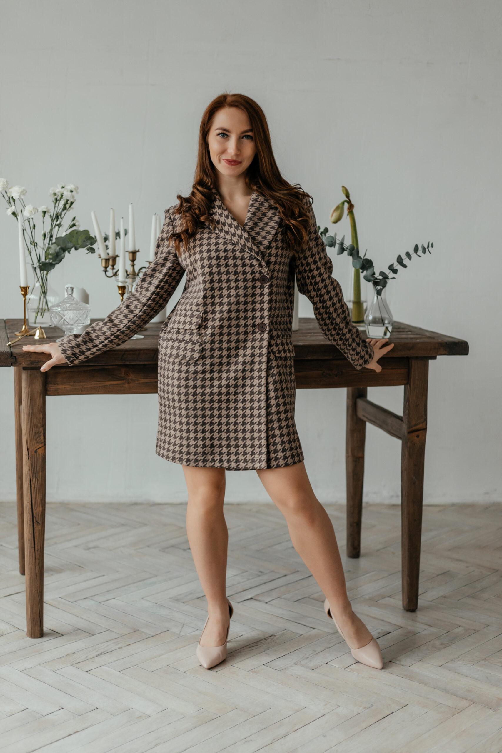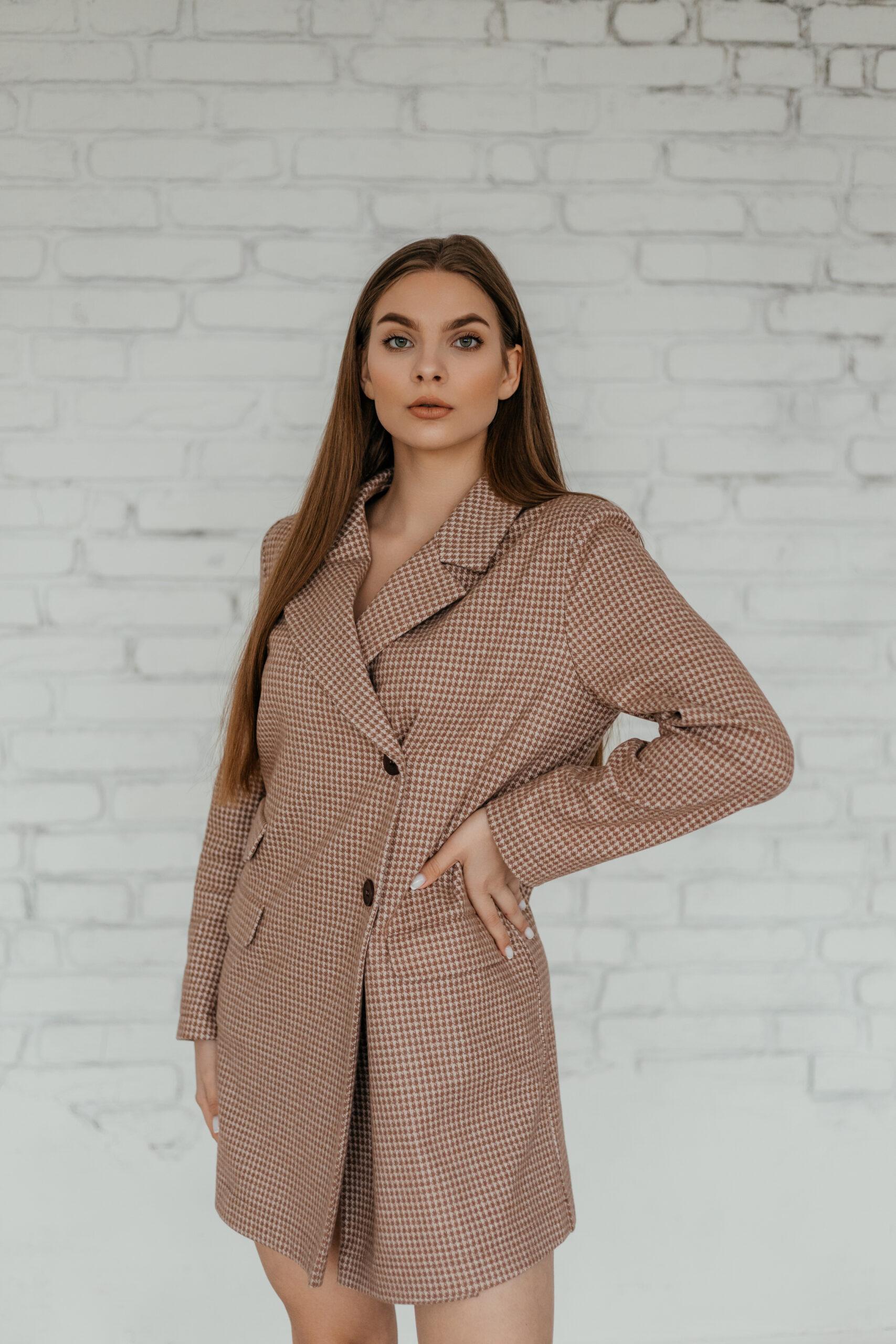 Платье-жакет из тонкого драпа. Модель в стиле овер-сайз с длинным рукавом на запах на двух пуговицах. В платье три кармана.