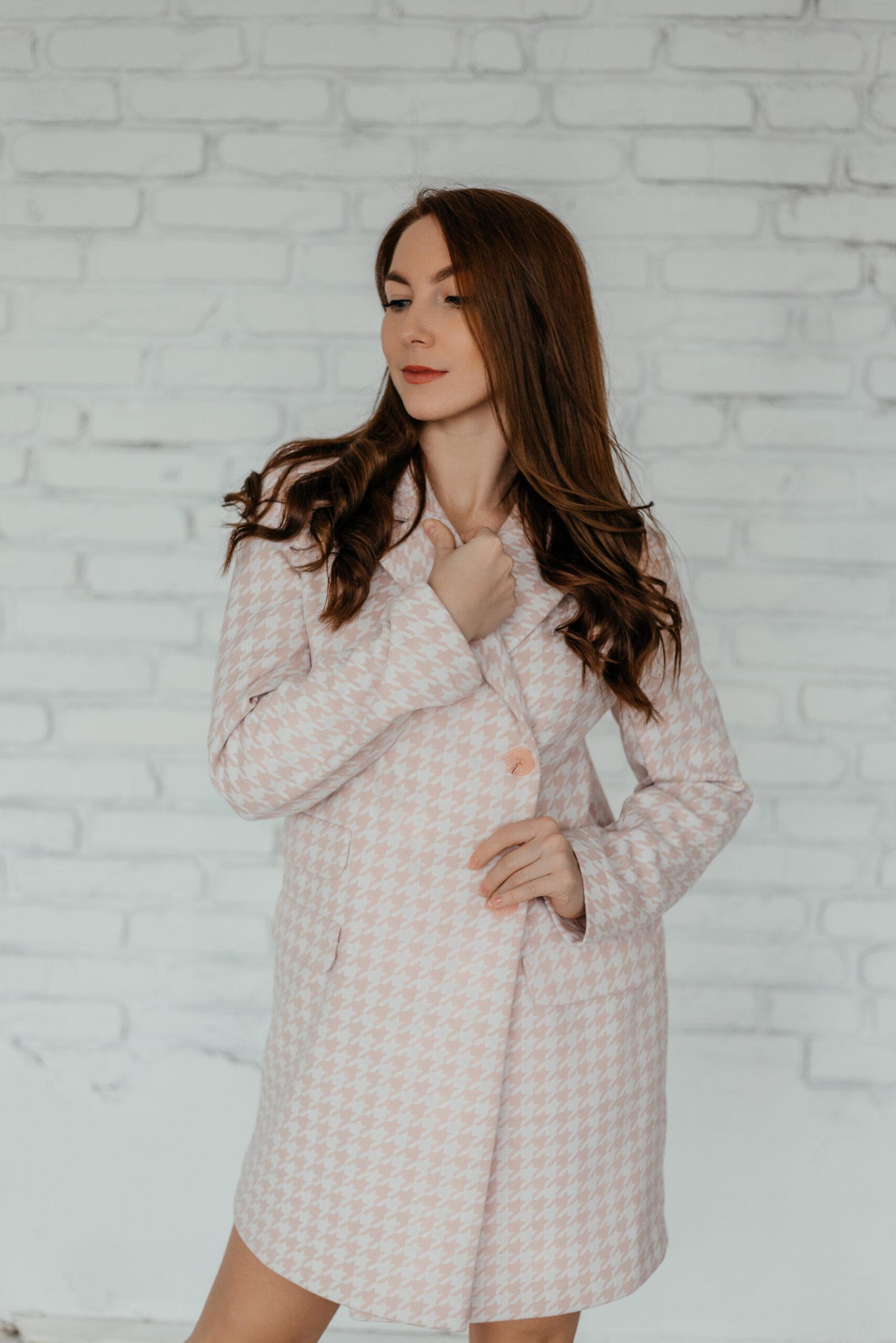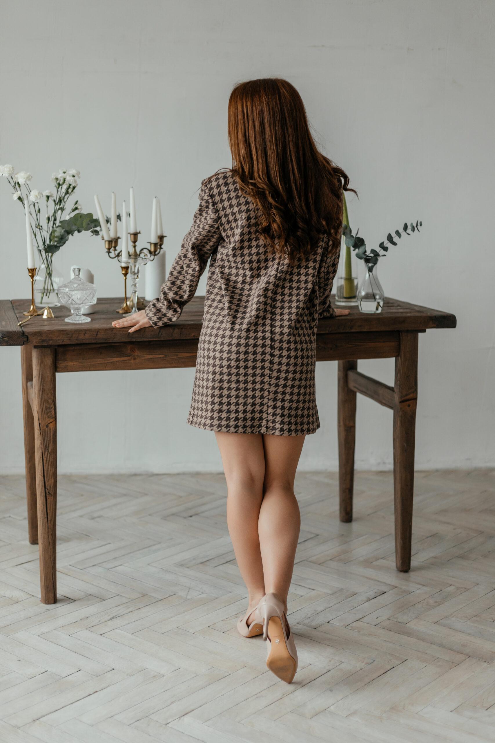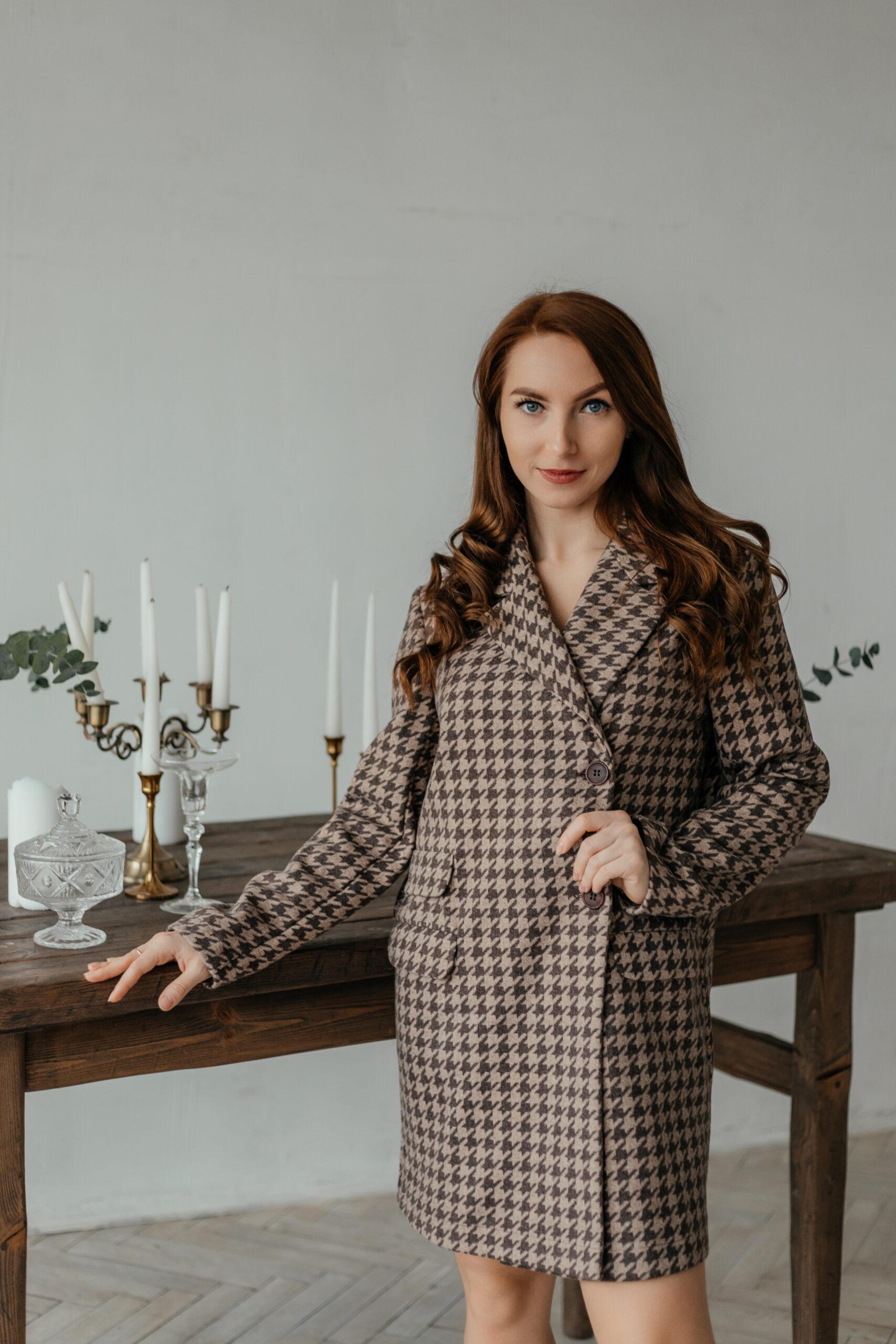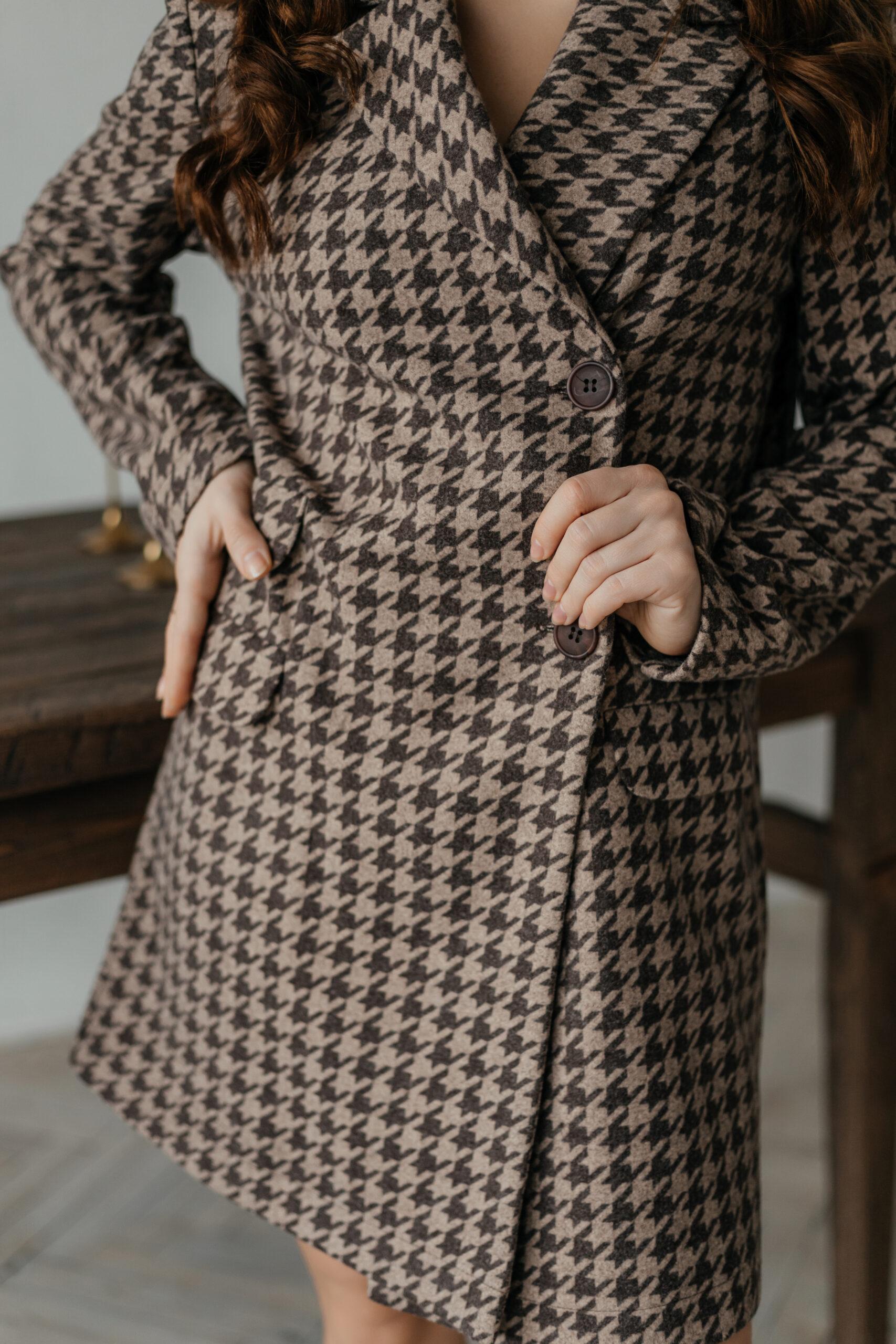 Платье-жакет из тонкого драпа. Модель в стиле овер-сайз с длинным рукавом на запах на двух пуговицах. В платье три кармана.