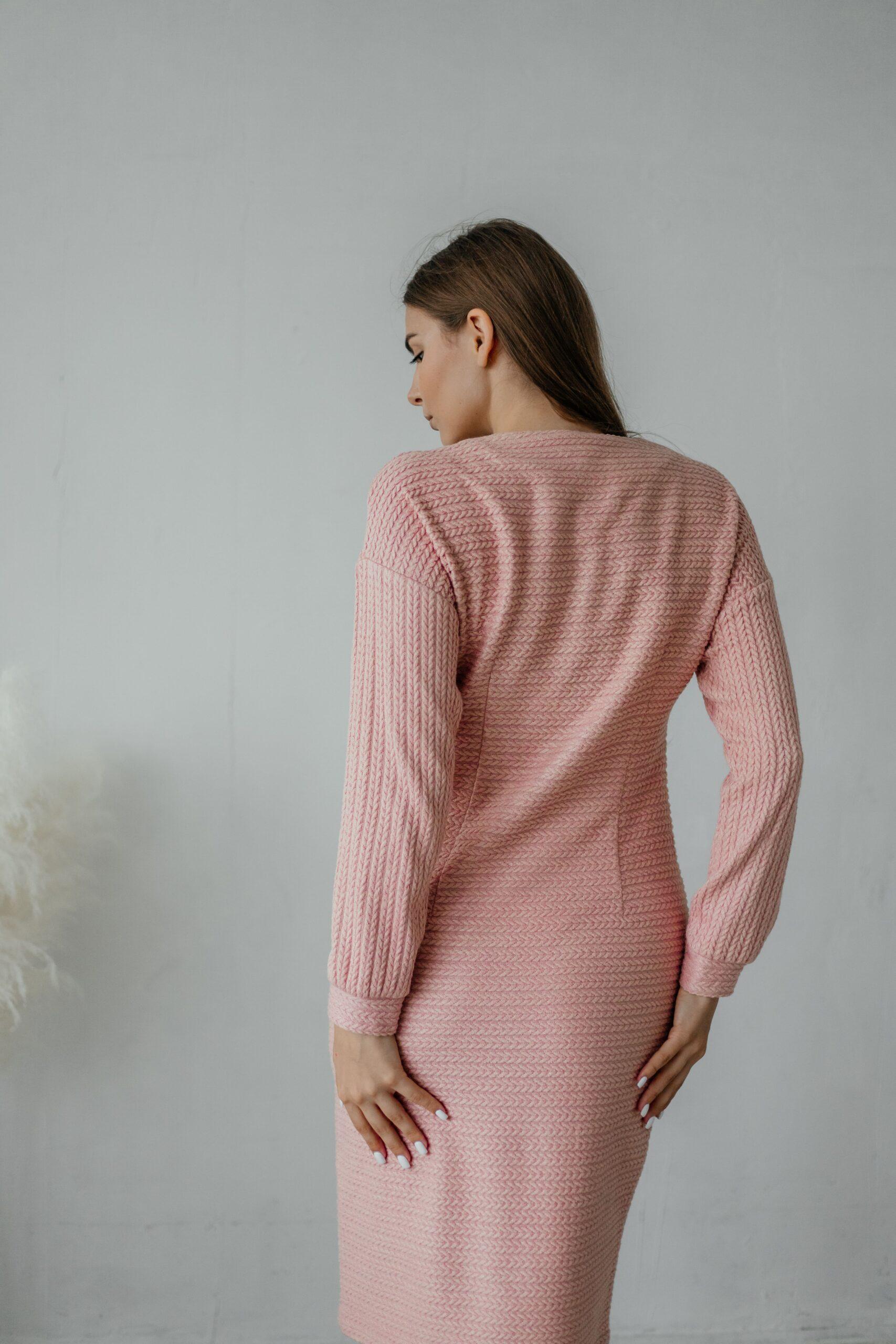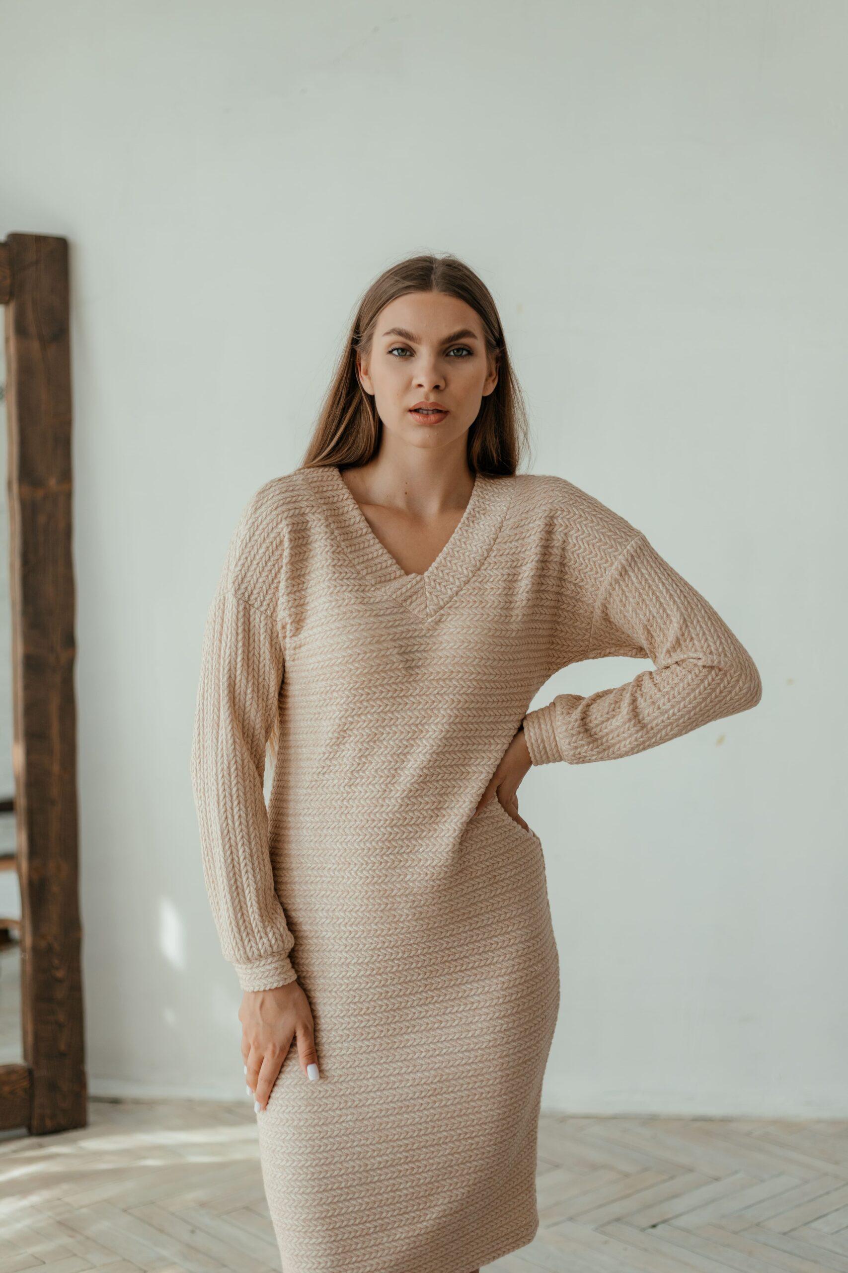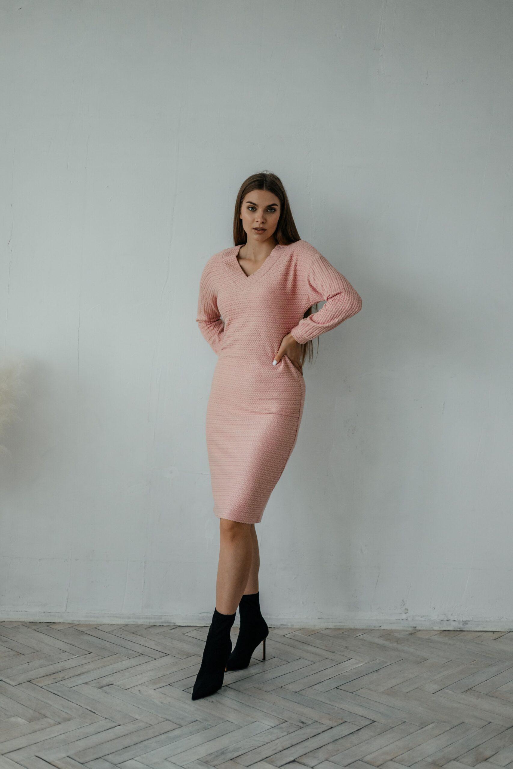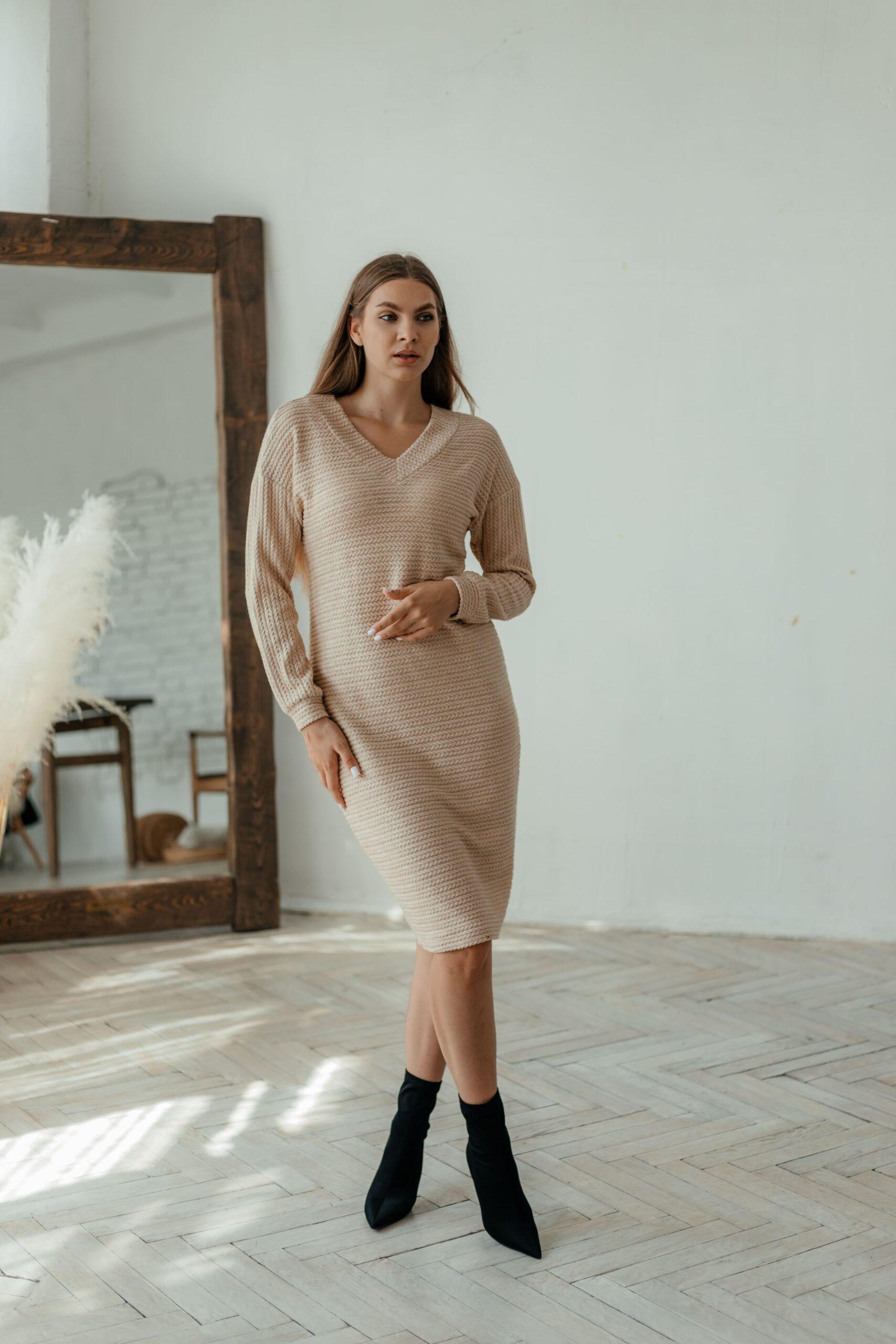 Платье женское, трикотажное. Модель с длинным, спущенным рукавом на тканевом мажете. Платье в миди длине с v-образным вырезом.
