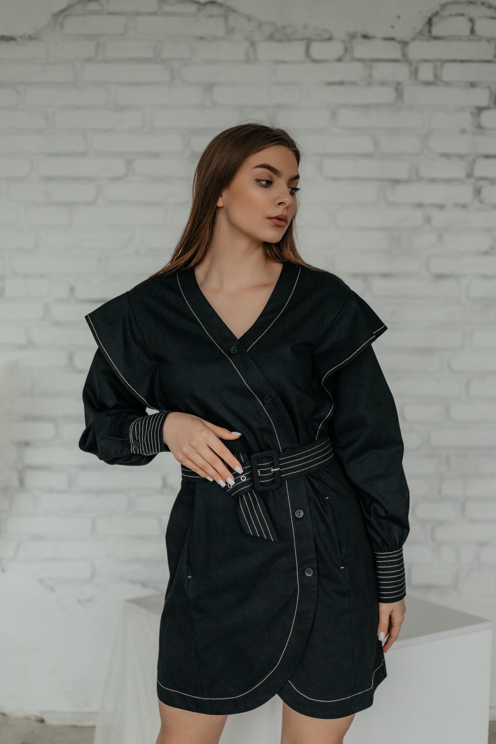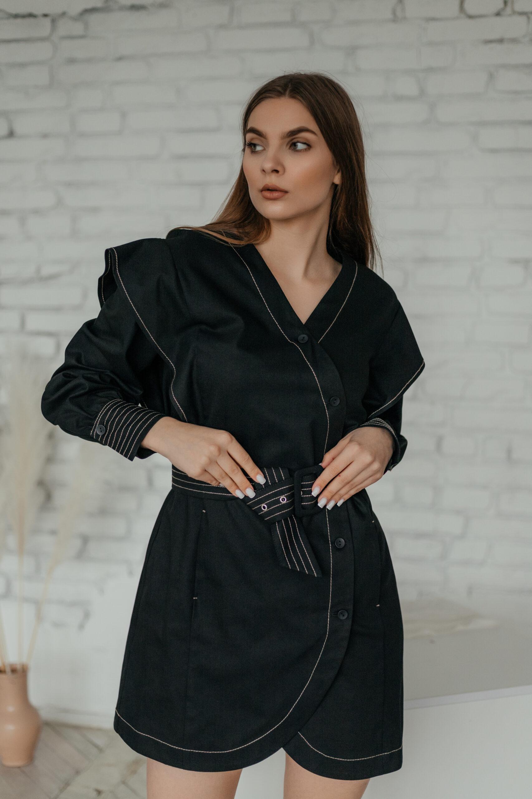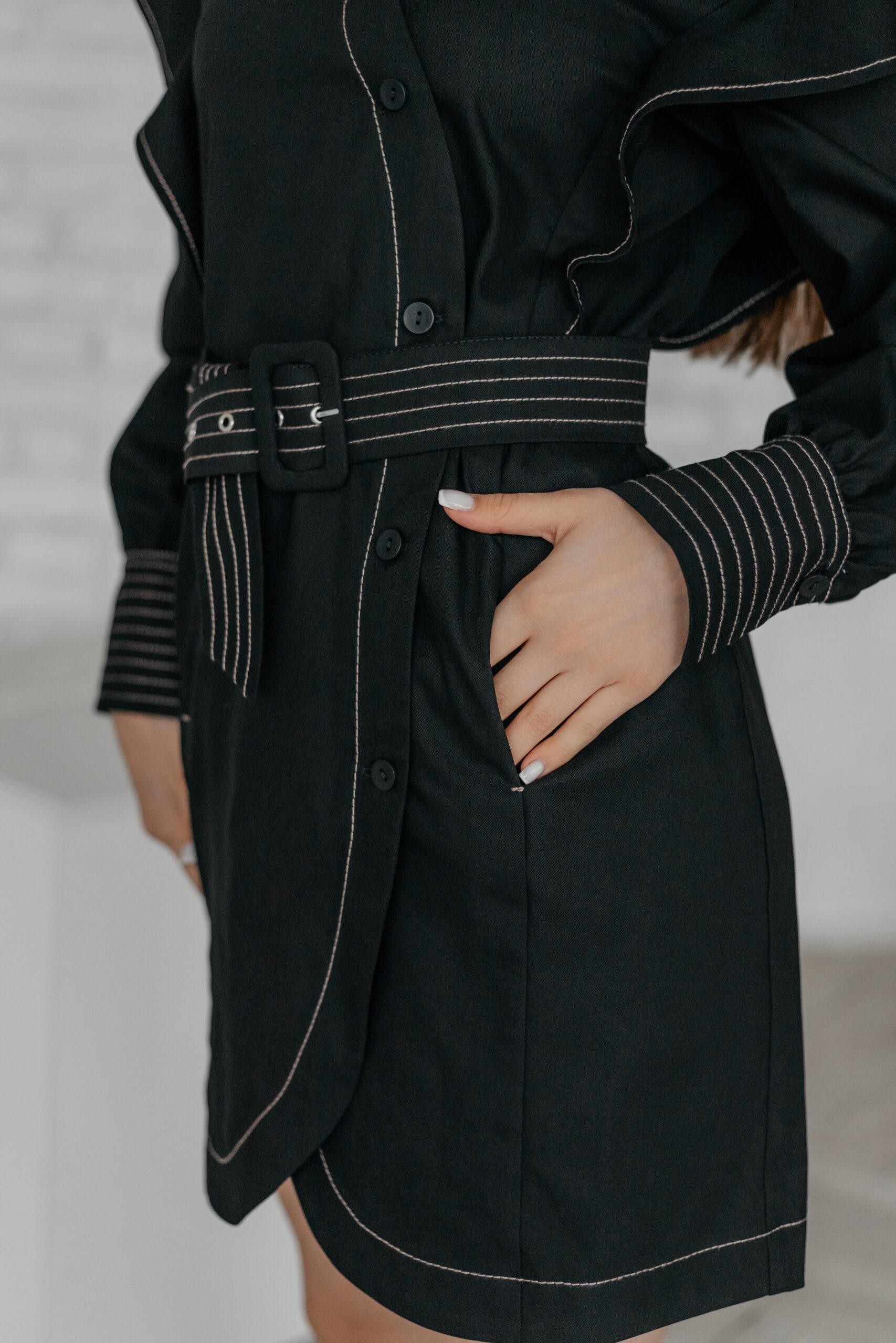 Платье женское на запах в мини длине. Низ платья полукруглый, с двумя боковыми карманами. В модели длинный рукав на манжетах, на плечах красивые, обьемные воланы. Выделить талию можно при помощи тканевого пояса с пряжкой.