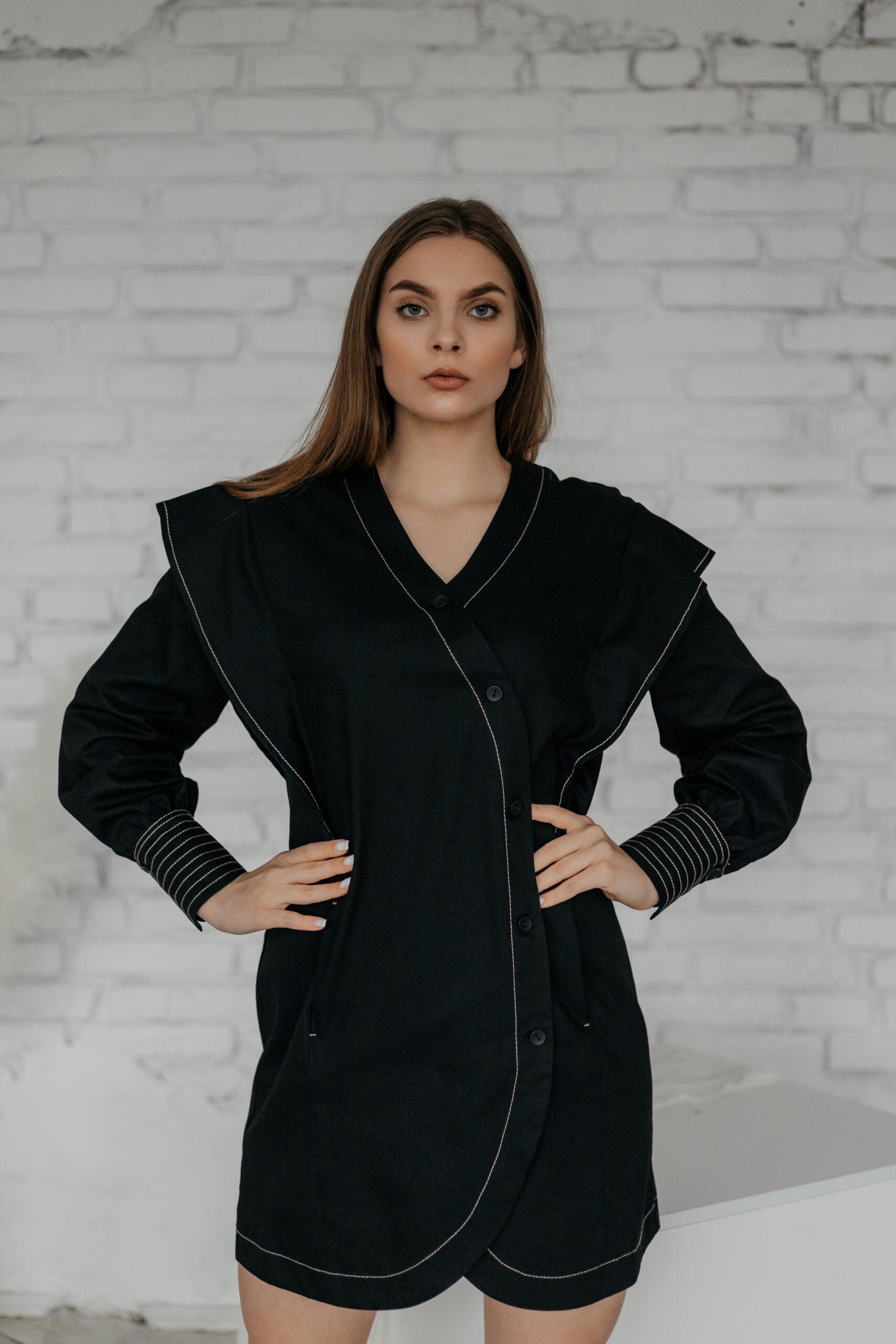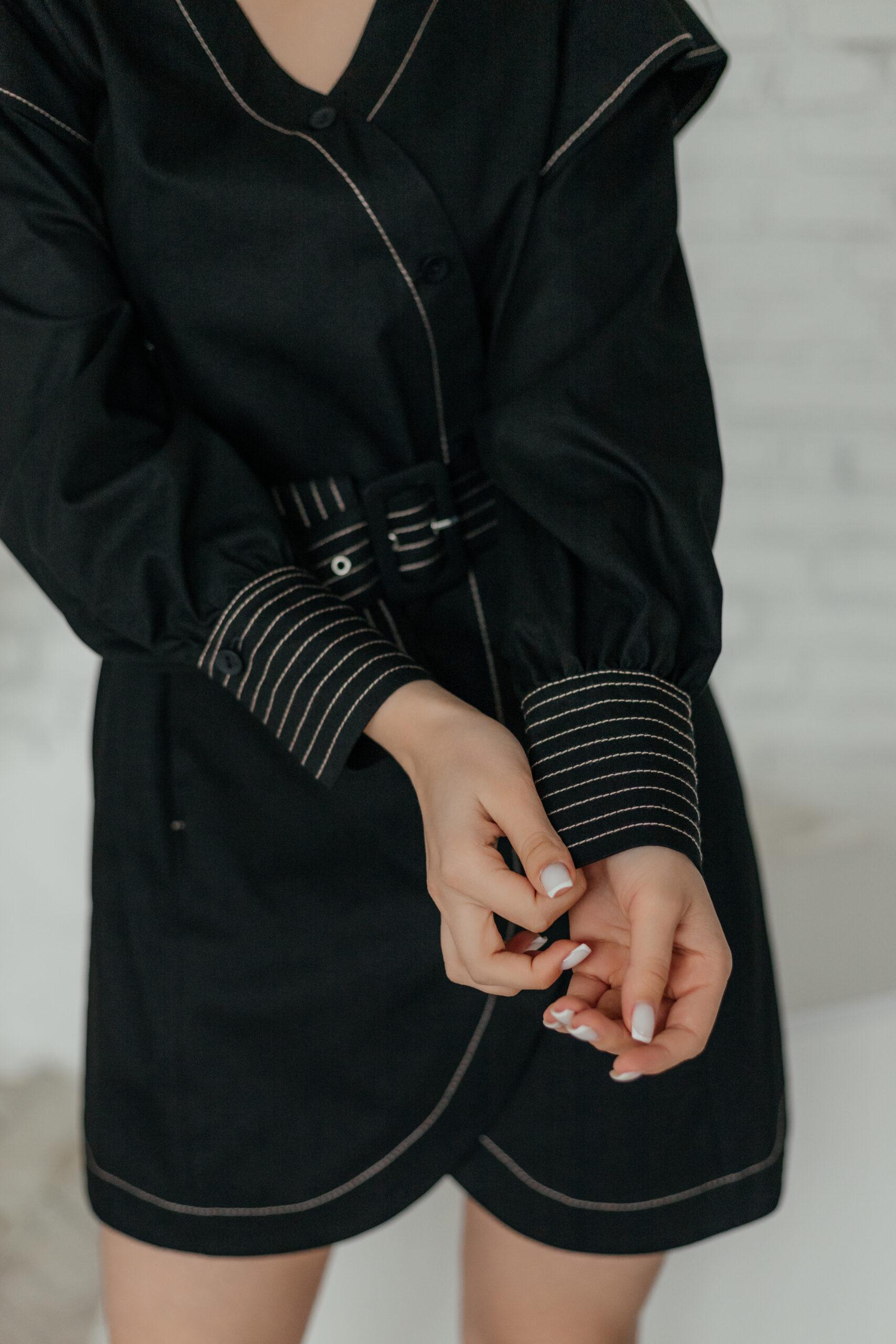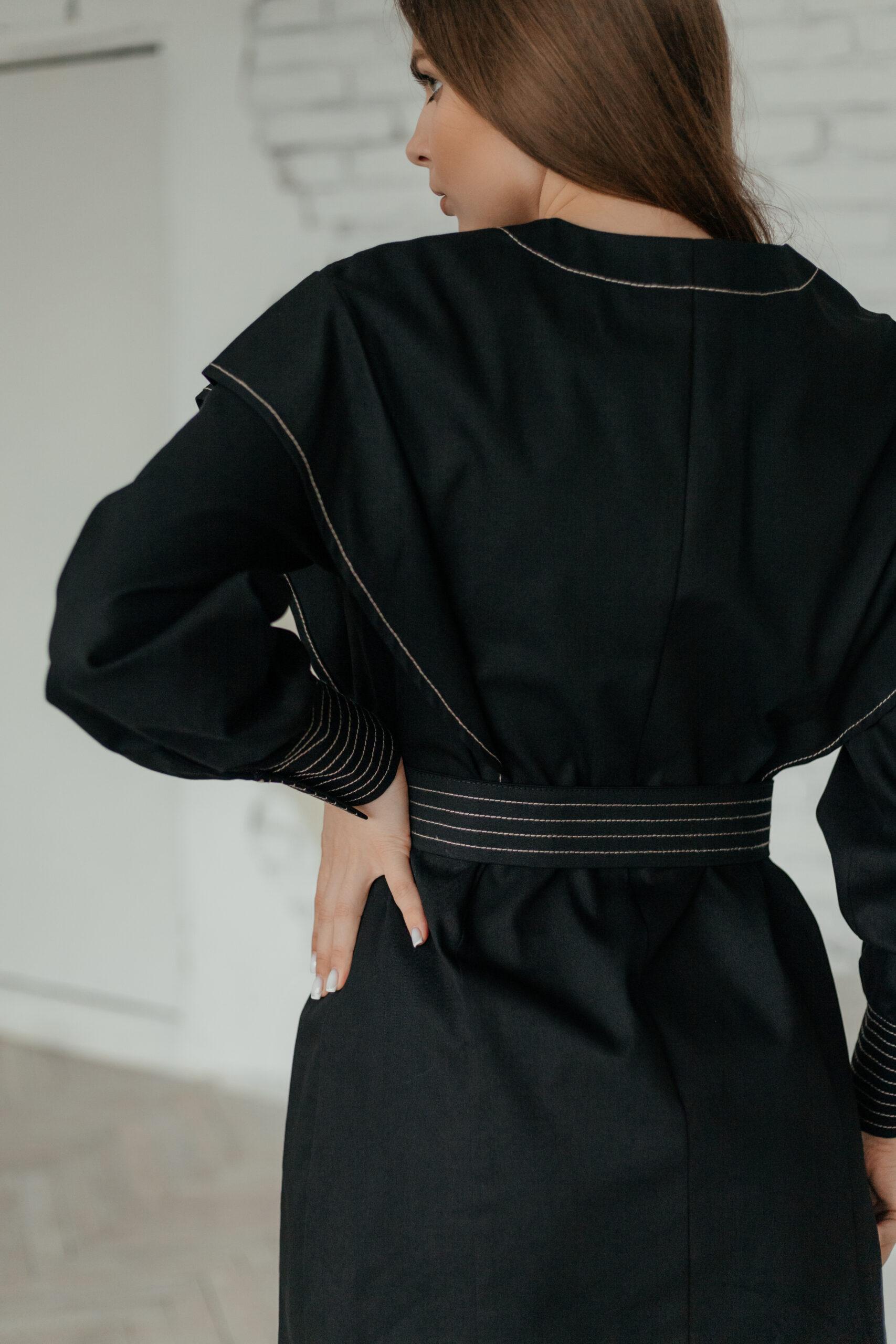 Платье женское на запах в мини длине. Низ платья полукруглый, с двумя боковыми карманами. В модели длинный рукав на манжетах, на плечах красивые, обьемные воланы. Выделить талию можно при помощи тканевого пояса с пряжкой.