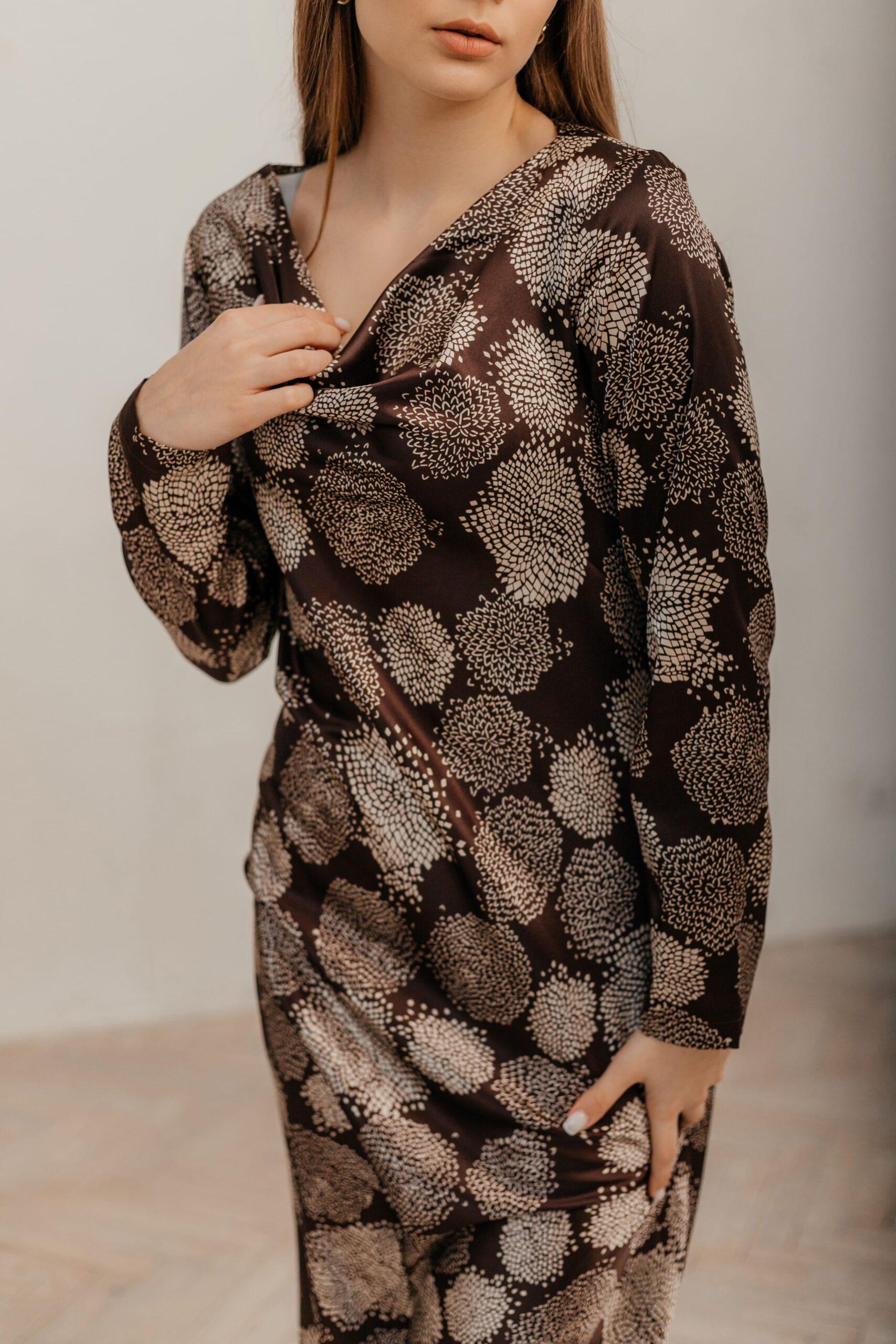 Платье женское, длины миди, с длинным рукавом. Модель по фигуре из атласной ткани. Вырез в платье сделан качелькой.