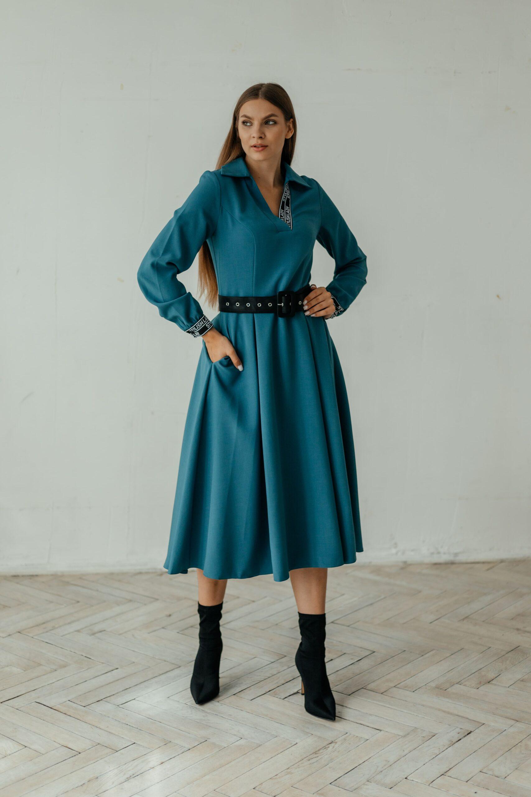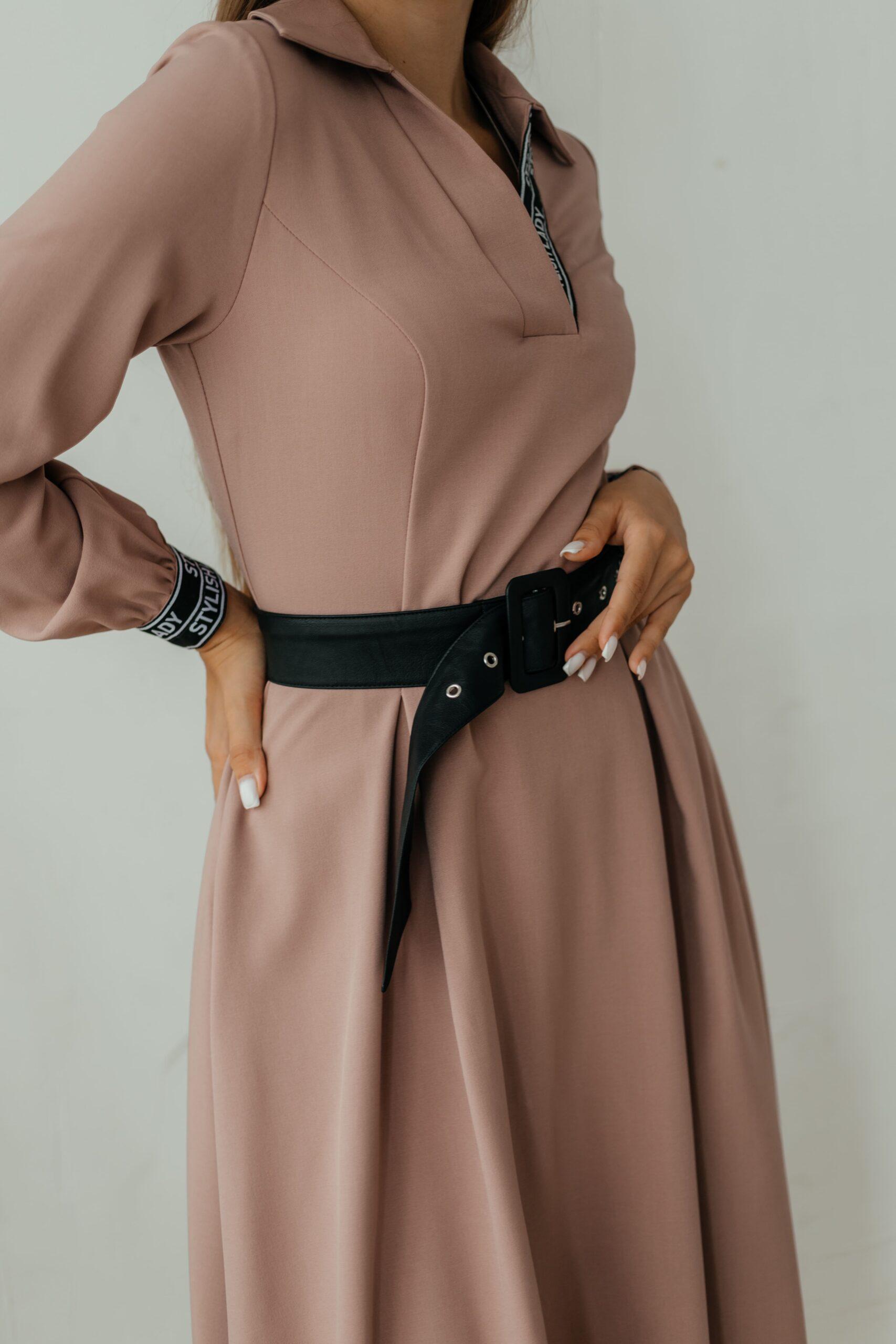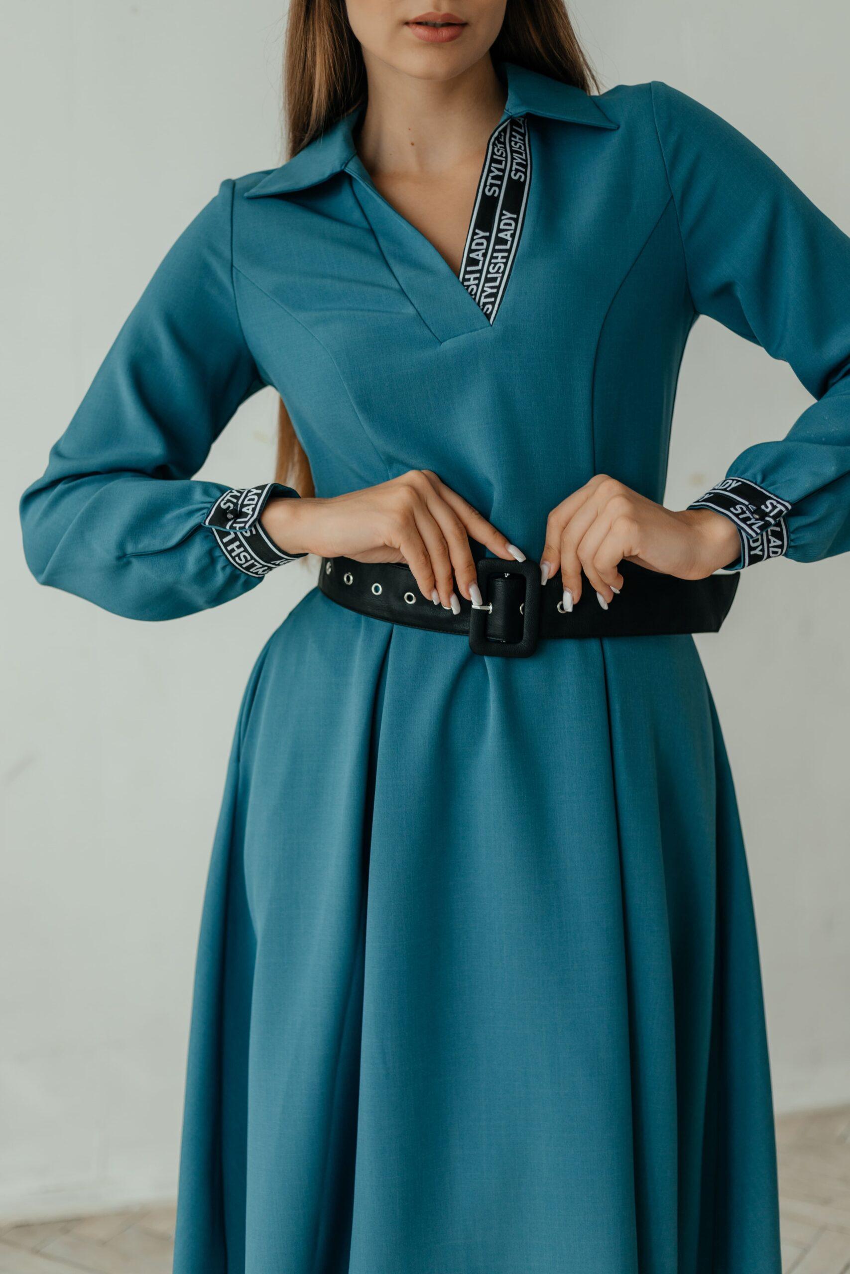 Платье женское длины миди с V-образным вырезом и небольшим воротничком. В платье на вырезе и на манжетах вставки с фирменным логотипом. Модель приталенная , в комплекте идет пояс из эко-кожи с пряжкой.