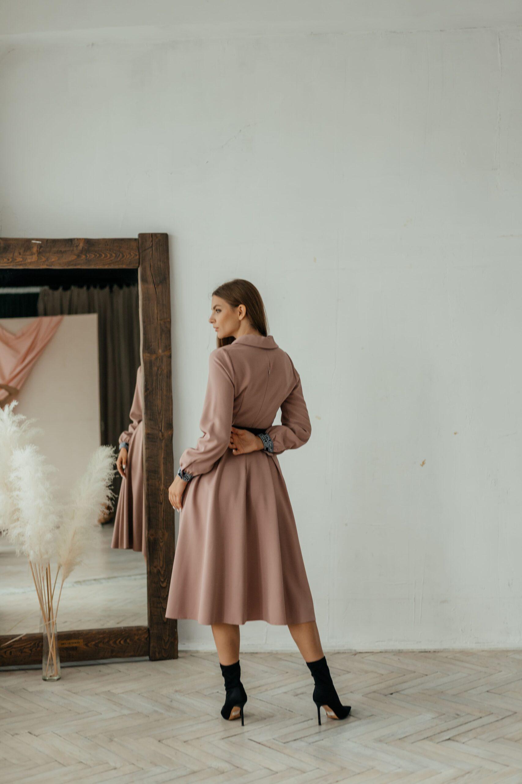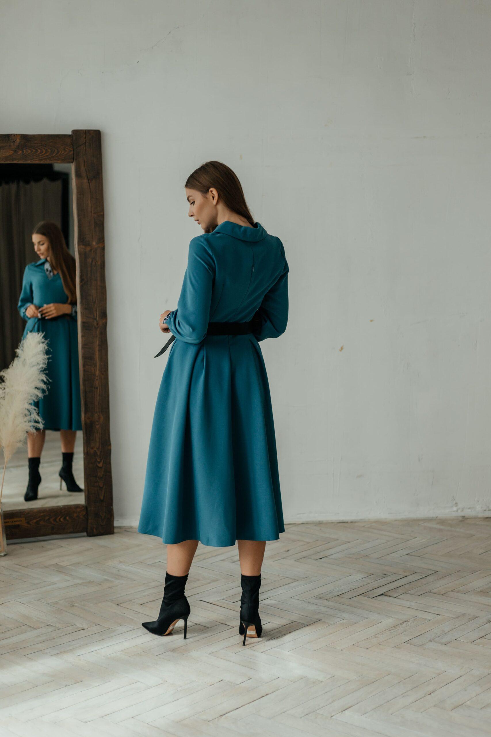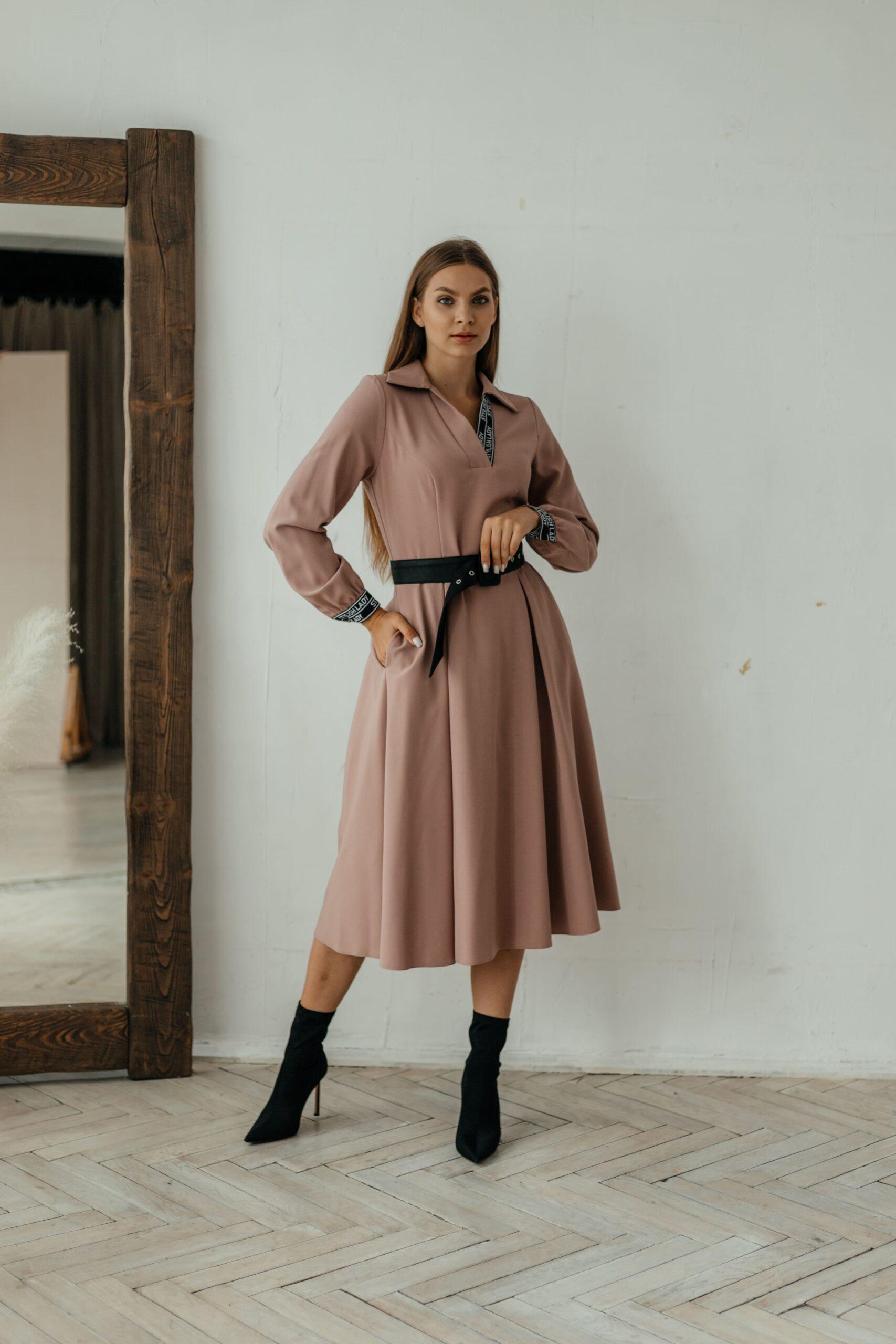 Платье женское длины миди с V-образным вырезом и небольшим воротничком. В платье на вырезе и на манжетах вставки с фирменным логотипом. Модель приталенная , в комплекте идет пояс из эко-кожи с пряжкой.