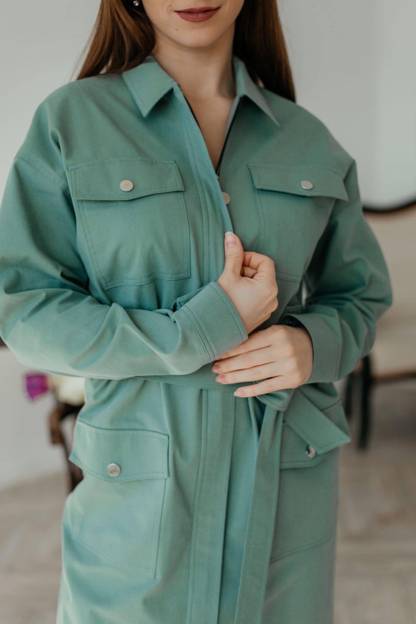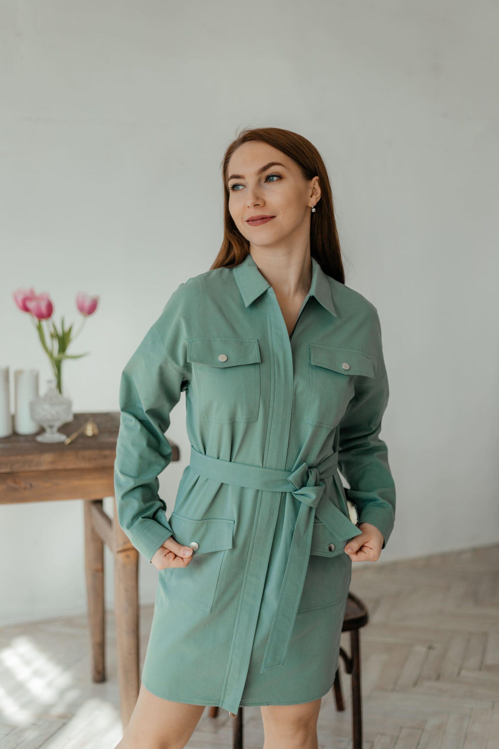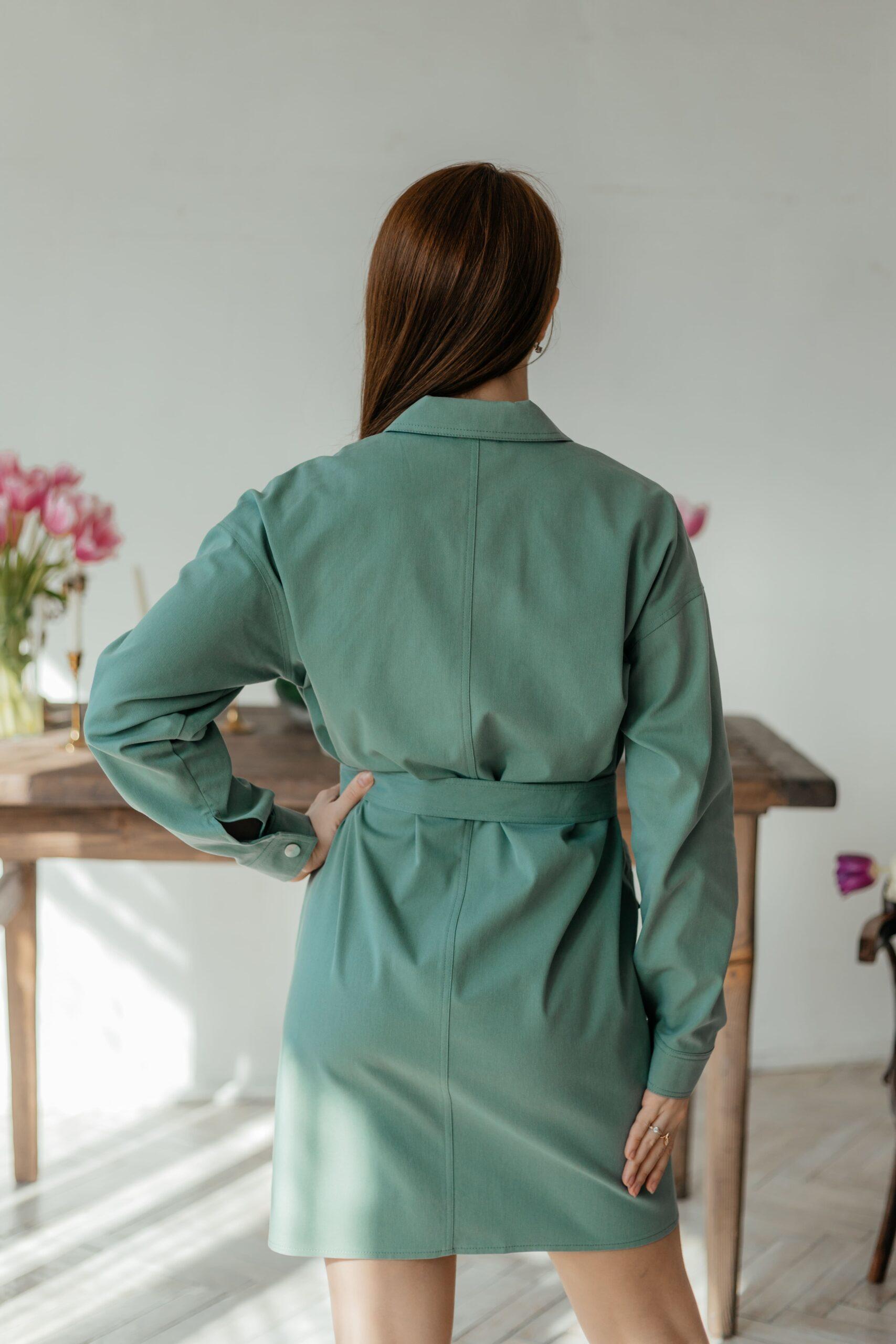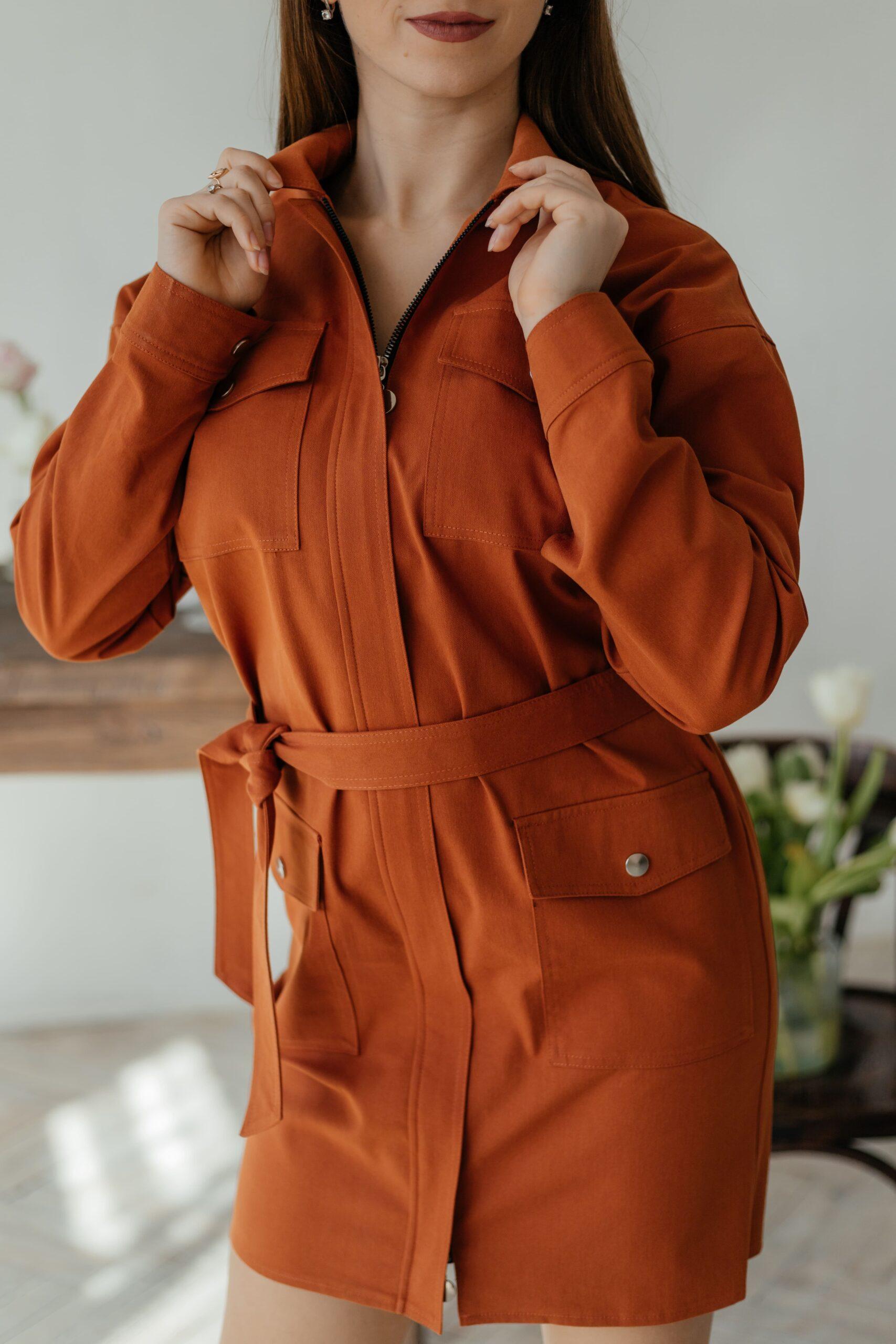 Платье женское, длины мини, с длинным рукавом. Модель на двустороннем замке, с двумя нагрудными карманами и тканевым поясом. Состав: 72% хлопок 26% полиэстер 2% эластан