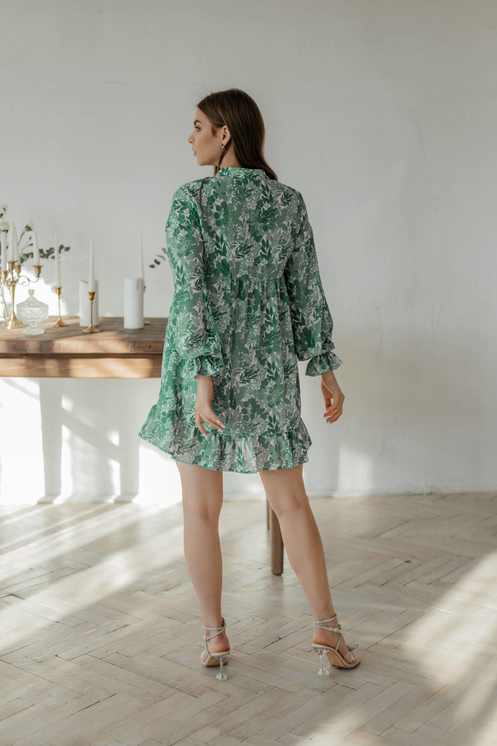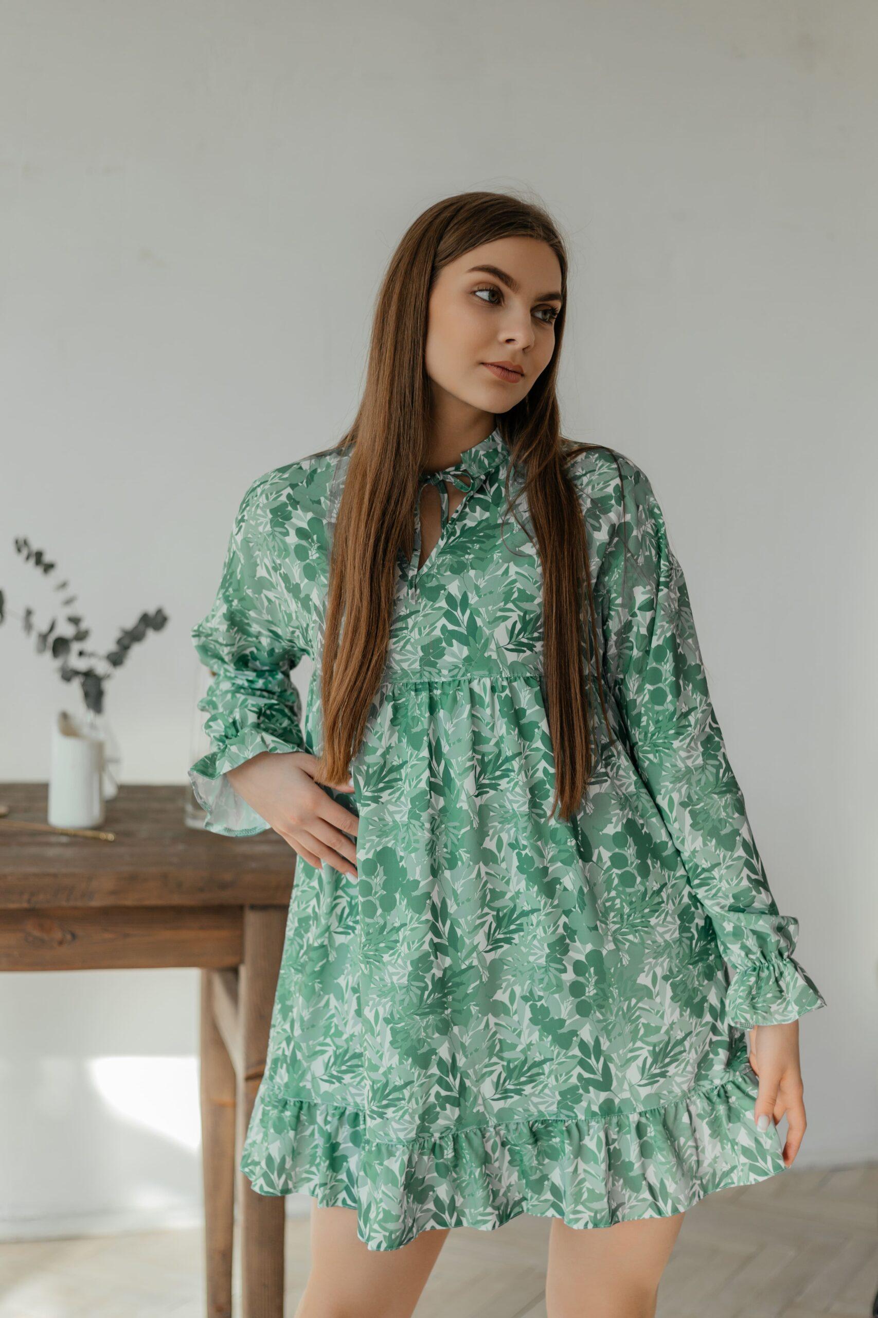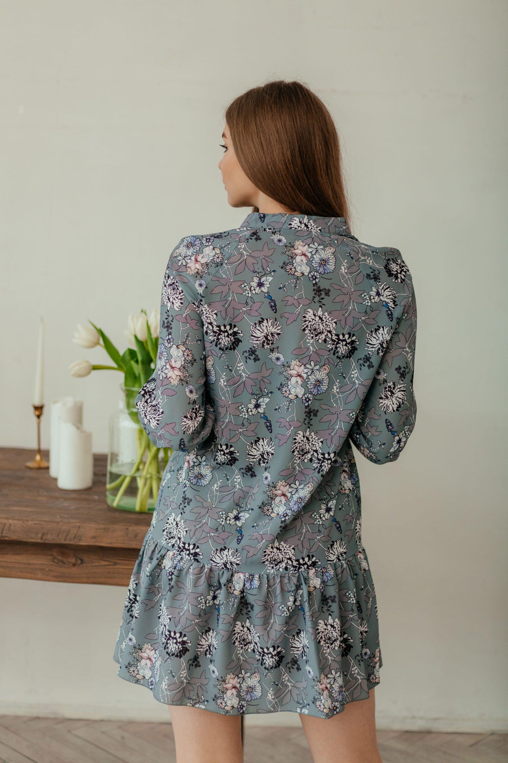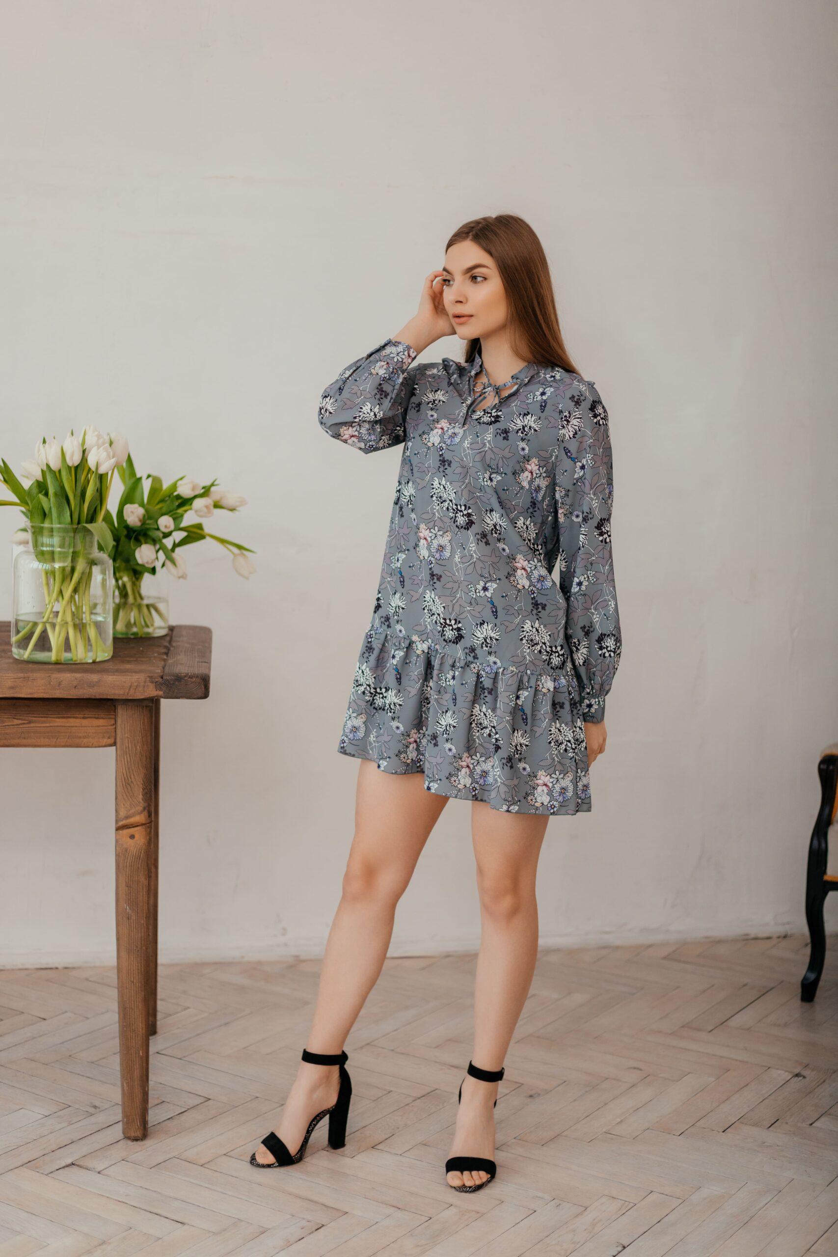 Платье женское, длины мини с валаном и длинным рукавом на манжете. Прямой, свободный крой, воротник стоечка с вырезом капелькой.