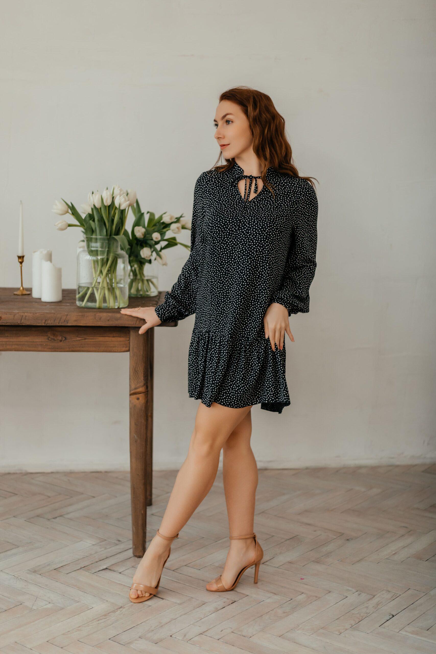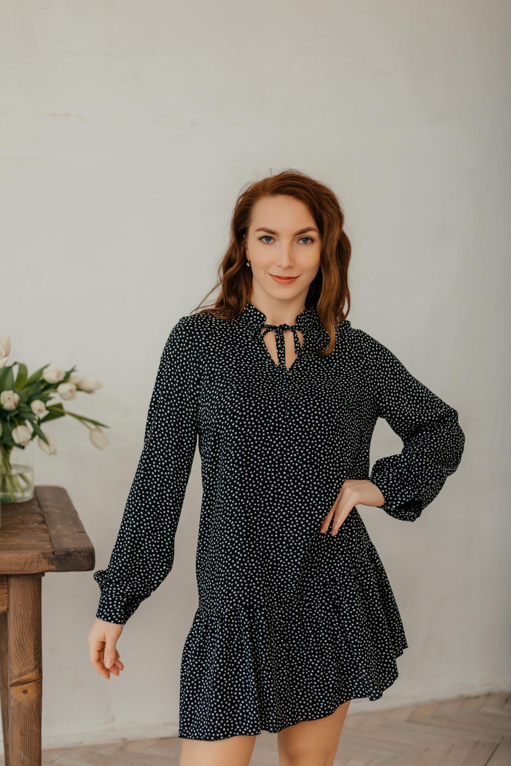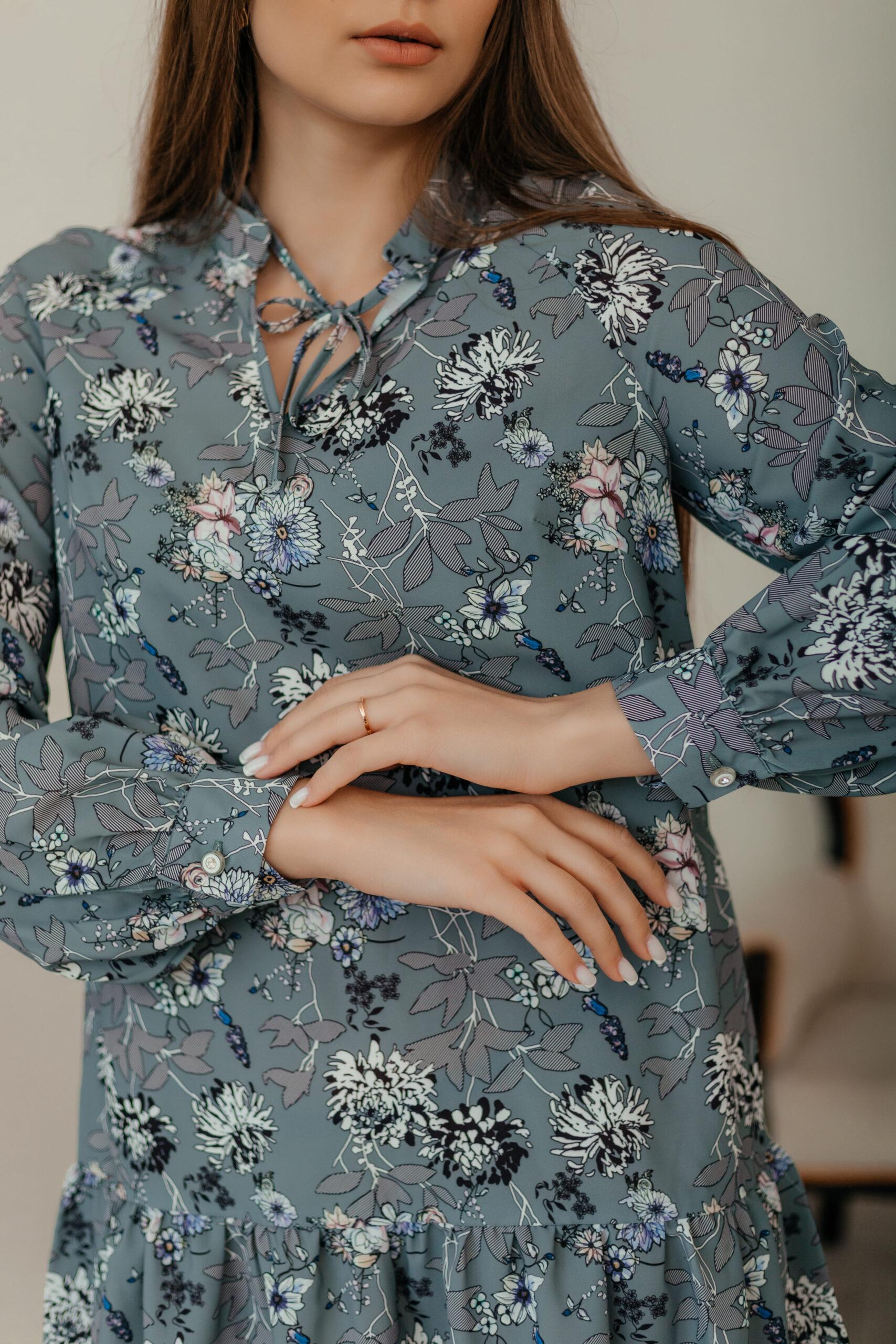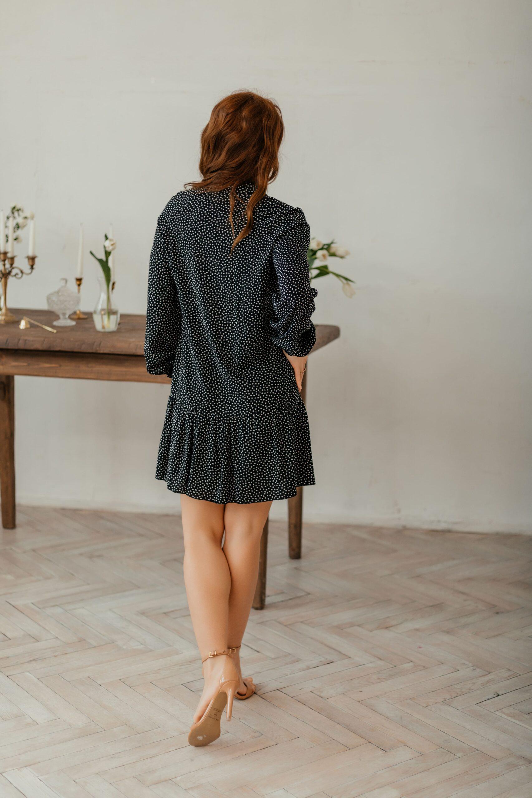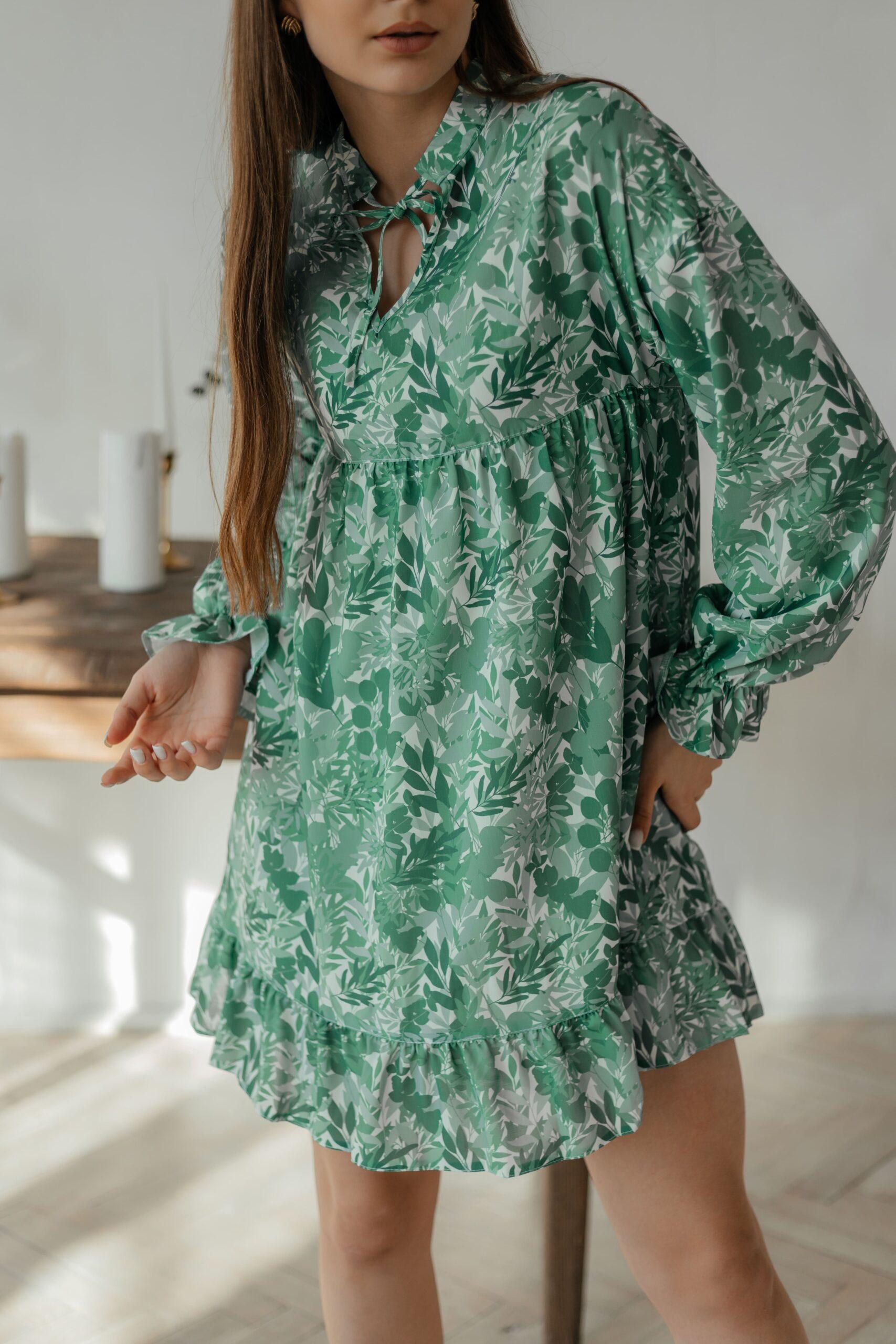 Платье женское, длины мини с валаном и длинным рукавом на манжете. Прямой, свободный крой, воротник стоечка с вырезом капелькой.